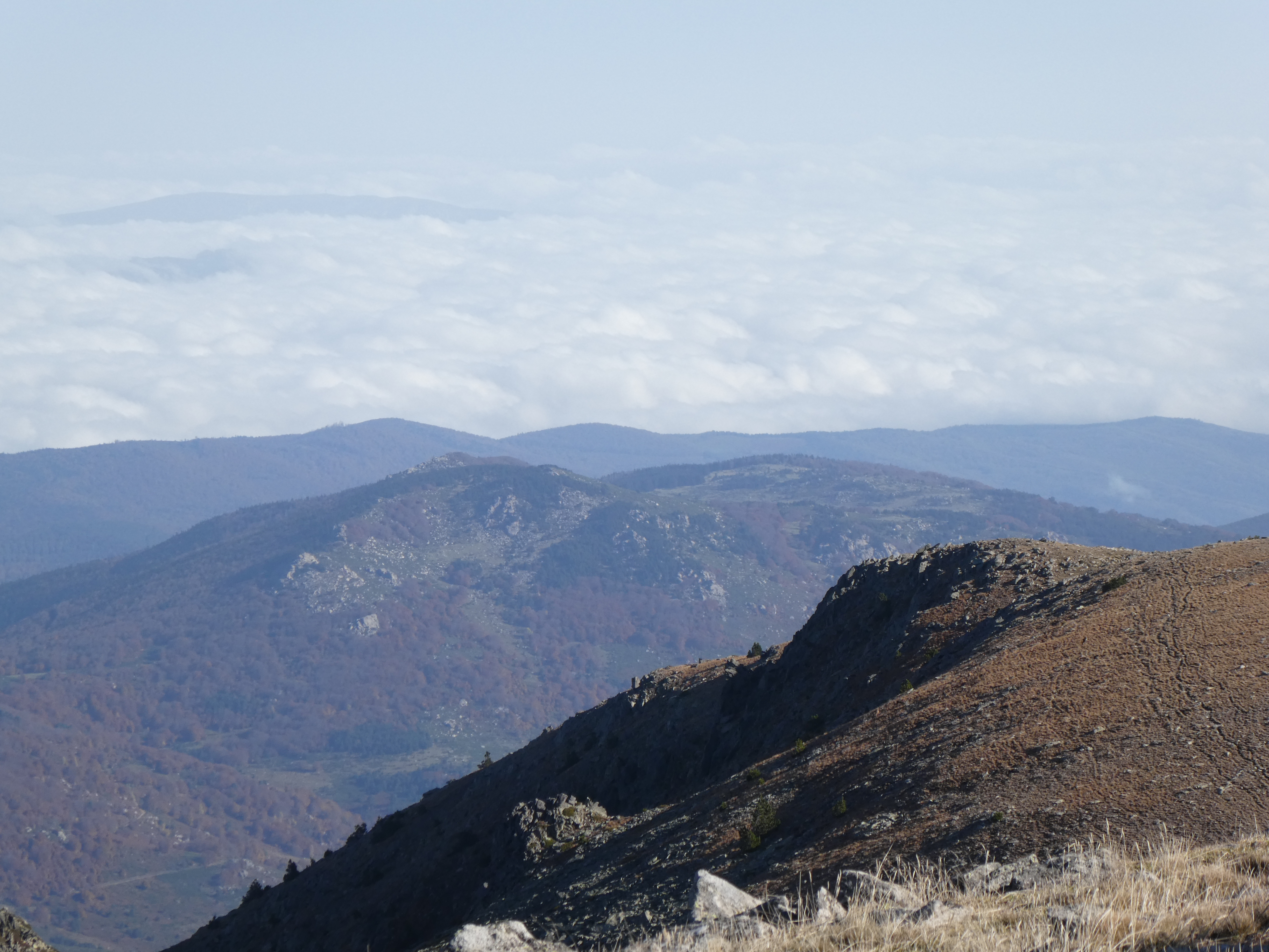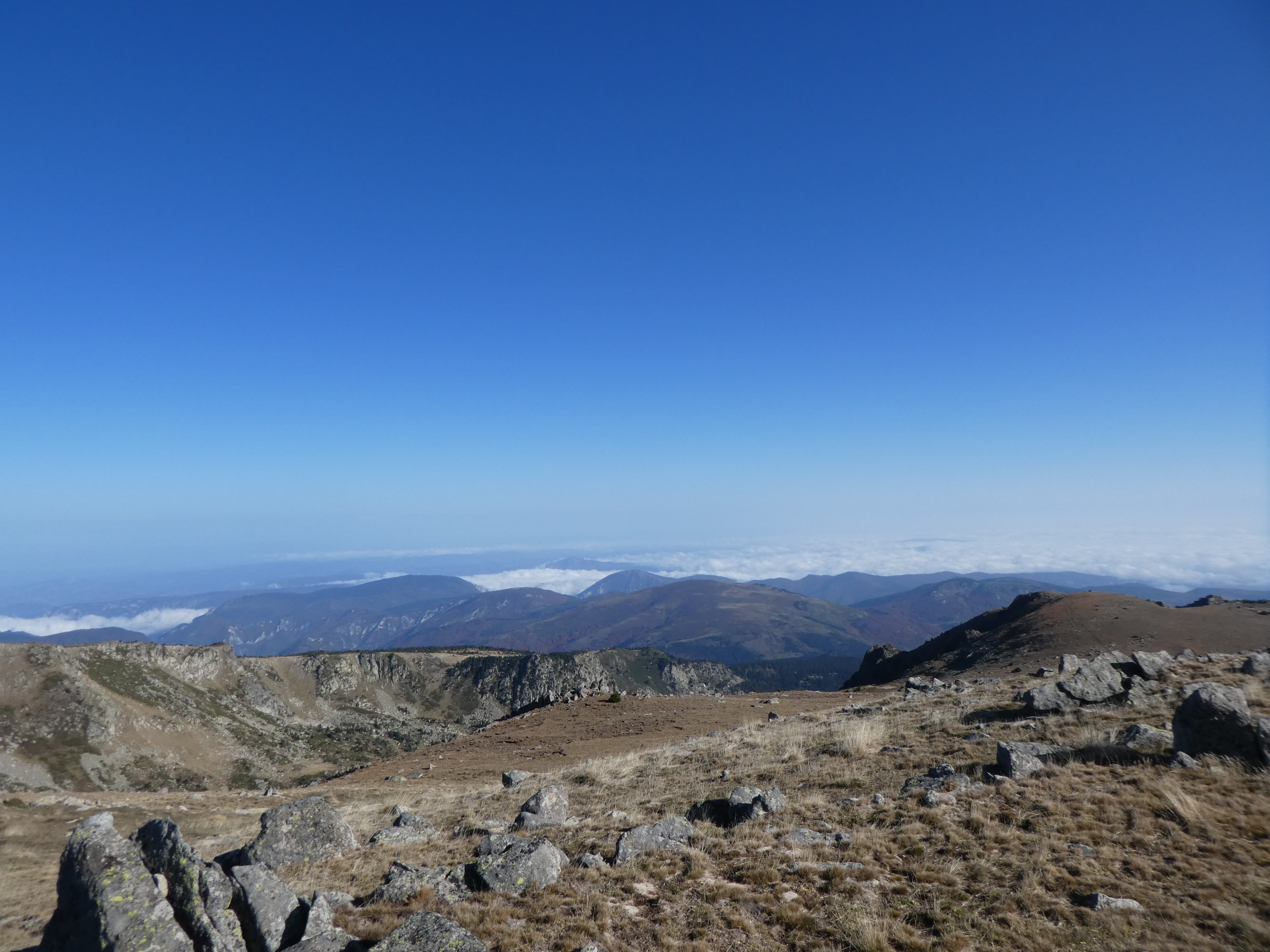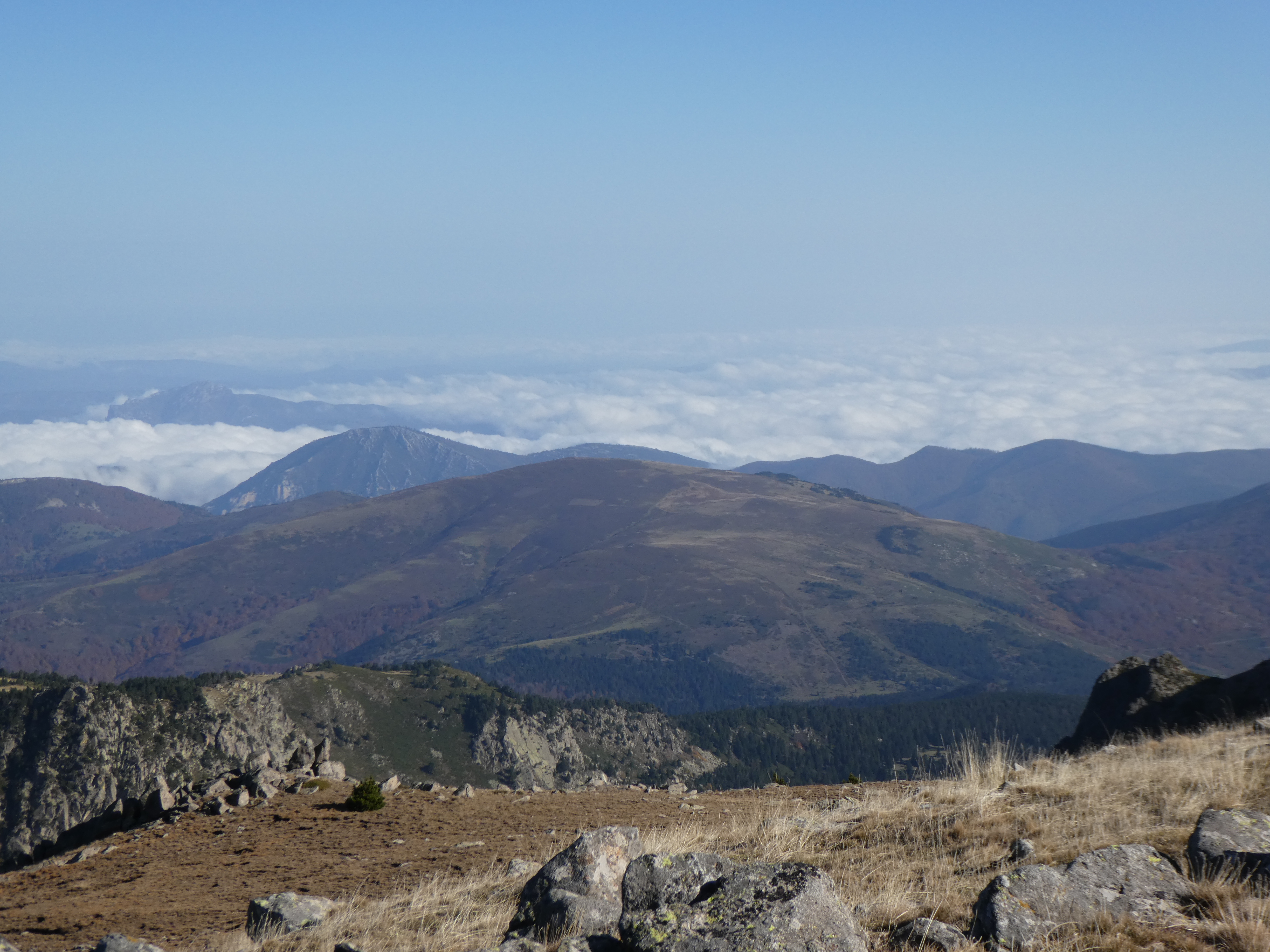 Arrivée au sommet du Roc Negre (2459 m) : beau panorama sur les sommets du Conflent, du Capcir, de la Haute-Cerdagne, de la Cerdanya, de la Haute-Ariège, des Monts d'Olmes, des Pyrénées Audoises et des Corbières ... la Montagne Noire ainsi que le littoral audois ne sont pas visibles à cause de la brume et des nuages bas !
