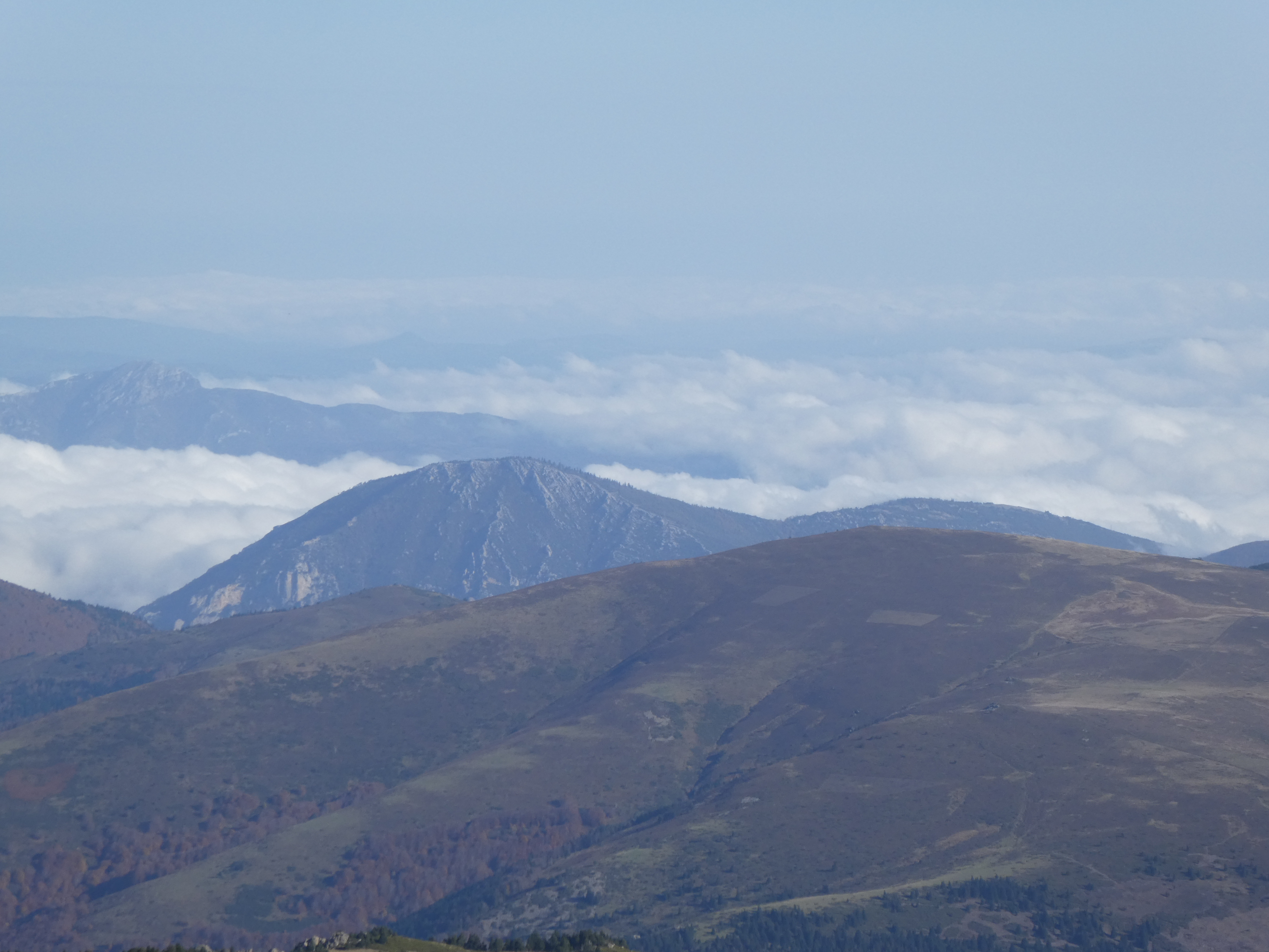 Zoom sur le Roc de Boucheville (1247 m) et le Sarrat Naout (1310 m) à gauche, et le Sarrat des Escampels (1183 m) à droite