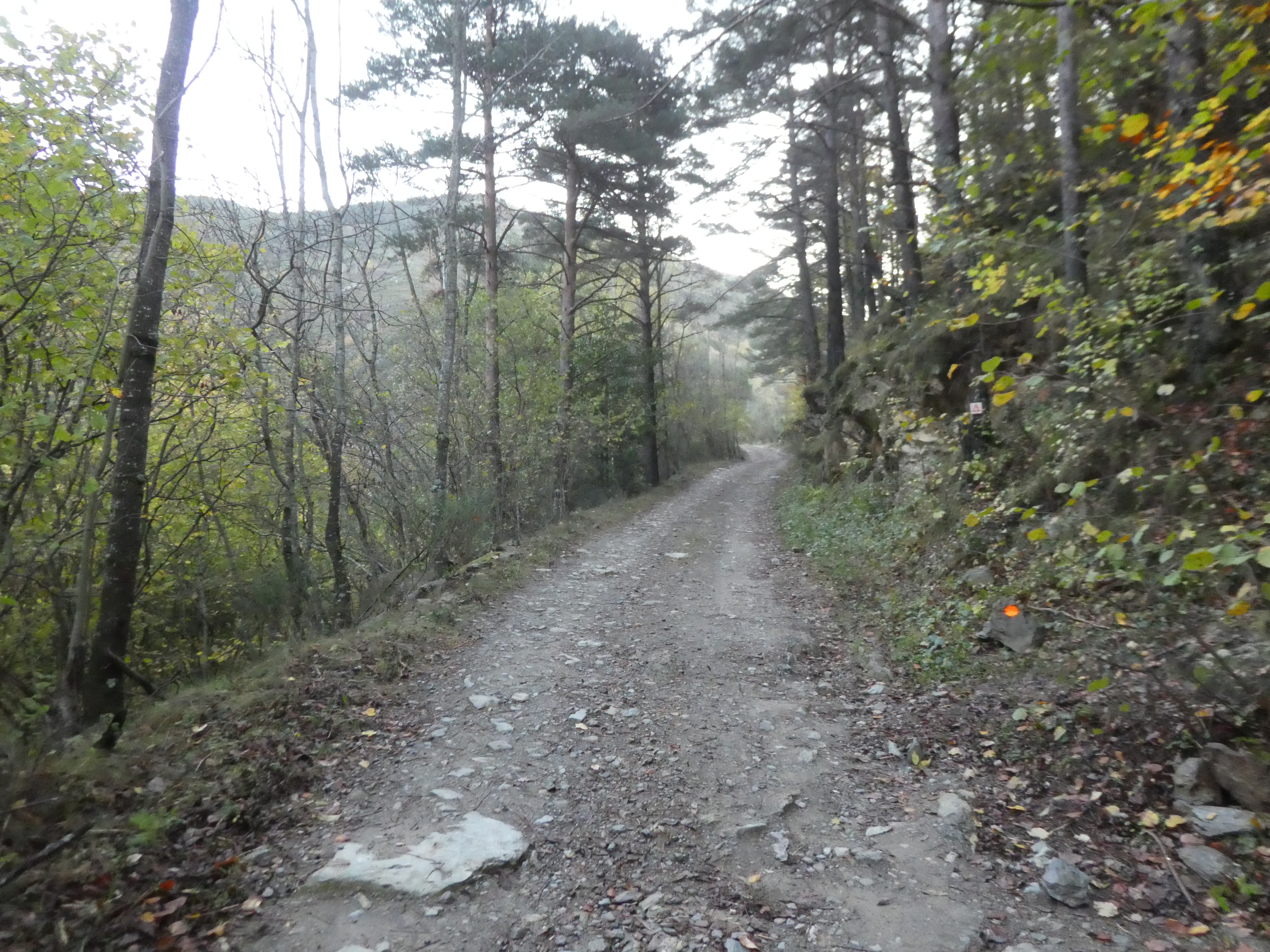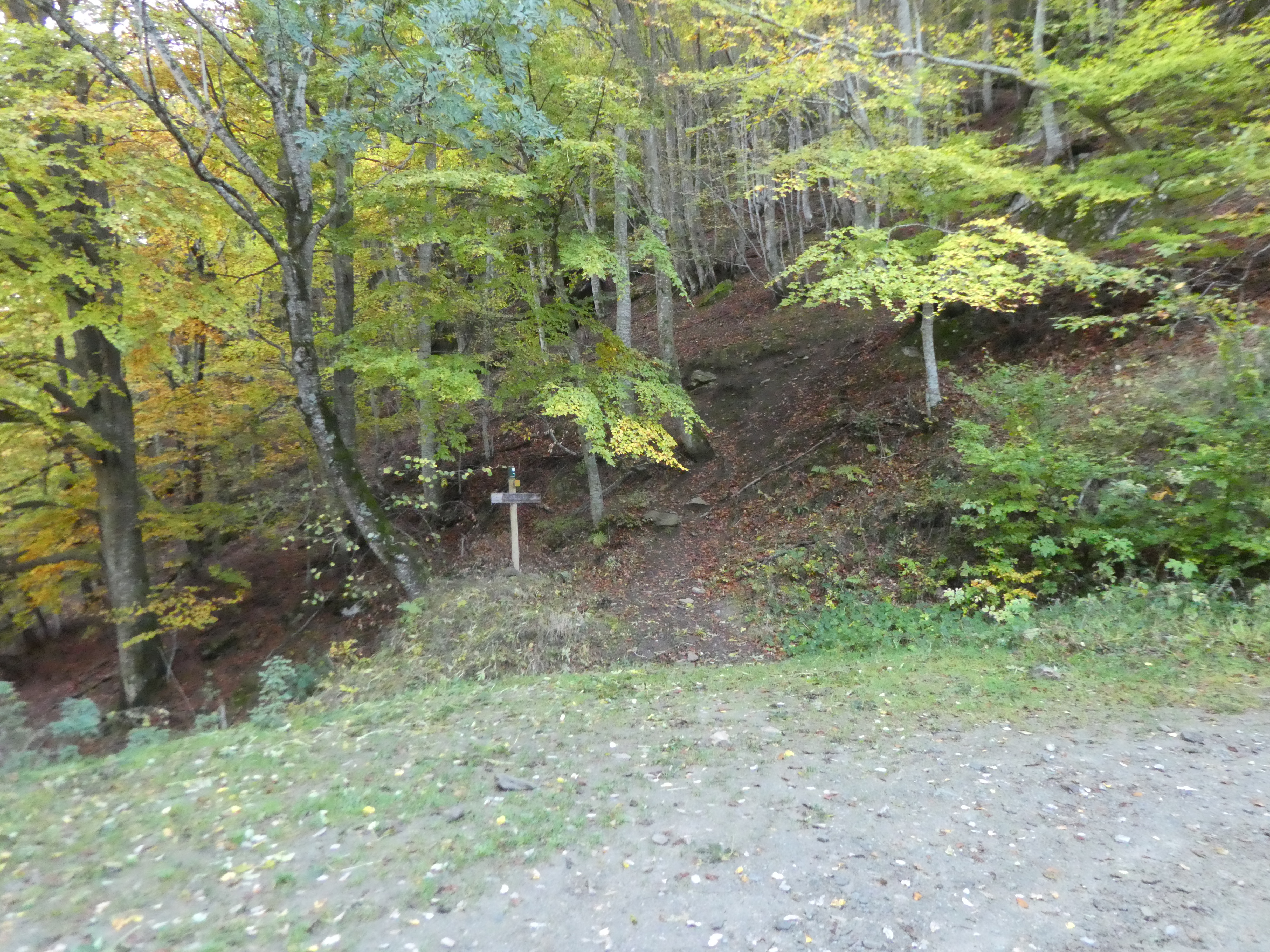 A ce croisement marqué par la présence d'un panneau directionnel (800 mètres après le lieu-dit "Bac del Gorg") (1042 m), suivre la piste partant en quasi demi-tour sur la gauche direction Nohèdes, balisé en jaune