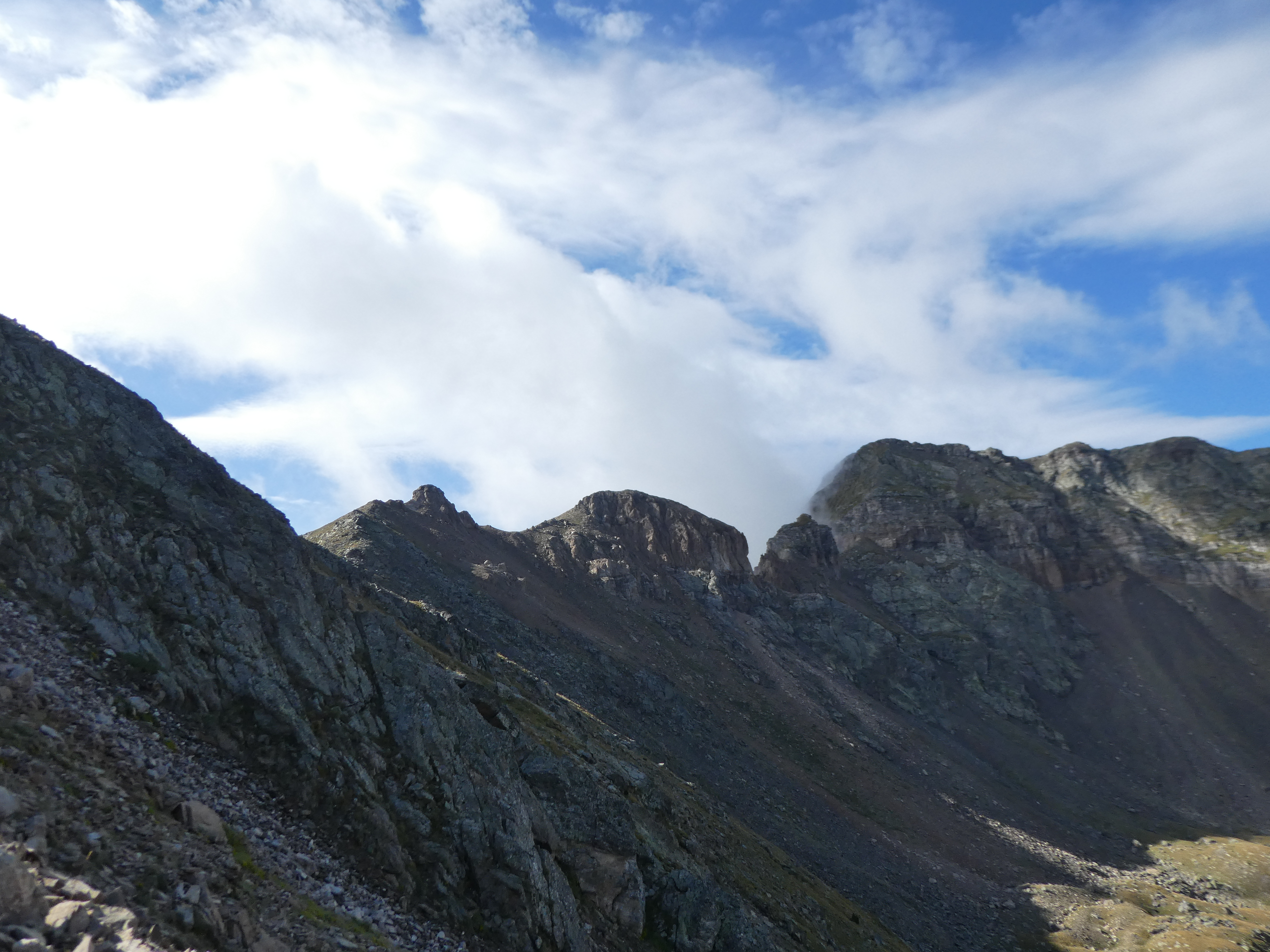 Zoom sur le Pic Inferior de la Vaca (2820 m) à gauche, le Pic Superior de la Vaca (2826 m) au centre et le Pic de la Fossa del Gegant (2799 m) à droite