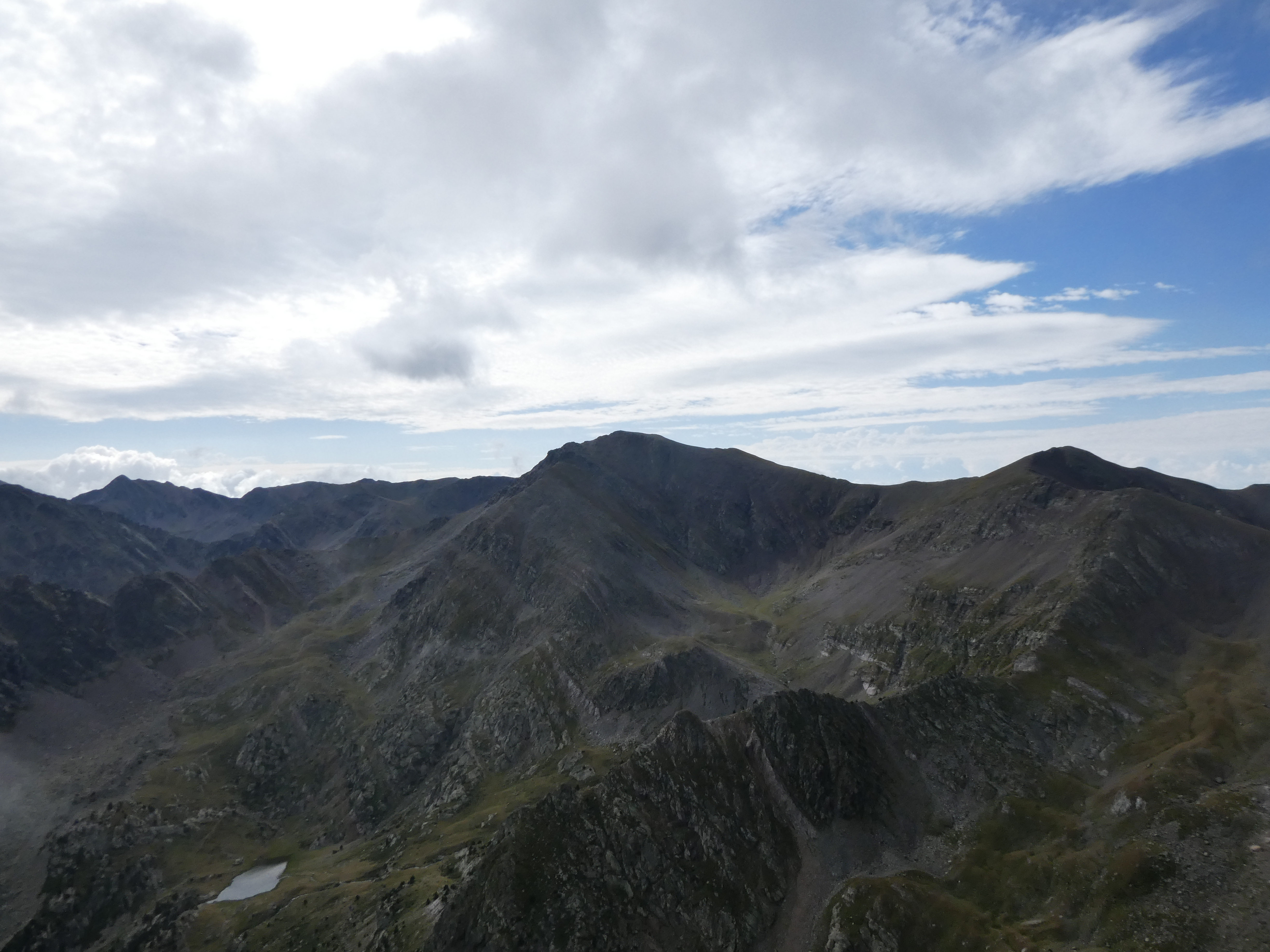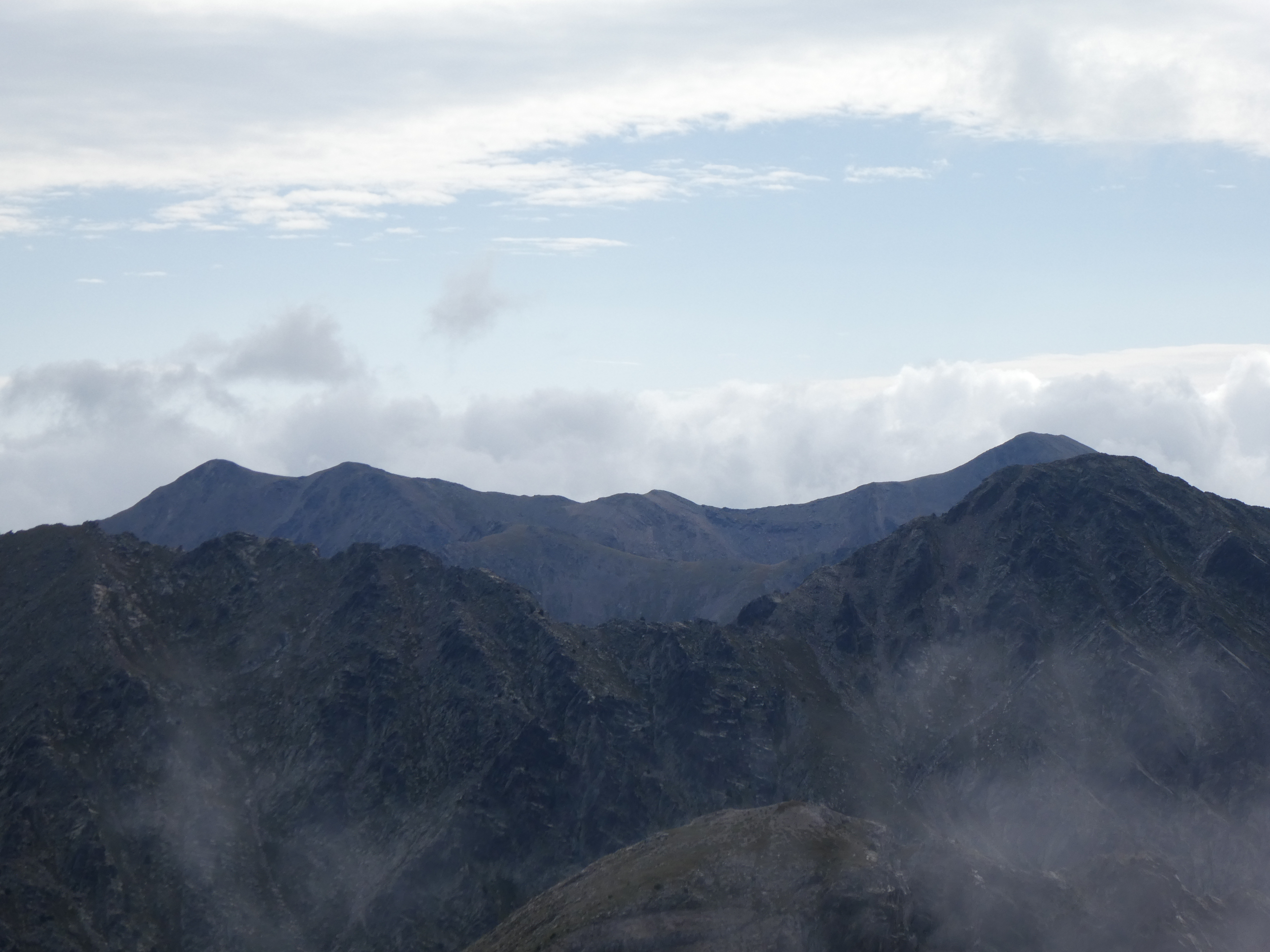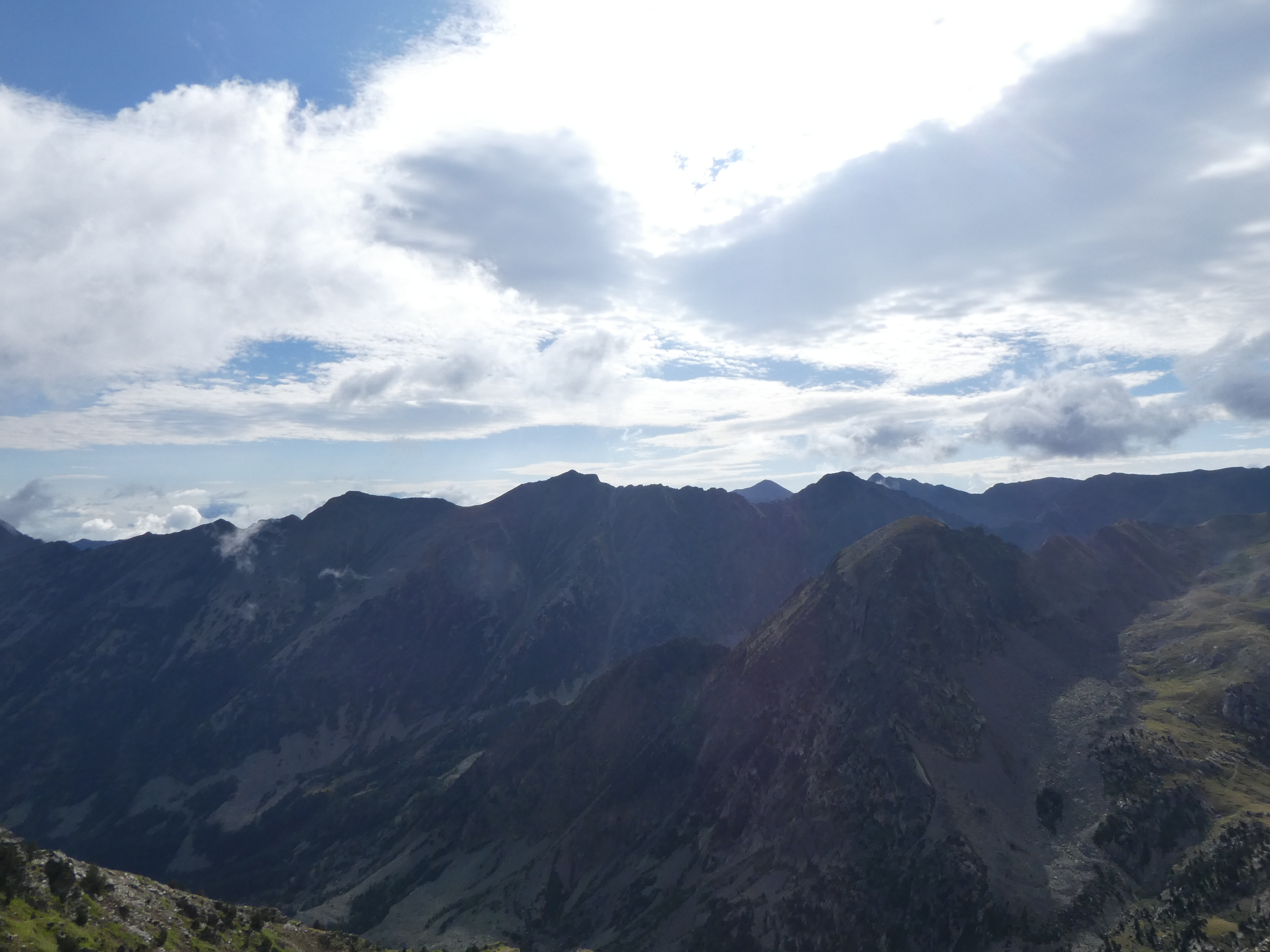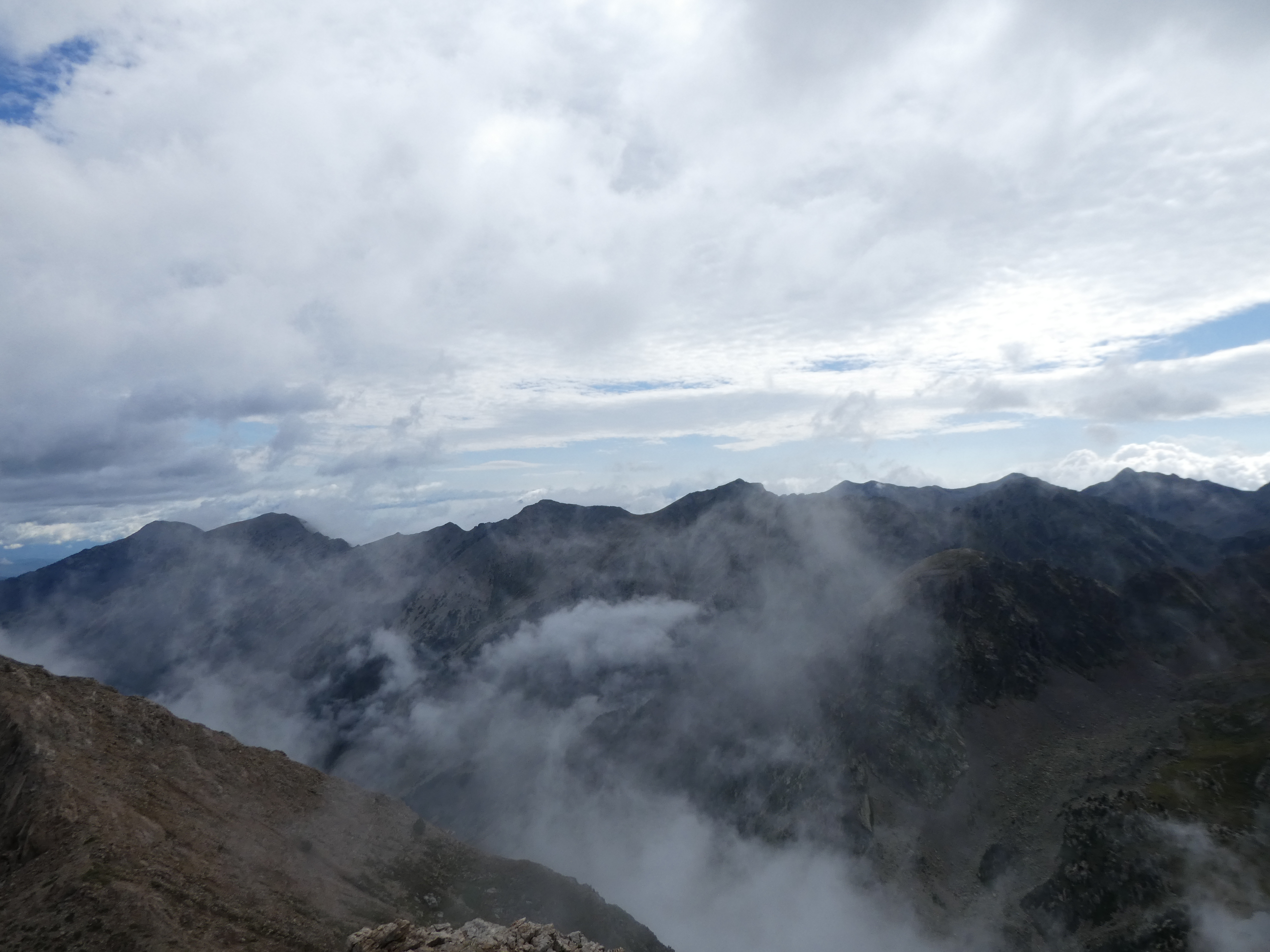 Arrivée au sommet du Serrat dels Llosers (2722 m) : beau panorama malgré la présence de nuages sur les sommets de la Vall de Planès et de la Carança