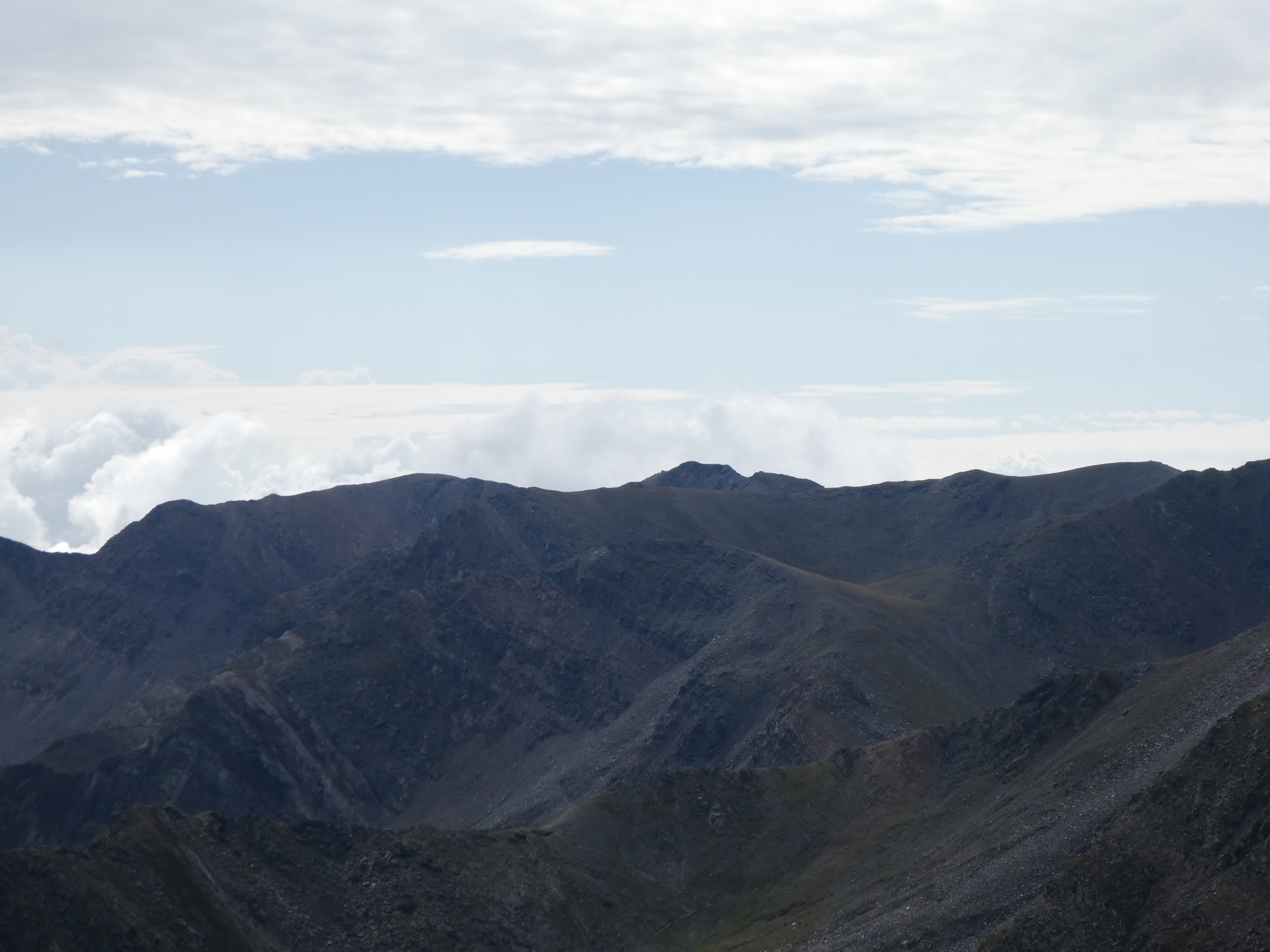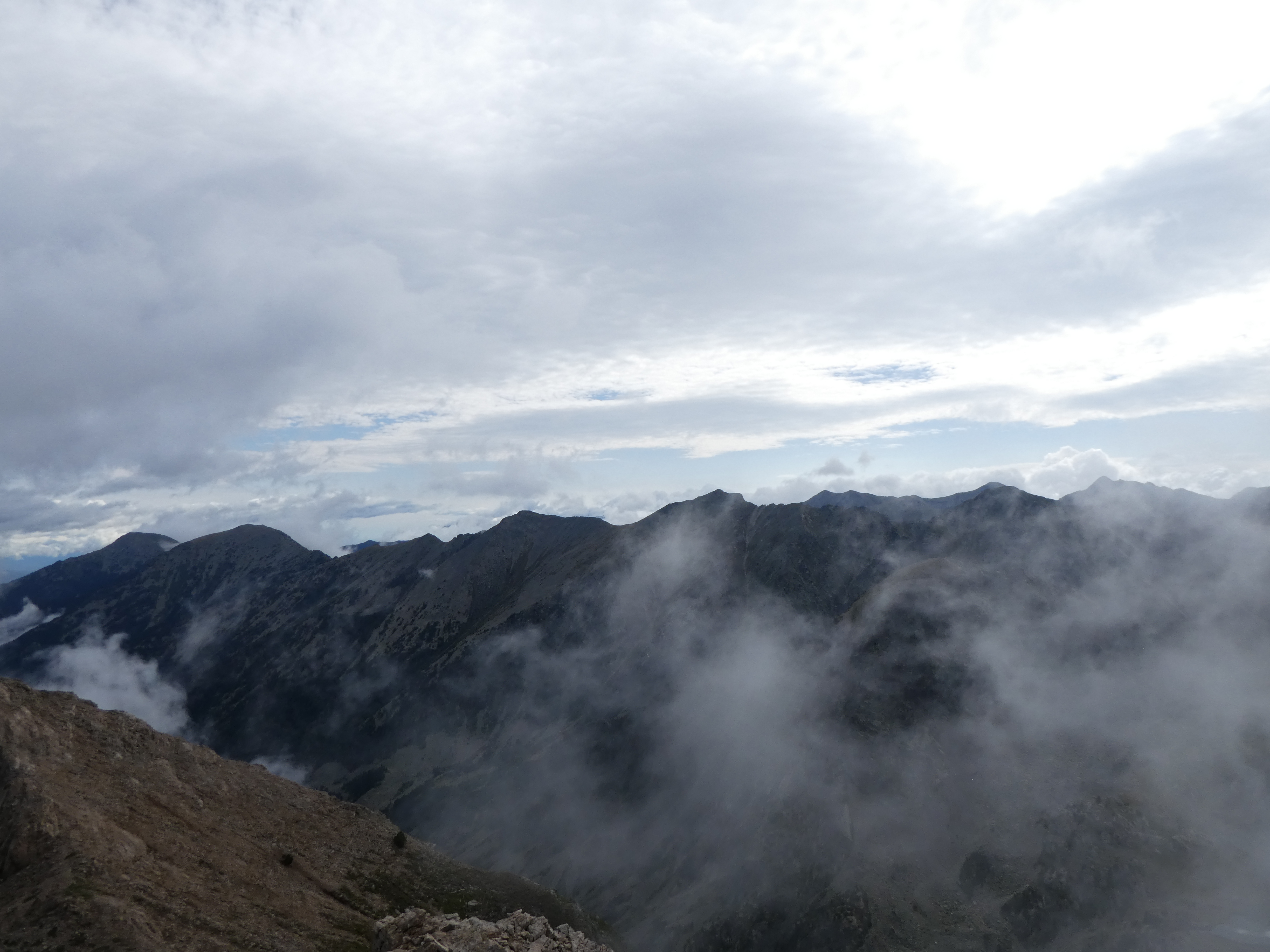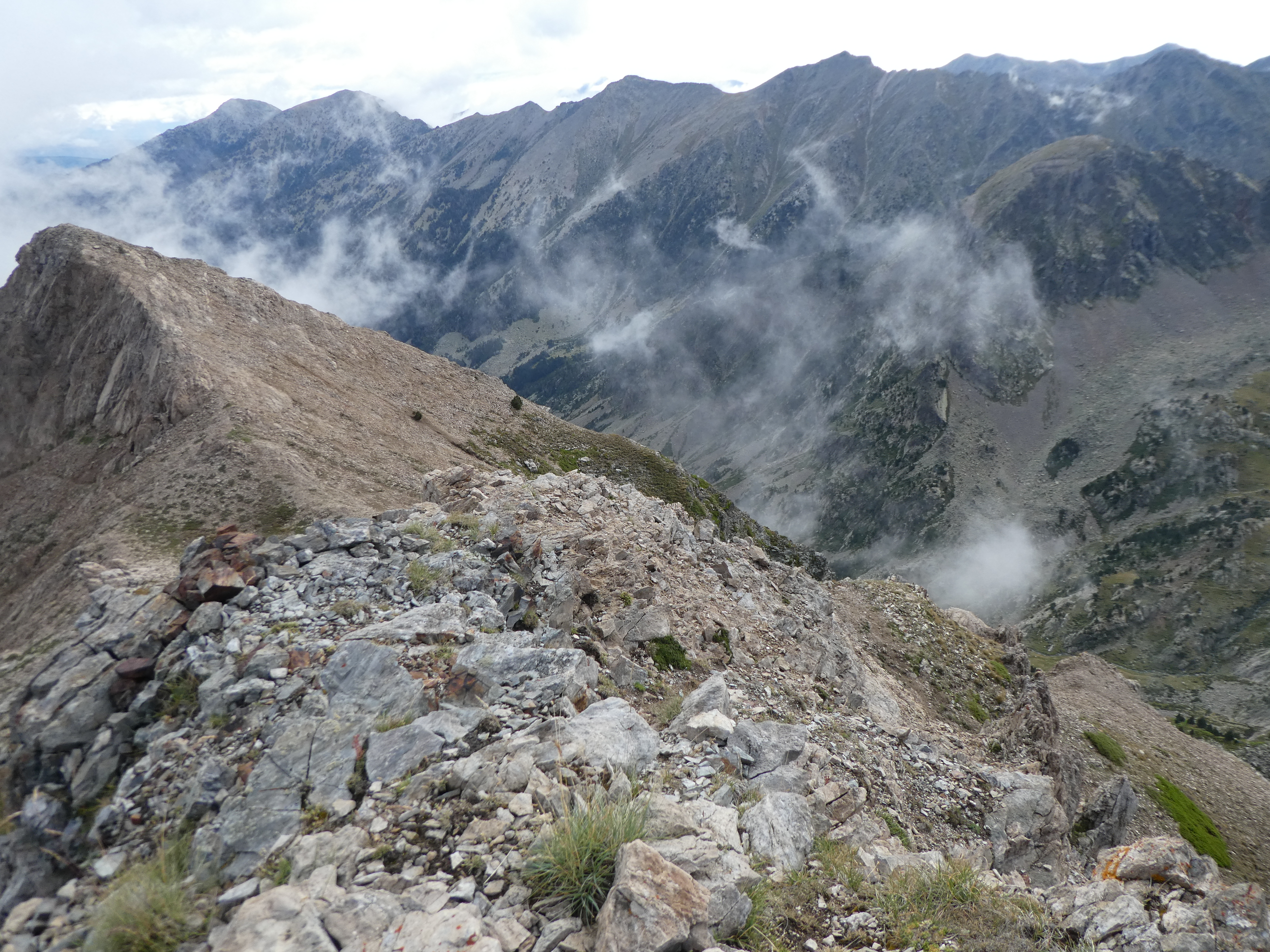 Arrivée au sommet du Serrat dels Llosers (2722 m) : beau panorama malgré la présence de nuages sur les sommets de la Vall de Planès et de la Carança
