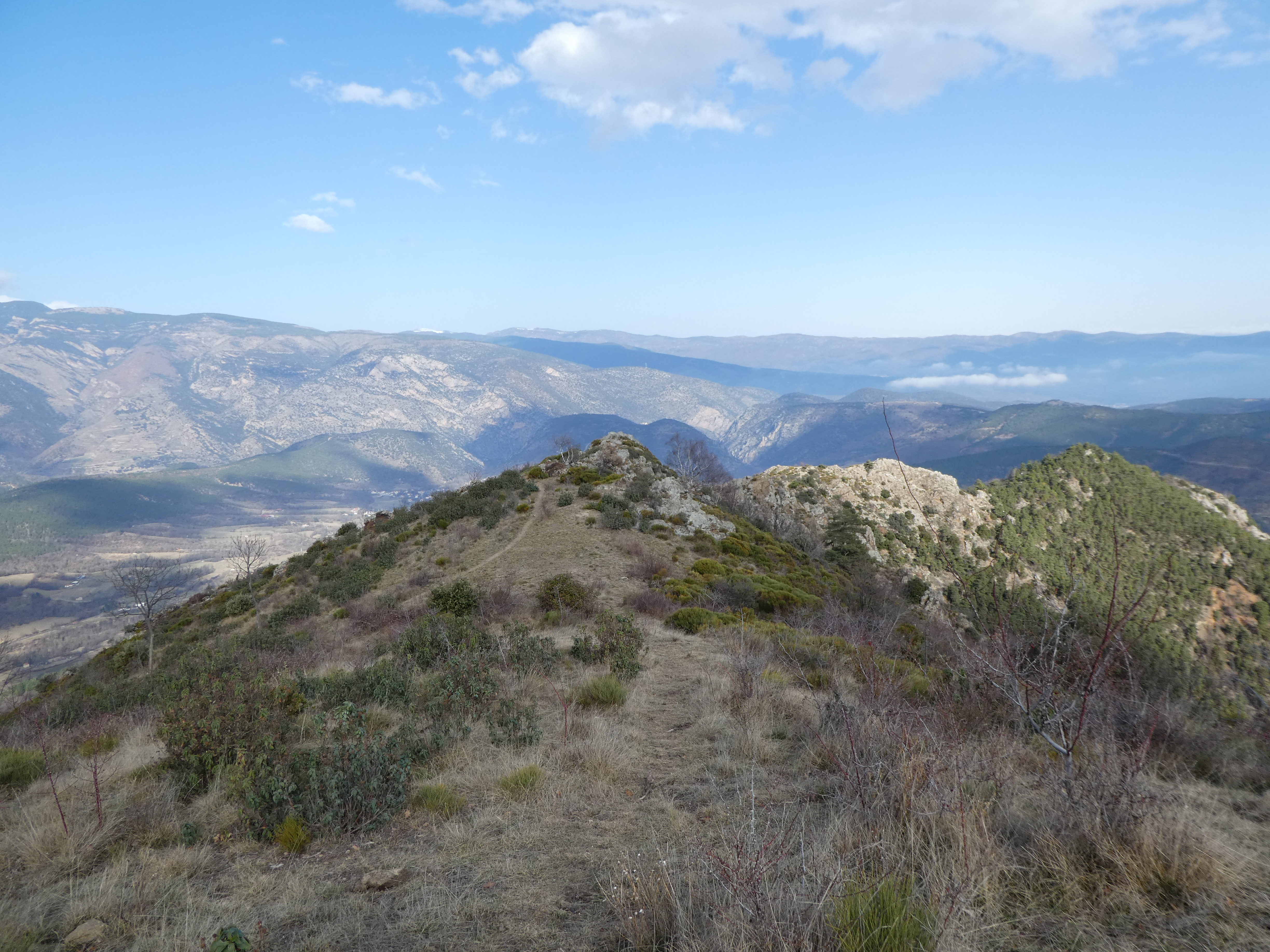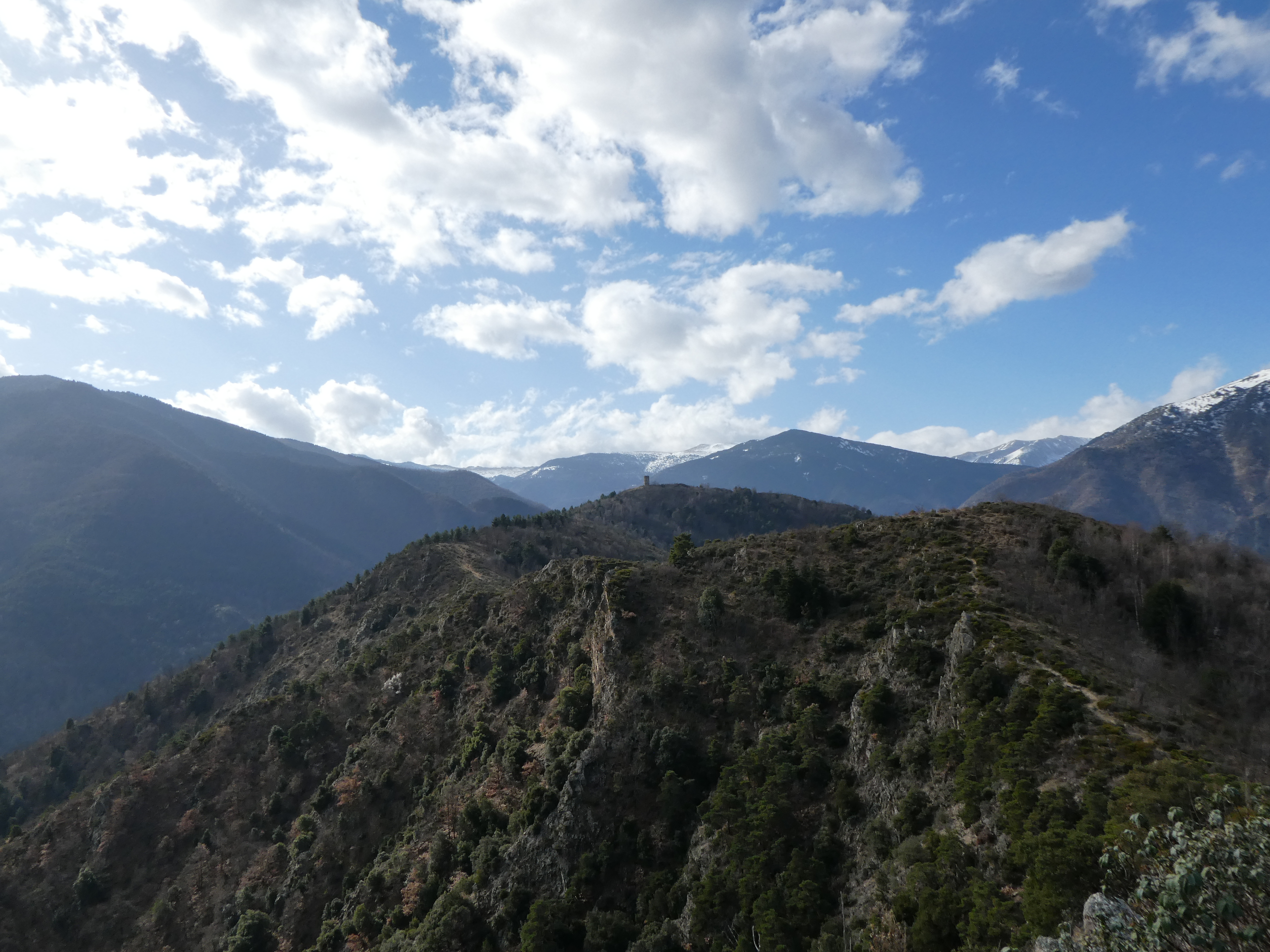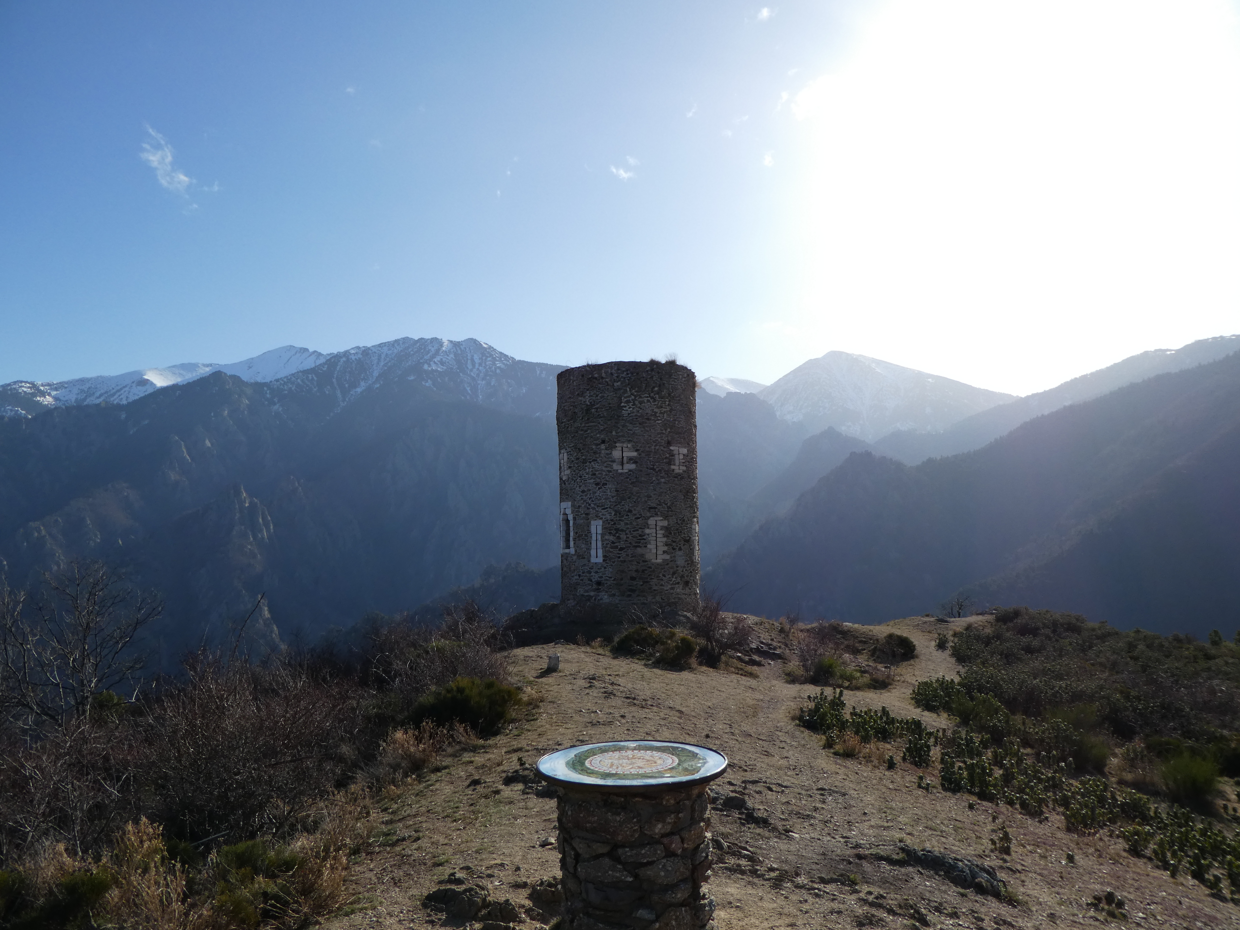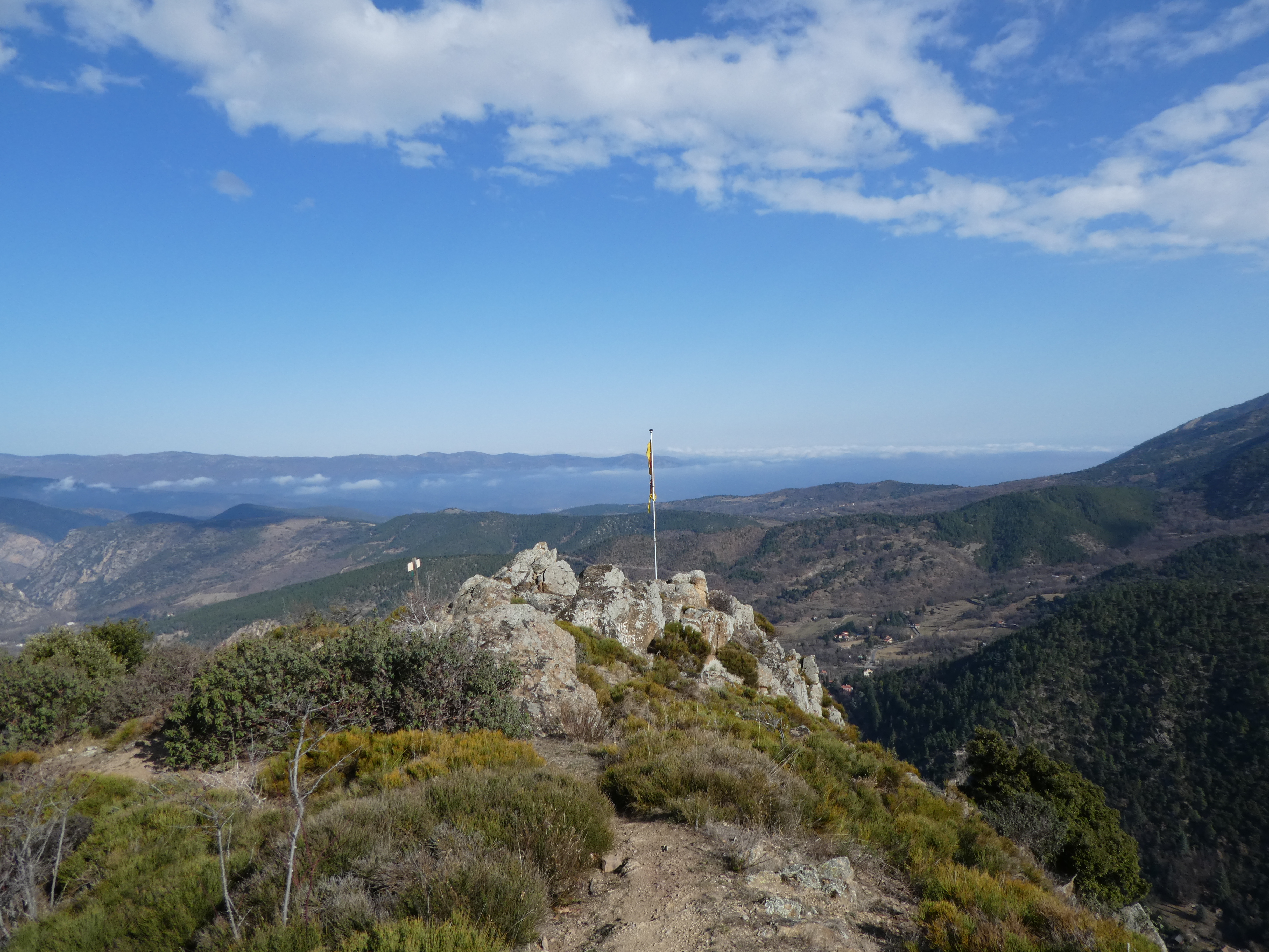 Arrivée au sommet de la Torre de Goà (1267 m) : beau point de vue sur le massif du Canigou, les sommts du Conflent, du Capcir, du Fenouillèdes ainsi que sur la Vallée de la Têt ... la Plaine du Roussillon est encore sous les nuages bas