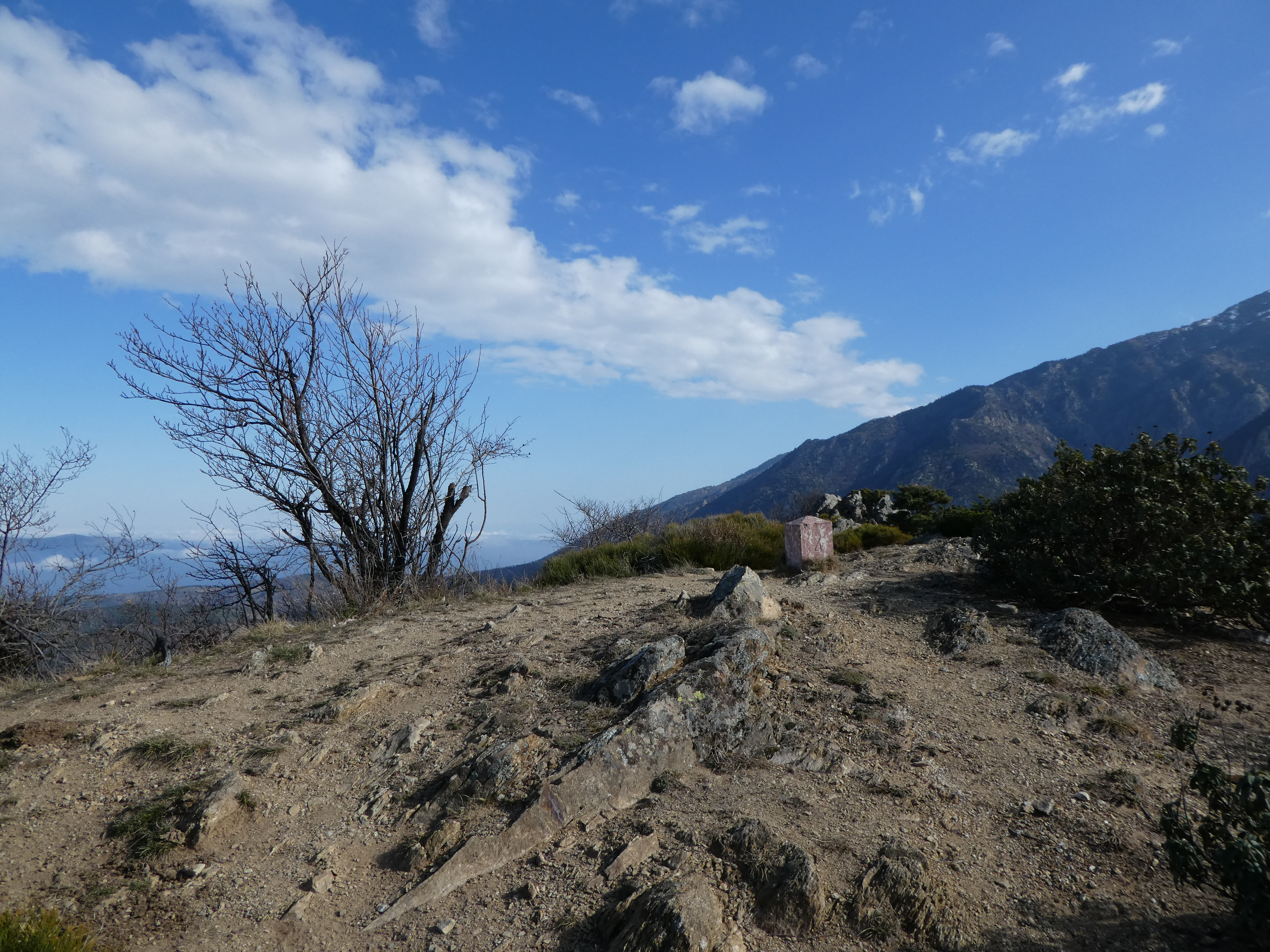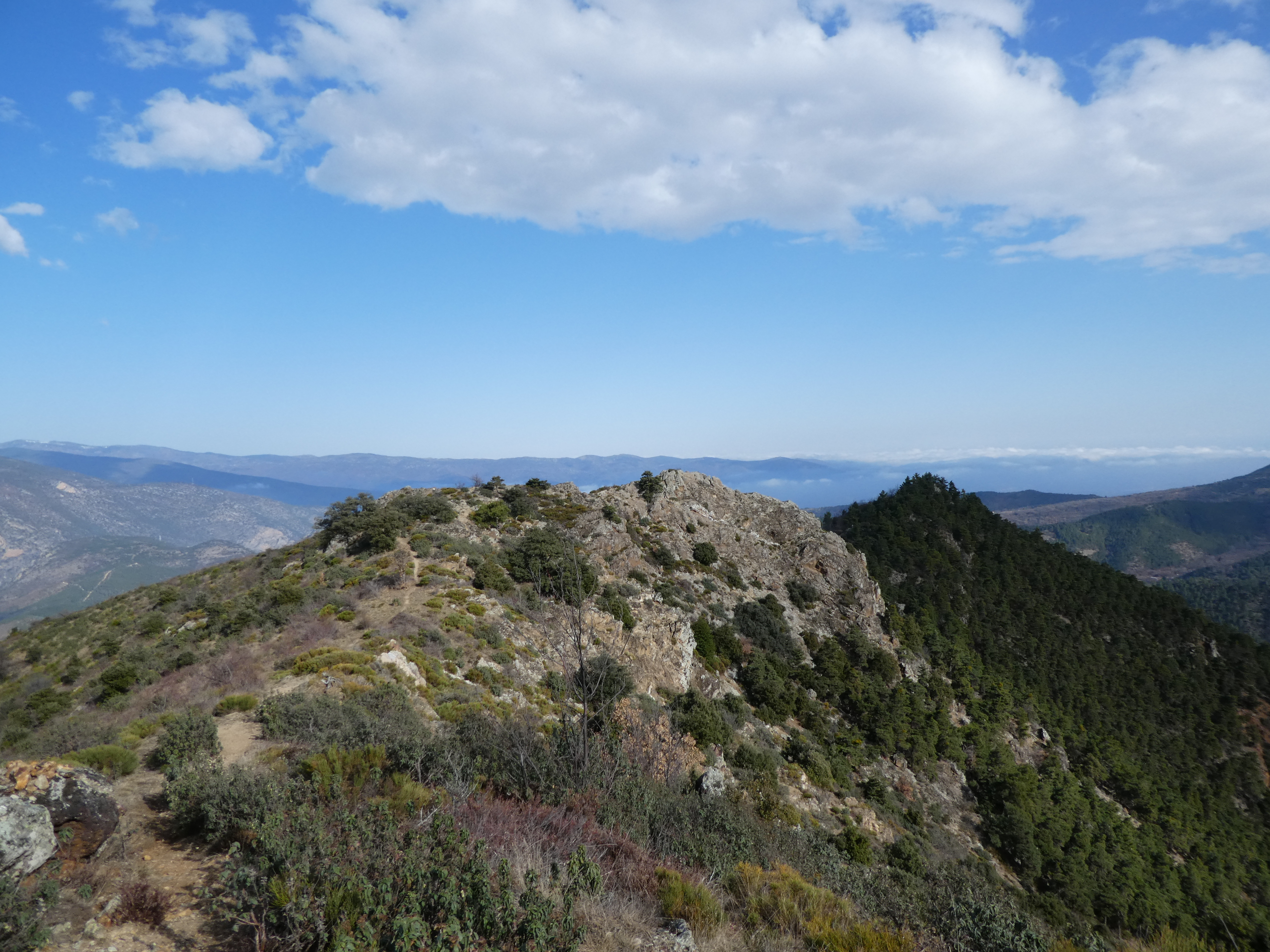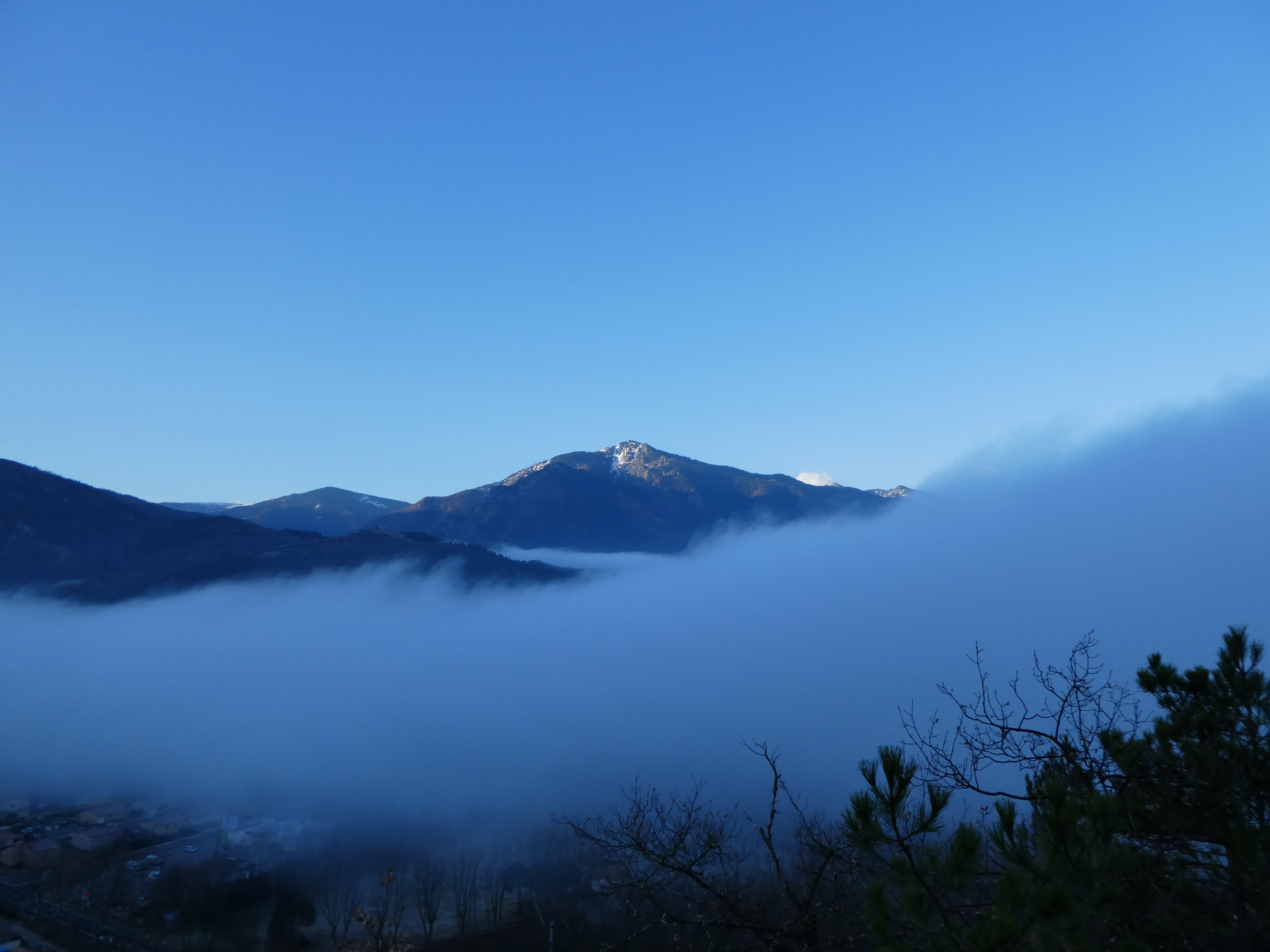Arrivée au sommet de la Torre de Goà (1267 m) : beau point de vue sur le massif du Canigou, les sommts du Conflent, du Capcir, du Fenouillèdes ainsi que sur la Vallée de la Têt ... la Plaine du Roussillon est encore sous les nuages bas
