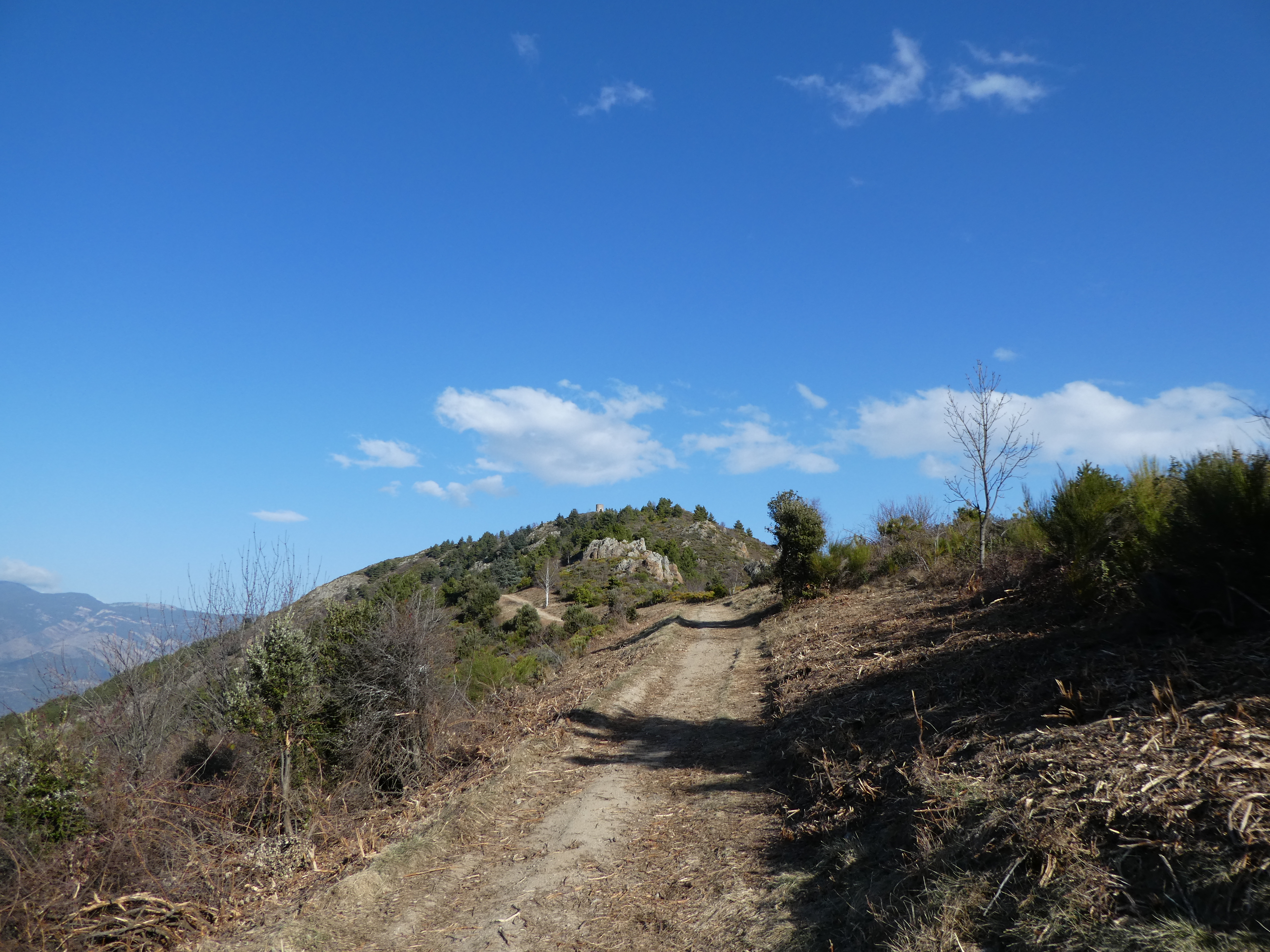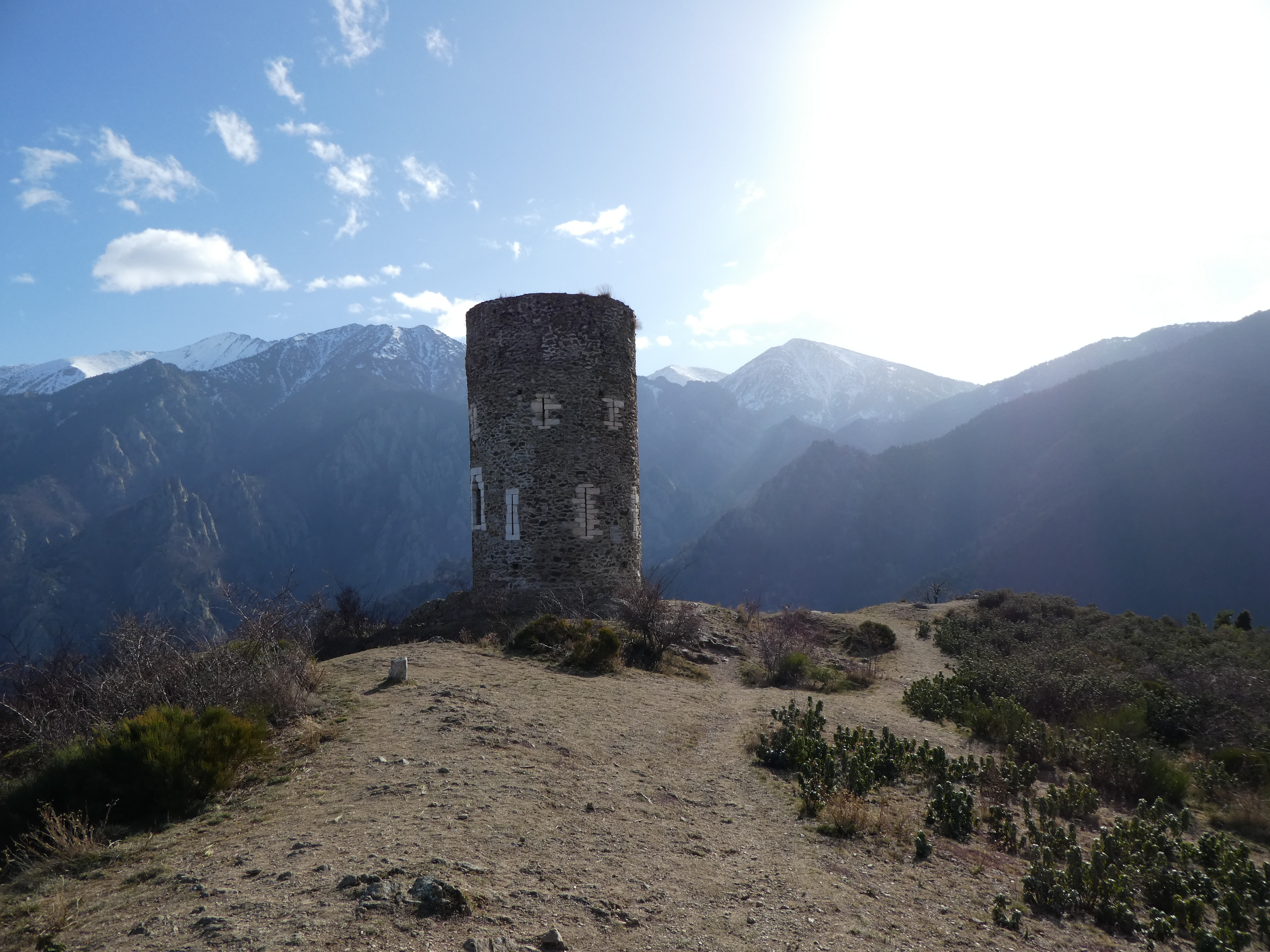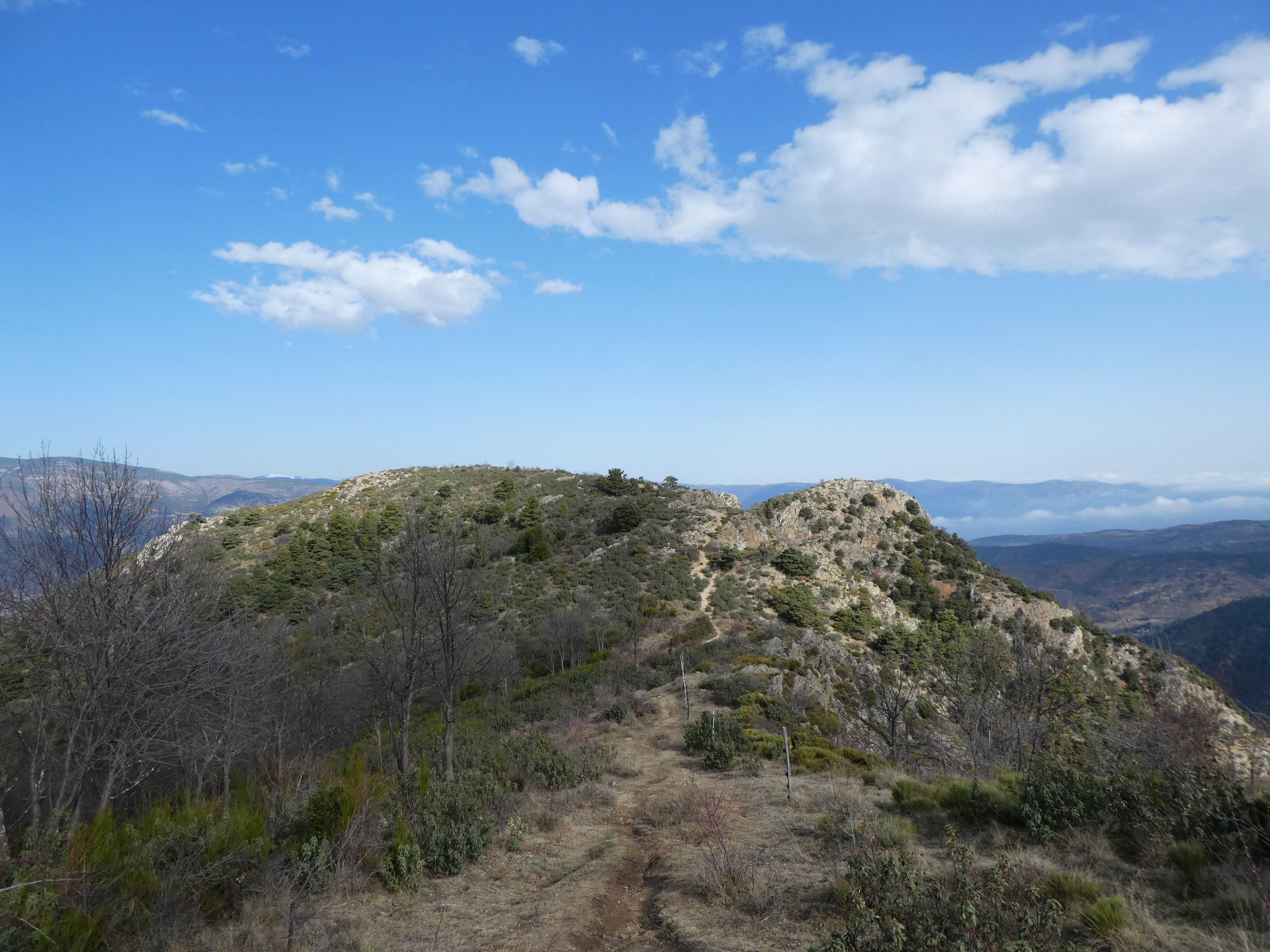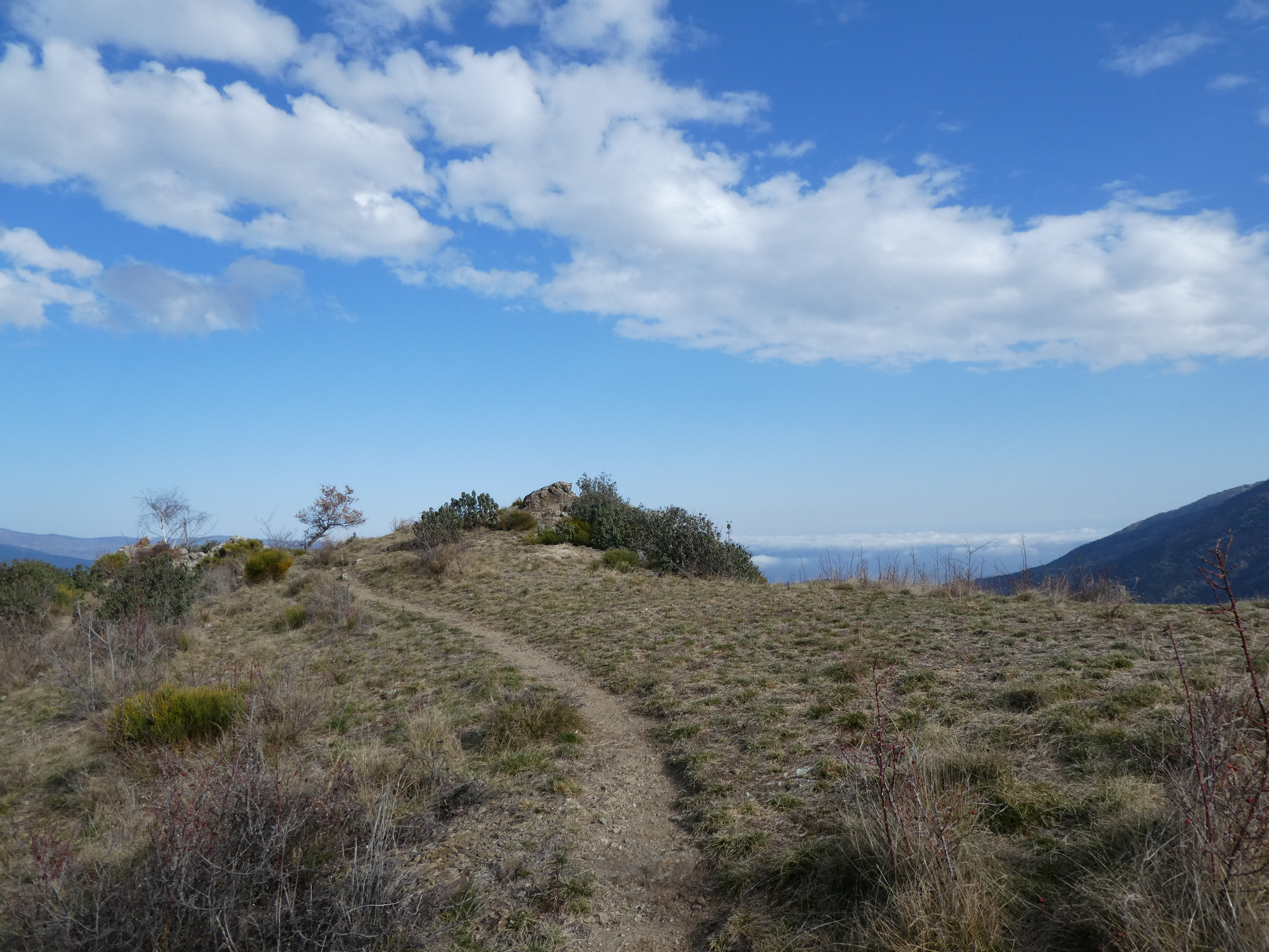 Arrivée au sommet de la Torre de Goà (1267 m) : beau point de vue sur le massif du Canigou, les sommts du Conflent, du Capcir, du Fenouillèdes ainsi que sur la Vallée de la Têt ... la Plaine du Roussillon est encore sous les nuages bas