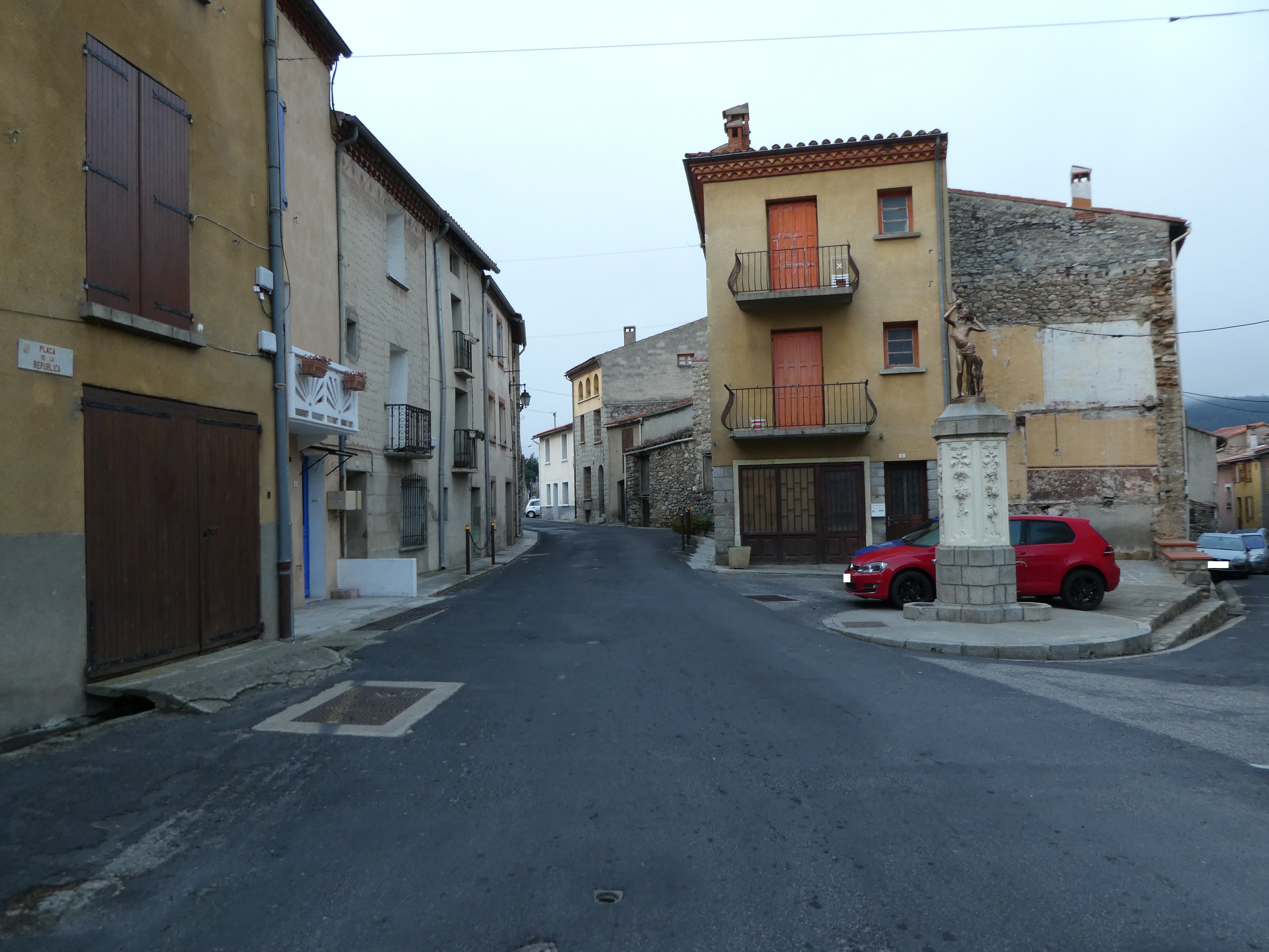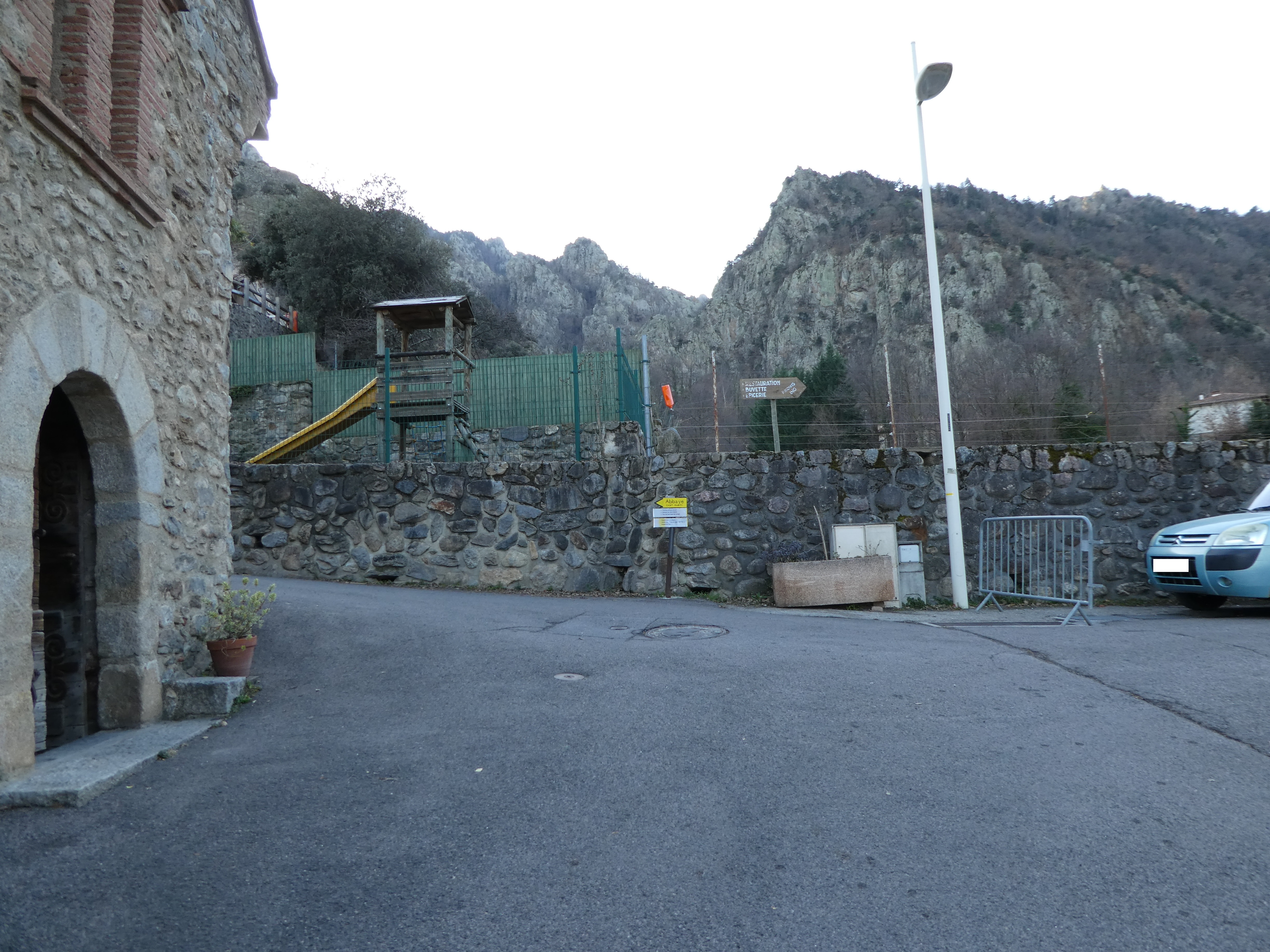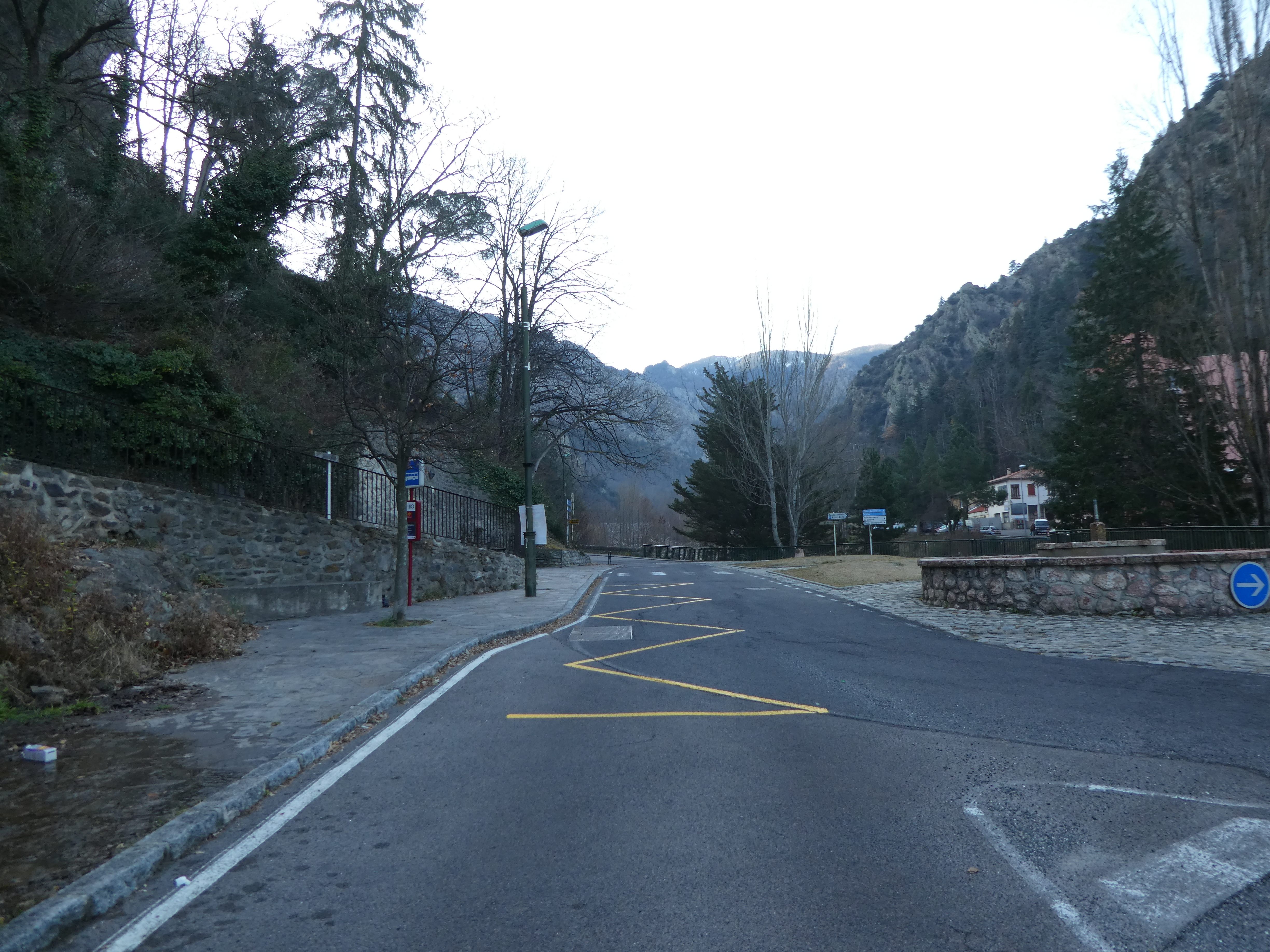 A cette intersection située au niveau de la place de l'office de tourisme (350 mètres après la précédente mentionnée), suivre la rue partant sur la gauche direction Casteil, balisé en jaune et blanc dorénavant (il est possible de démarrer la randonnée à partir d'ici et économiser environ 7,5 kilomètres et 2h30 de marche, itinéraire classique de montée vers la Torre de Goà)