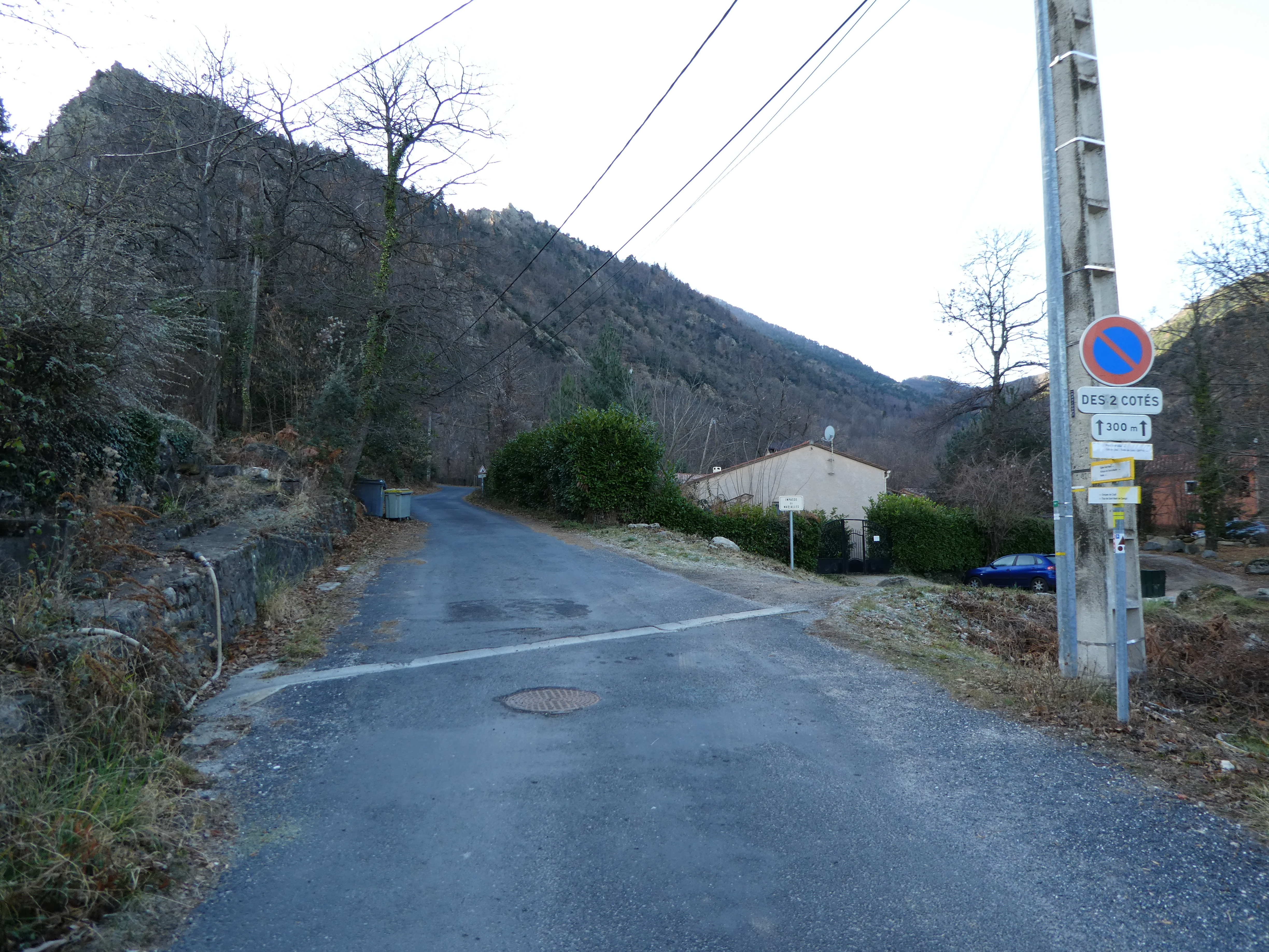 A cette intersection située au centre de Casteil (150 mètres après la précédente), suivre la rue partant sur la droite direction Coll de Jou - Torre de Goà, balisé en jaune et blanc (la rue partant sur la gauche mène à l'Abbaye Saint-Martin-du-Canigou)