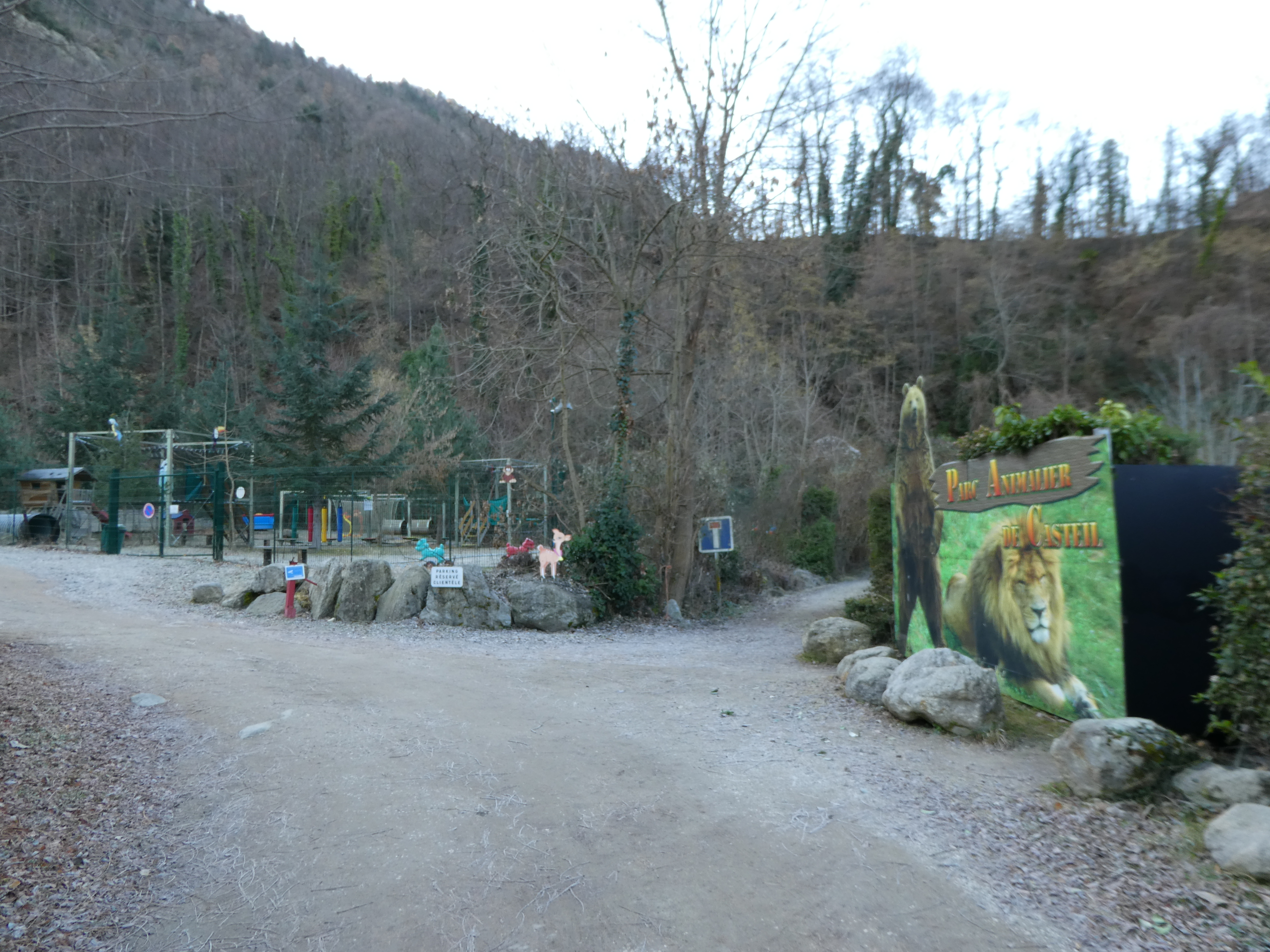A ce croisement marqué par la présence d'un panneau directionnel (150 mètres après la précédente intersection), suivre le chemin descendant sur la droite puis le chemin partant sur la gauche 150 mètres plus loin vers le Parc Animalier de Casteil direction Coll de Jou - Torre de Goà, balisé en jaune et blanc
