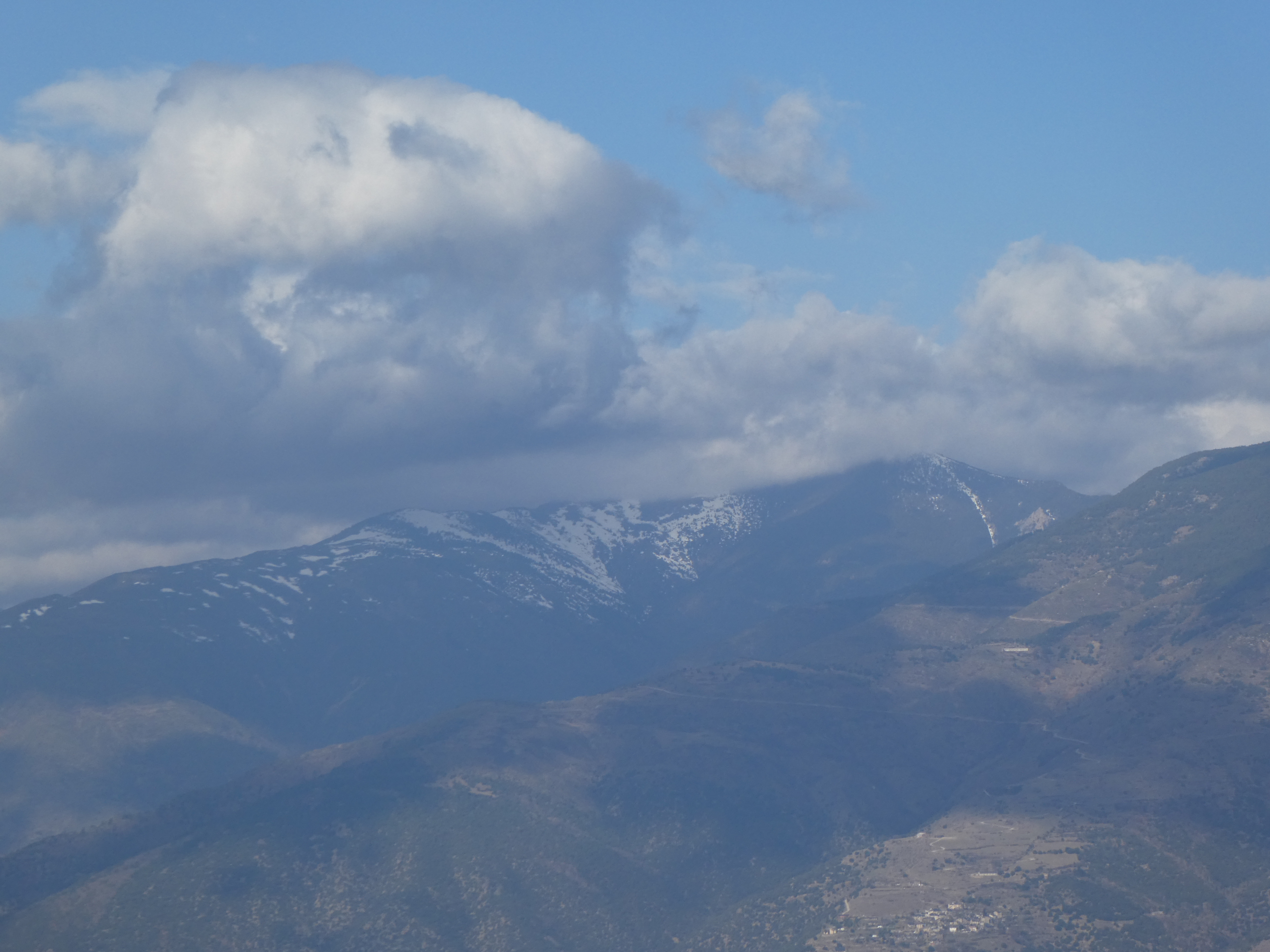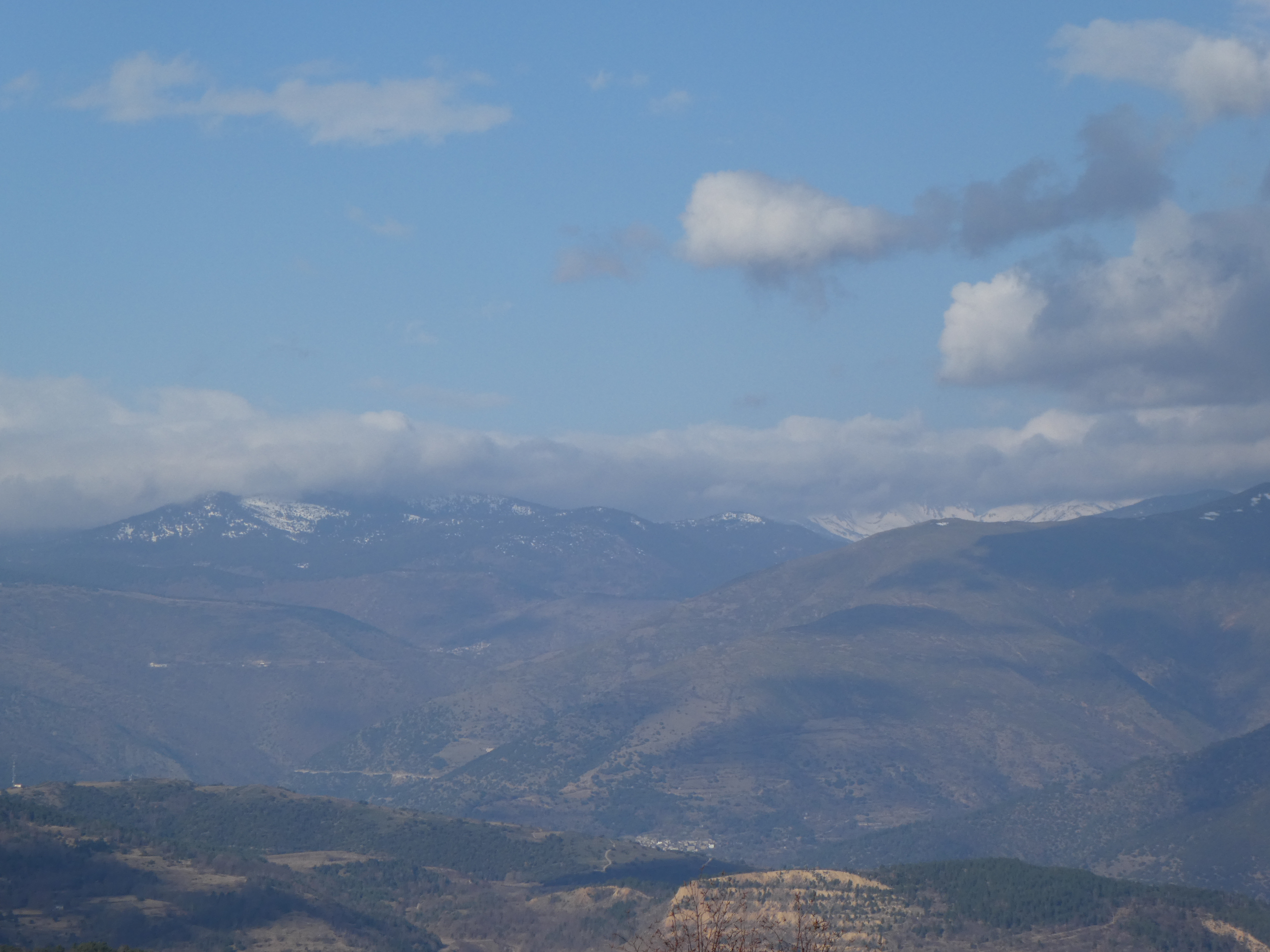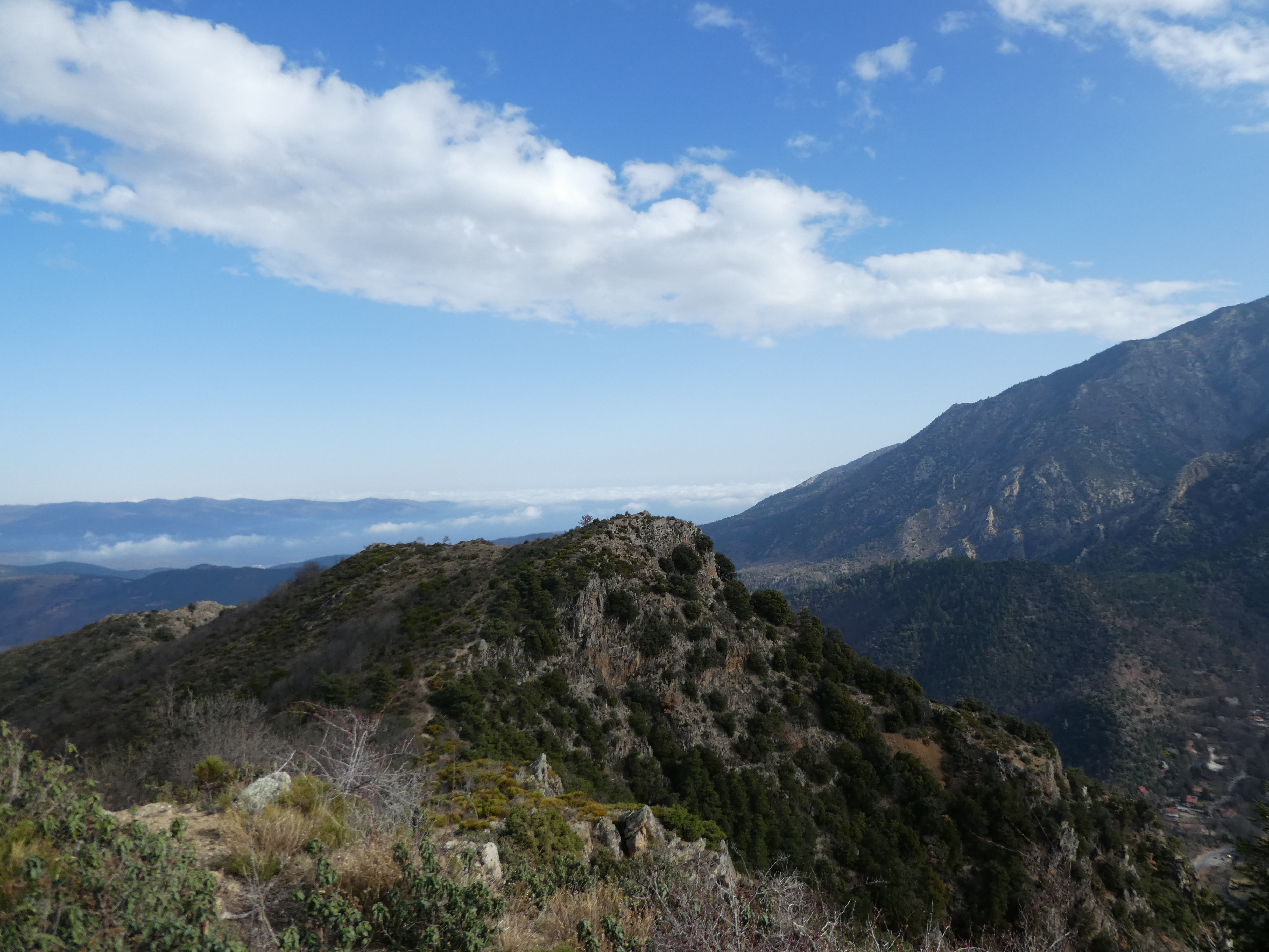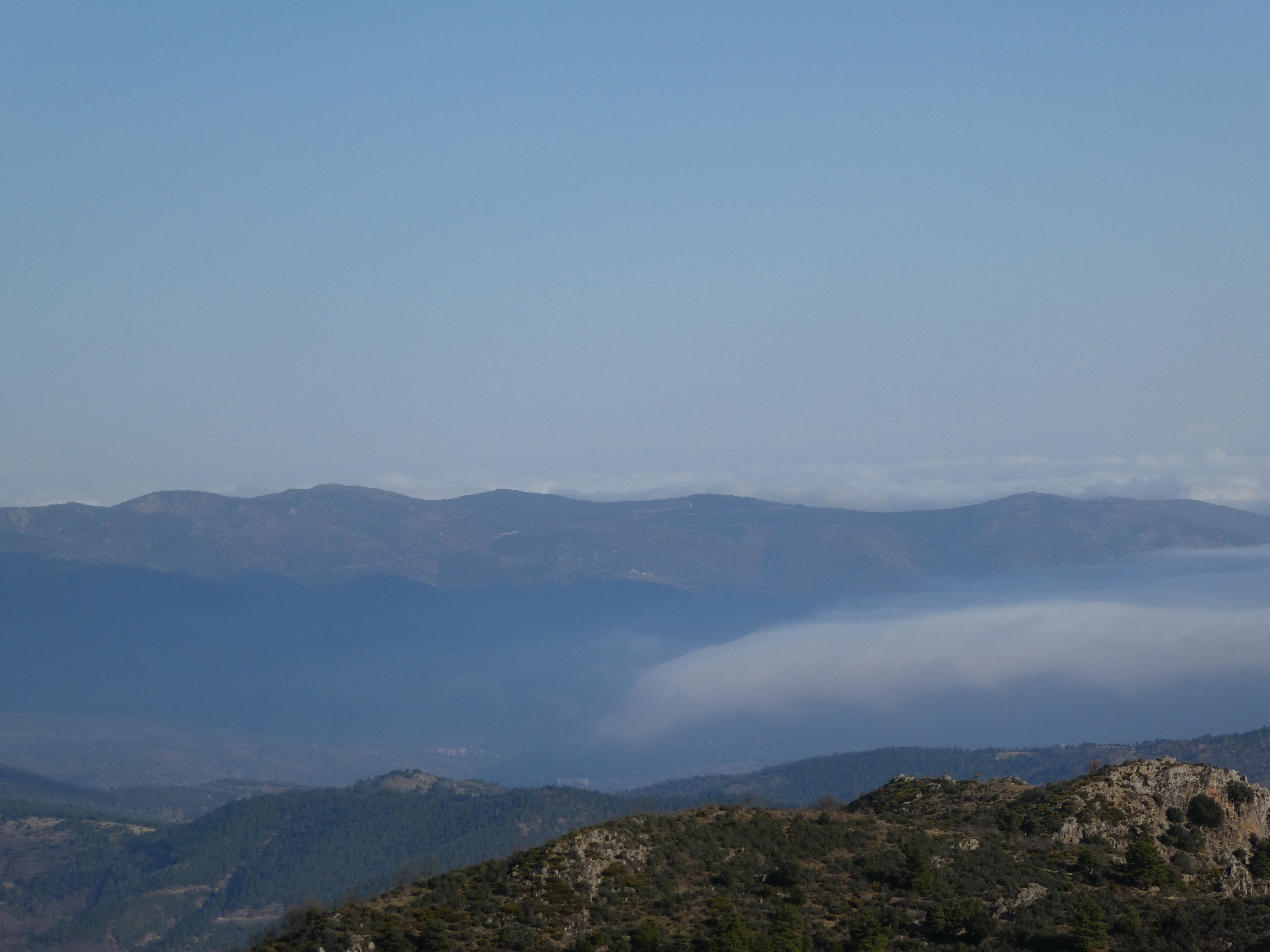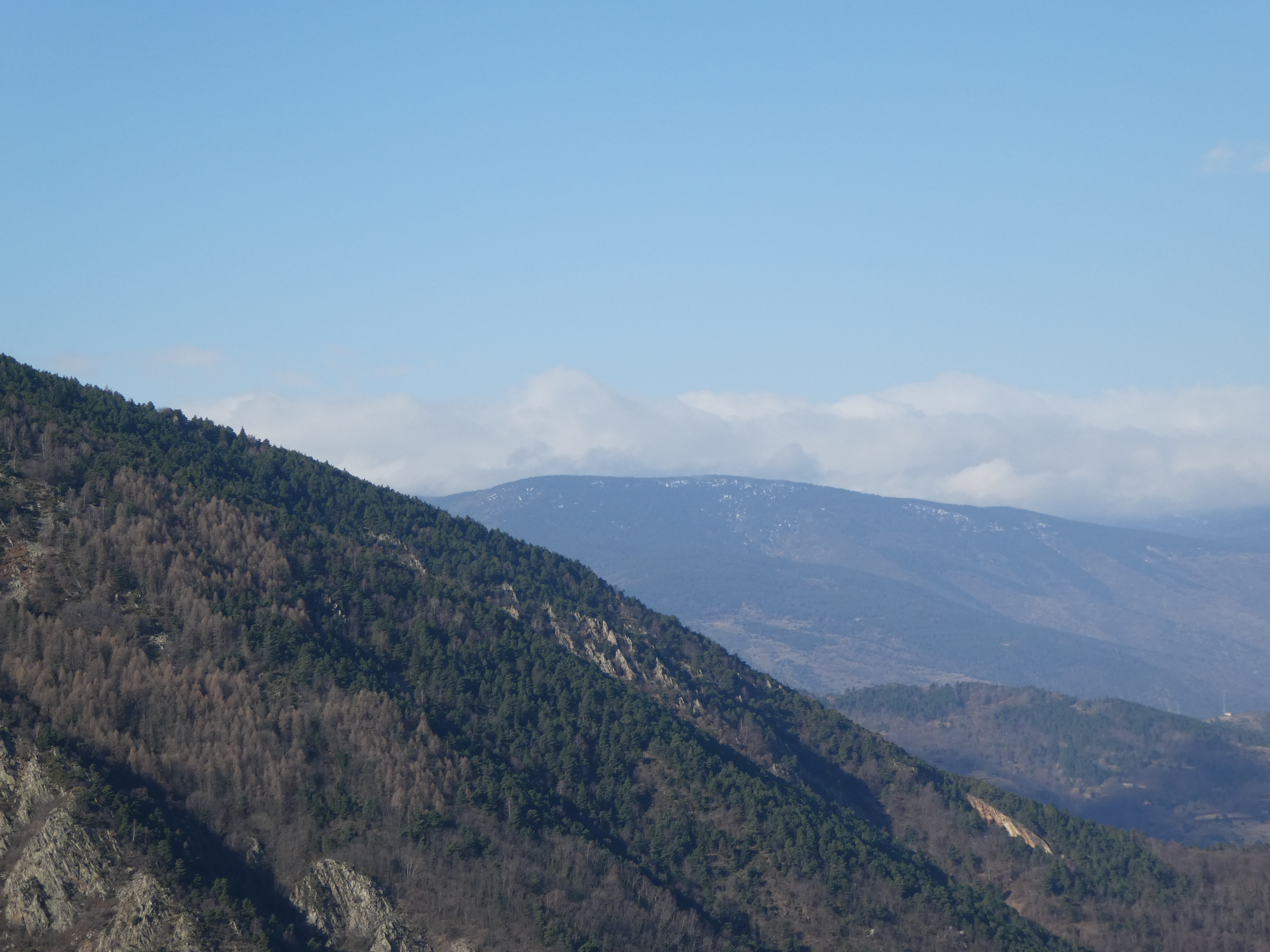 Zoom sur les premiers sommets du massif du Madres dans les nuages également