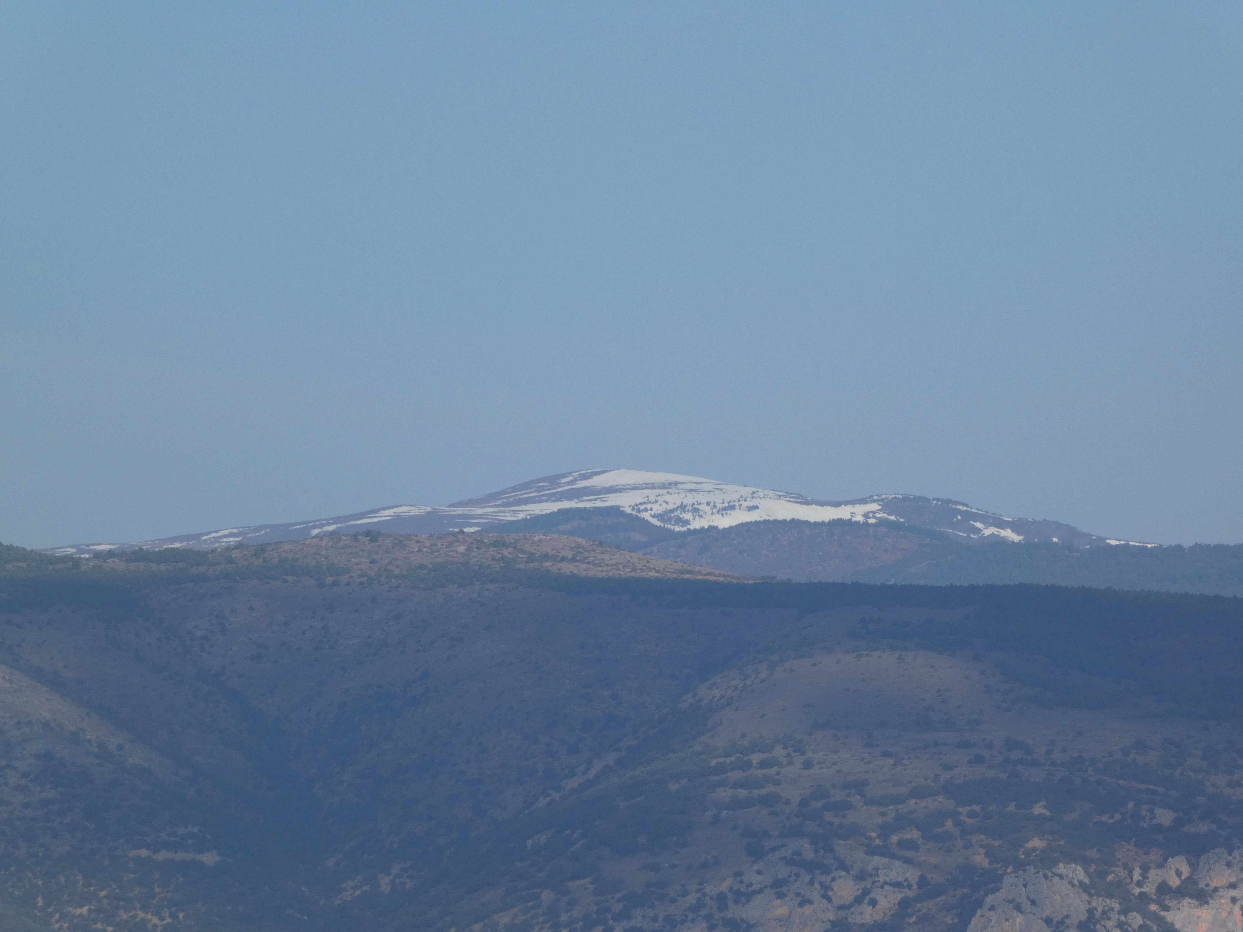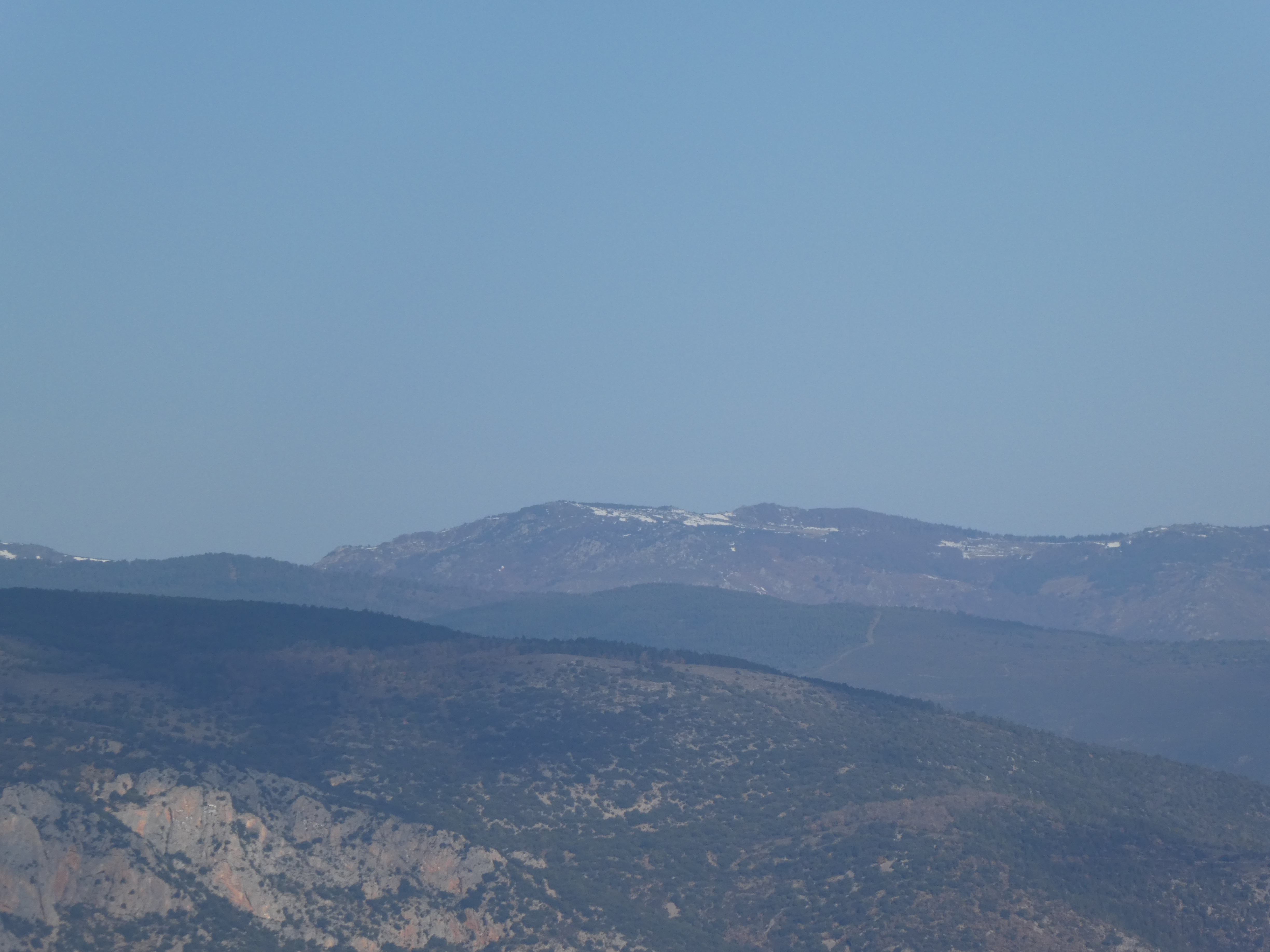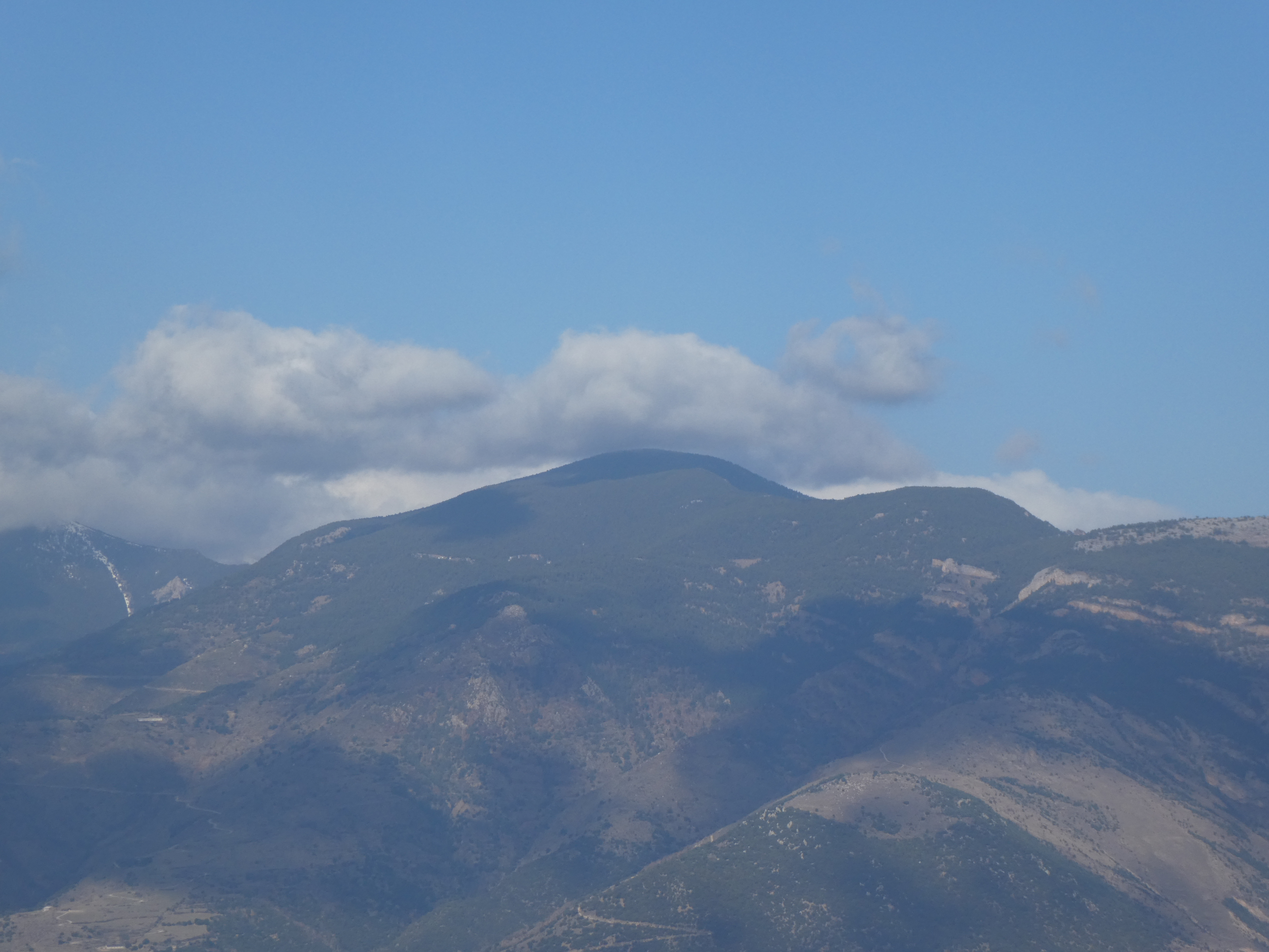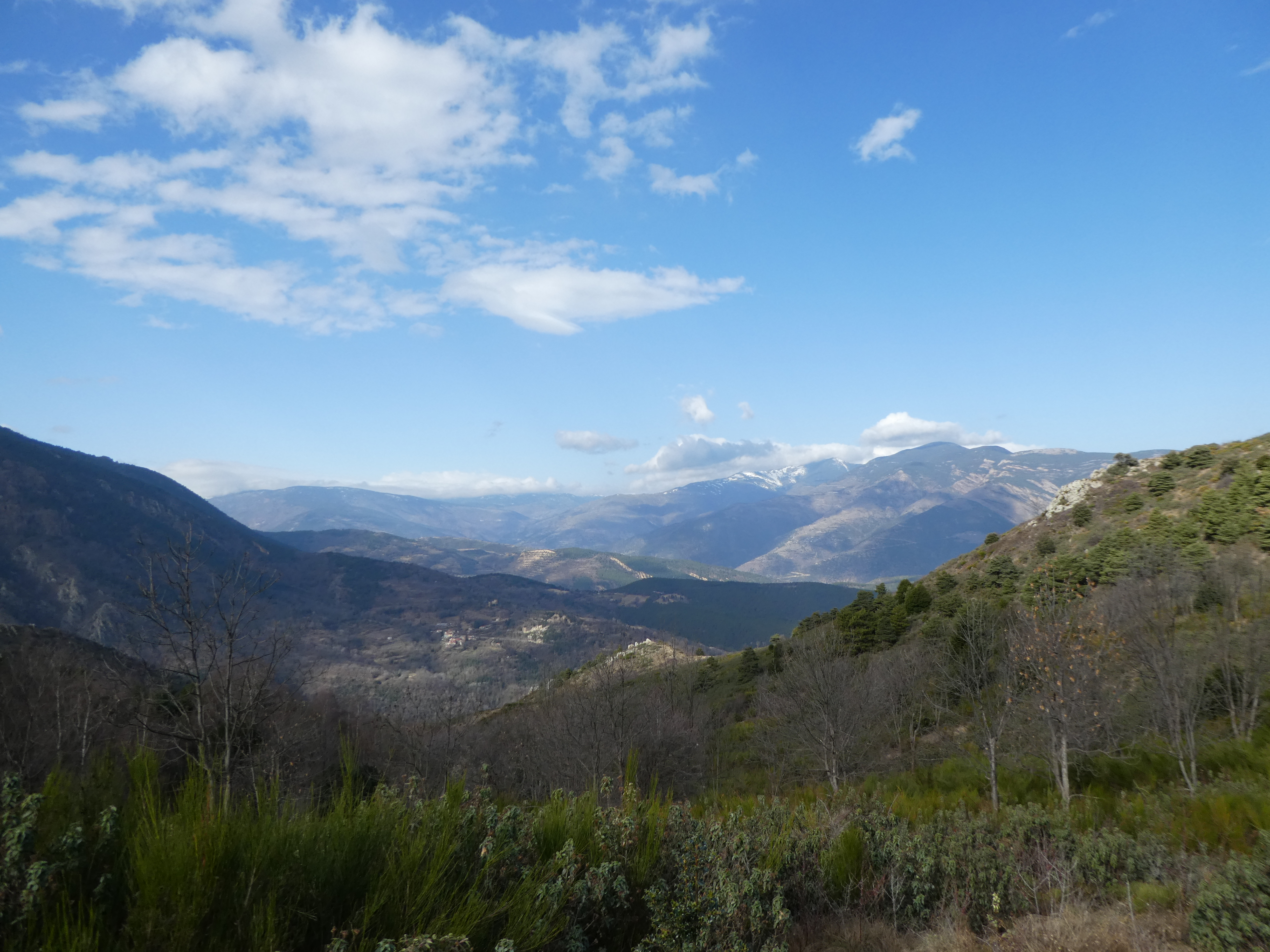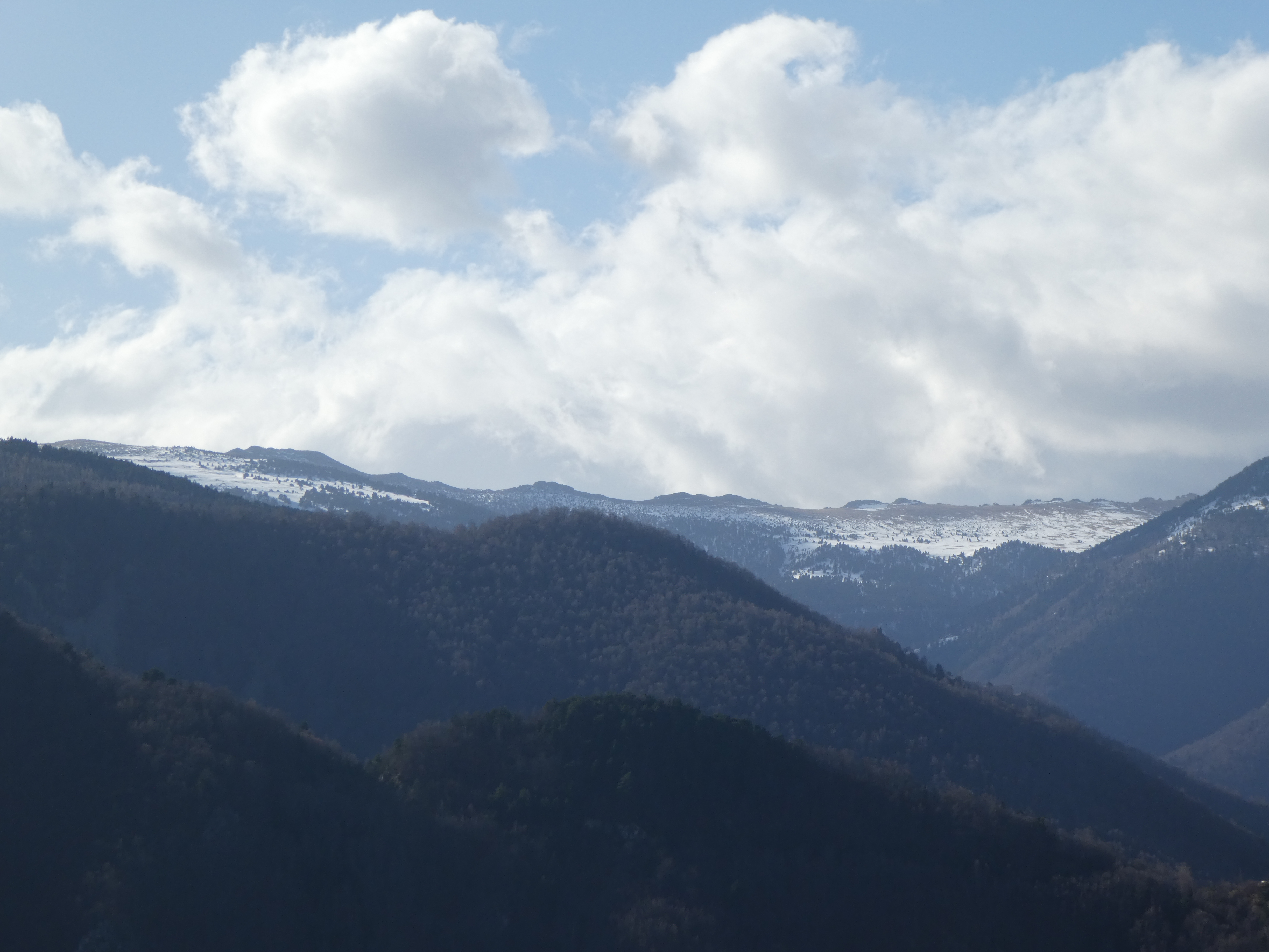 Zoom sur les premiers sommets du massif du Madres dans les nuages également