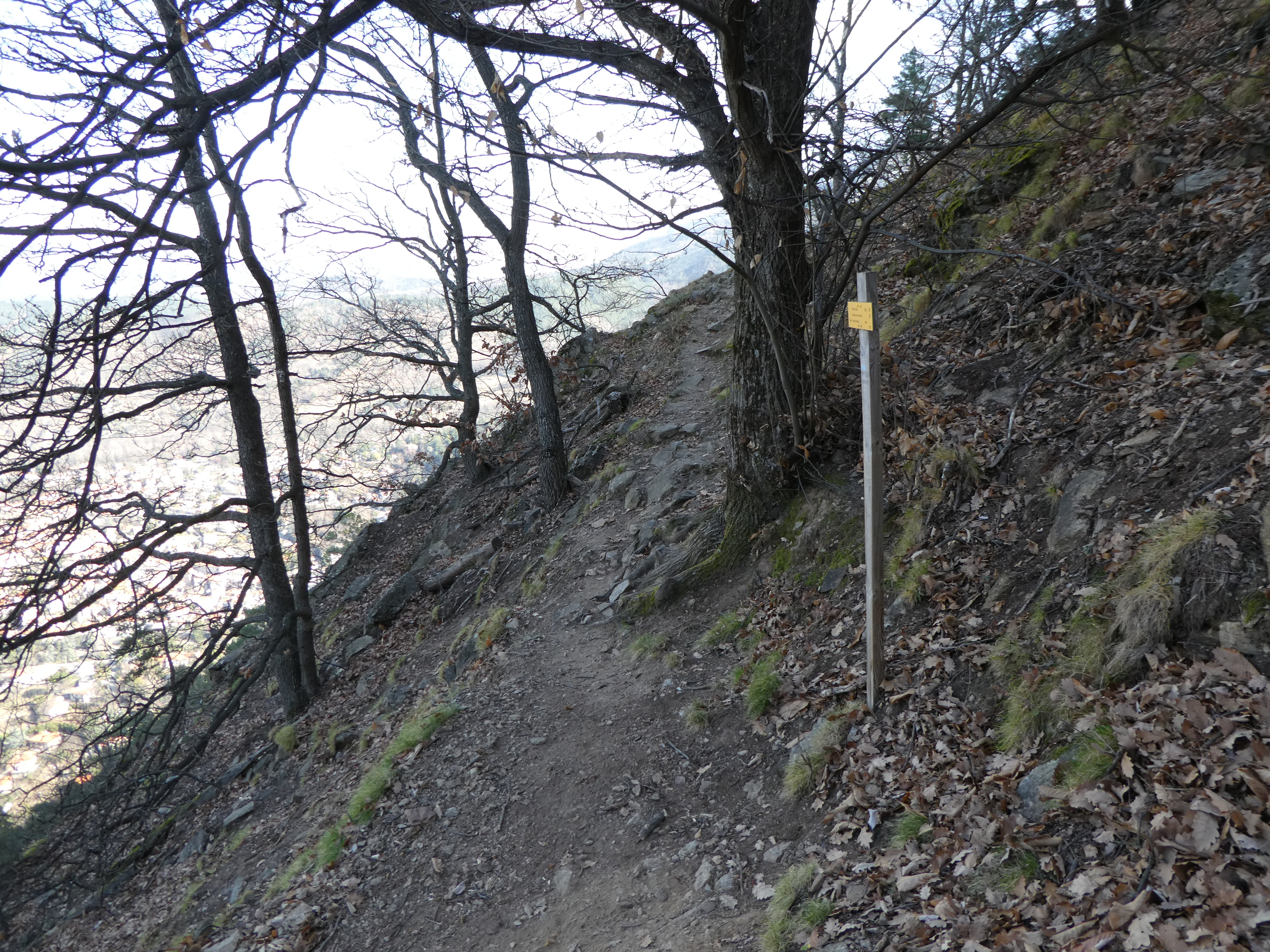 A ce croisement marqué par la présence d'un panneau directionnel (200 mètres après avoir quitté le sommet du Pic de la Pena), suivre le chemin descendant raidement en quasi demi-tour sur la gauche direction Vernet-les-Bains, balisé en jaune et blanc dorénavant (direction non mentionnée sur le panneau directionnel)
