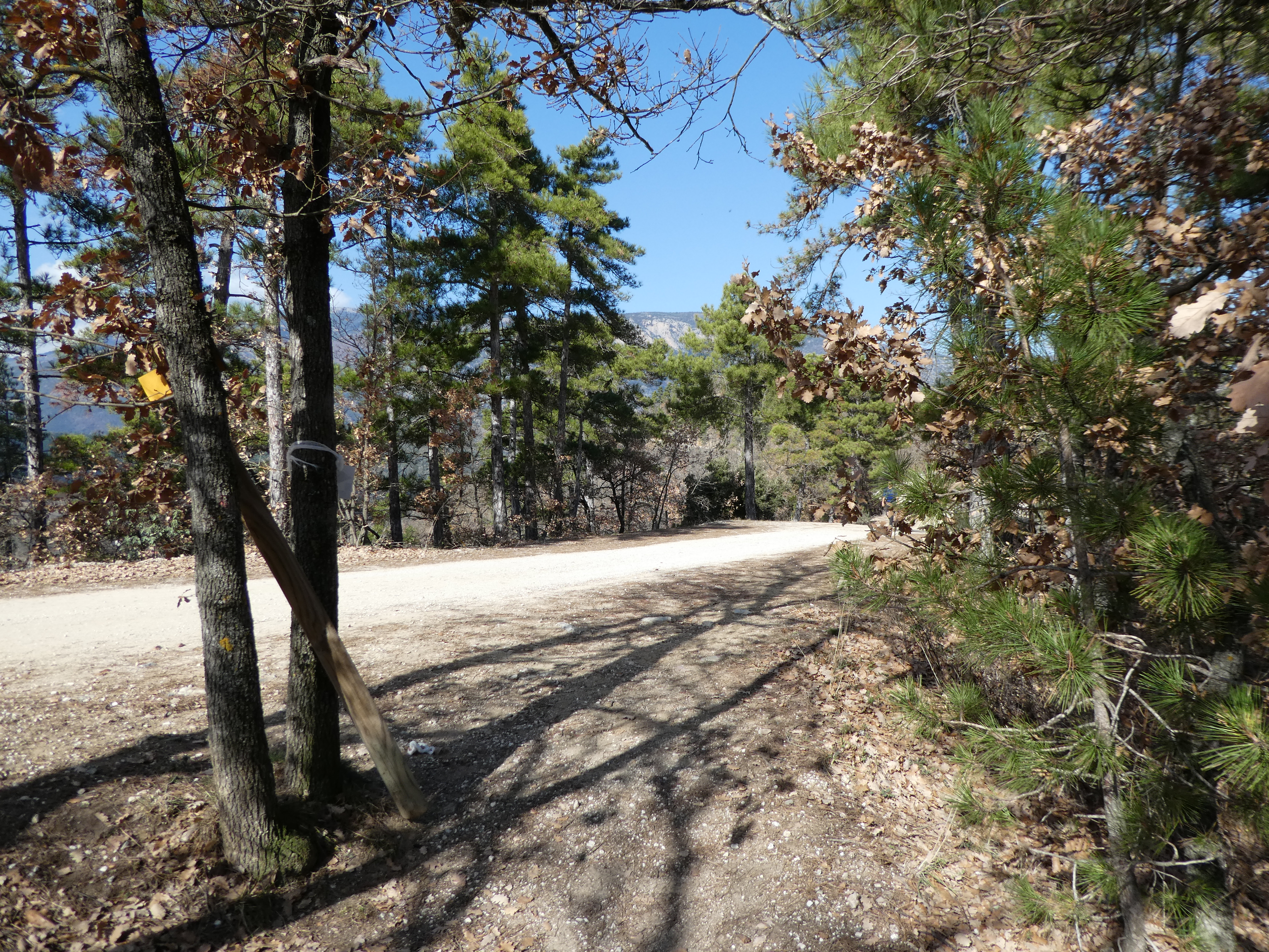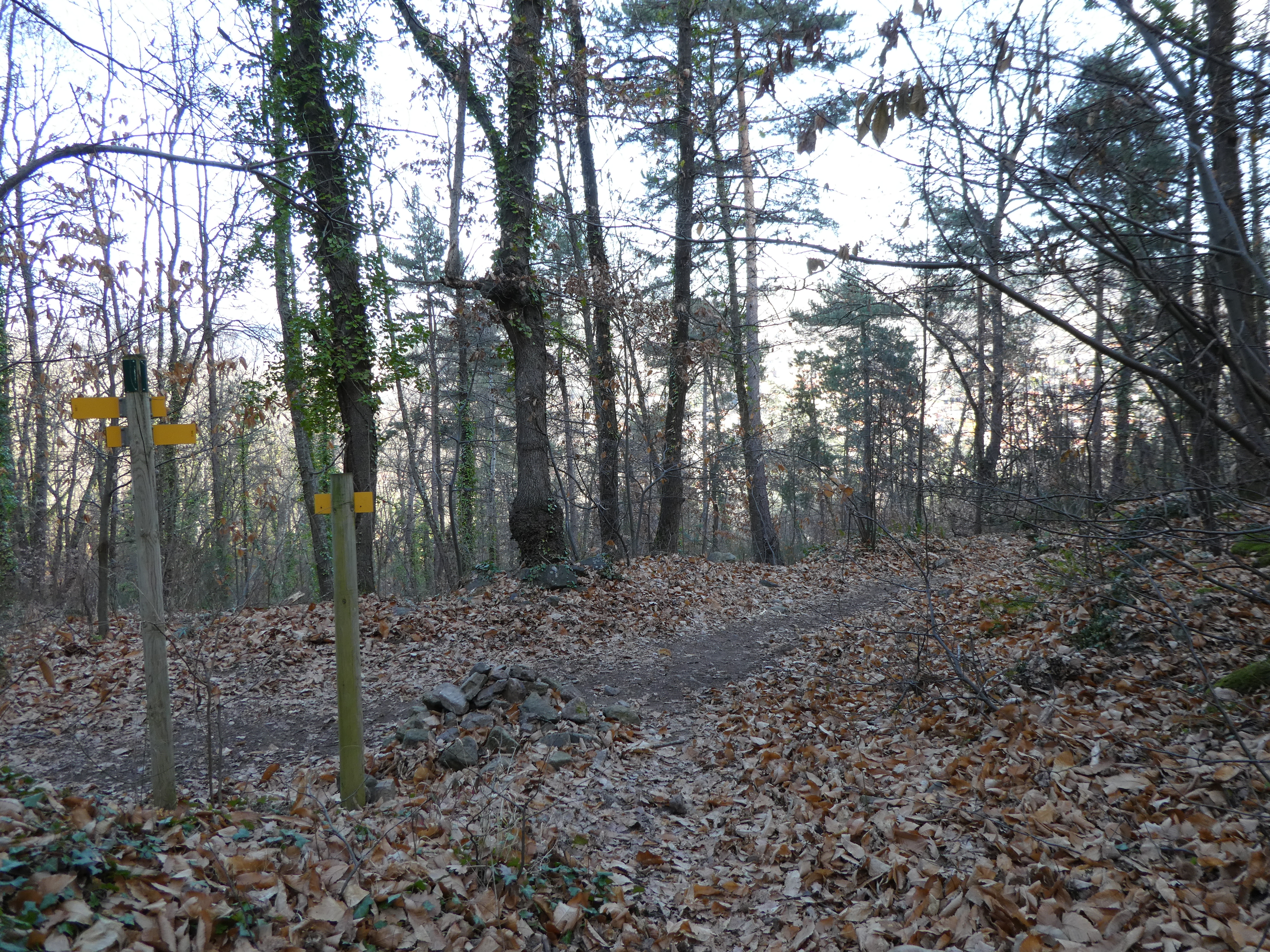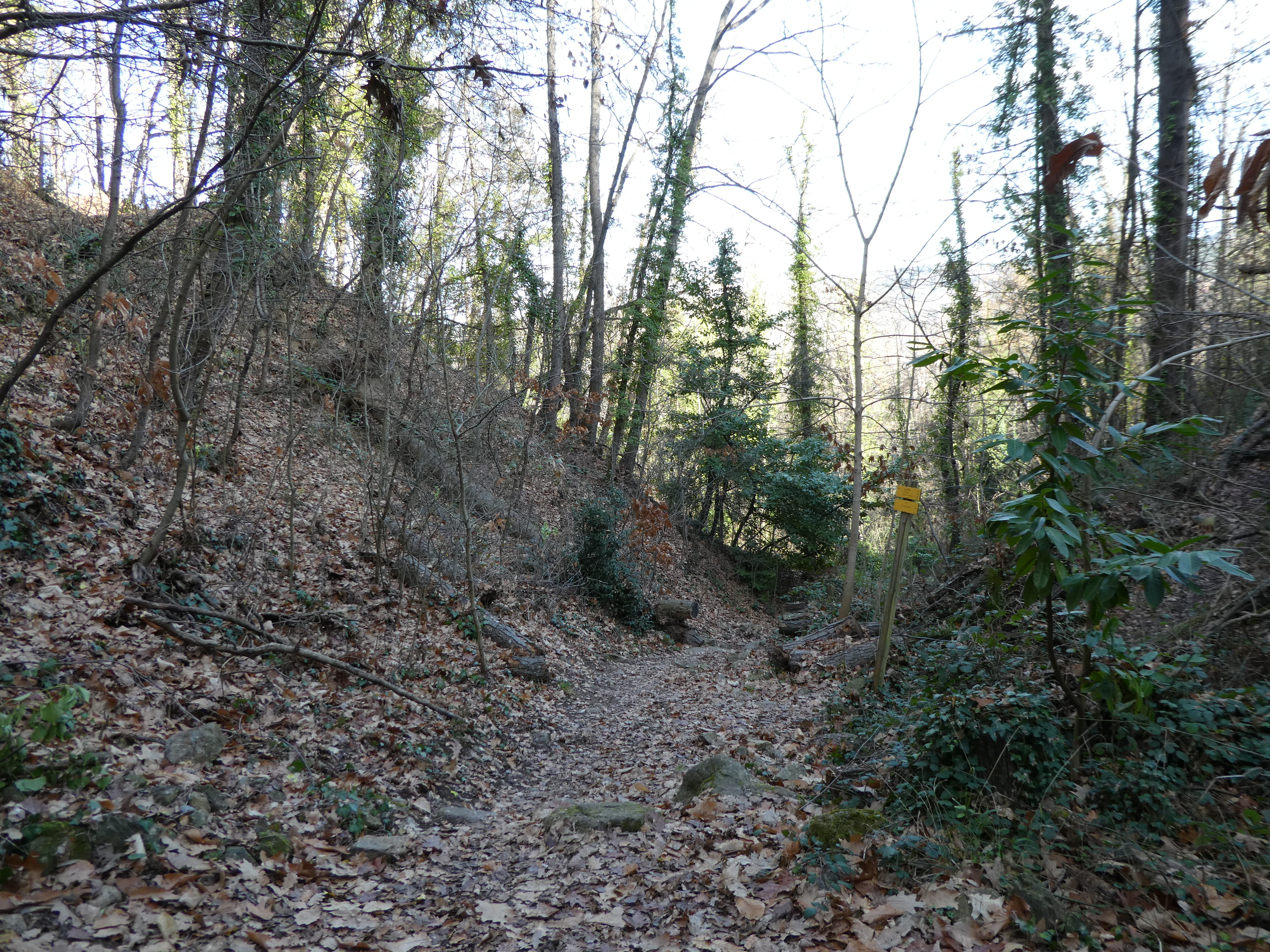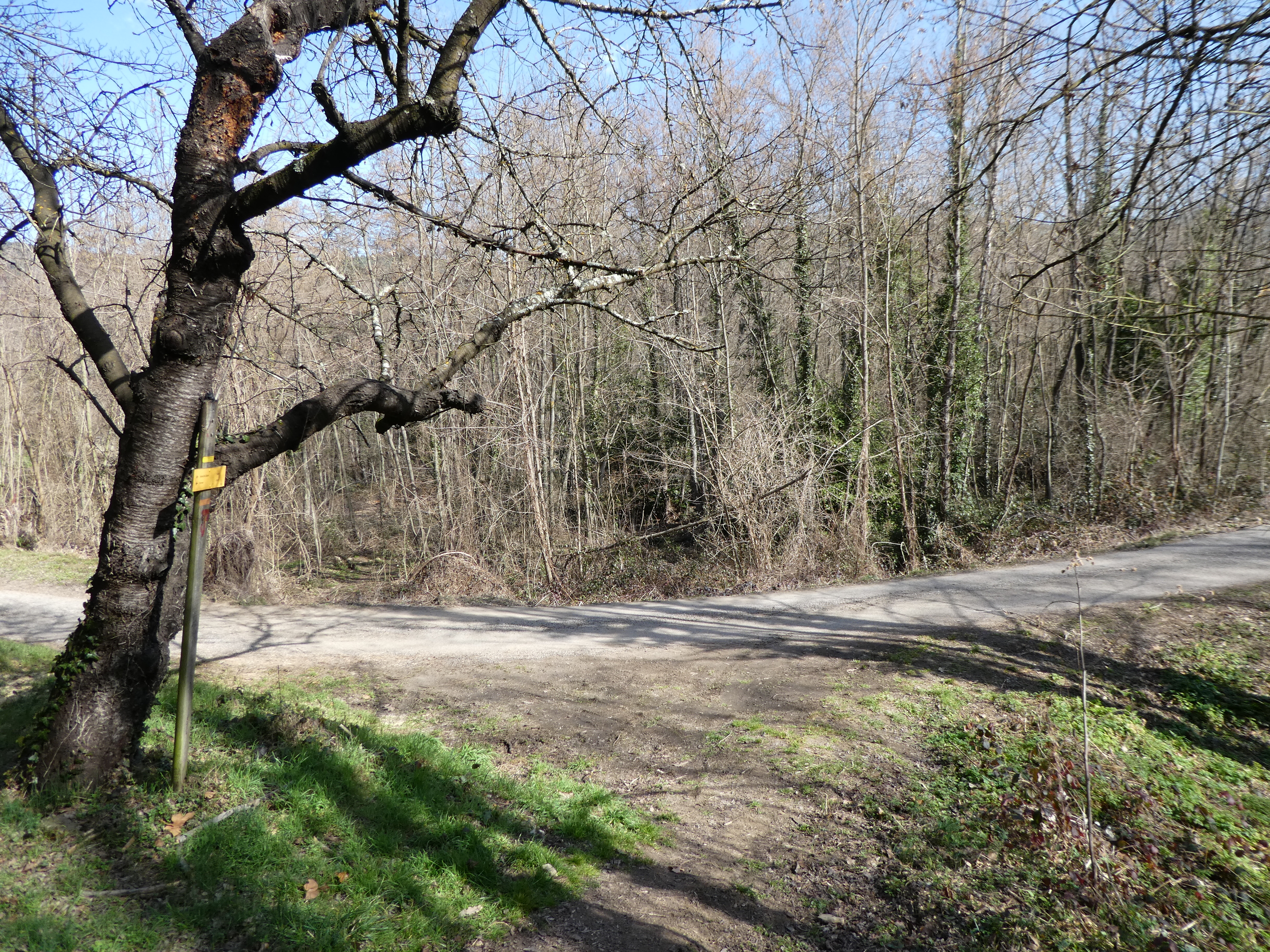 Coll de Jou (1128 m) : suivre le large chemin montant sur la droite direction Torre de Goà, balisé en jaune et blanc dorénavant (direction non mentionnée sur le panneau directionnel)