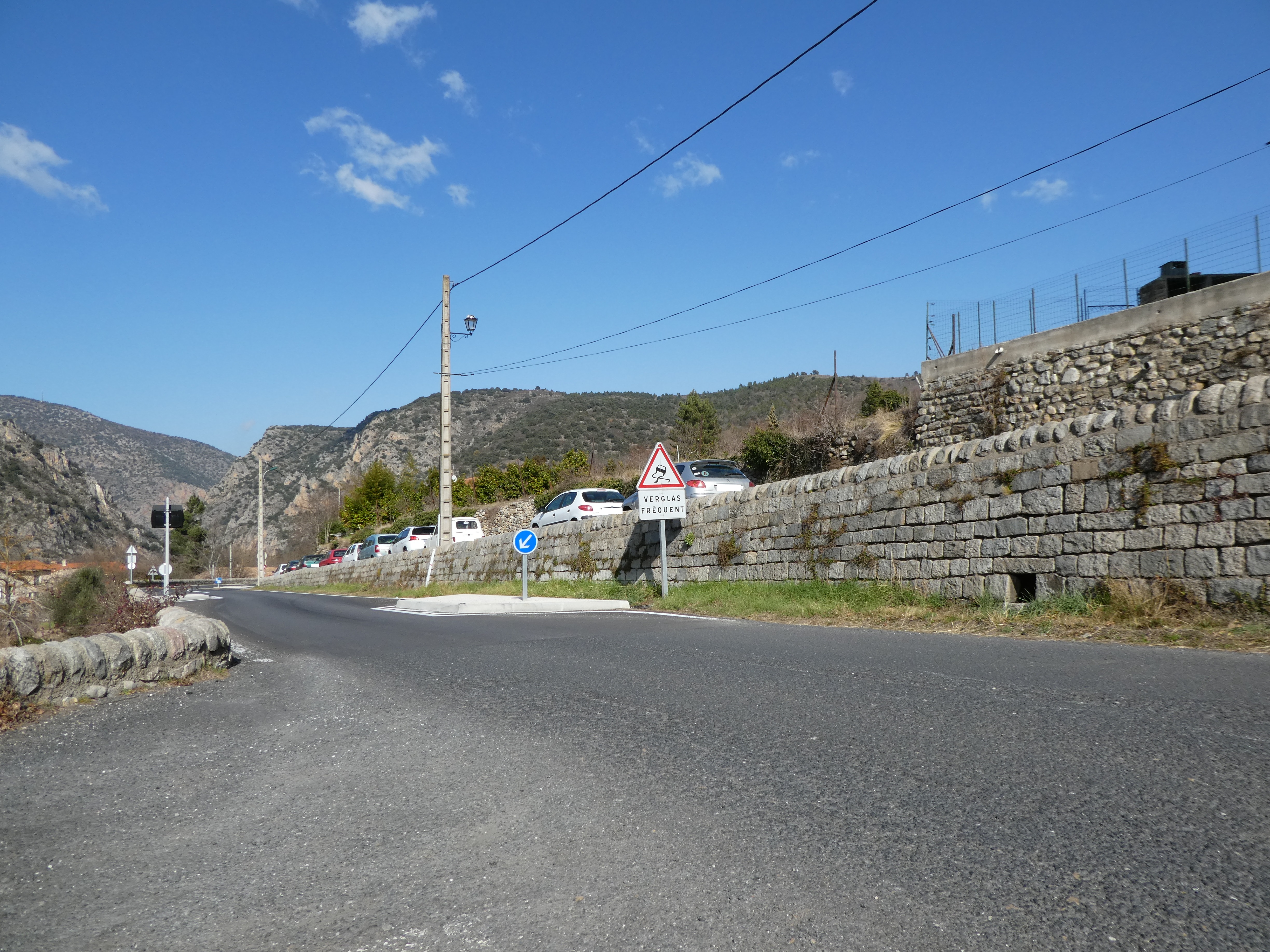 A cette intersection marquée par la présence d'un panneau directionnel (700 mètres après la précédente mentionnée), suivre la route partant sur la gauche direction Villefranche-de-Conflent, balisé en jaune et blanc