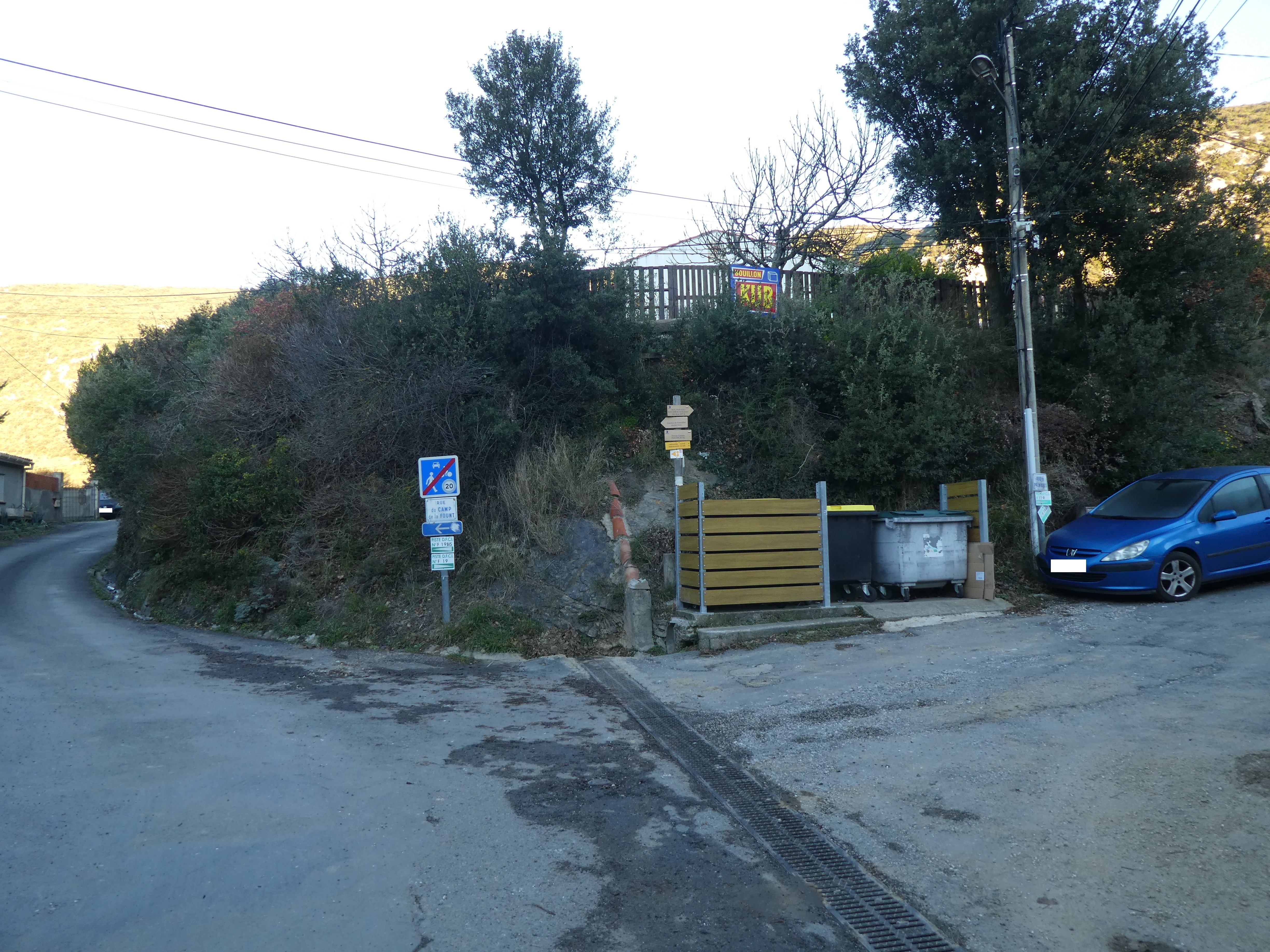 A ce croisement avec le GR36 et marqué par la présence d'un panneau directionnel (25 mètres après avoir quitté le sommet), suivre ce dernier sur la gauche direction Prugnanes, balisé en jaune, et en rouge et blanc dorénavant (retour dans le département des Pyrénées-Orientales)
