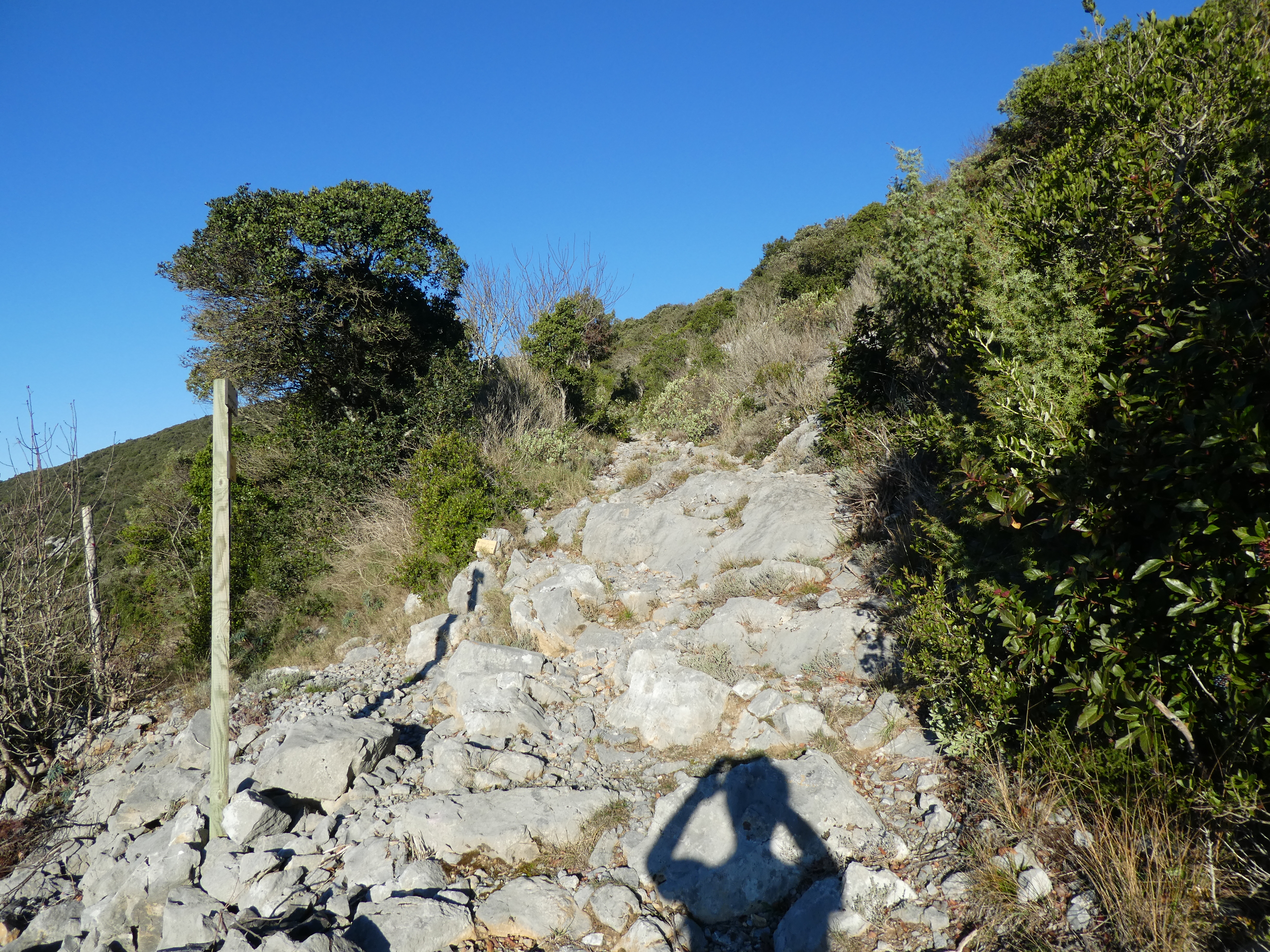 A ce croisement marqué par la présence d'un panneau directionnel (1000 mètres après le précédent), suivre le chemin montant sur la gauche direction Col du Lenti, balisé en rouge et blanc, et en jaune