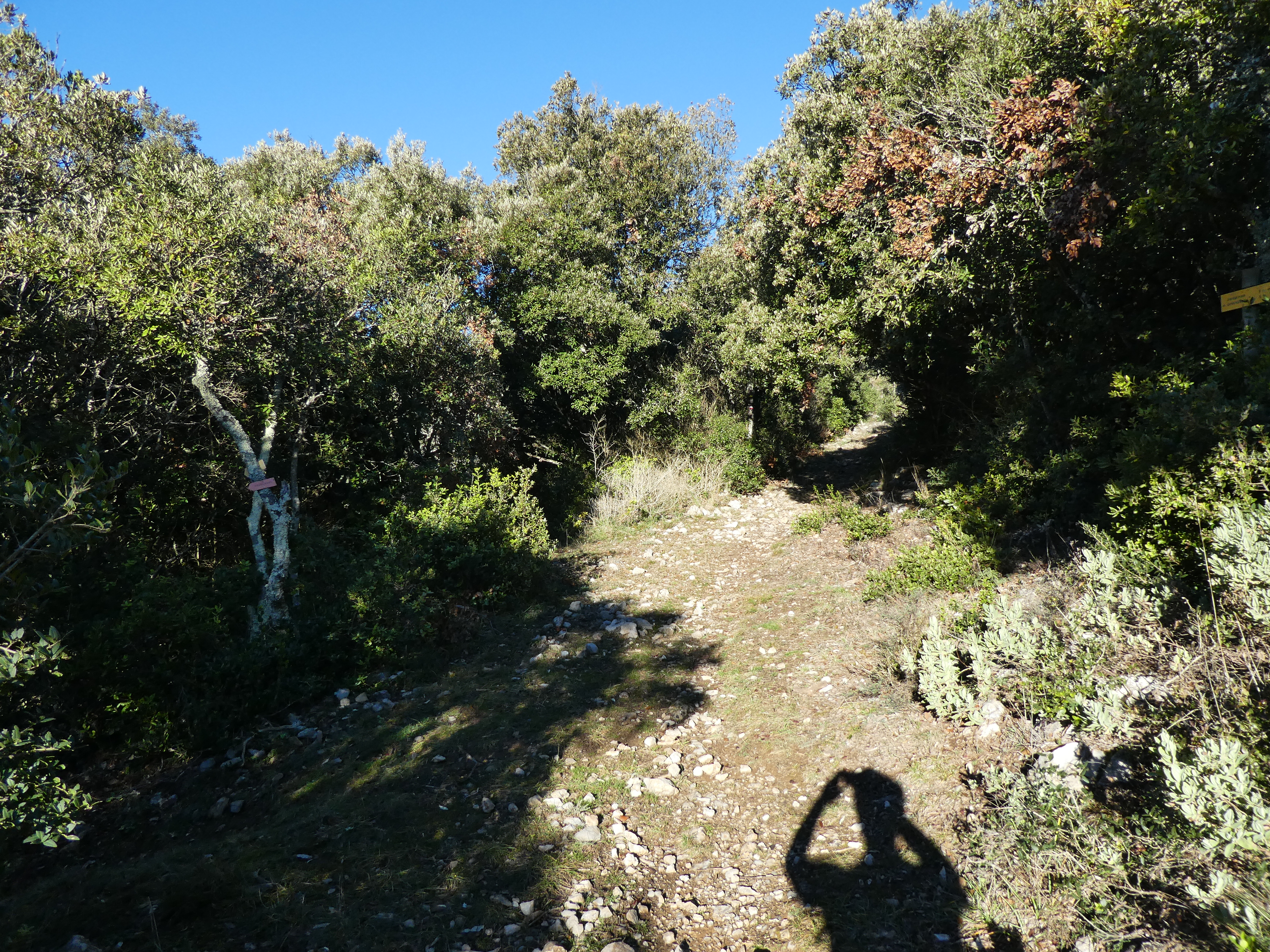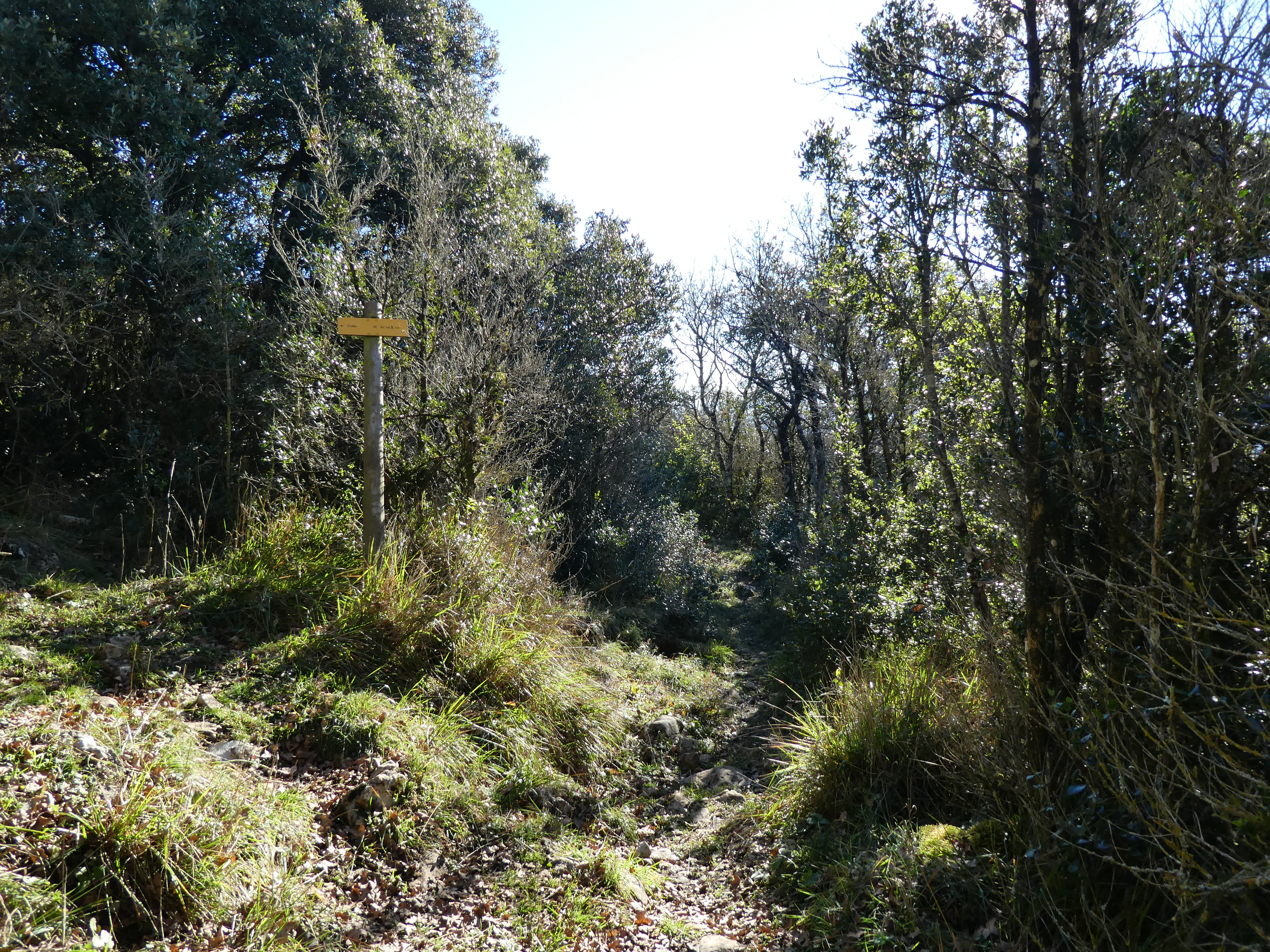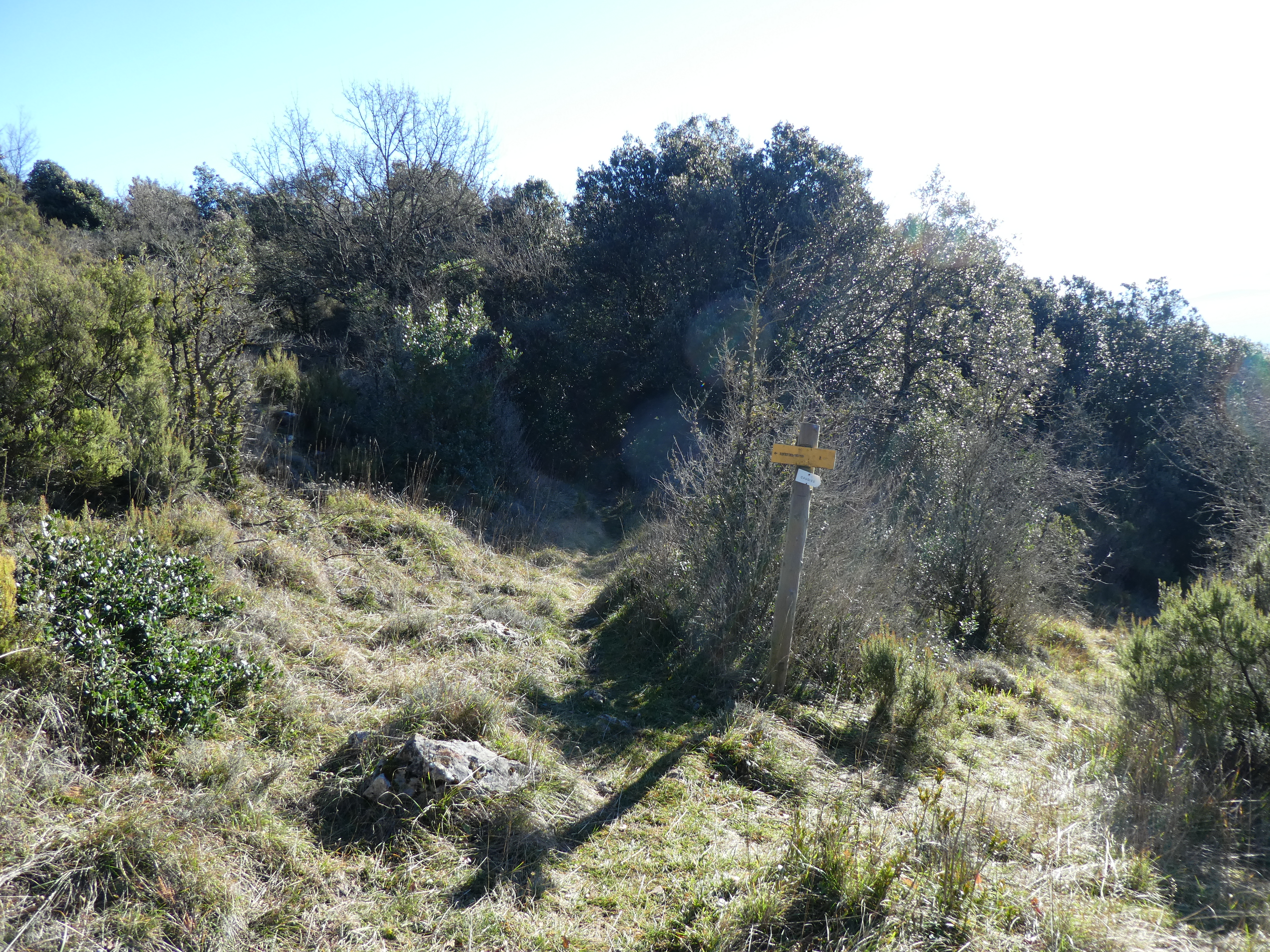 A ce croisement avec le premier chemin raccourci menant au Roc Paradet et marqué par la présence d'un panneau directionnel (1400 mètres après le précédent), suivre le chemin montant tout droit direction Camps-sur-l'Agly, balisé en jaune, et en rouge et blanc