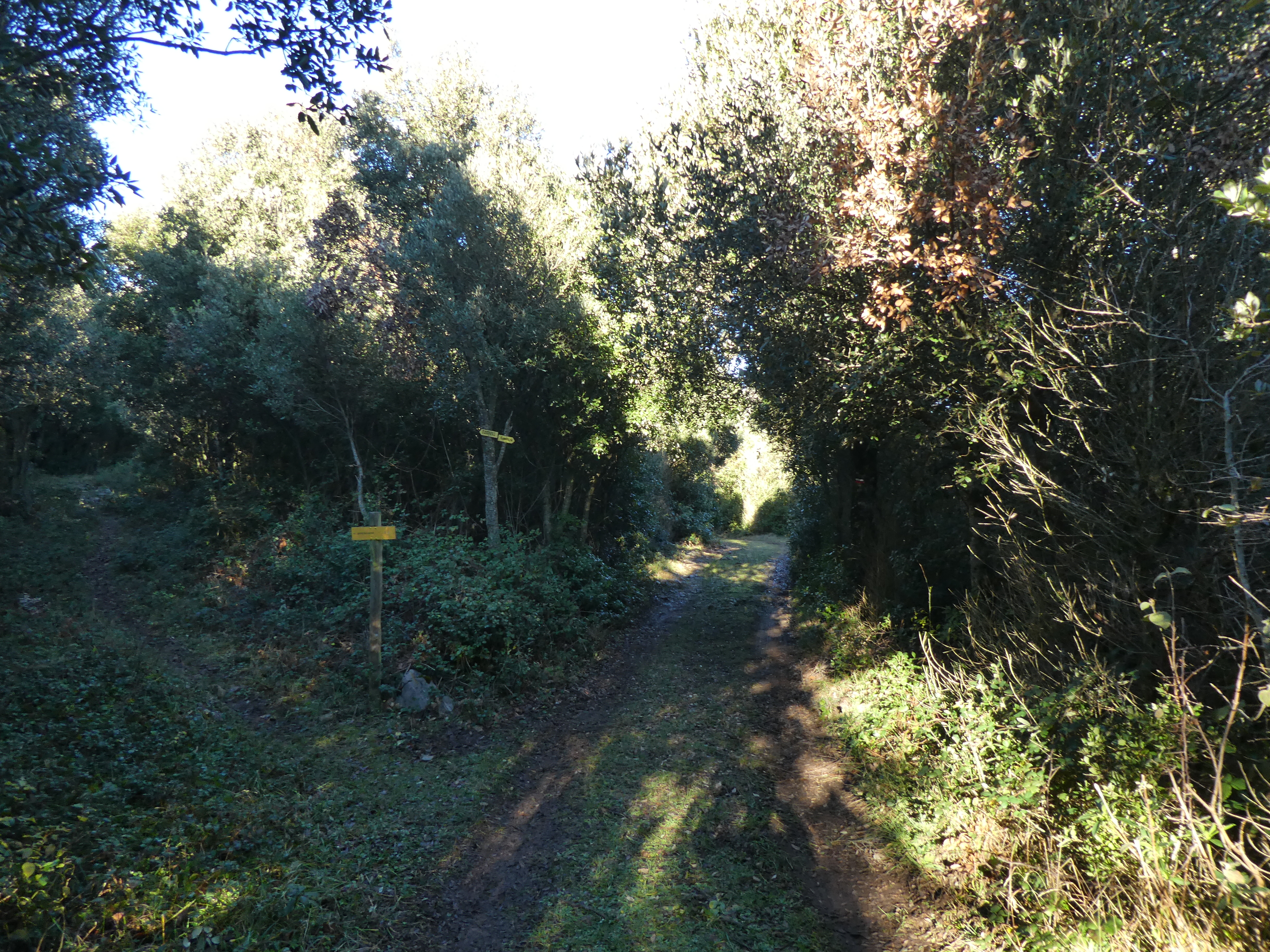 A ce croisement avec le chemin balisé et marqué par la présence d'un panneau directionnel (25 mètres après avoir quitté la grotte), suivre ce dernier sur la gauche direction Prugnanes, balisé en jaune dorénavant (quelues portions de descente raide sur le sentier ramenant à Prugnanes)