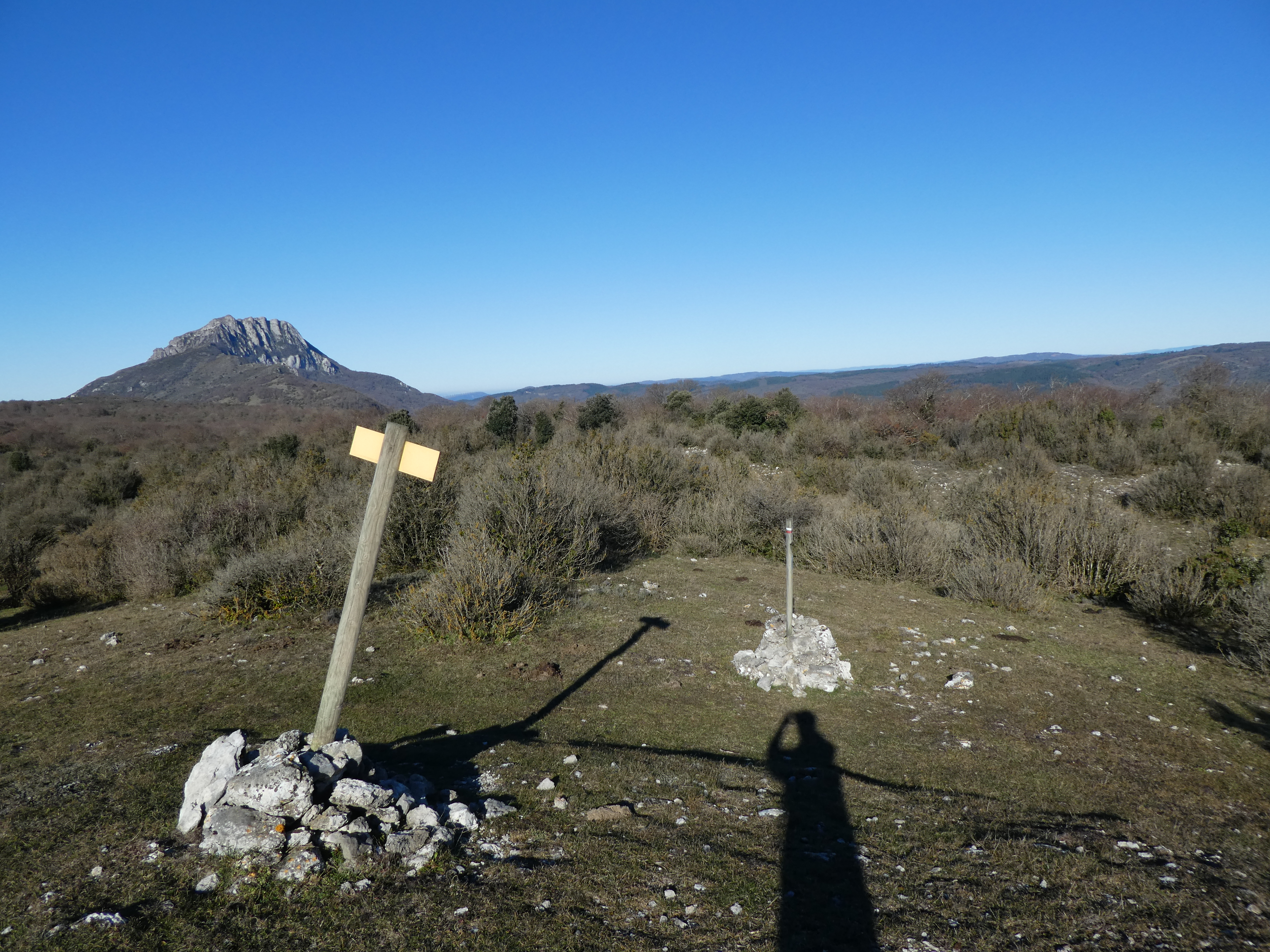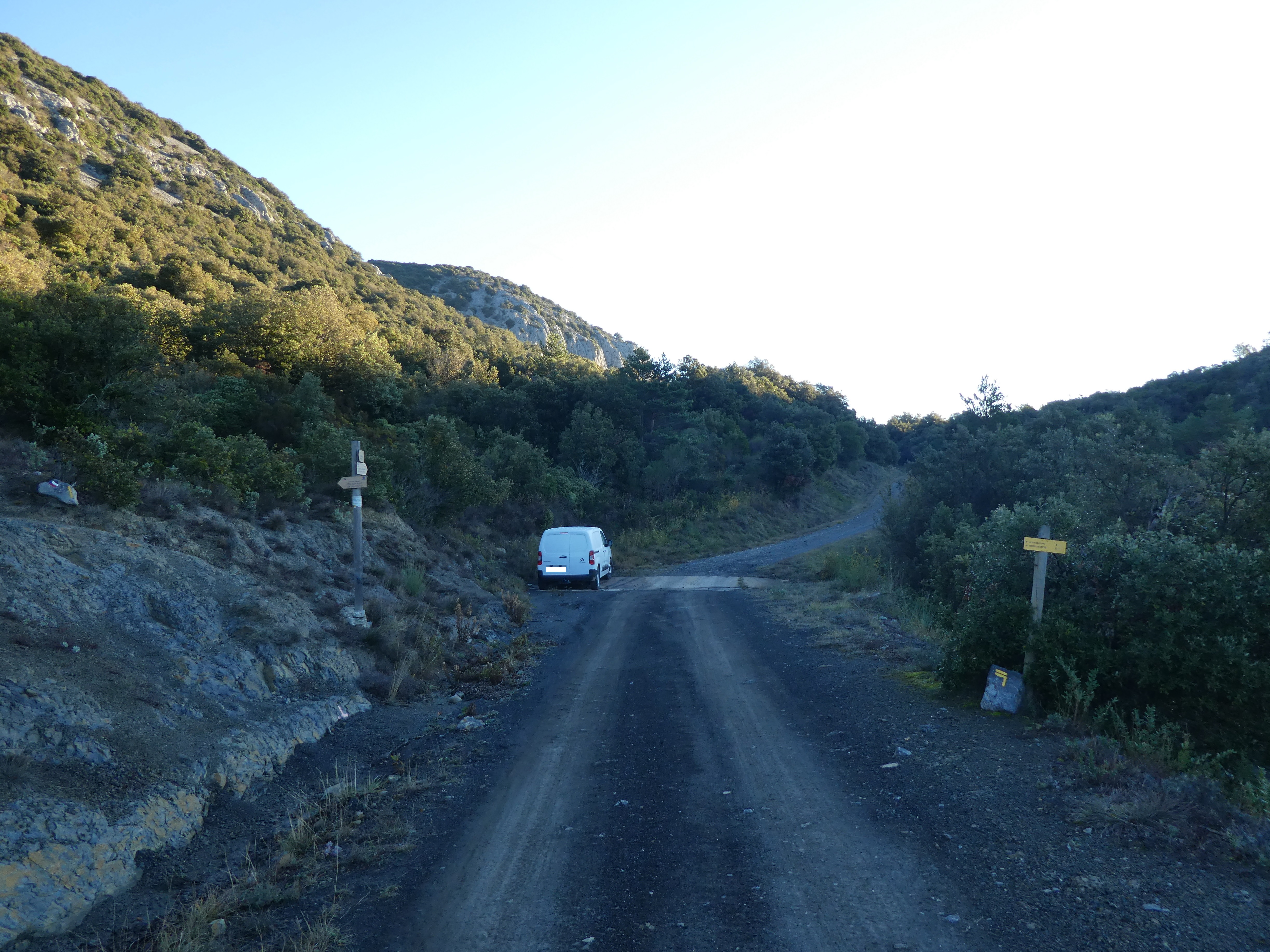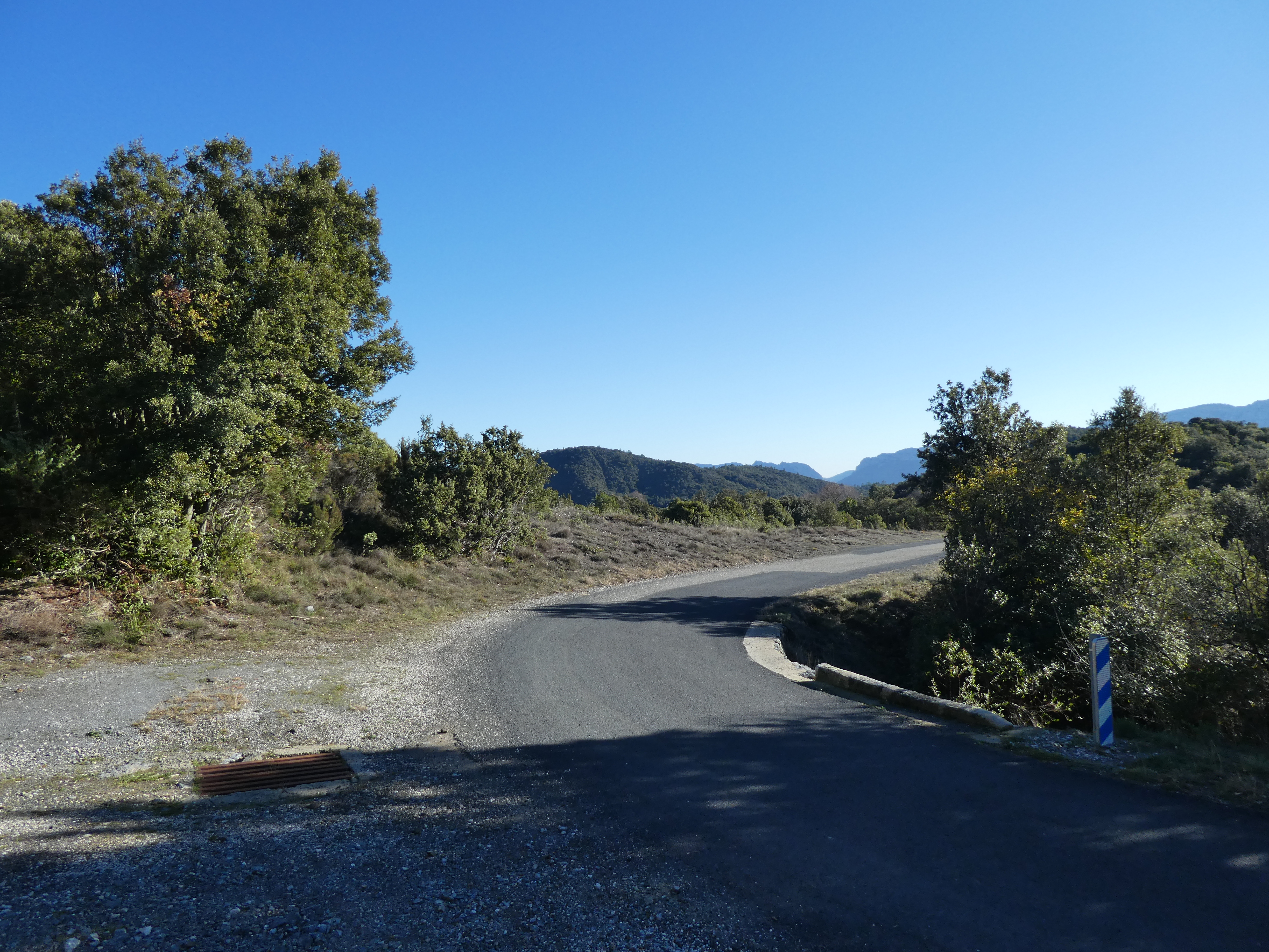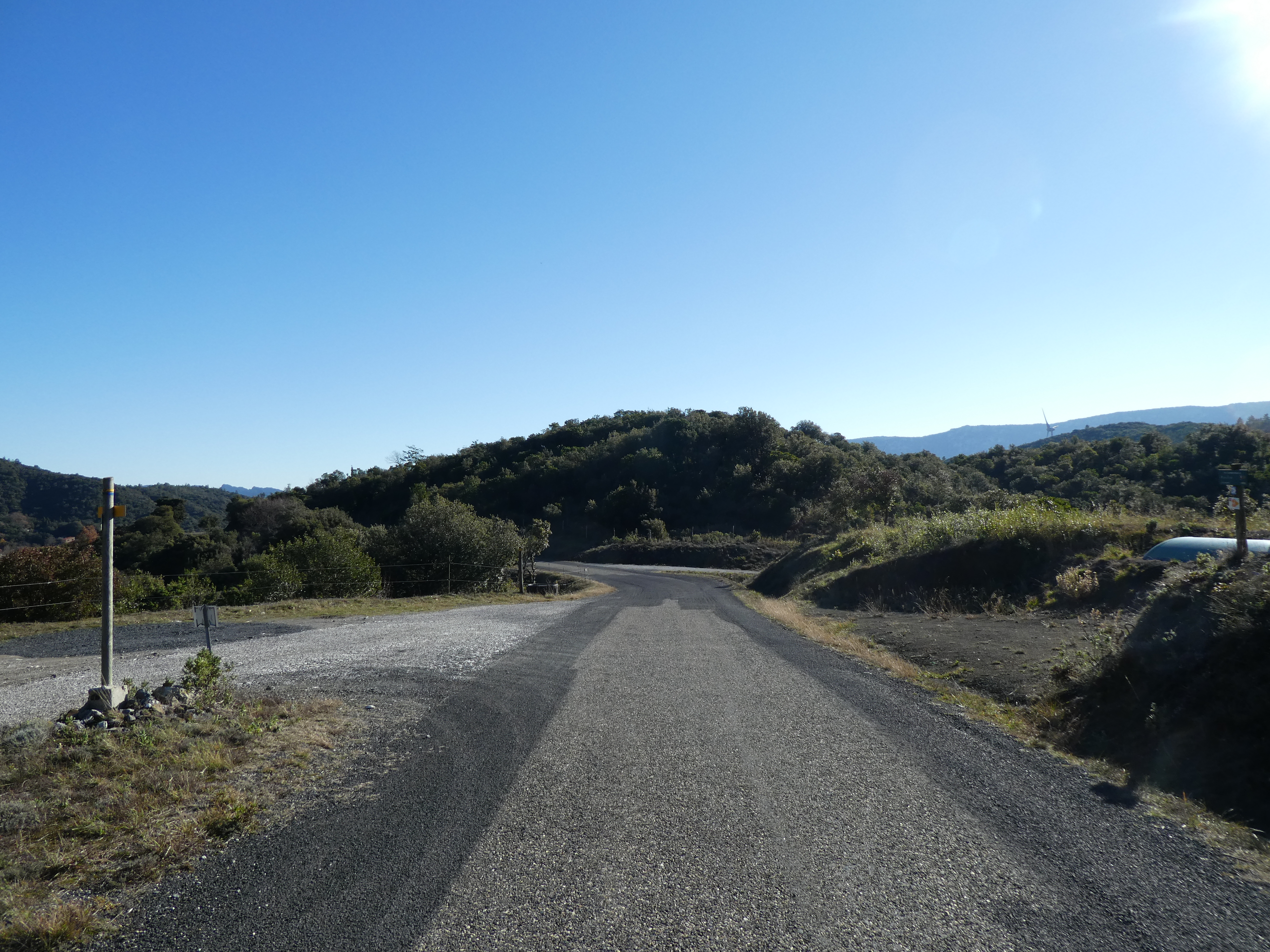 A ce croisement situé au niveau de la frontière entre les Pyrénées-Orientales et l'Aude (300 mètres après le précédent), suivre le chemin partant sur la gauche direction Camps-sur-l'Agly, balisé en jaune, et en rouge et blanc (zone de battue probable le long du GR jusqu'au Pla de Lagal : prudence !) (entrée dans le département de l'Aude)