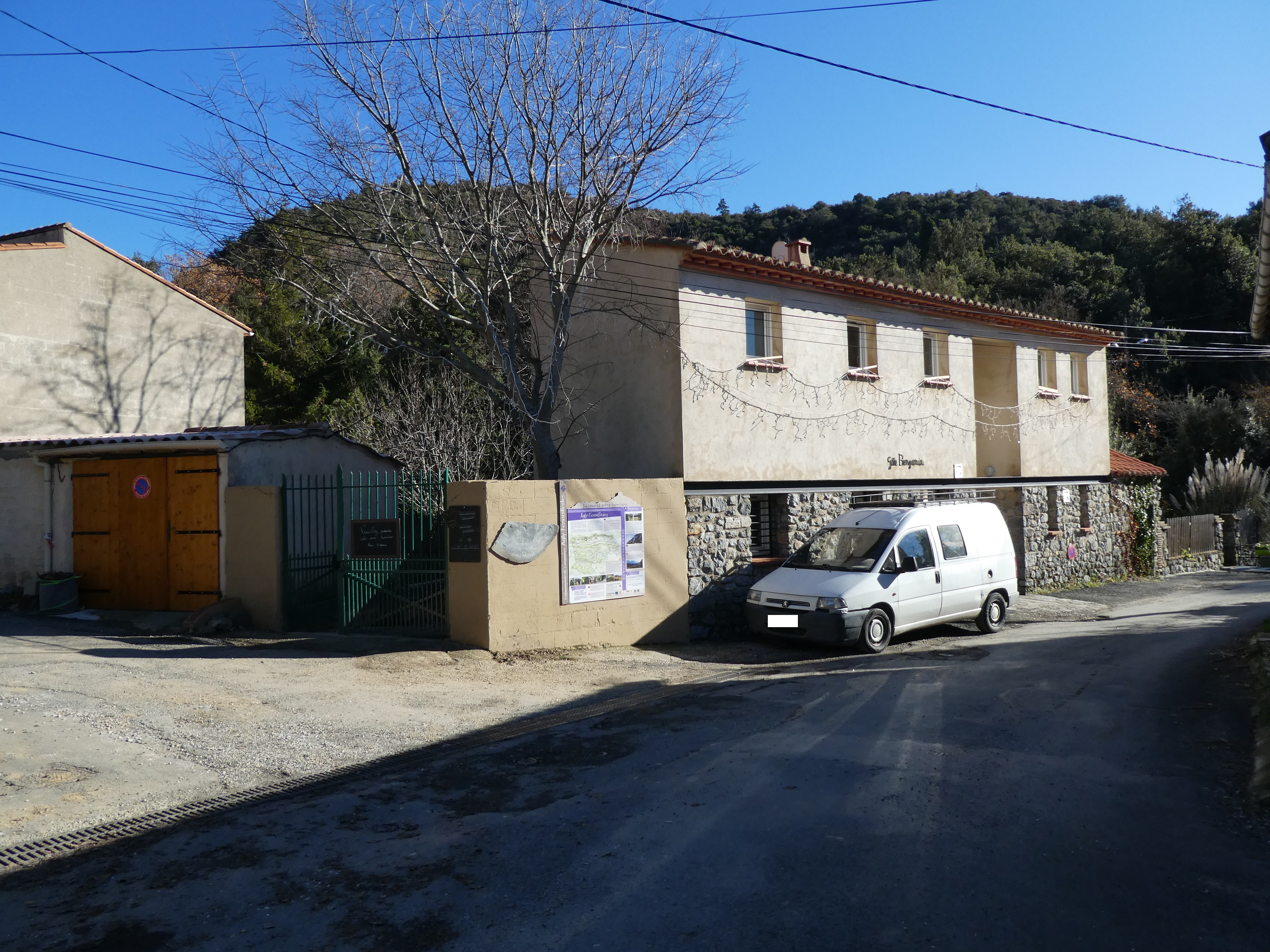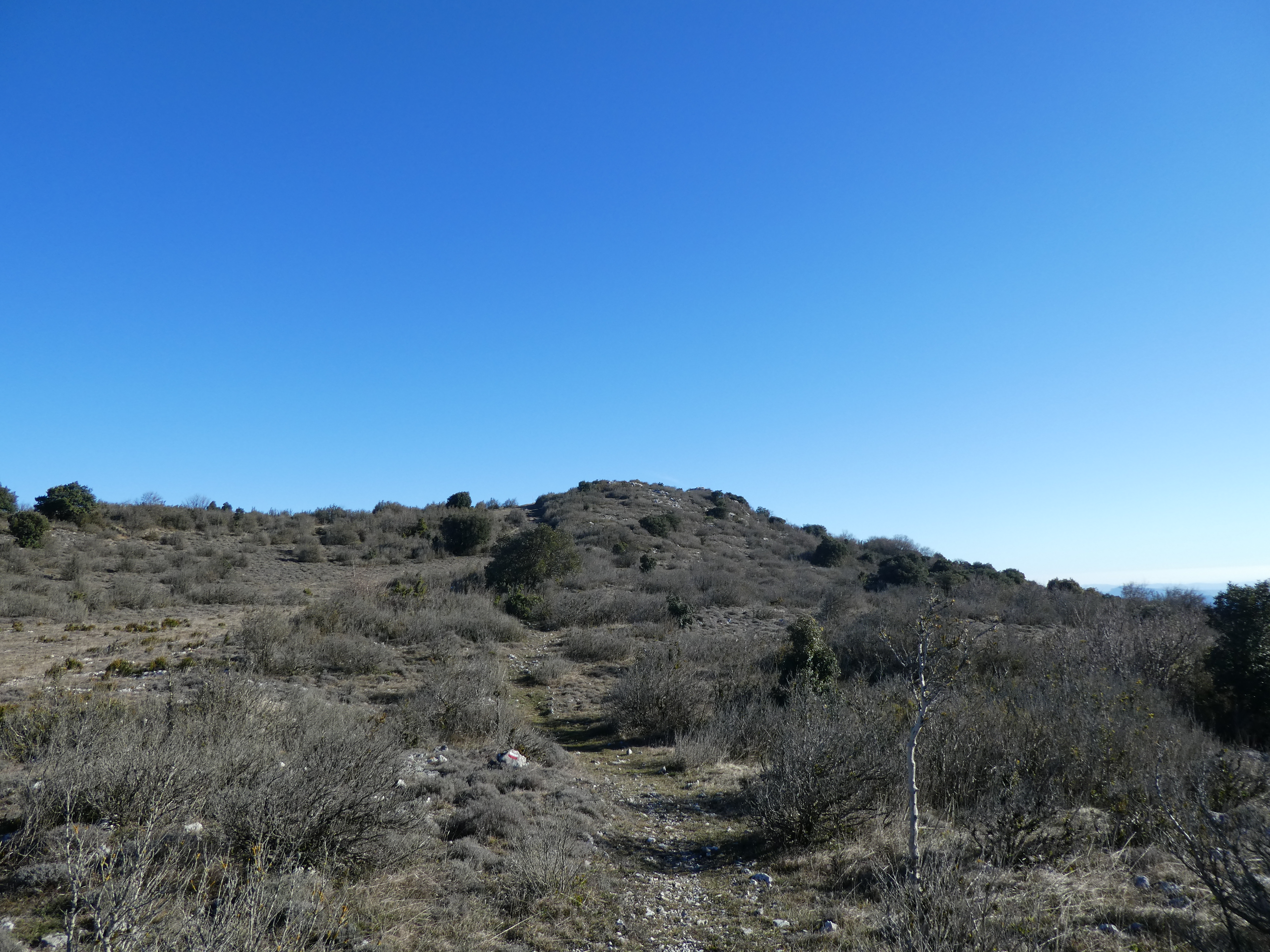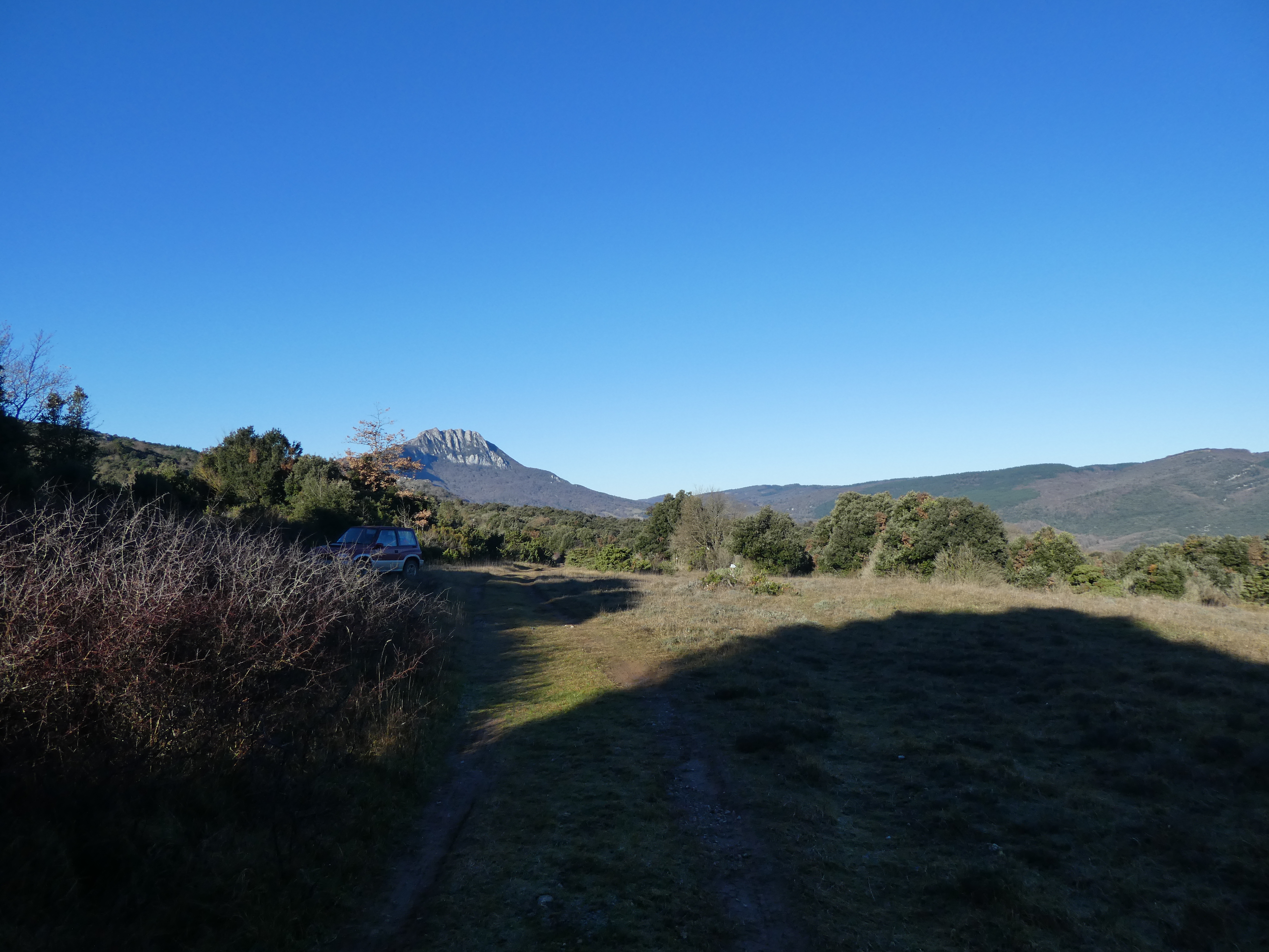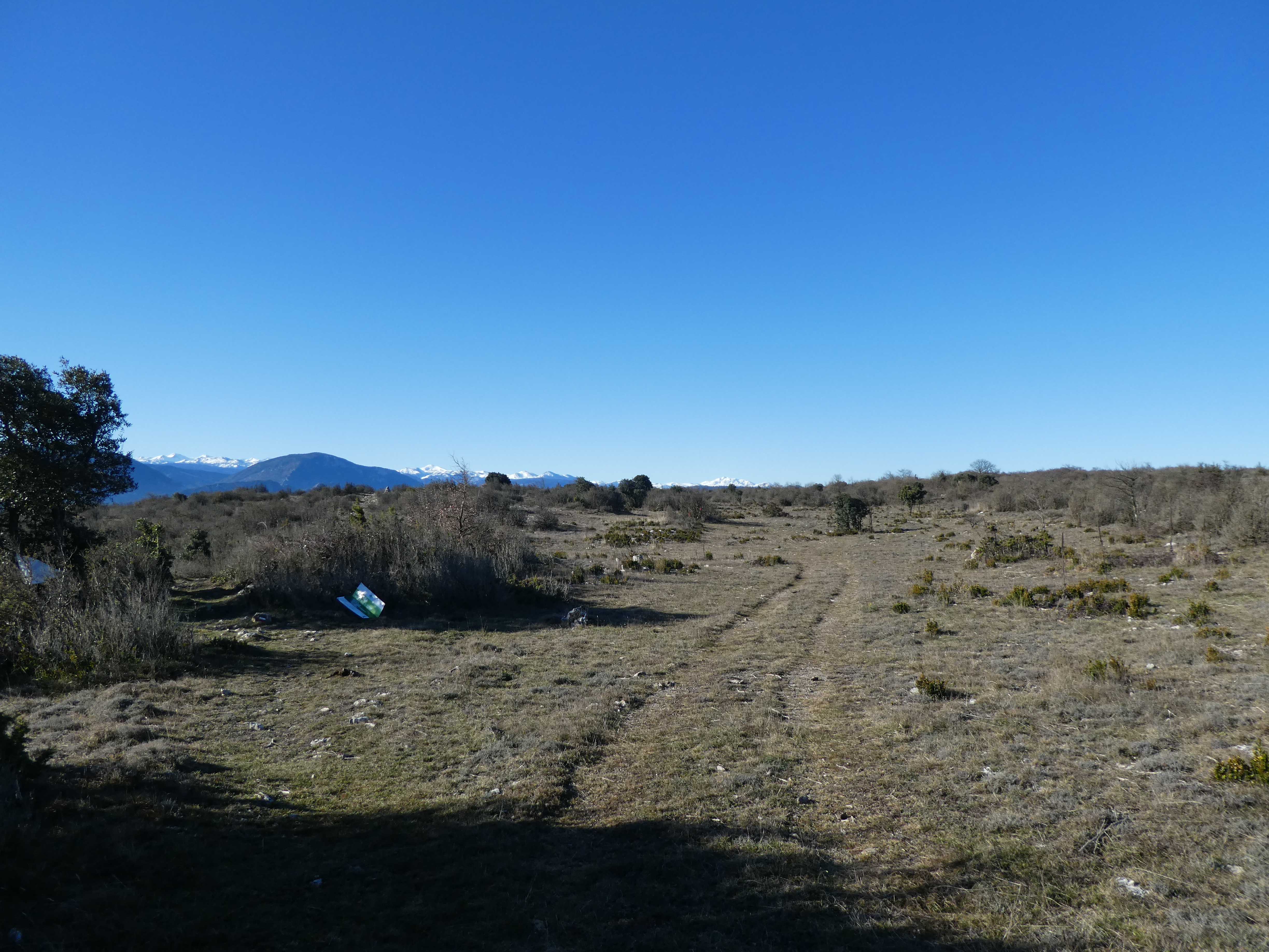 A ce croisement situé au niveau de la frontière entre les Pyrénées-Orientales et l'Aude (300 mètres après le précédent), suivre le chemin partant sur la gauche direction Camps-sur-l'Agly, balisé en jaune, et en rouge et blanc (zone de battue probable le long du GR jusqu'au Pla de Lagal : prudence !) (entrée dans le département de l'Aude)