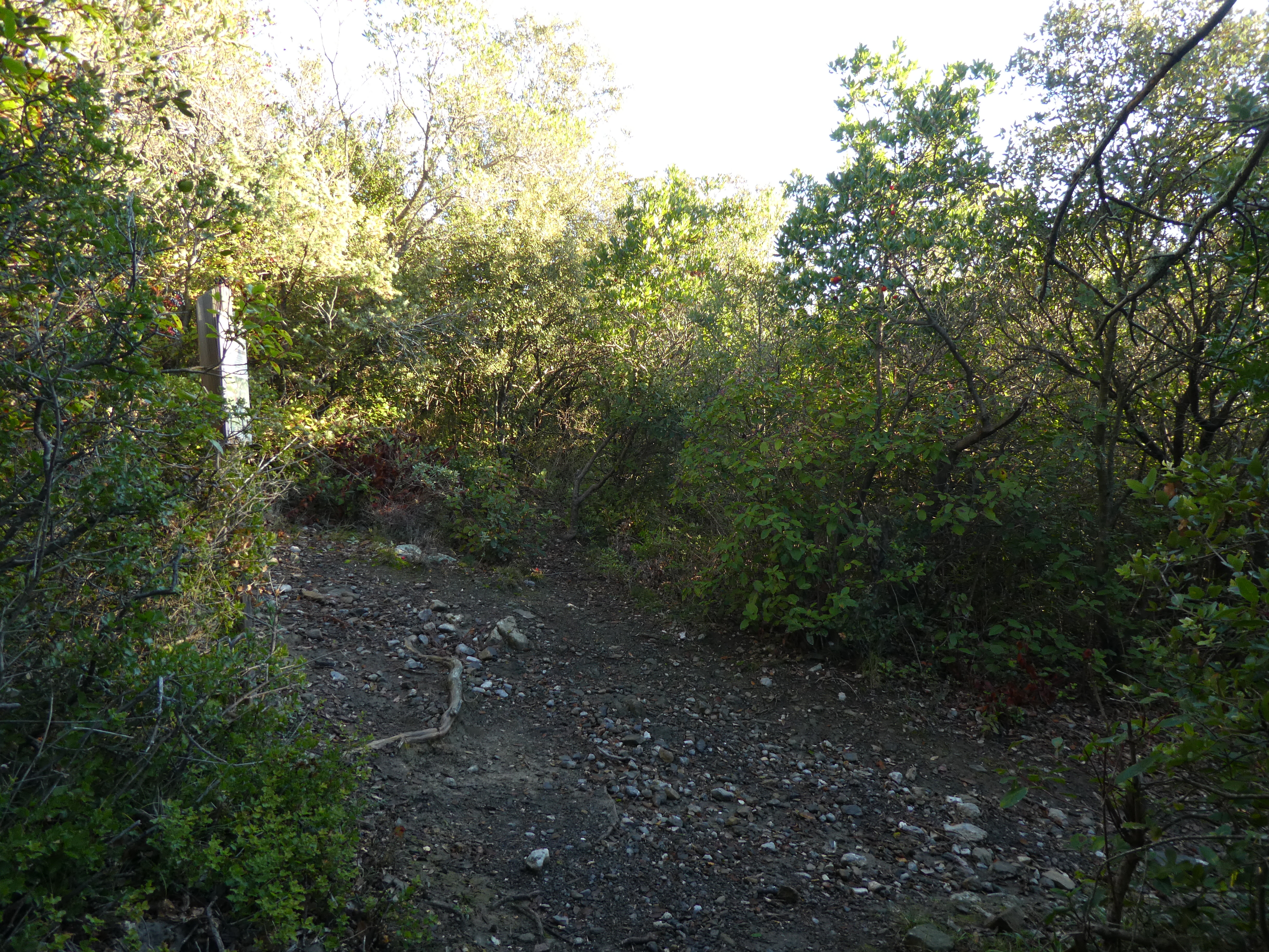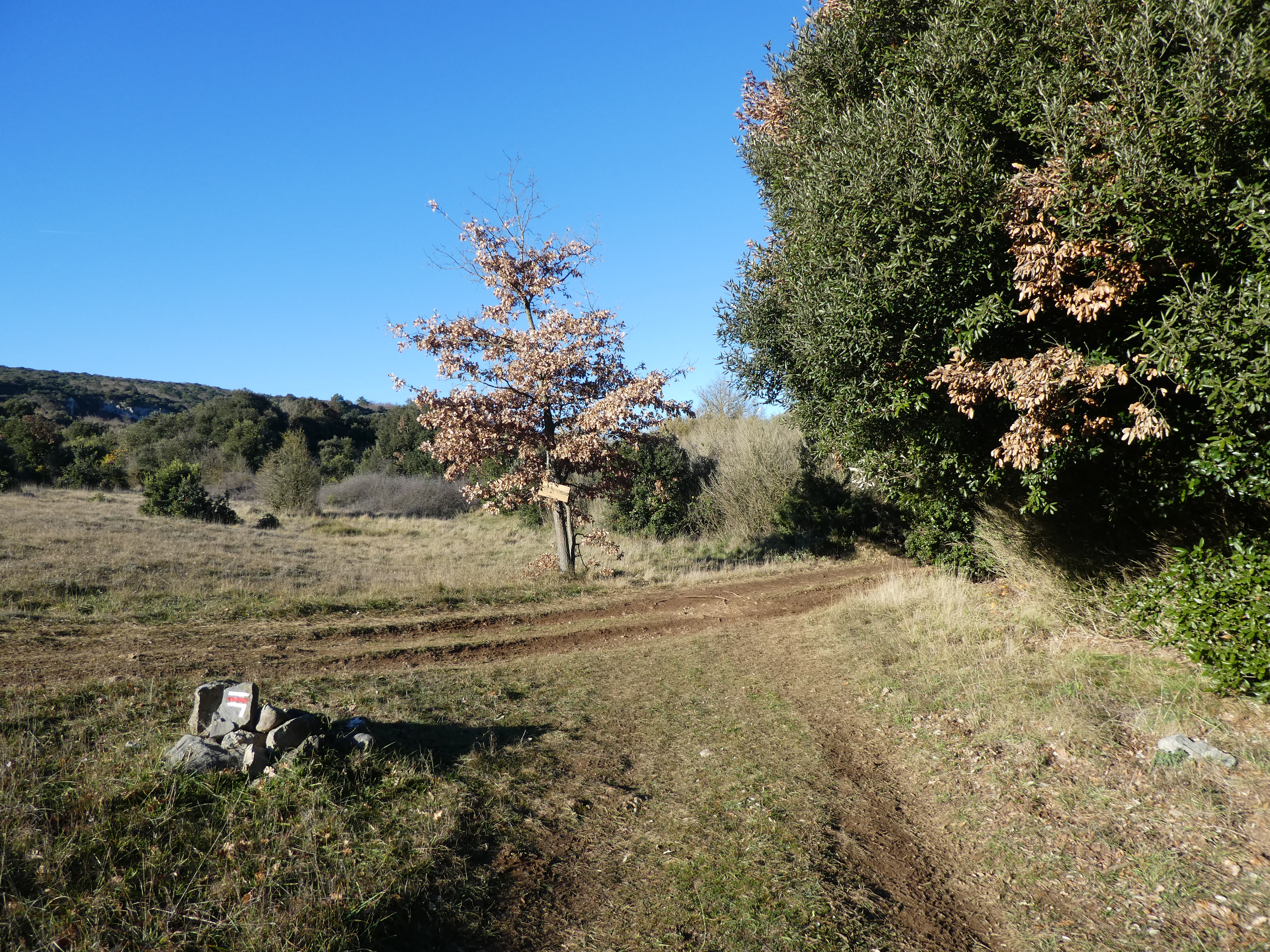 A ce croisement marqué par la présence d'un panneau directionnel (700 mètres après le précédent), suivre le chemin partant tout droit direction Camps-sur-l'Agly, balisé uniquement en rouge et blanc dorénavant (le chemin partant sur la gauche est un raccourci menant au Roc Paradet)
