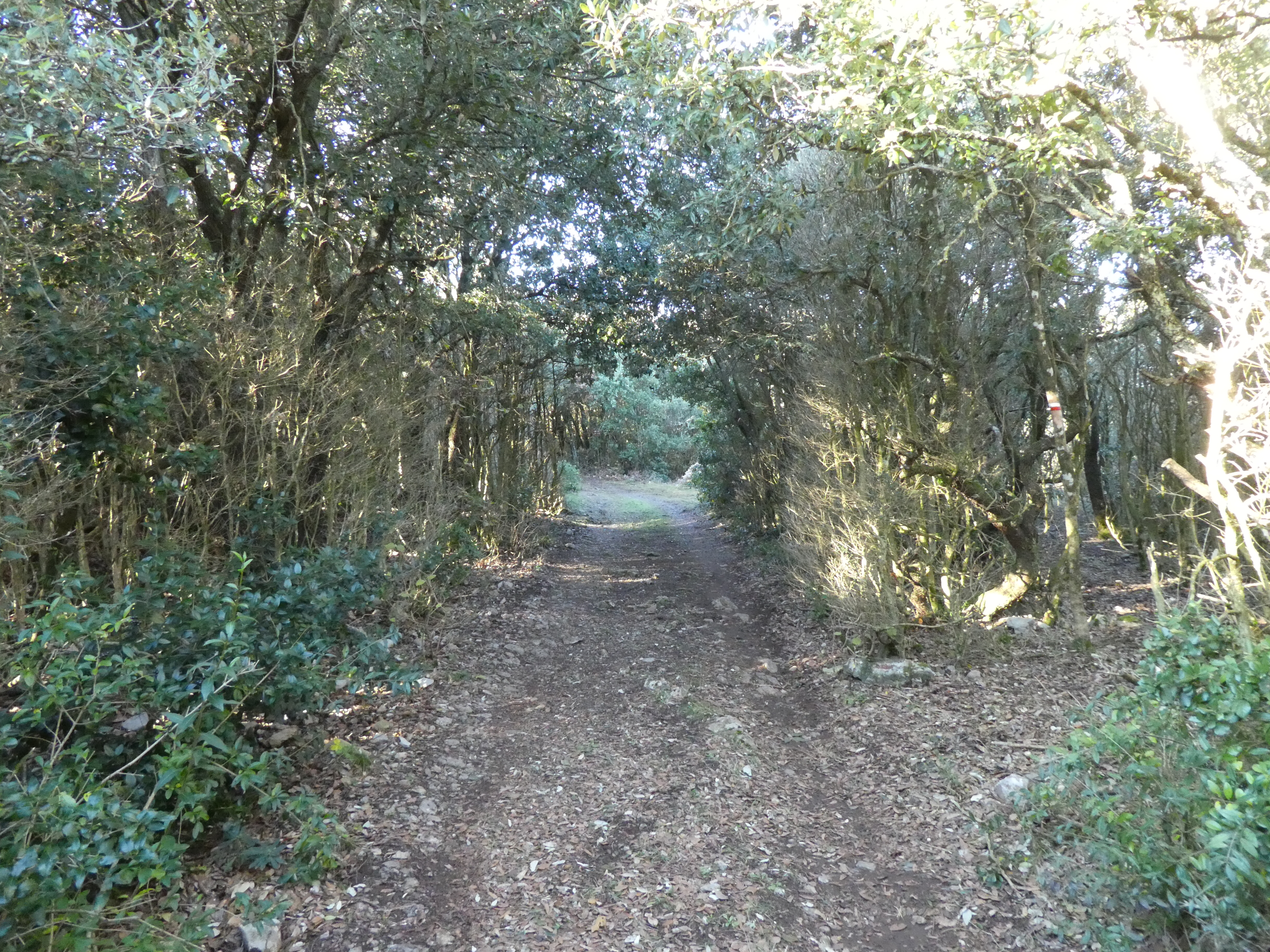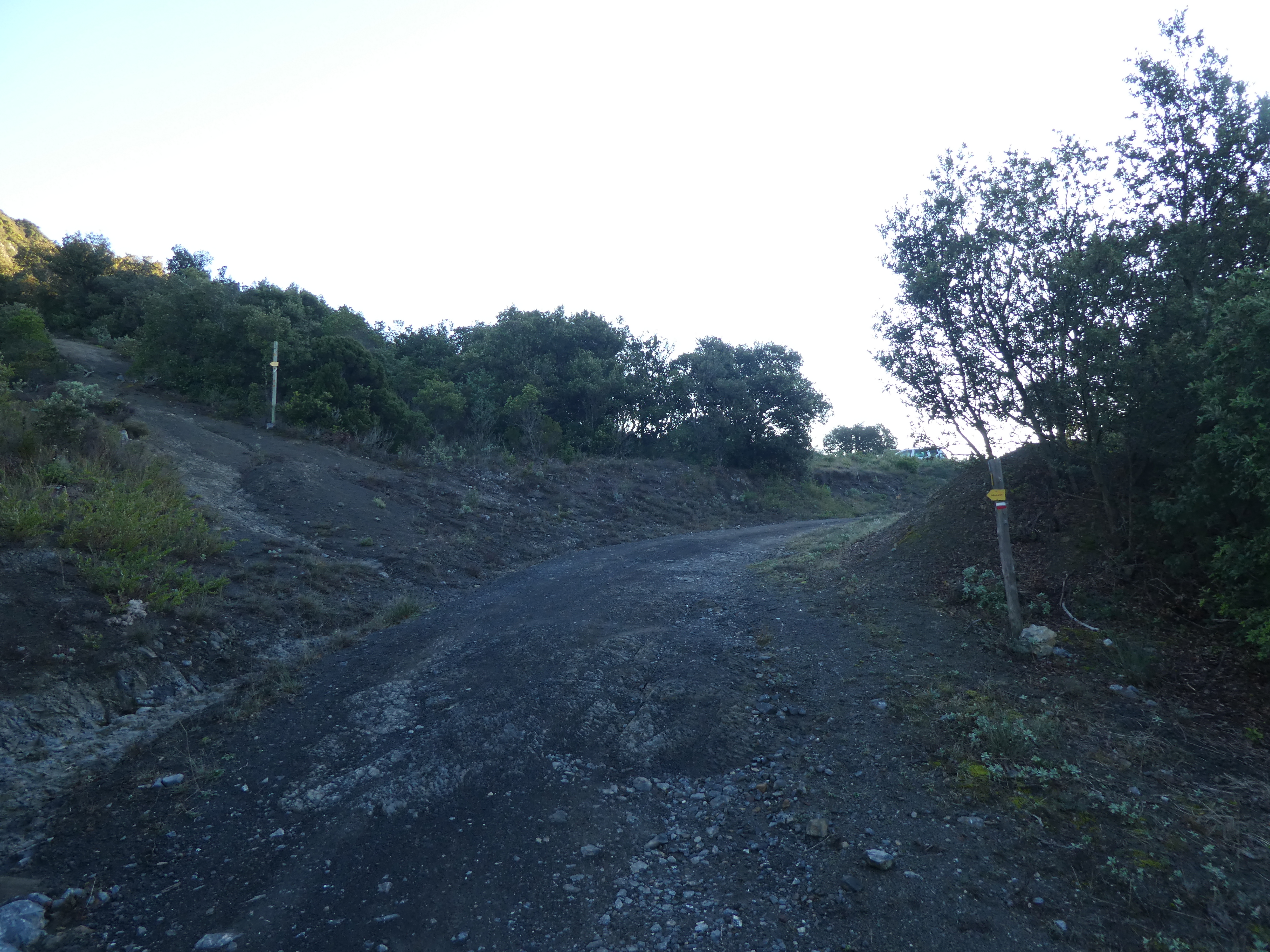 A ce croisement situé au niveau du Col du Lenti (400 mètres après le précédent) (382 m), suivre le chemin partant sur la gauche direction Camps-sur-l'Agly, balisé en jaune et rouge dorénavant