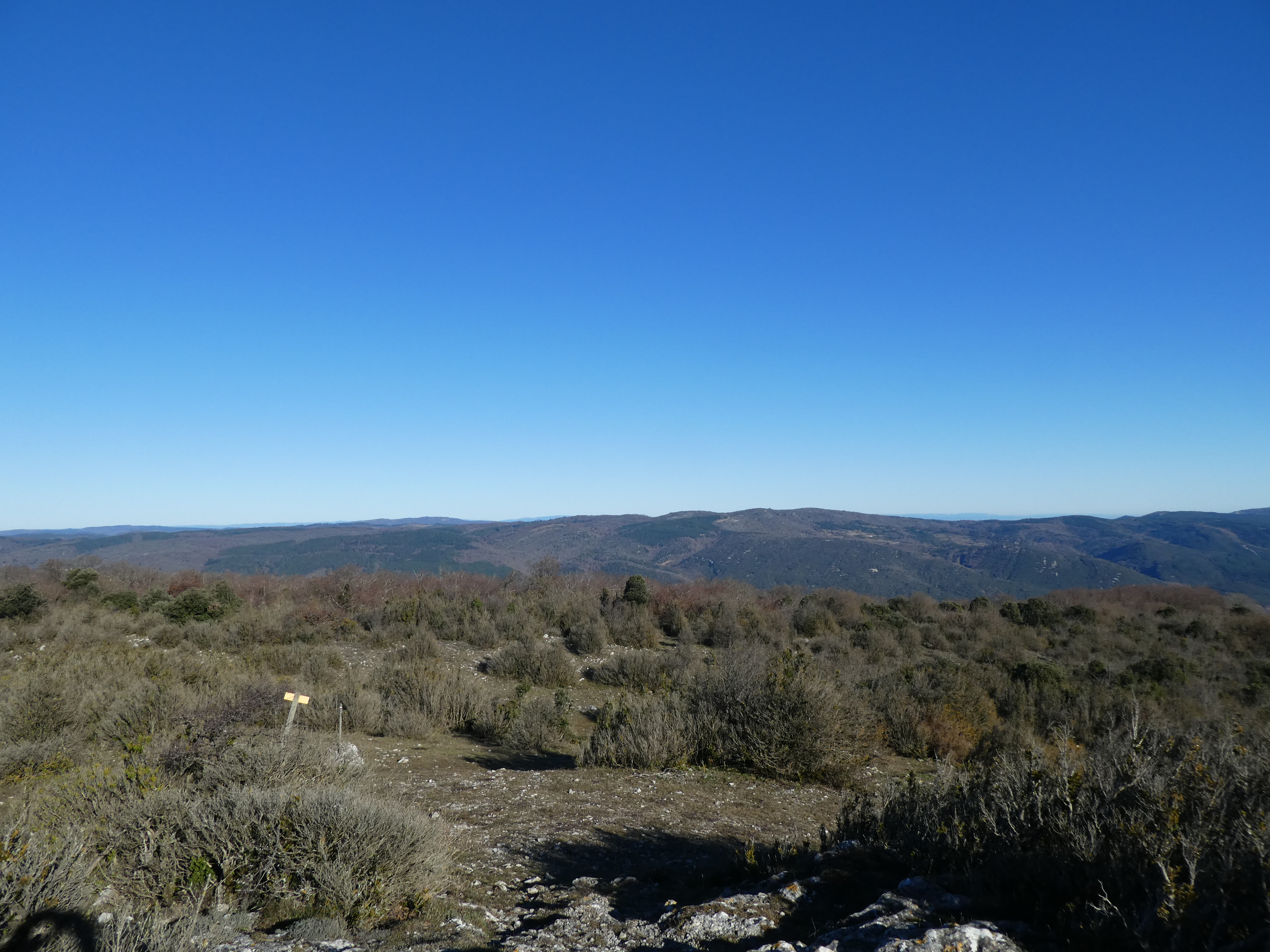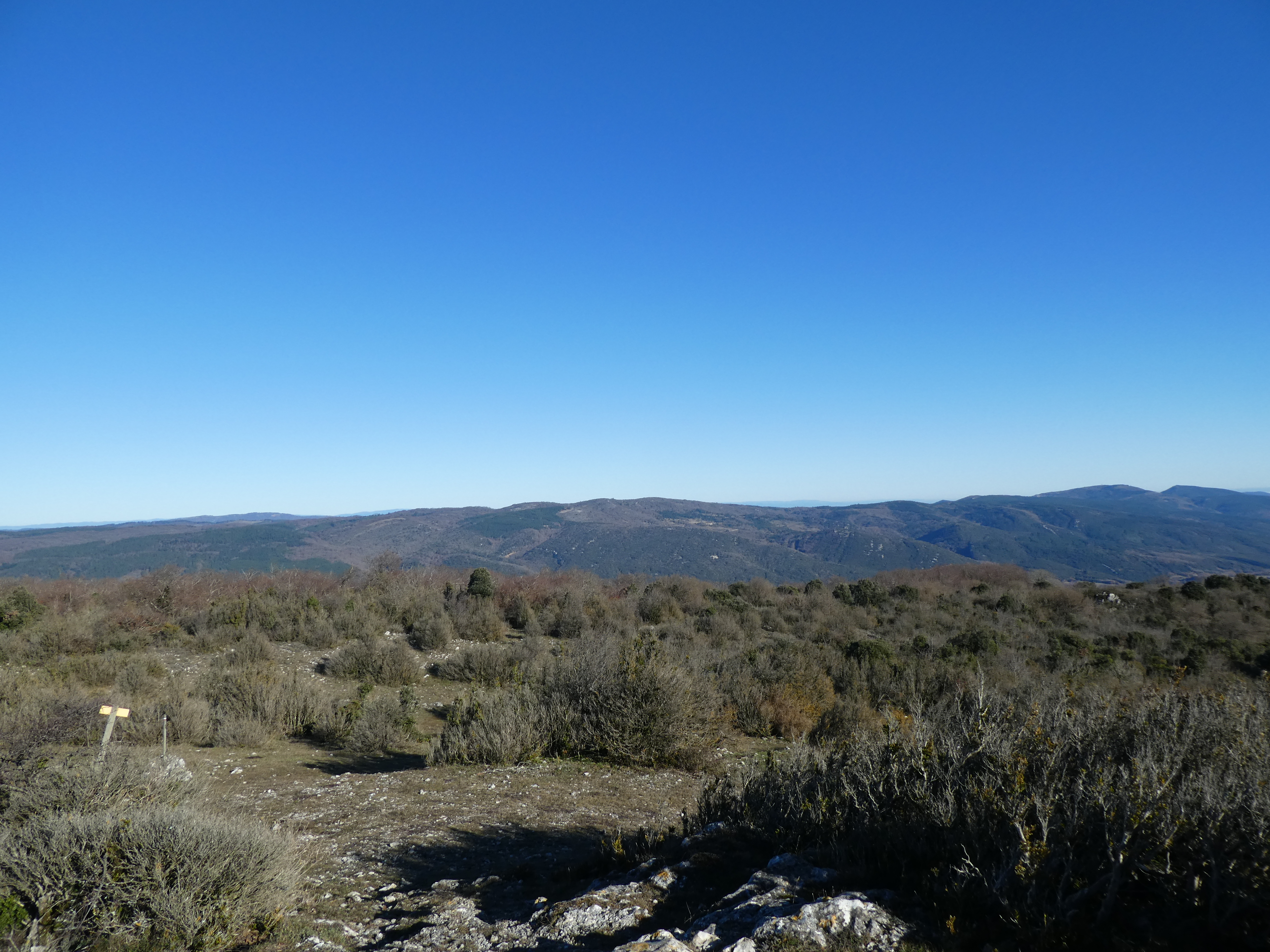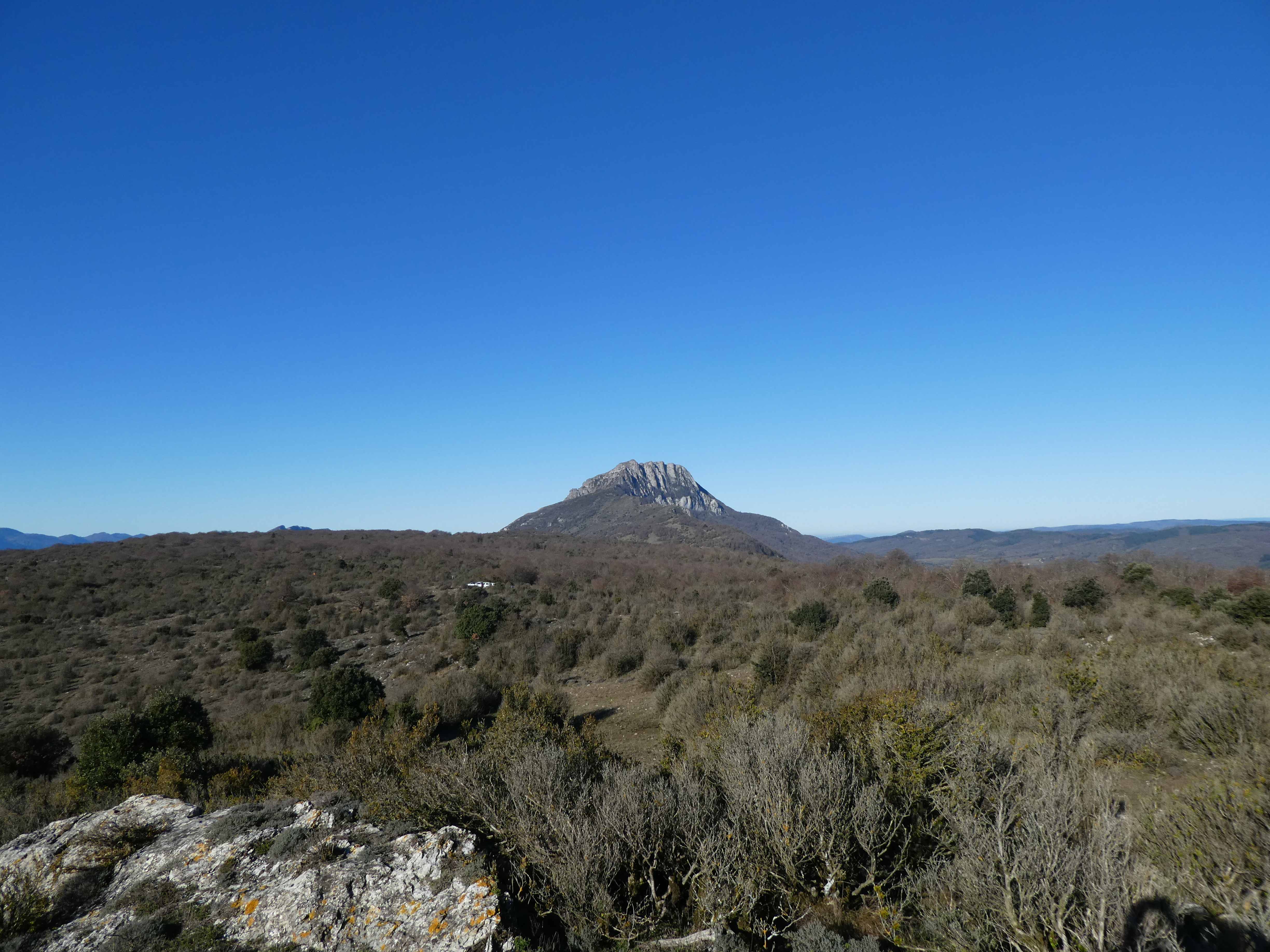 Arrivée au sommet du Roc Paradet (900 m) : beau panorama sur le Pech de Bugarach, les Corbières, les sommets du Fenouillèdes, les Albères, le Canigou, les sommets du Haut-Conflent, du Capcir, de l'Ariège orientale ainsi que sur la Vallée de Maury et la Plaine du Roussillon