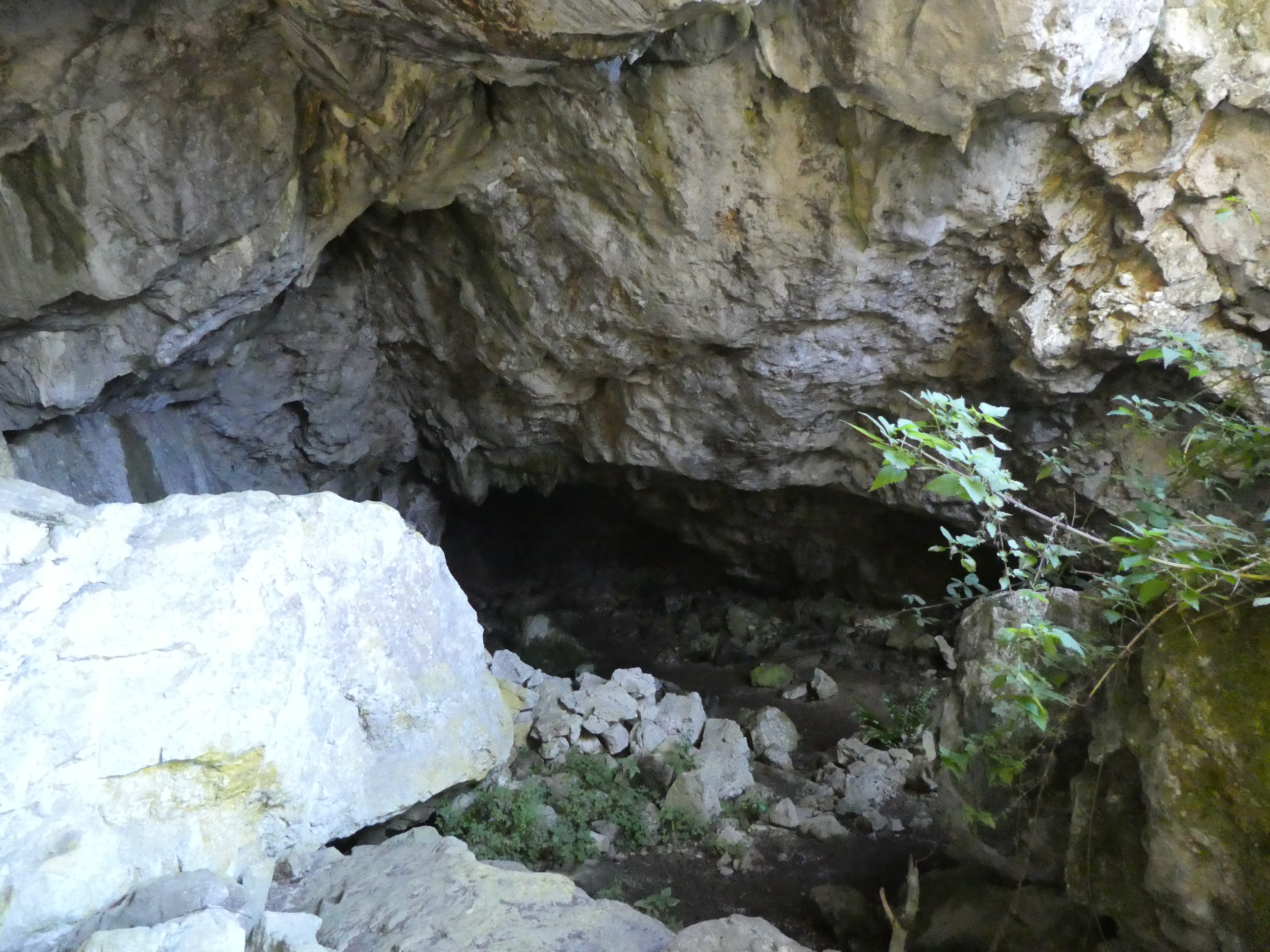 A ce croisement situé au niveau de la Grotte aux Loups et marqué par la présence d'un panneau directionnel (50 mètres après le précédent), faire un court aller-retour sur la gauche pour aller visiter la Grotte aux Loups direction Grotte aux Loups, aucun balisage dorénavant