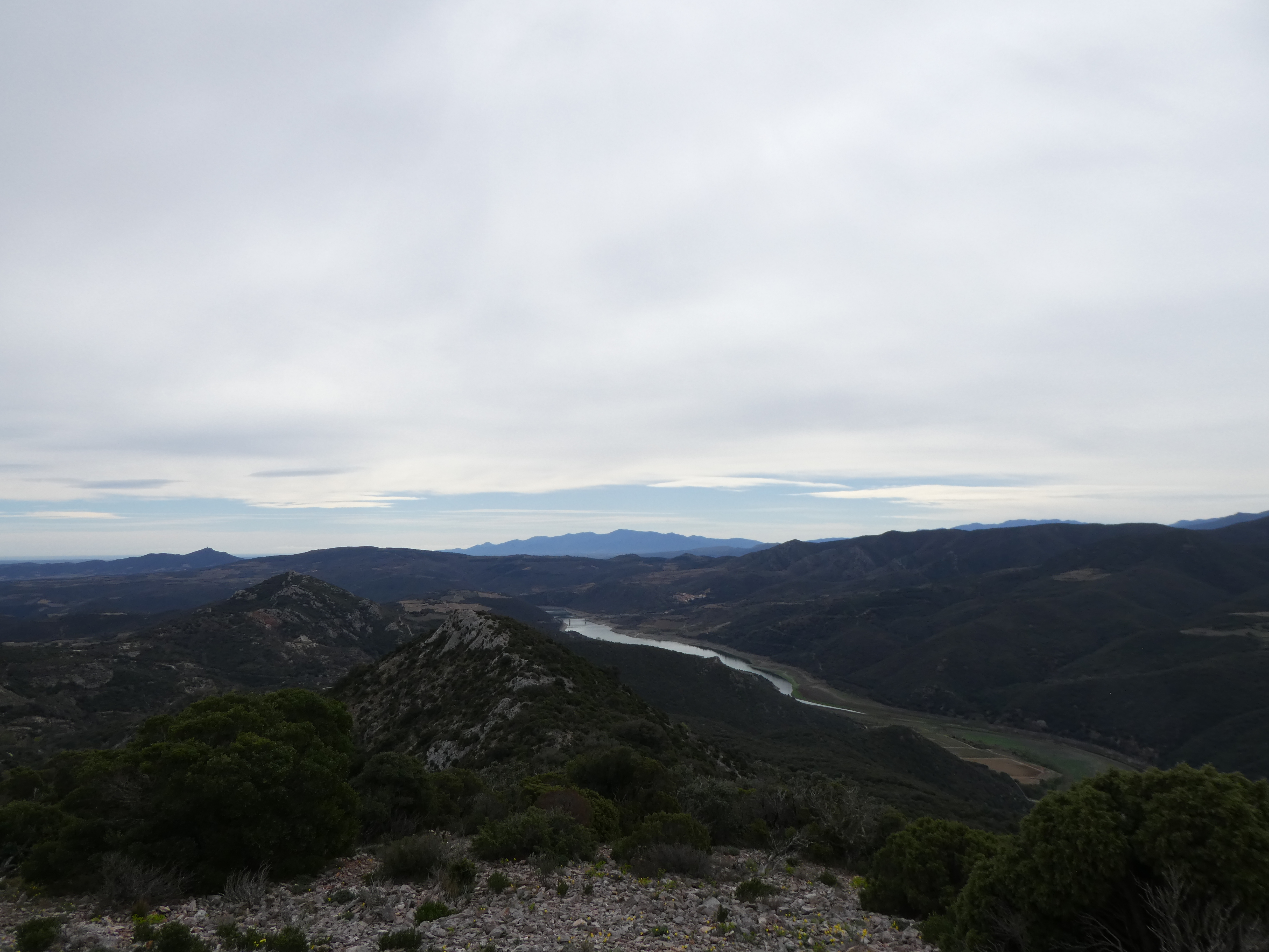 Arrivée au sommet du Serre de Vergés (583 m) : beau panorama sur les sommets du Fenouillèdes, des Corbières Catalanes, des Albères, du massif du Canigou, du Conflent, des Pyrénées Audoises ainsi que sur la Vallée de l'Agly et son lac
