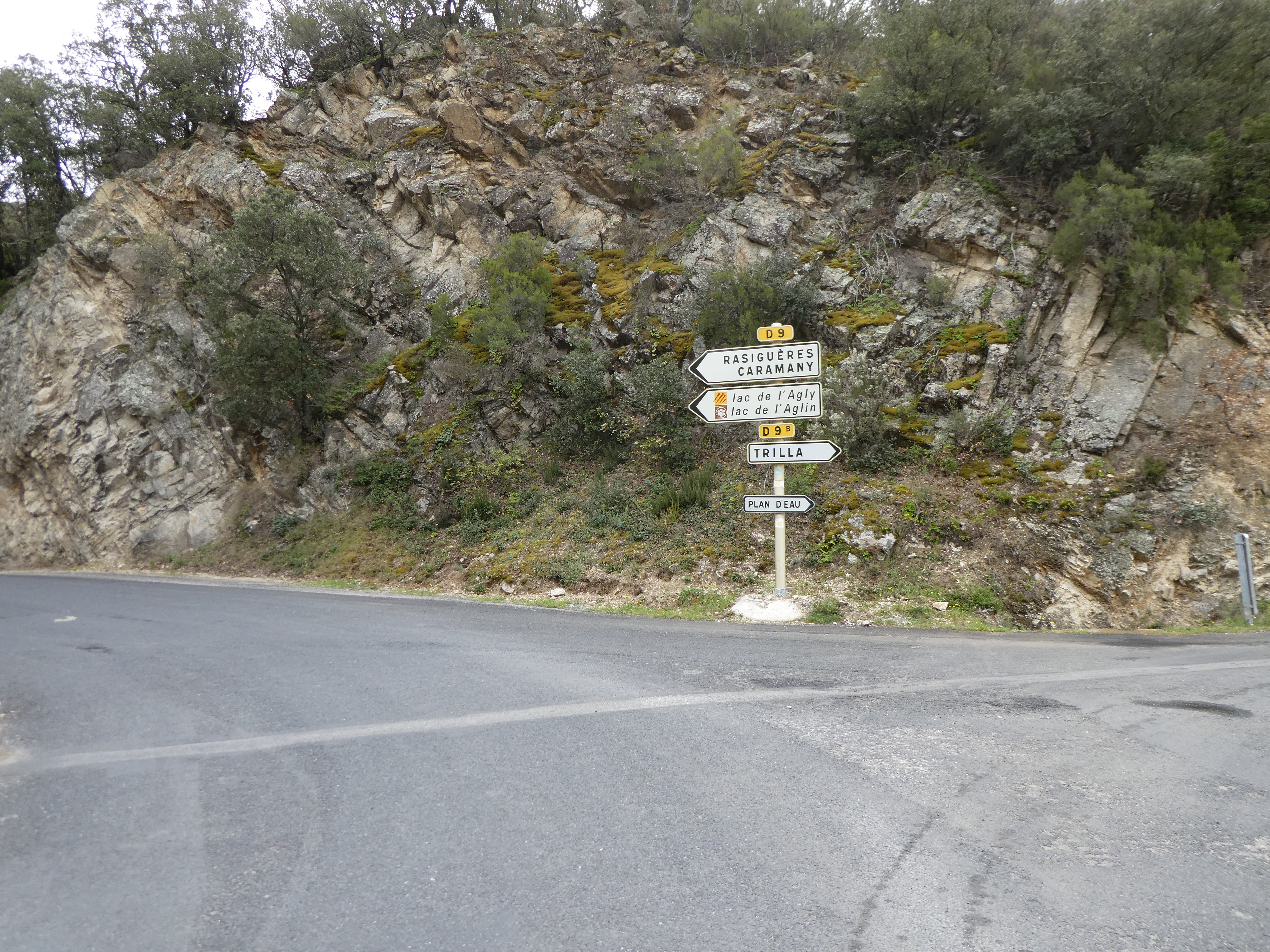 A cette intersection avec la D9 (100 mètres après le lieu-dit "Moulin d'Ansignan"), suivre cette dernière partant tout droit direction Ansignan, balisé en jaune et rouge, et en jaune
