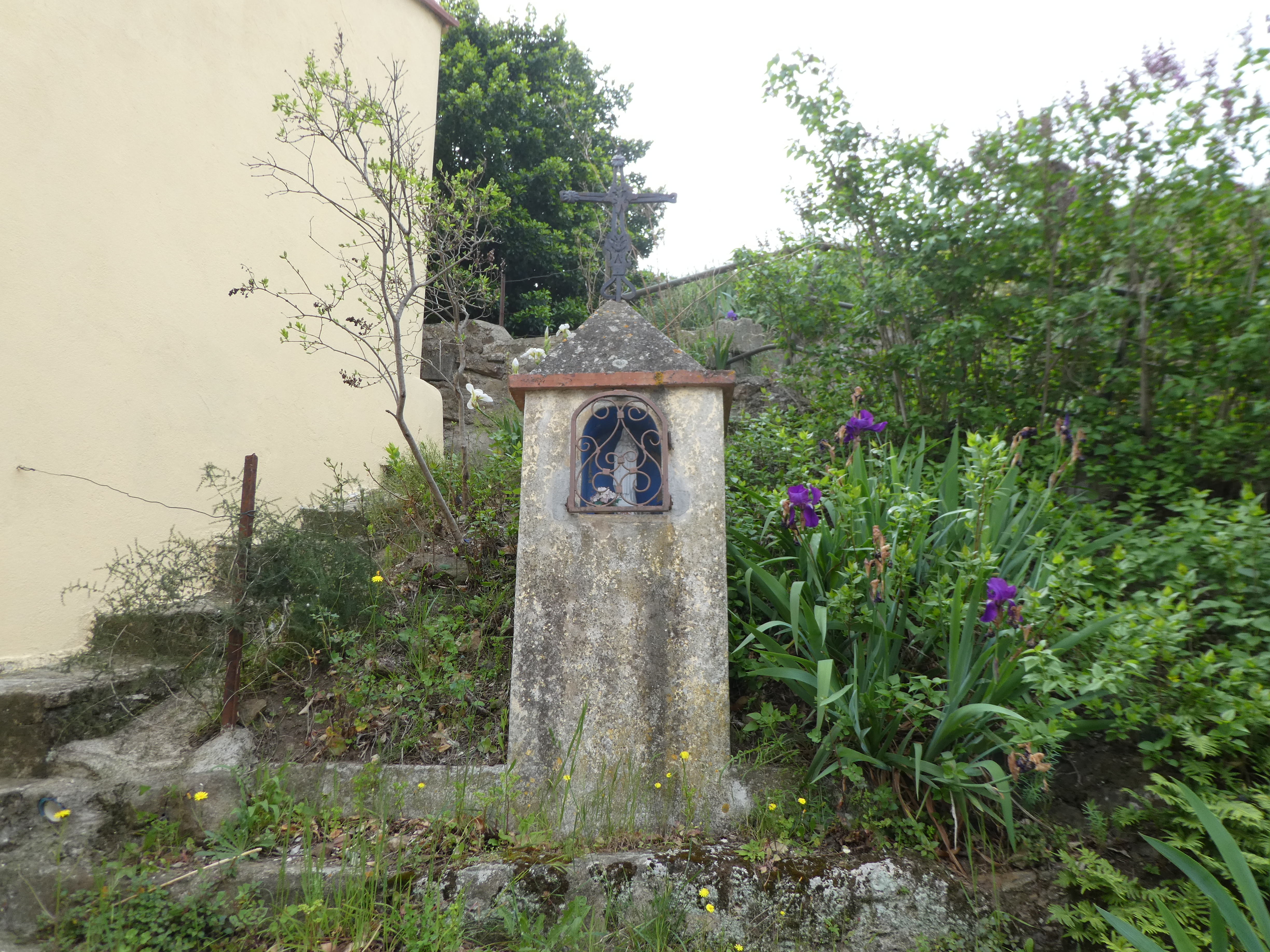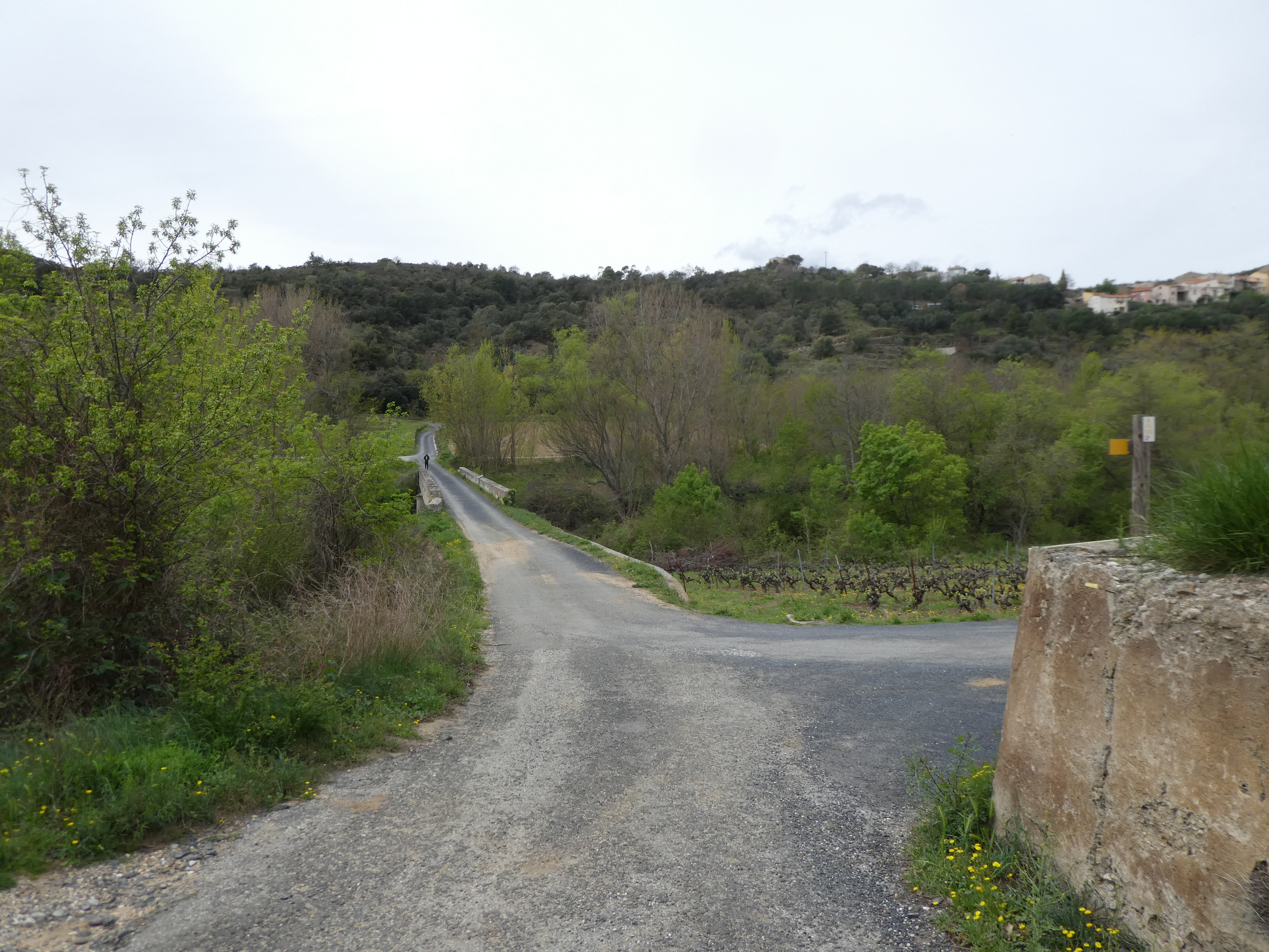 Les Vignes (190 m) : suivre la route partant légèrement sur la gauche direction Ansignan, balisé en jaune et rouge, et en jaune (direction non mentionnée sur le panneau directionnel)