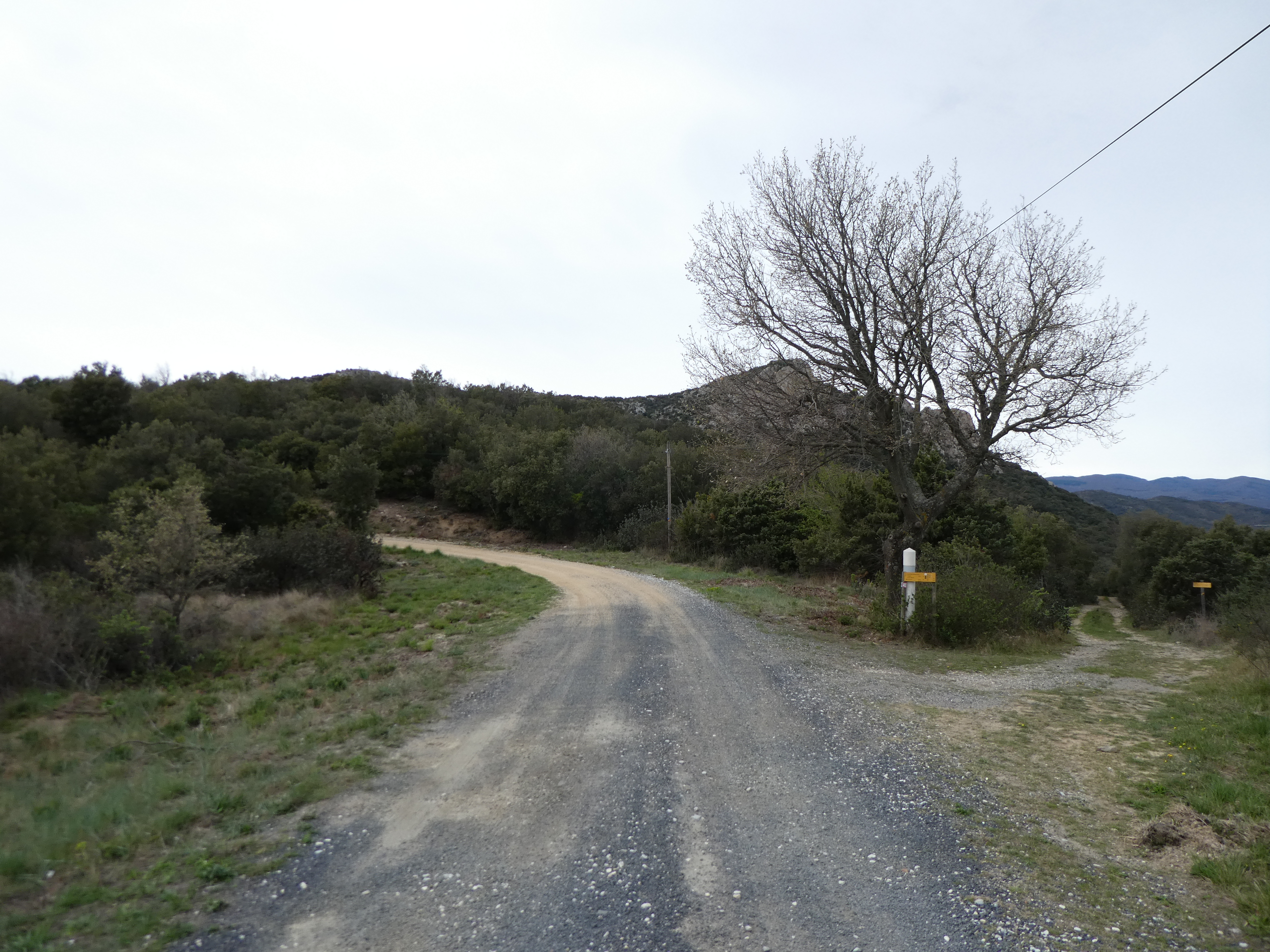 A ce croisement avec le GRP Tour des Fenouillèdes marqué par la présence d'un panneau directionnel (900 mètres après le précédent) (393 m), suivre ce dernier partant sur la droite direction Serre de Vergés (Pic de Vergés), balisé en jaune et rouge, et en jaune dorénavant