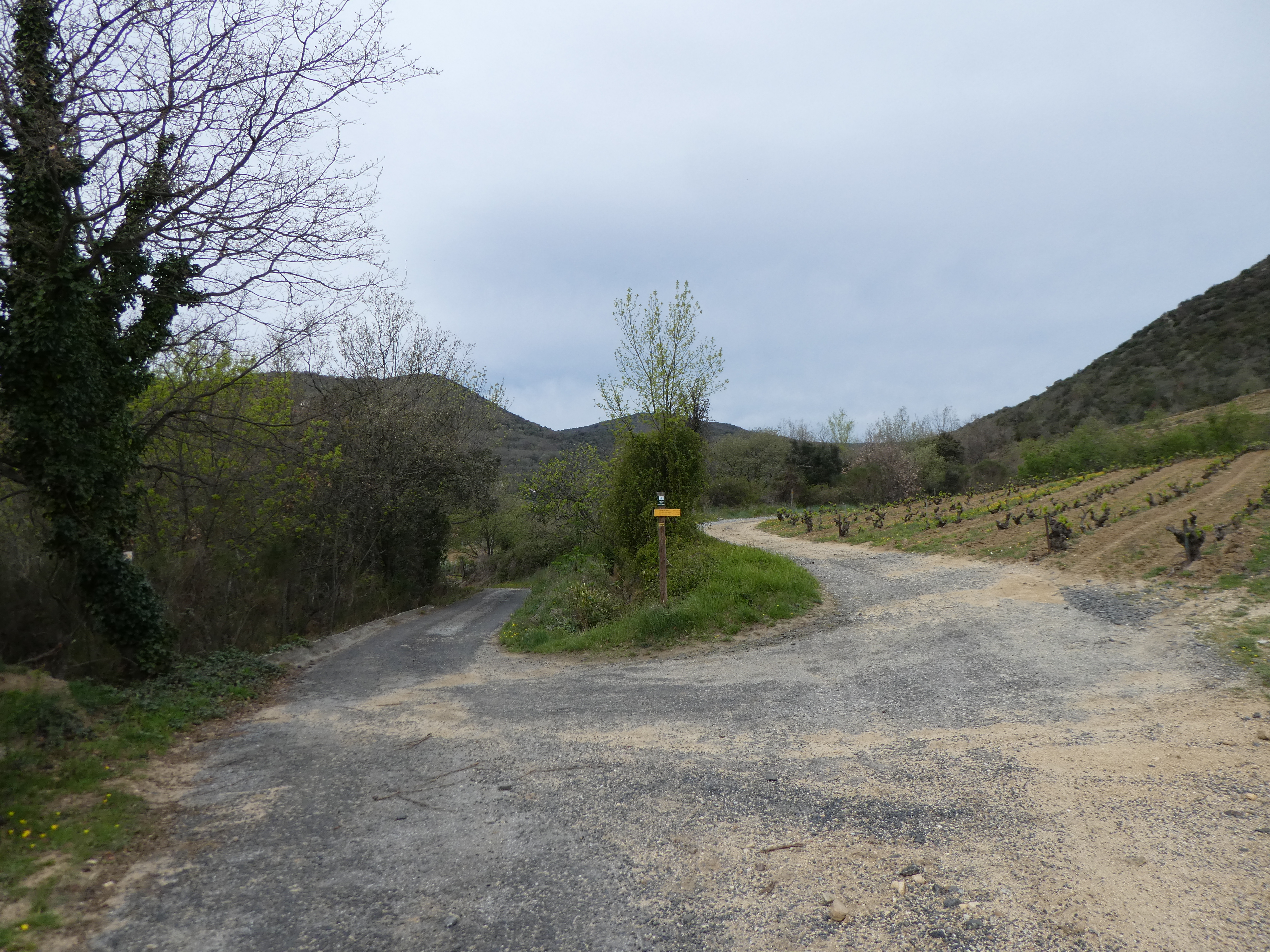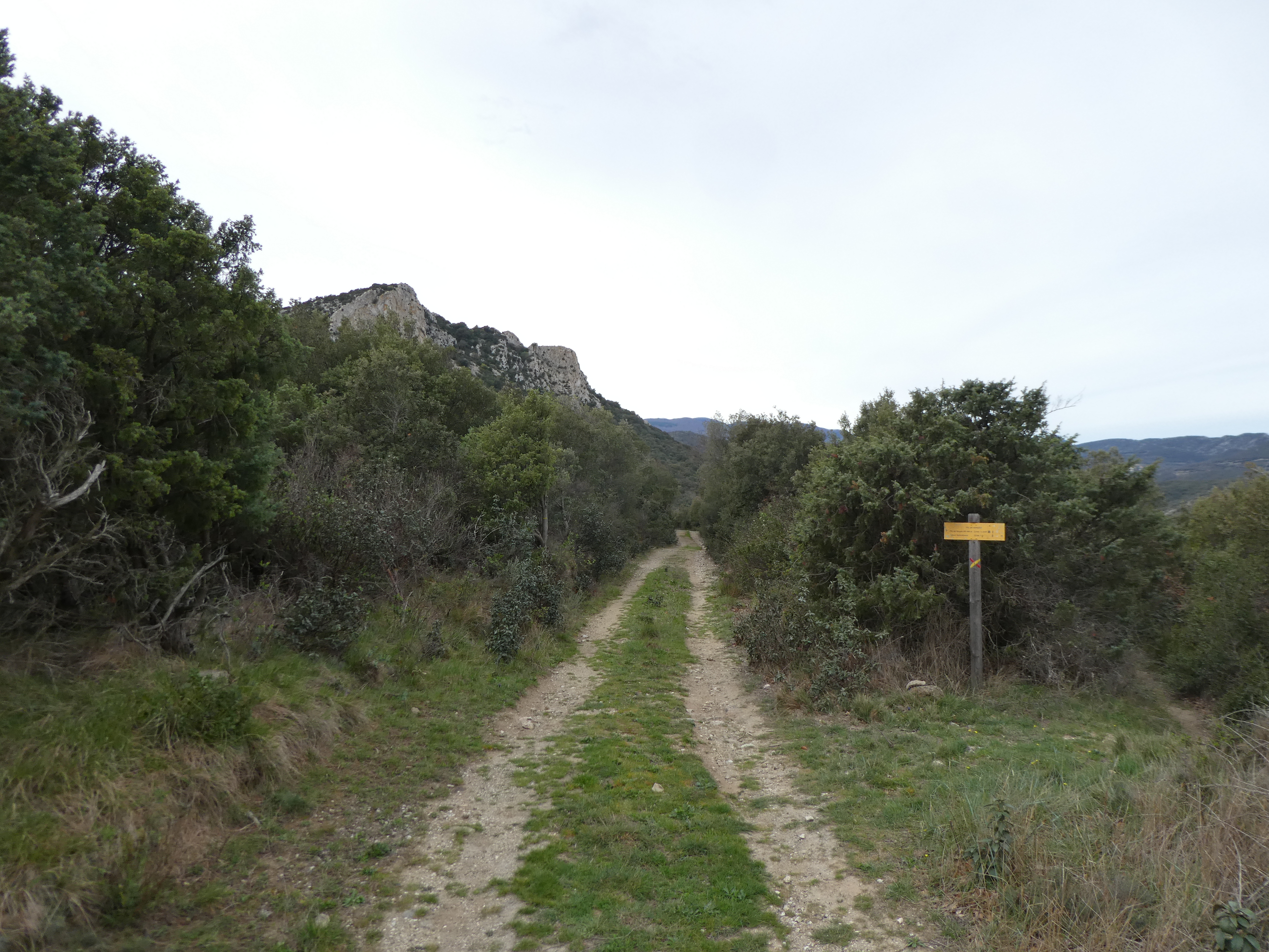 A ce croisement avec le GRP Tour des Fenouillèdes marqué par la présence d'un panneau directionnel (25 mètres après le précédent), suivre ce dernier partant sur la droite direction Ansignan, balisé en jaune et rouge, et en jaune dorénavant