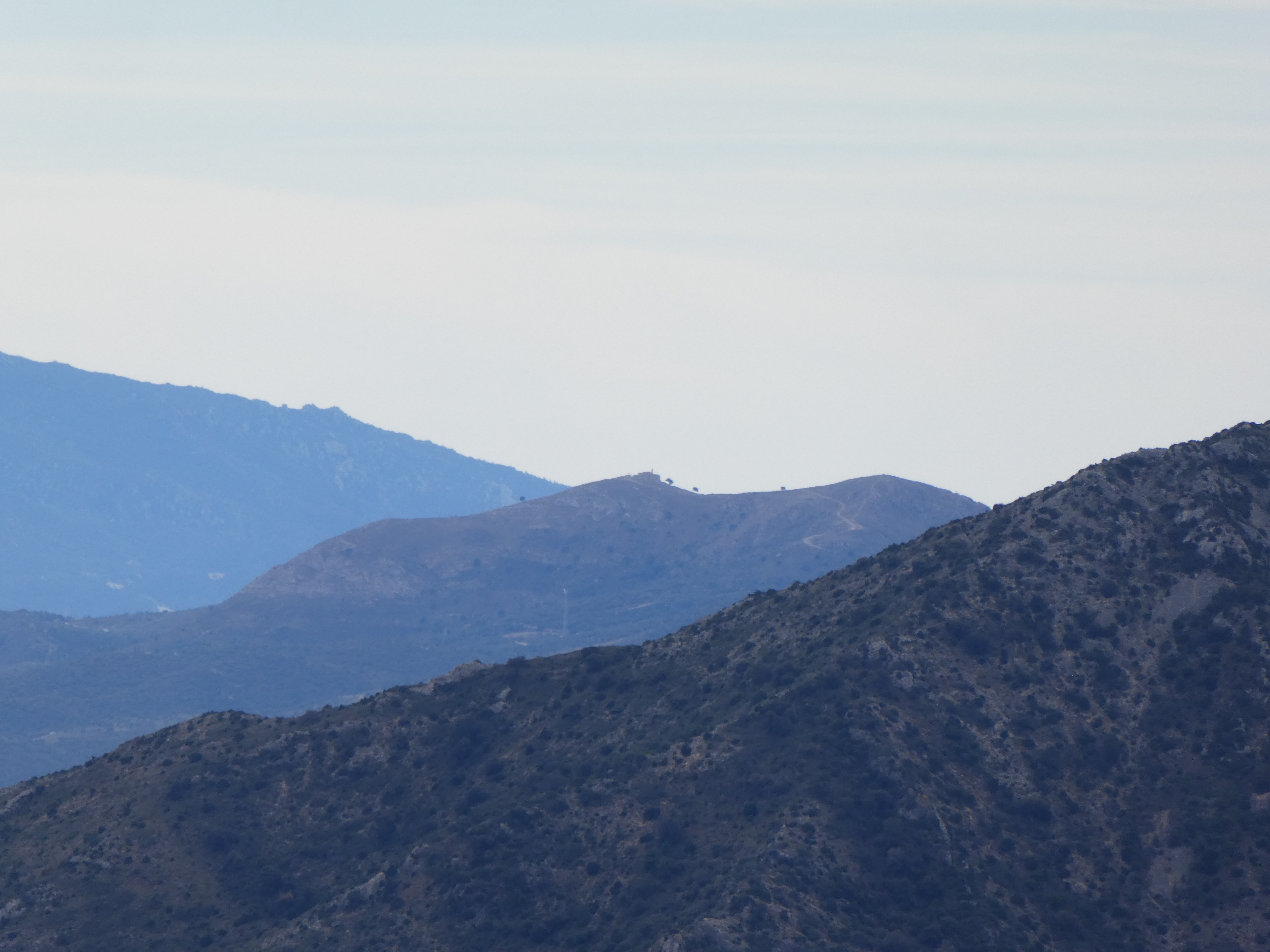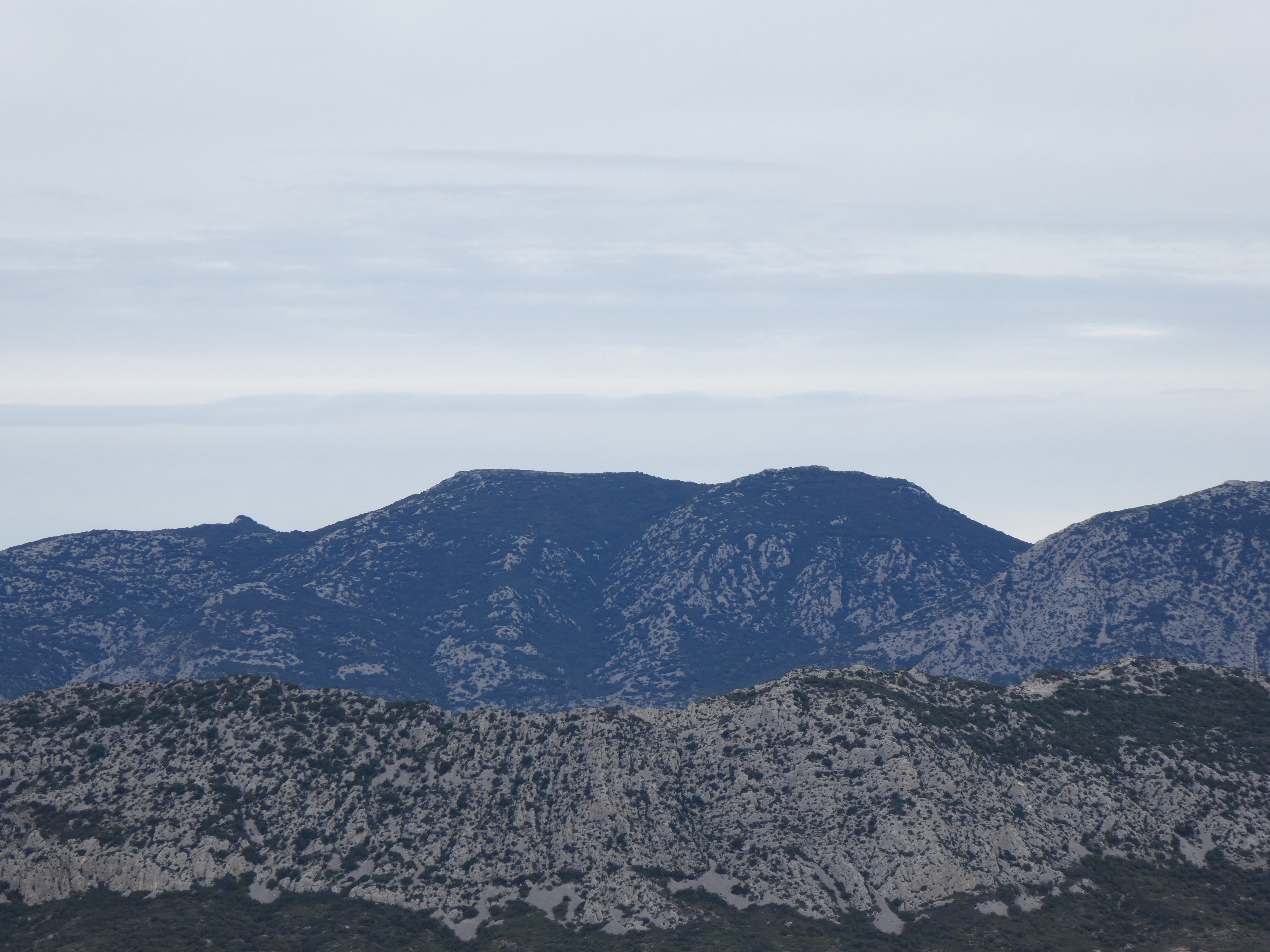 Zoom sur le Puig de Sant Cristau (1015 m) au centre-gauche et le Puig dels Falguers (778 m) au centre-droit