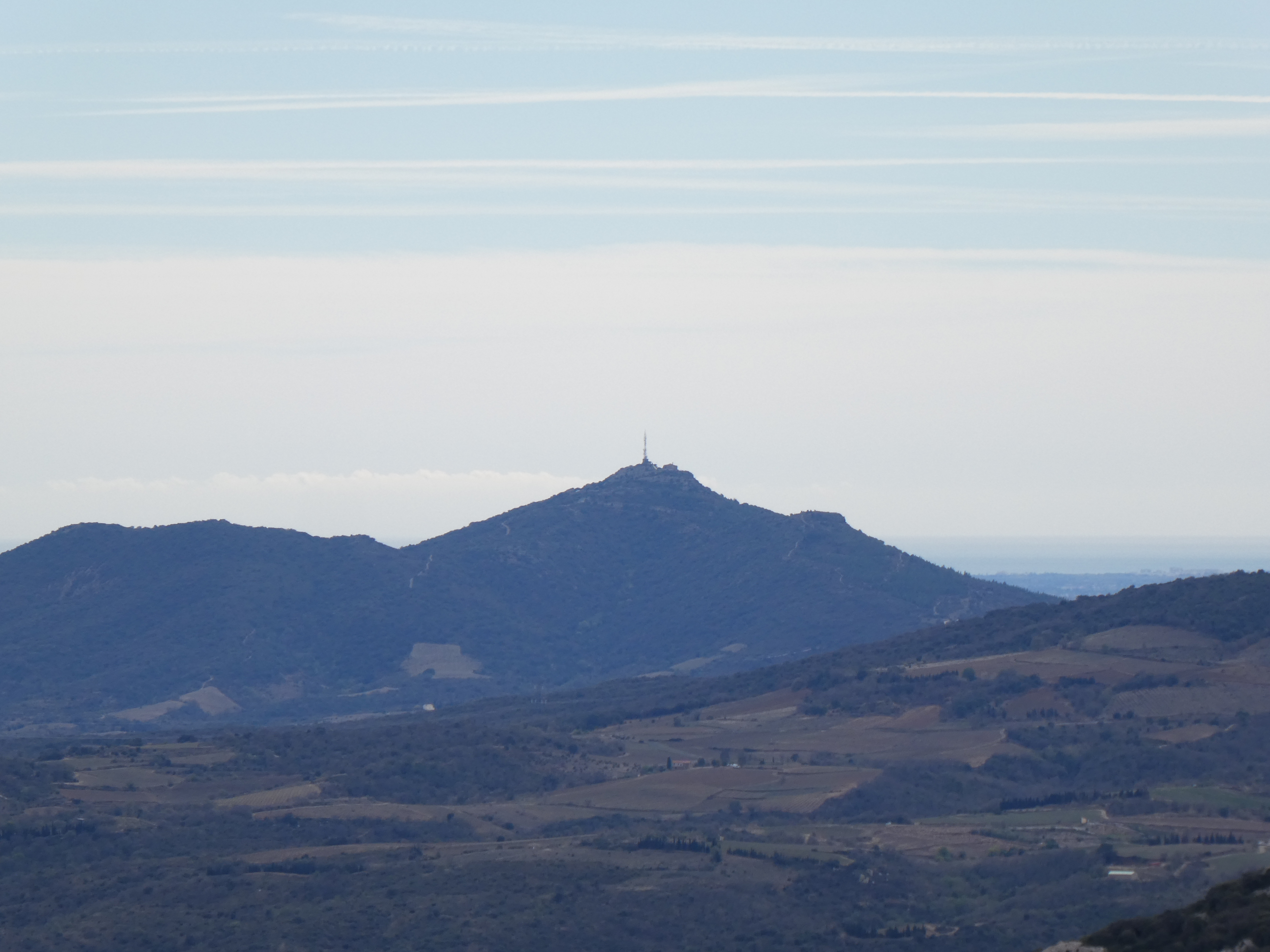 Zoom sur le Serrat d'en Bugader (346 m) ... en bas à gauche, on aperçoit Estagel situé à 14 kilomètres