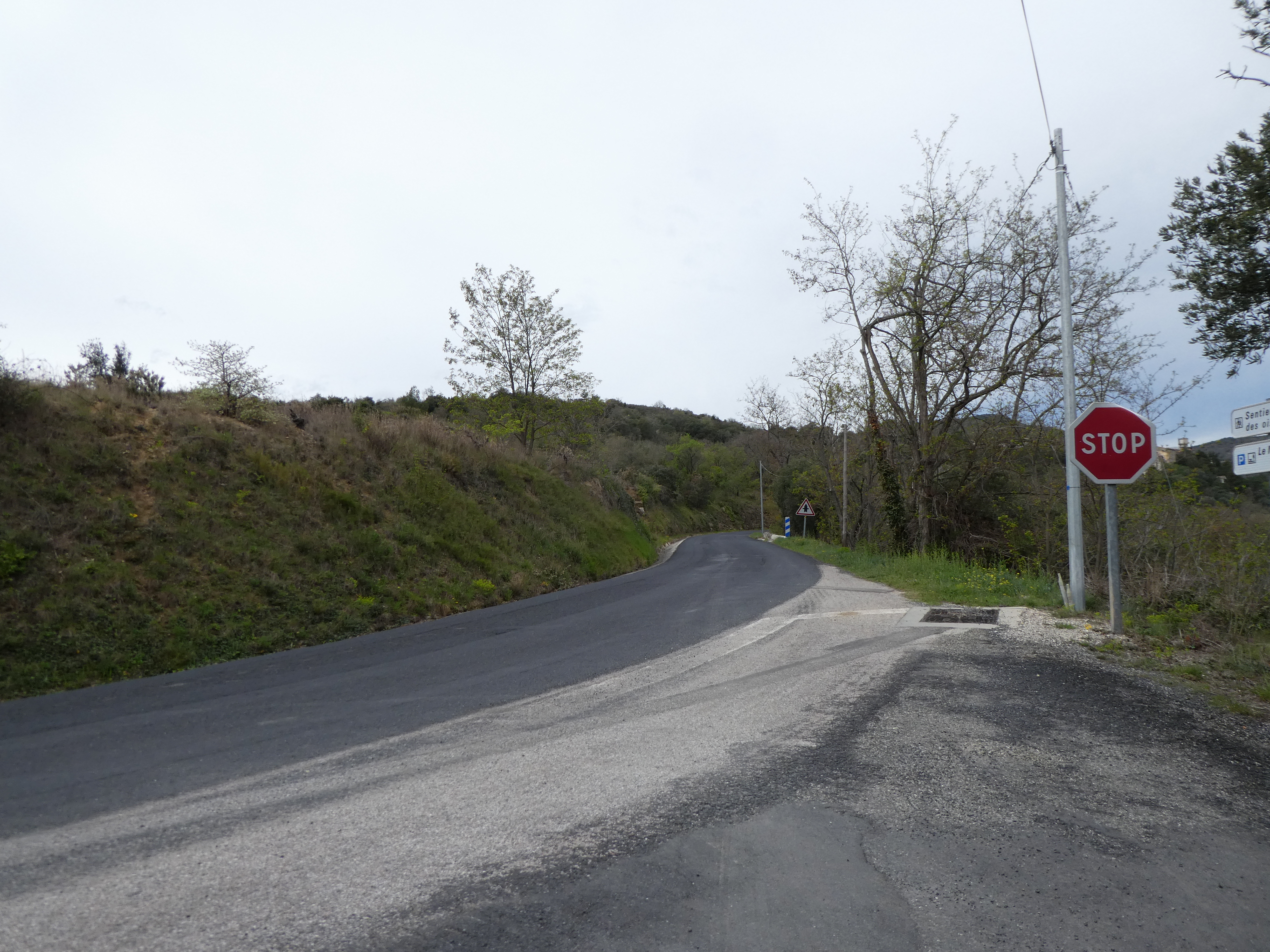 A ce croisement marqué par la présence d'un panneau directionnel (200 mètres après le lieu-dit "les Vignes"), suivre la route partant tout droit direction Ansignan, balisé en jaune et rouge, et en jaune