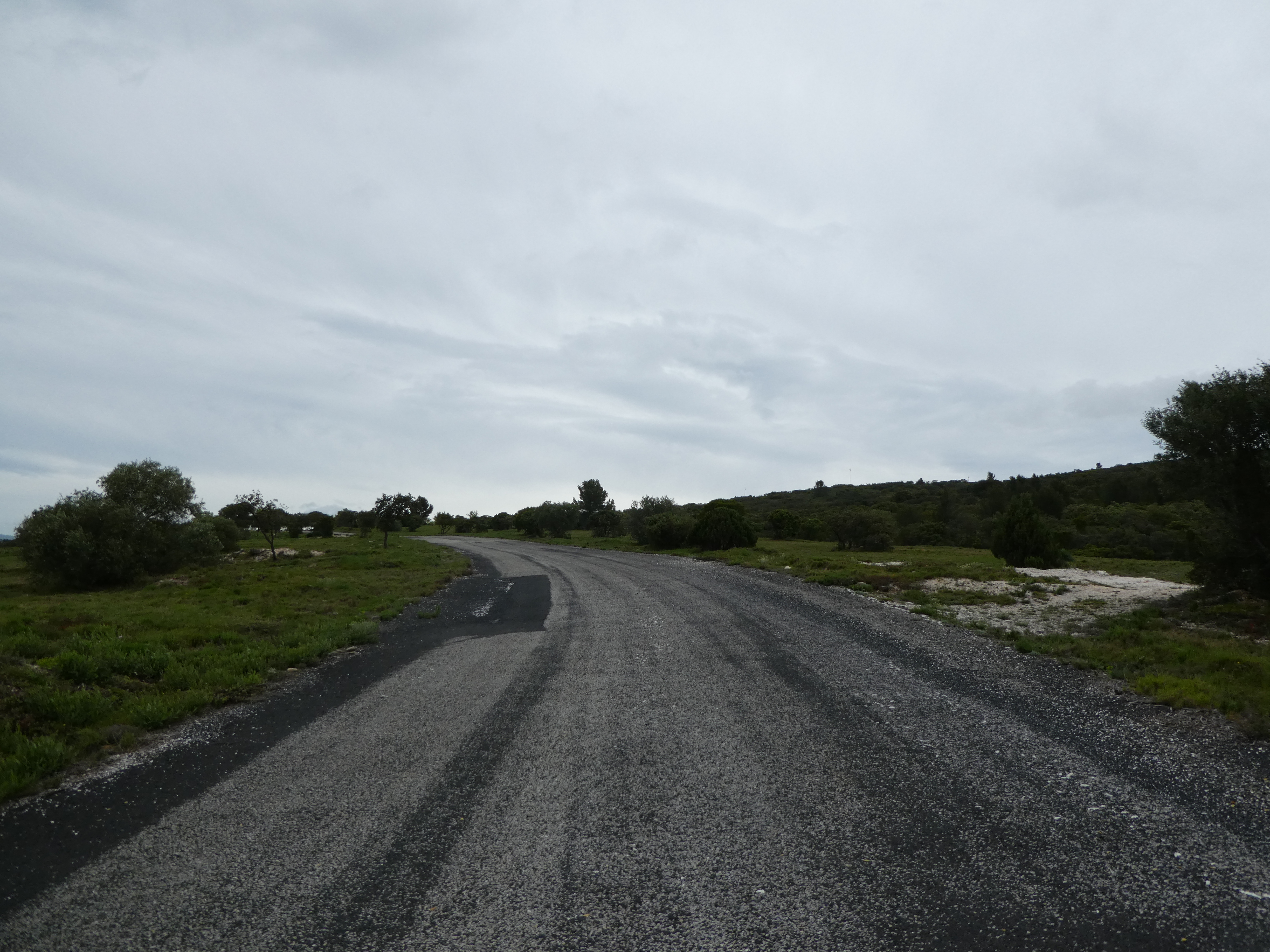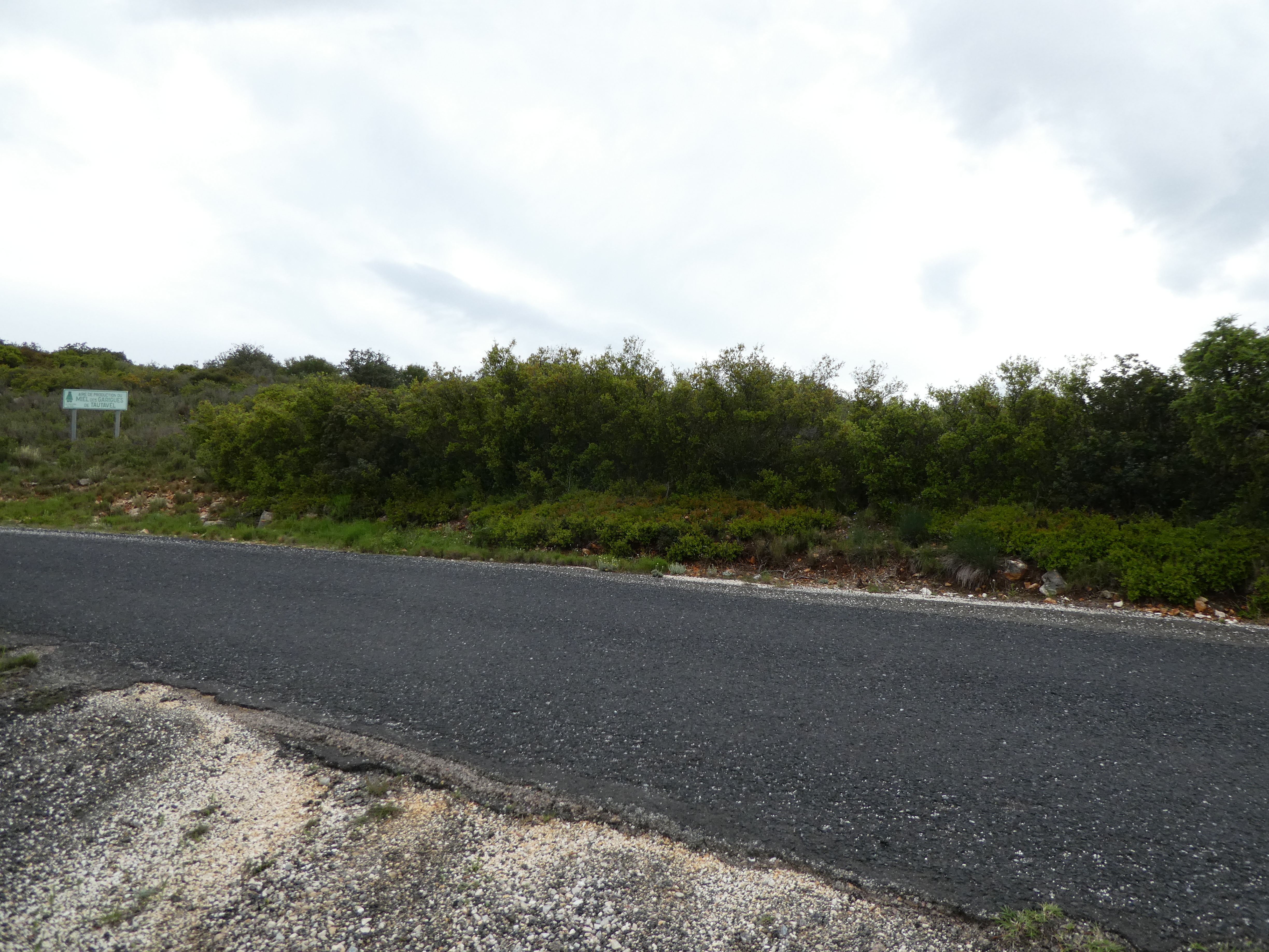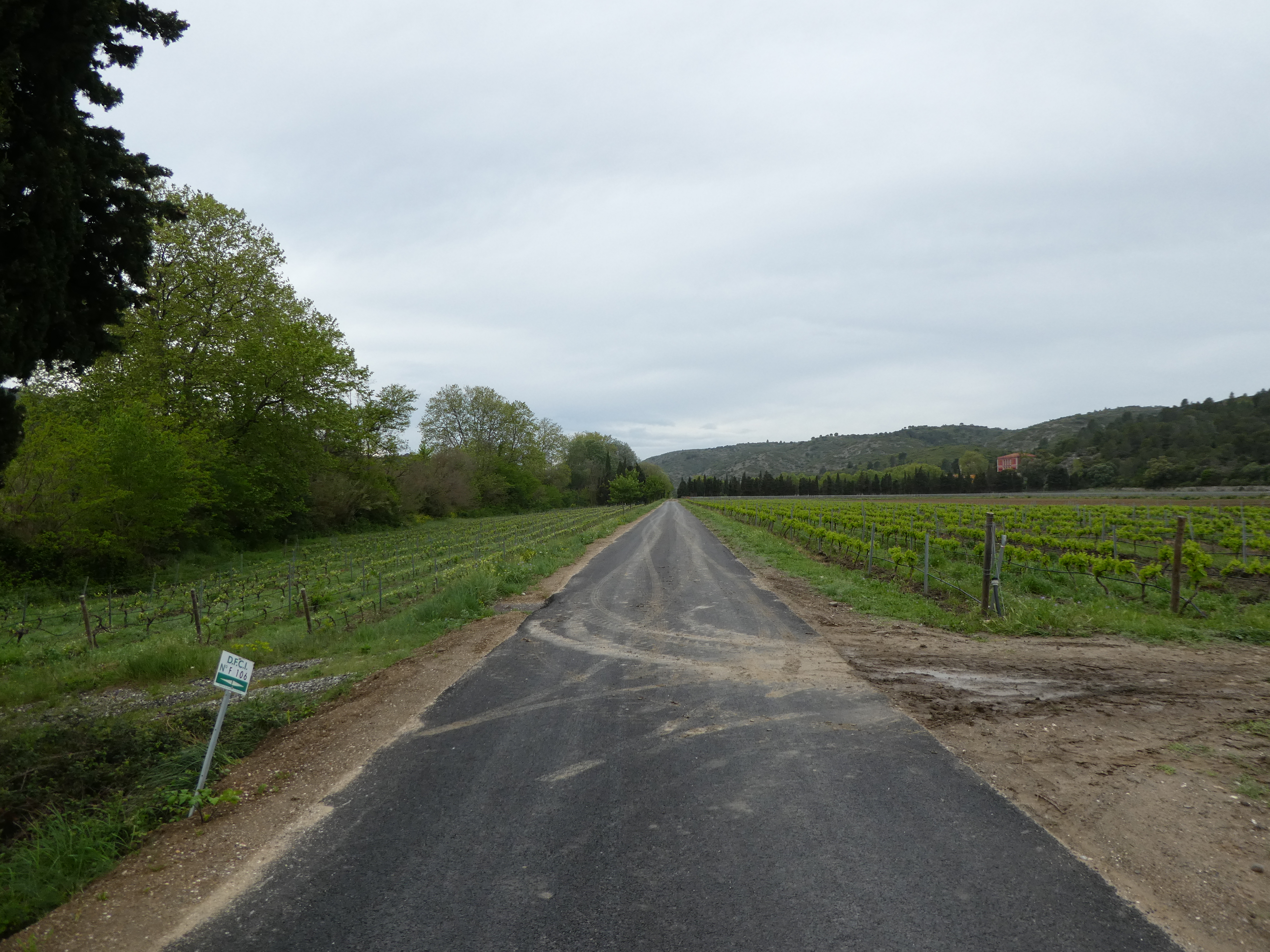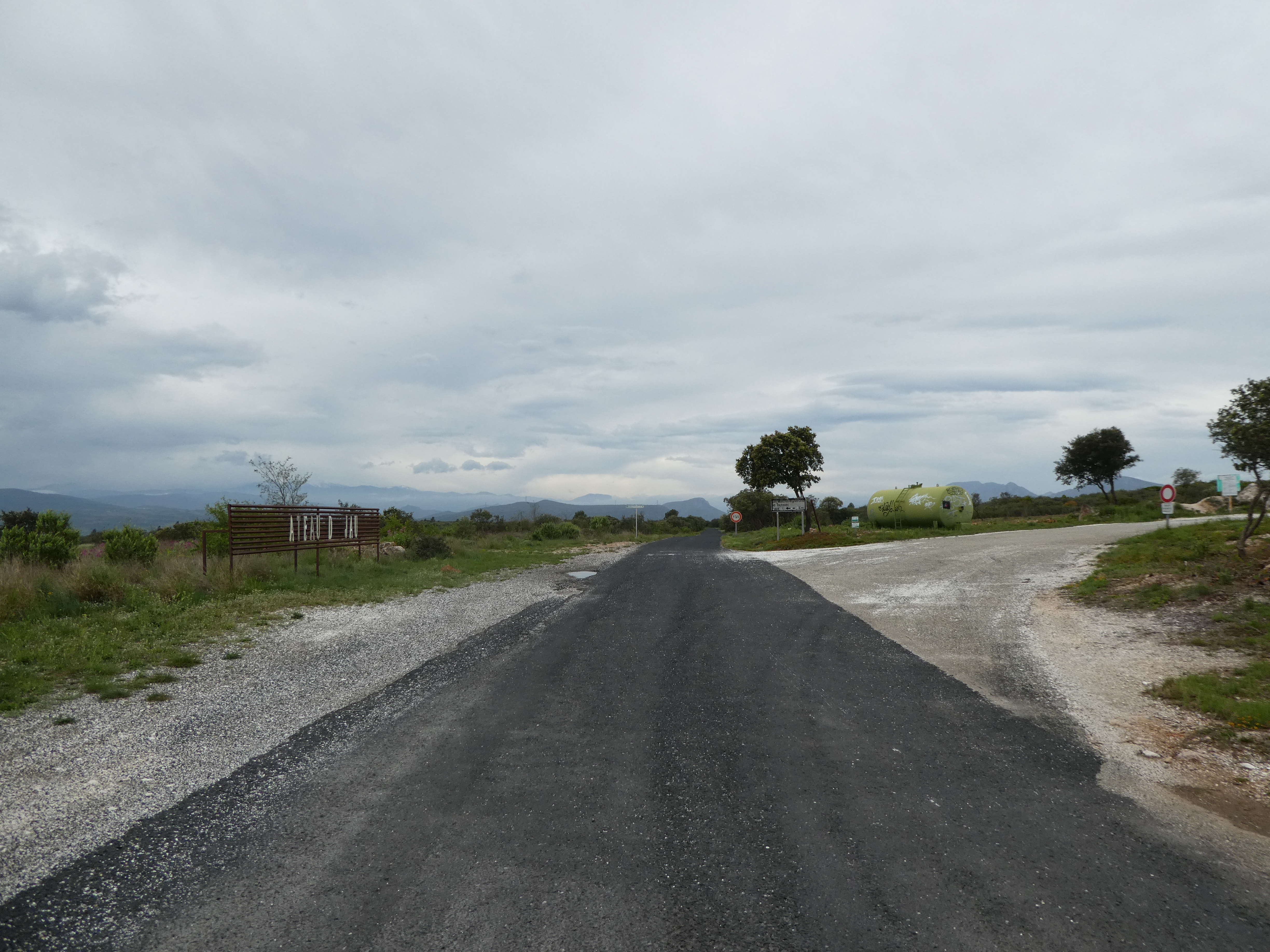 A ce croisement (600 mètres après le précédent mentionné), suivre le large chemin bitumé partant tout droit direction Cases-de-Pène, balisé en jaune (ceux qui auraient suivi le raccourci devraient se retrouver ici avec 750 mètres de marche en moins)