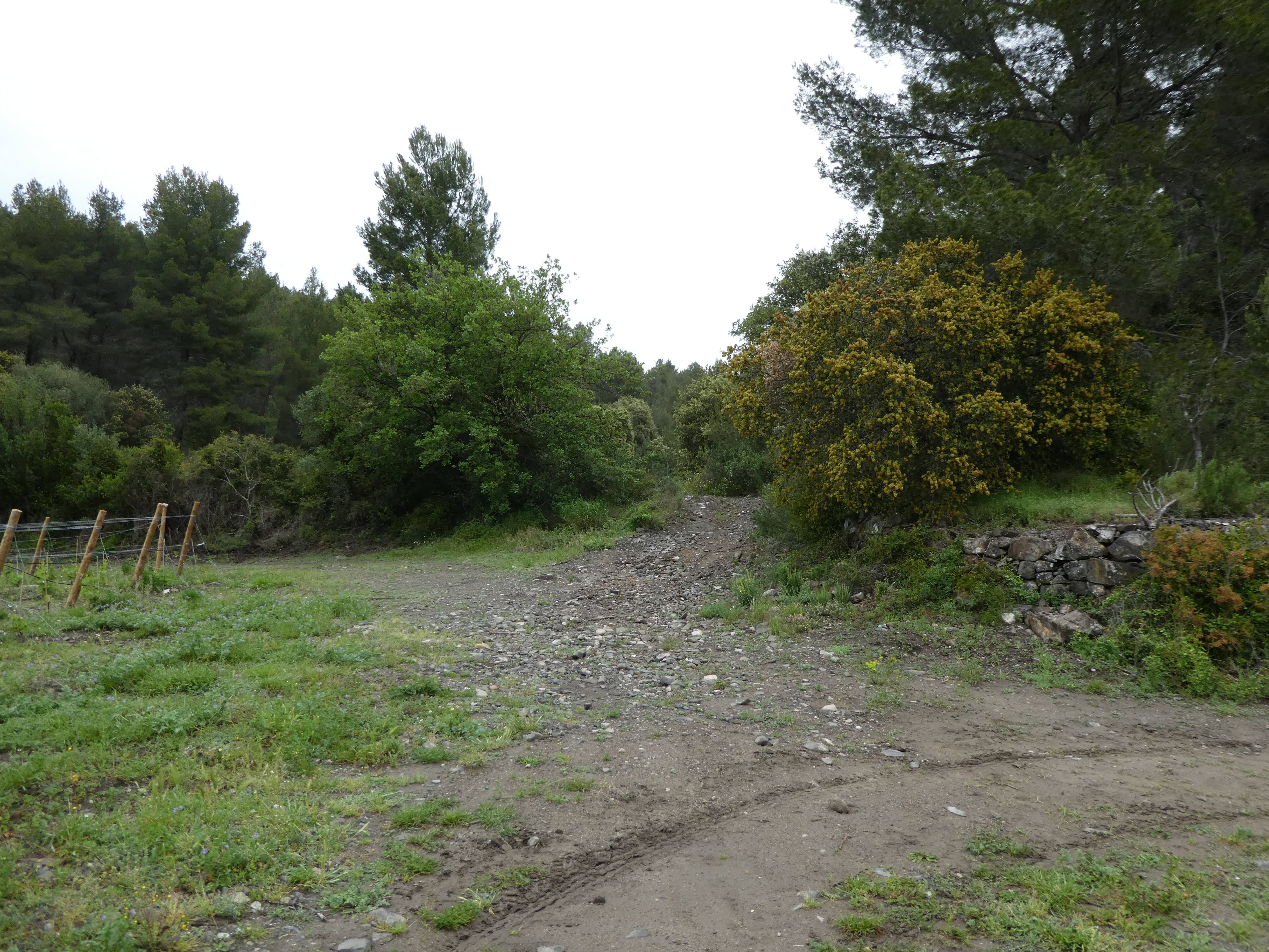 A ce croisement (800 mètres après le précédent) (134 m), suivre le chemin descendant sur la droite direction Cases-de-Pène, balisé sporadiquement en jaune (il est possible de suivre le large chemin partant tout droit qui rejoint en 250 mètres le chemin balisé en jaune ramenant à Cases-de-Pène