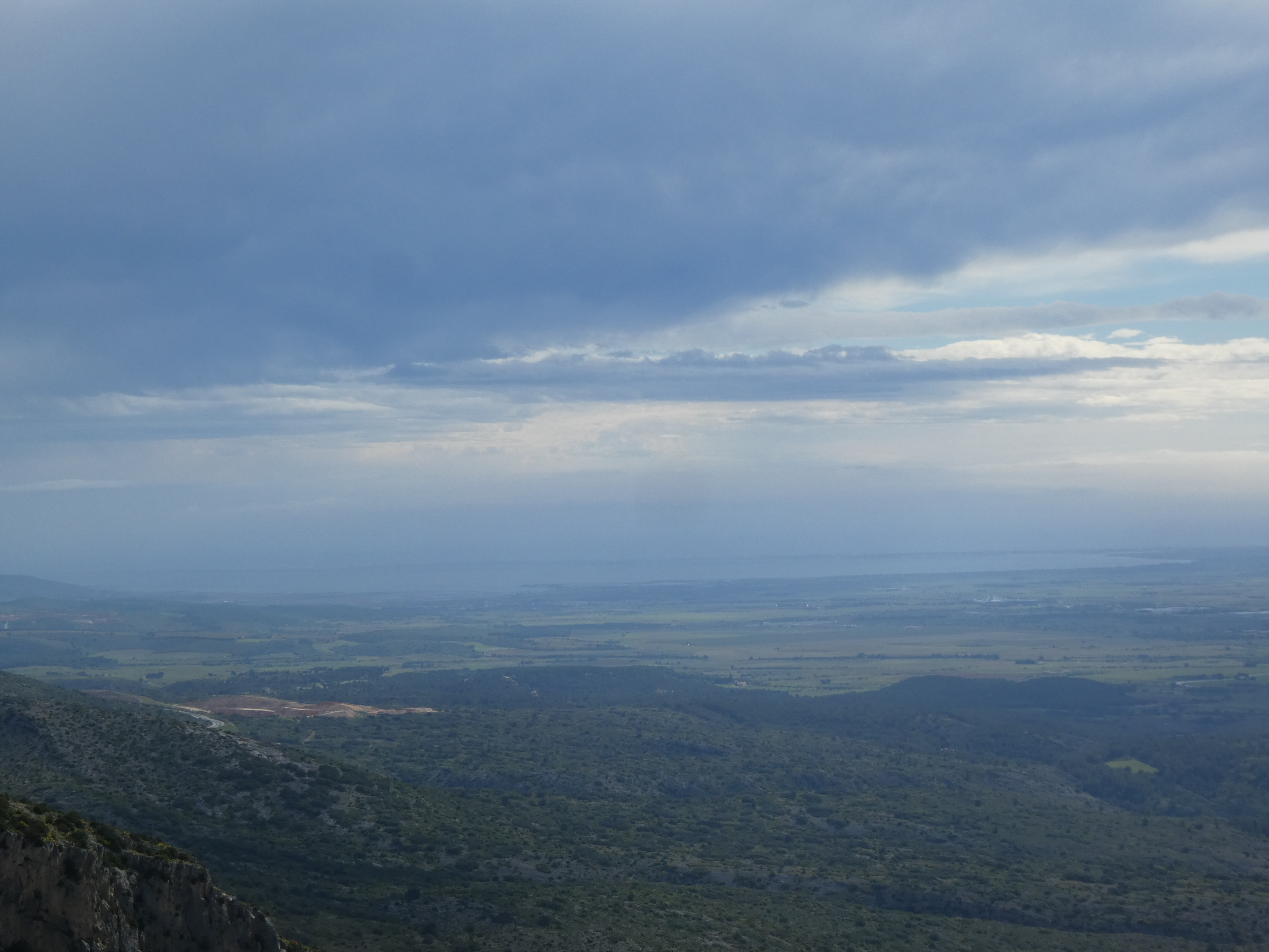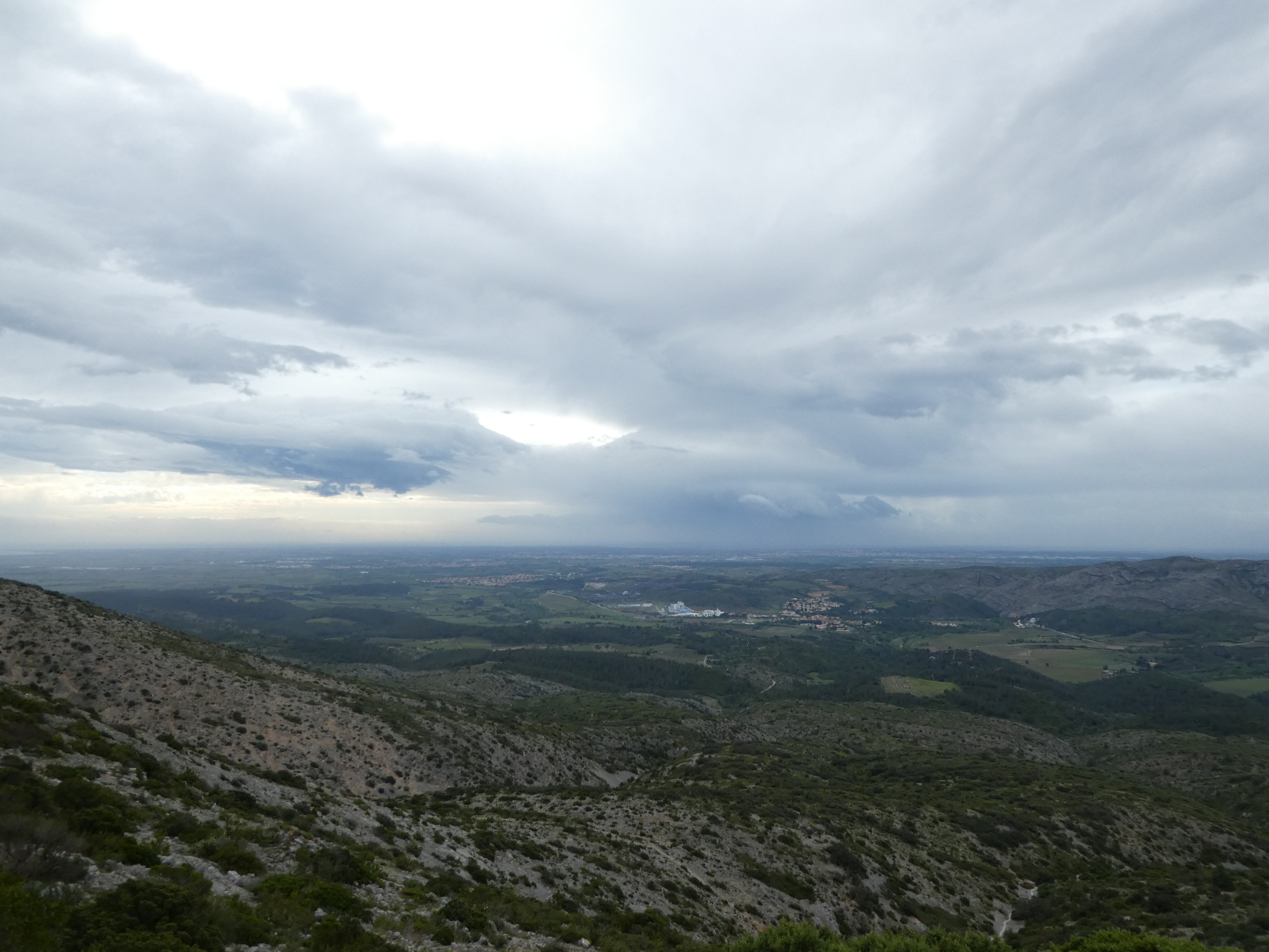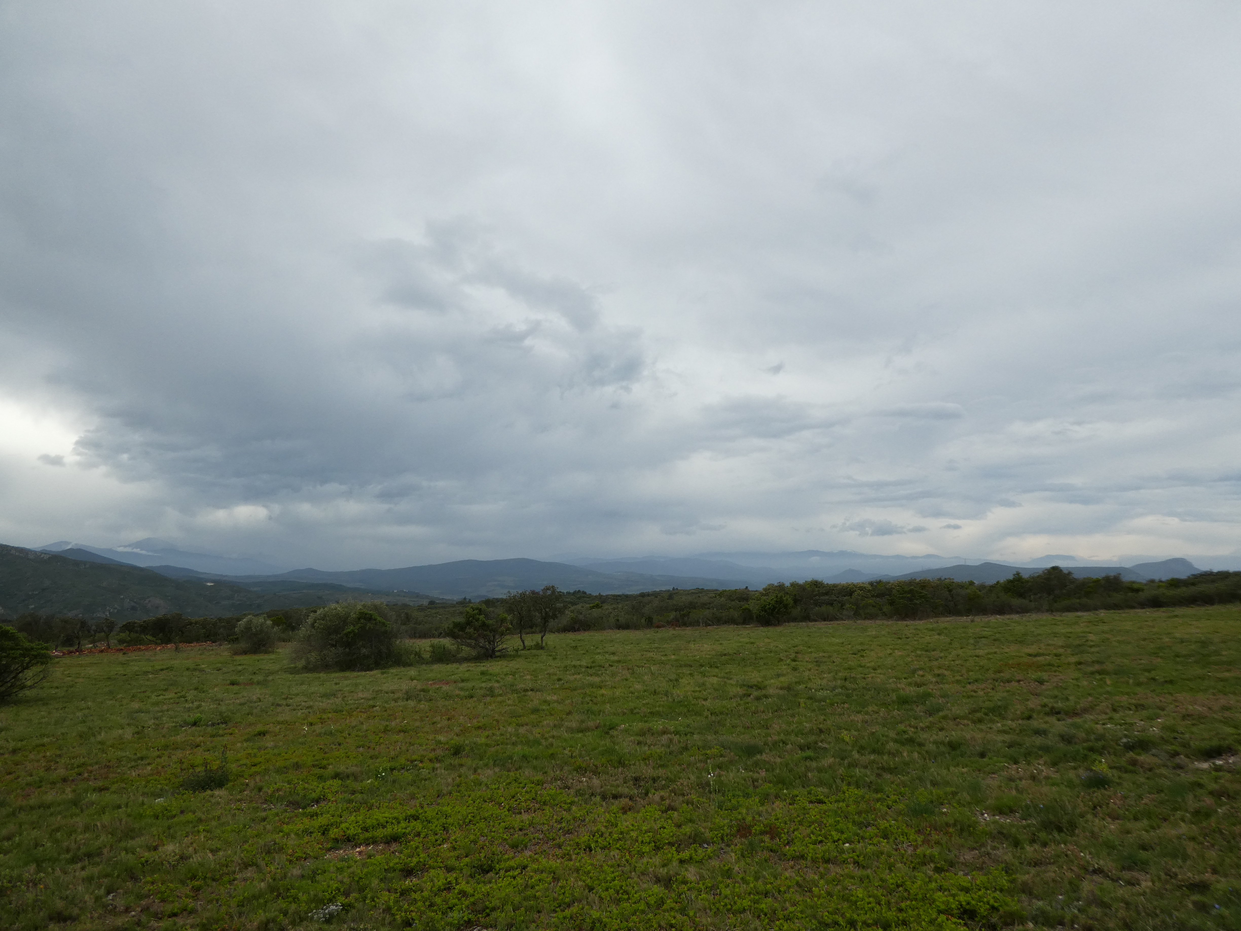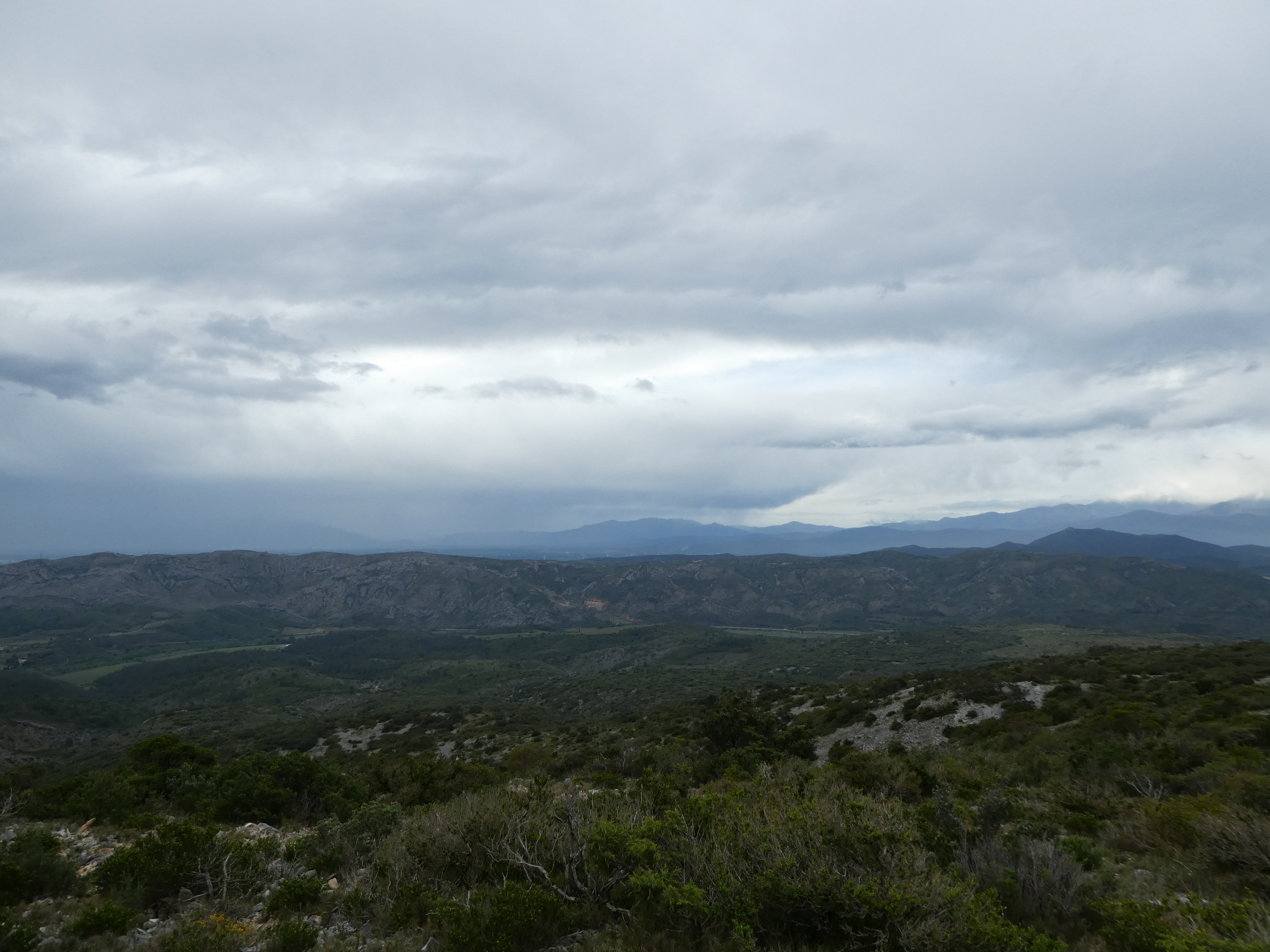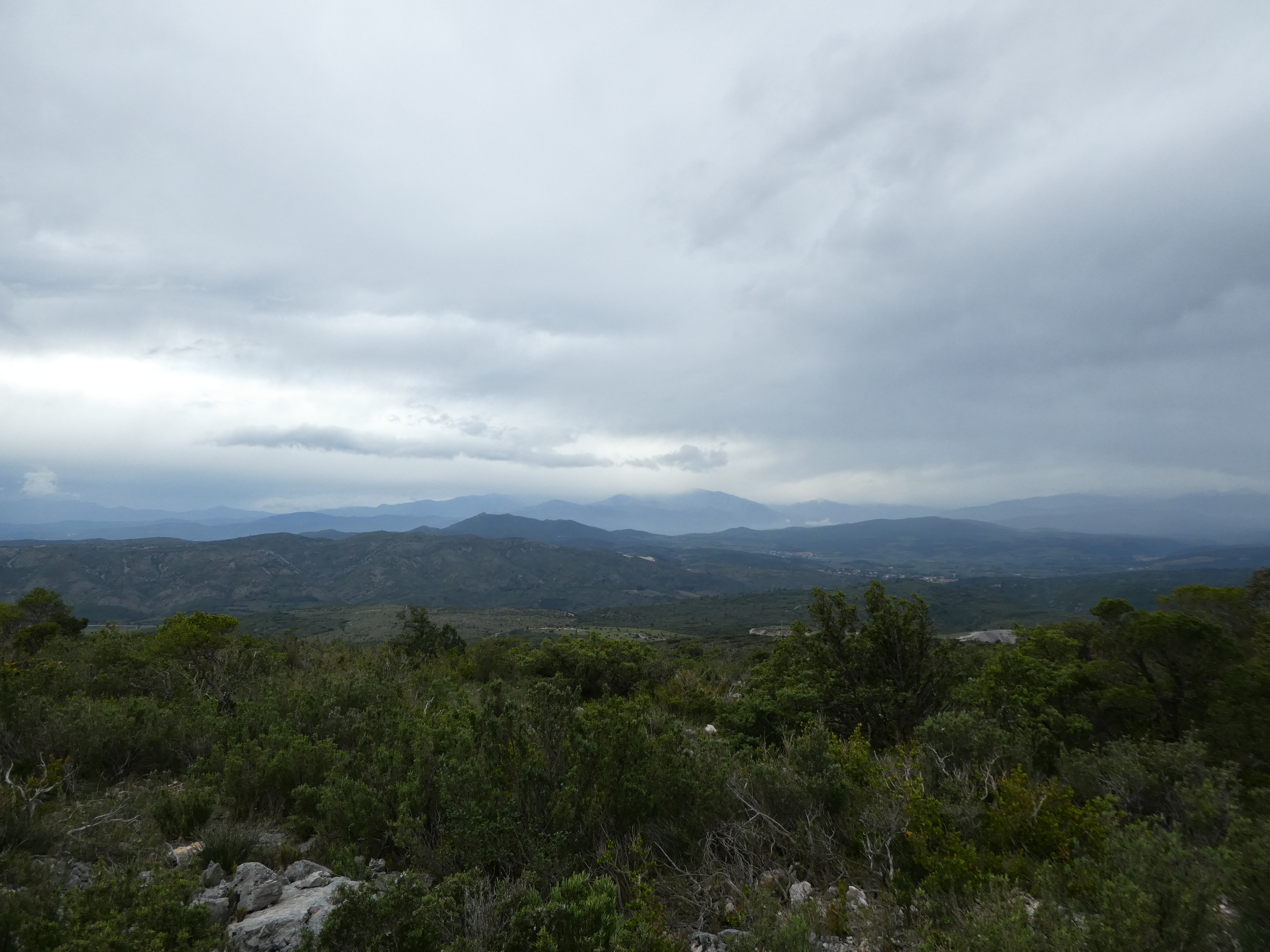 Vue en direction du massif du Canigou sous la pluie