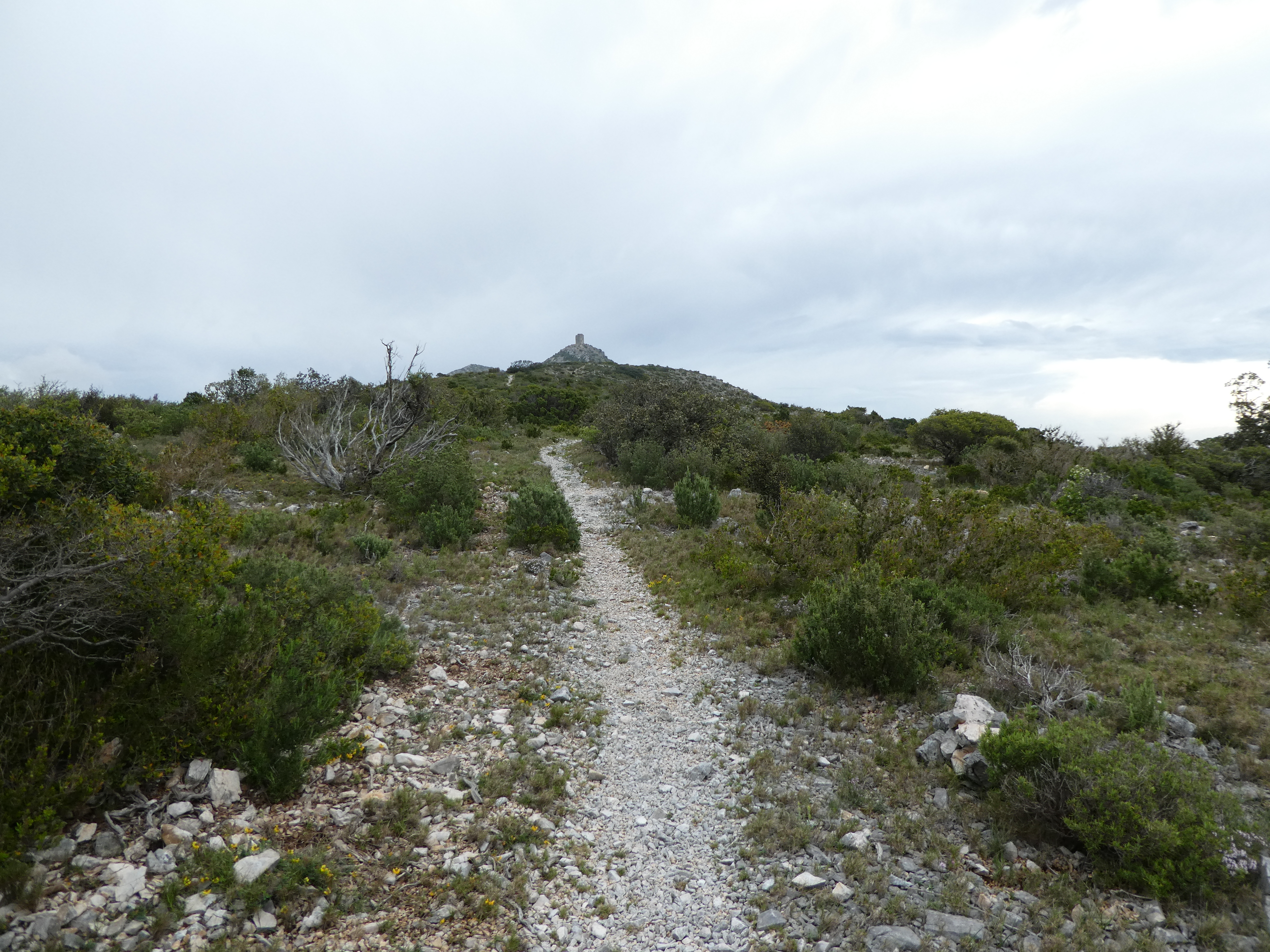 A ce croisement avec le chemin "officiel" et balisé en jaune venant de Cases-de-Pène (900 mètres après le précédent) (418 m), continuer à suivre le chemin de crête partant légèrement sur la gauche direction Tour de Tautavel, balisé en jaune et rouge, en jaune et blanc, et en jaune dorénavant