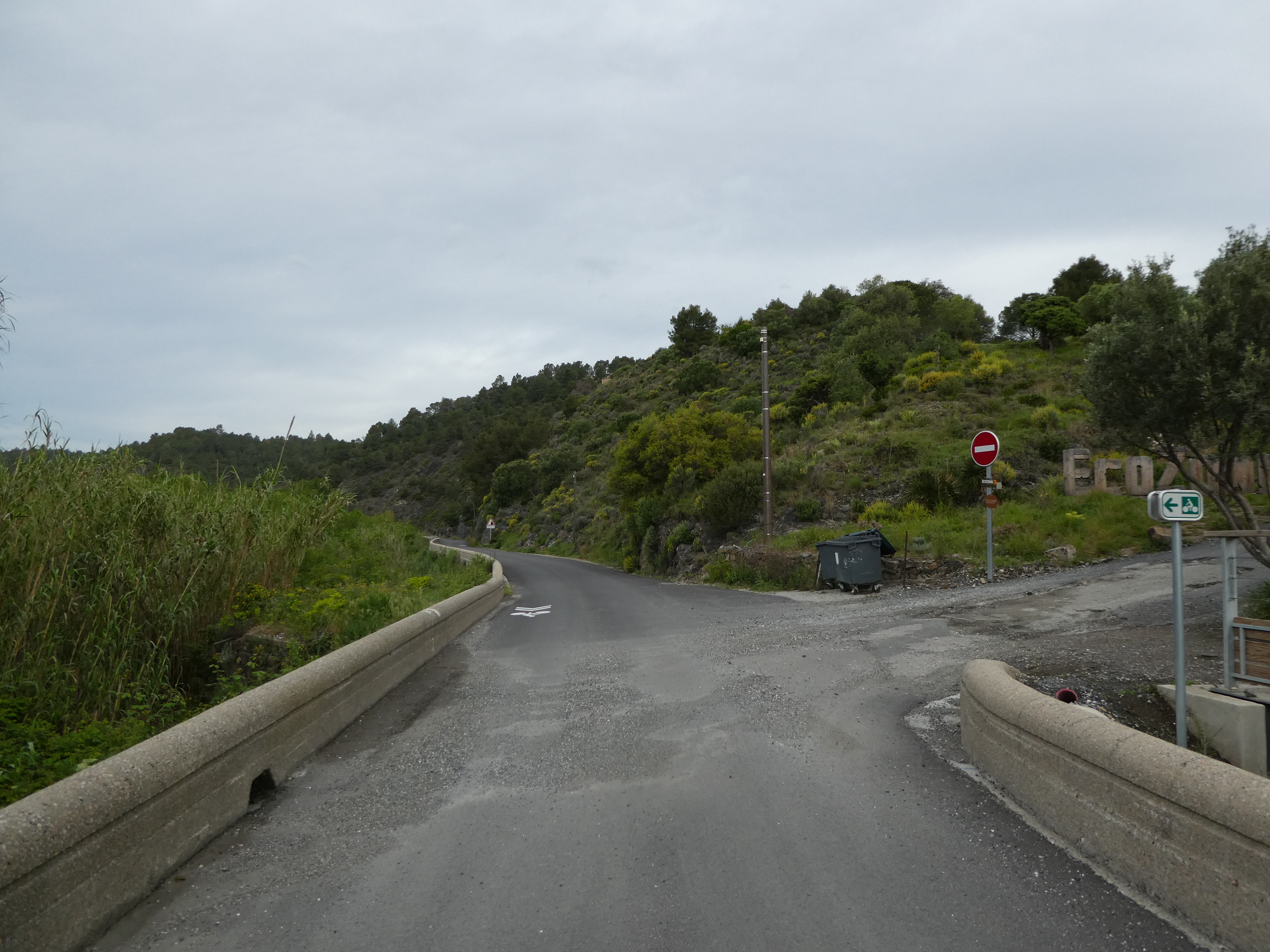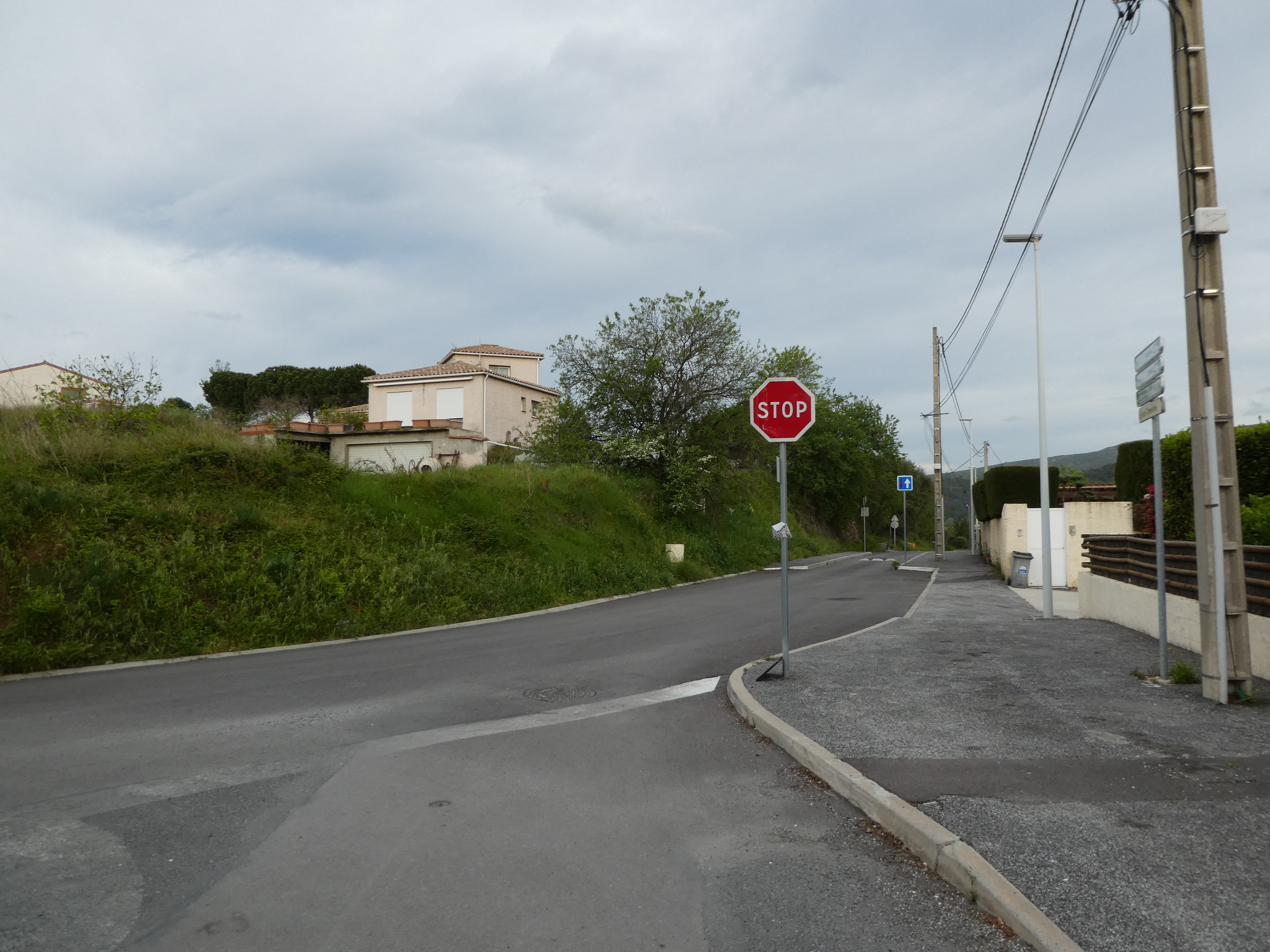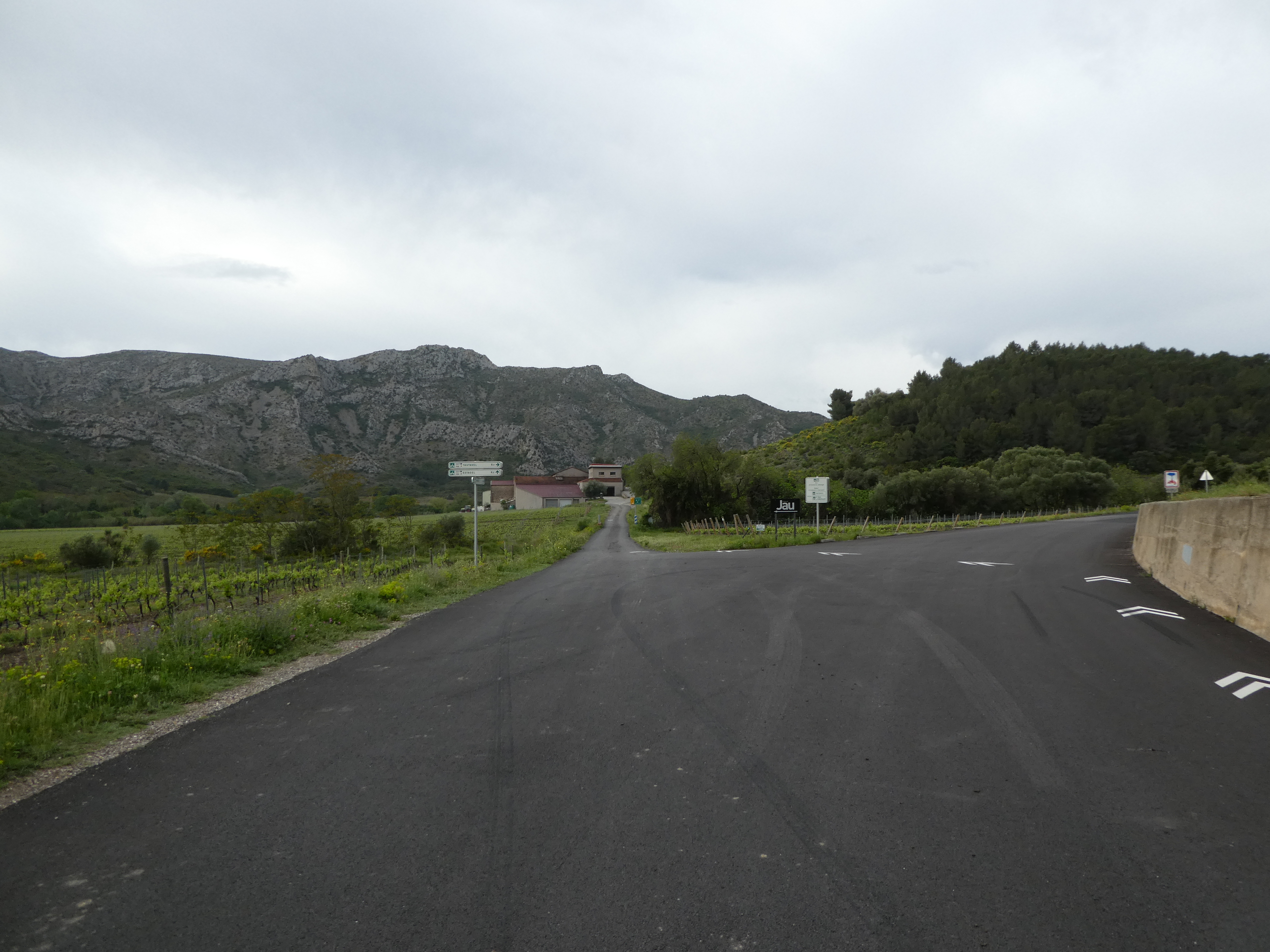 A cette intersection avec la route menant à EcoZonia (900 mètres après la précédent) (51 m), continuer à suivre la D59 partant tout droit direction Estagel, aucun balisage dorénavant (la route montant sur la droite ne semble plus être balisée en jaune ...)