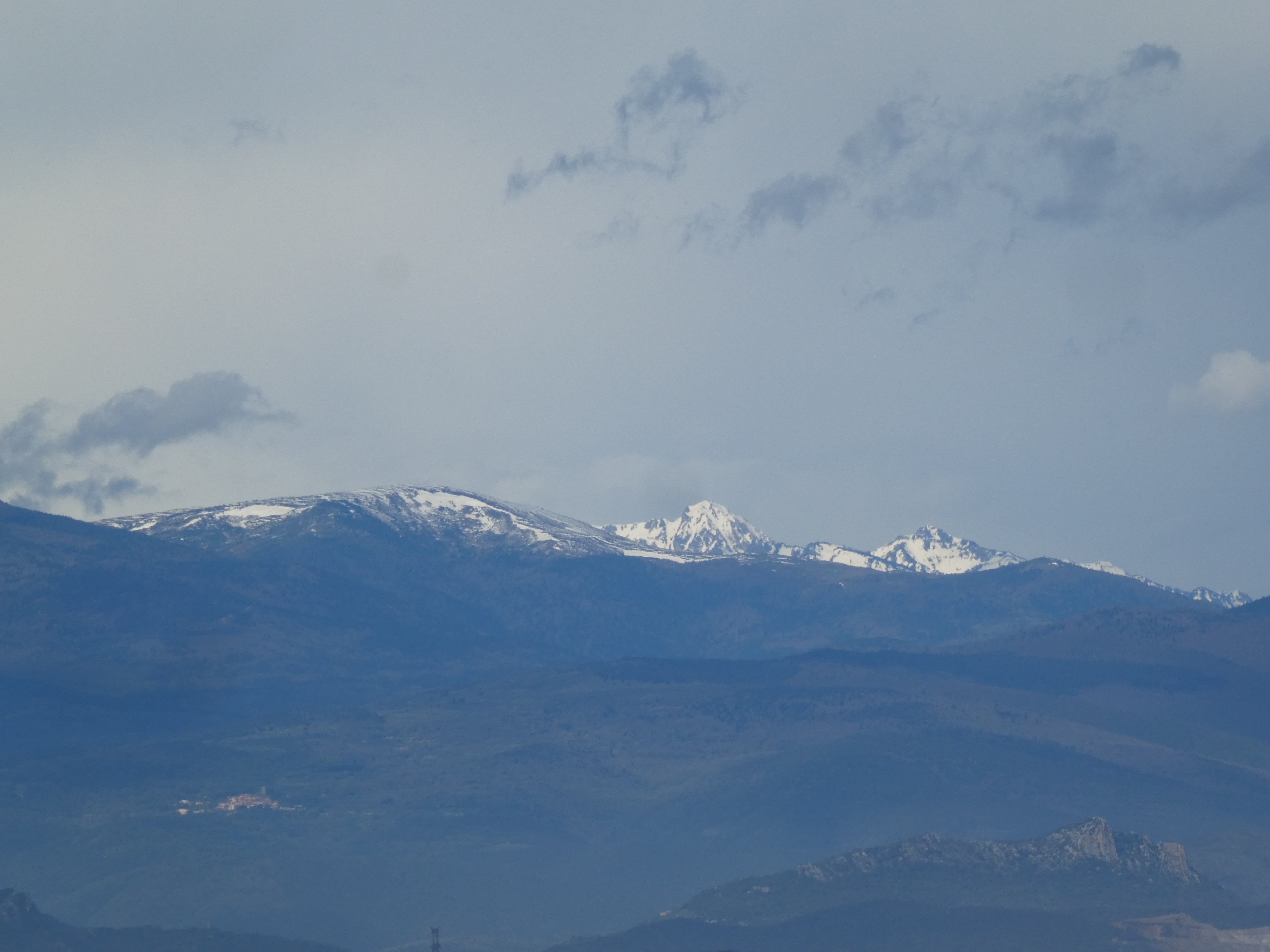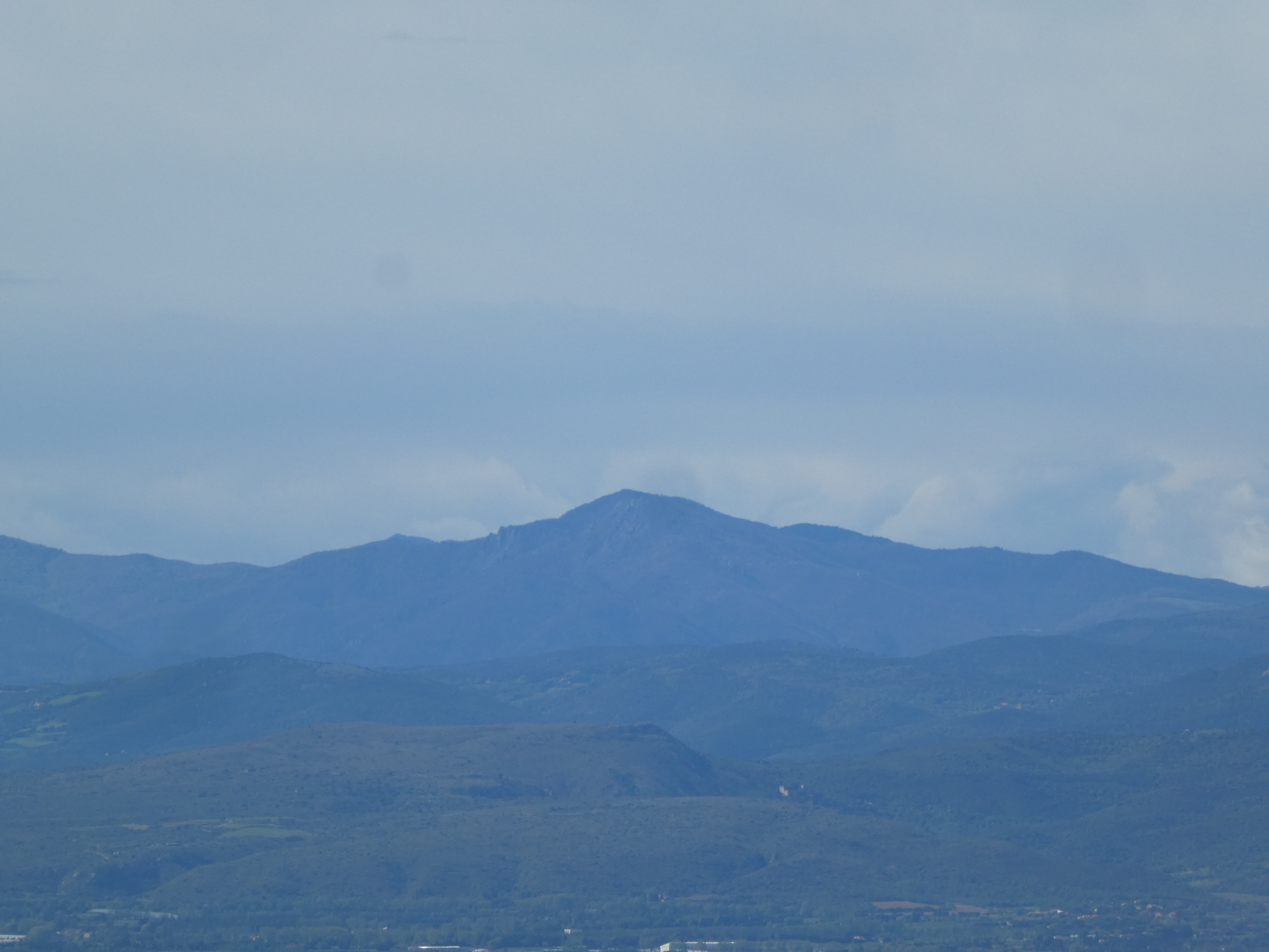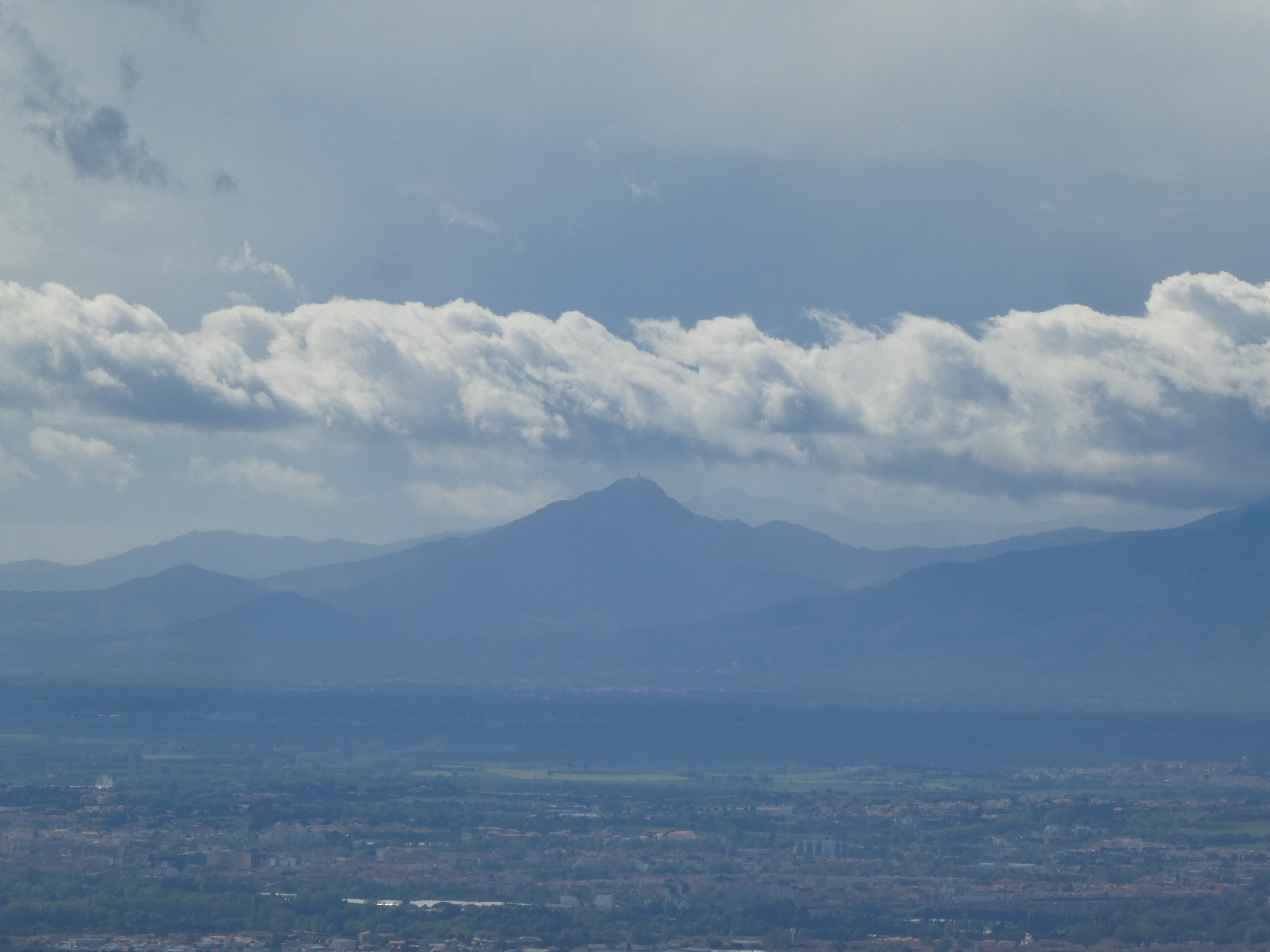 Zoom sur les sommets du massif du Canigou encore dans les nuages ... seuls le Puig Barbet (2712 m) et le Pic du Canigou (2784 m) à droite sont visibles ; en bas, on aperçoit la crête de Força Real (510 m)