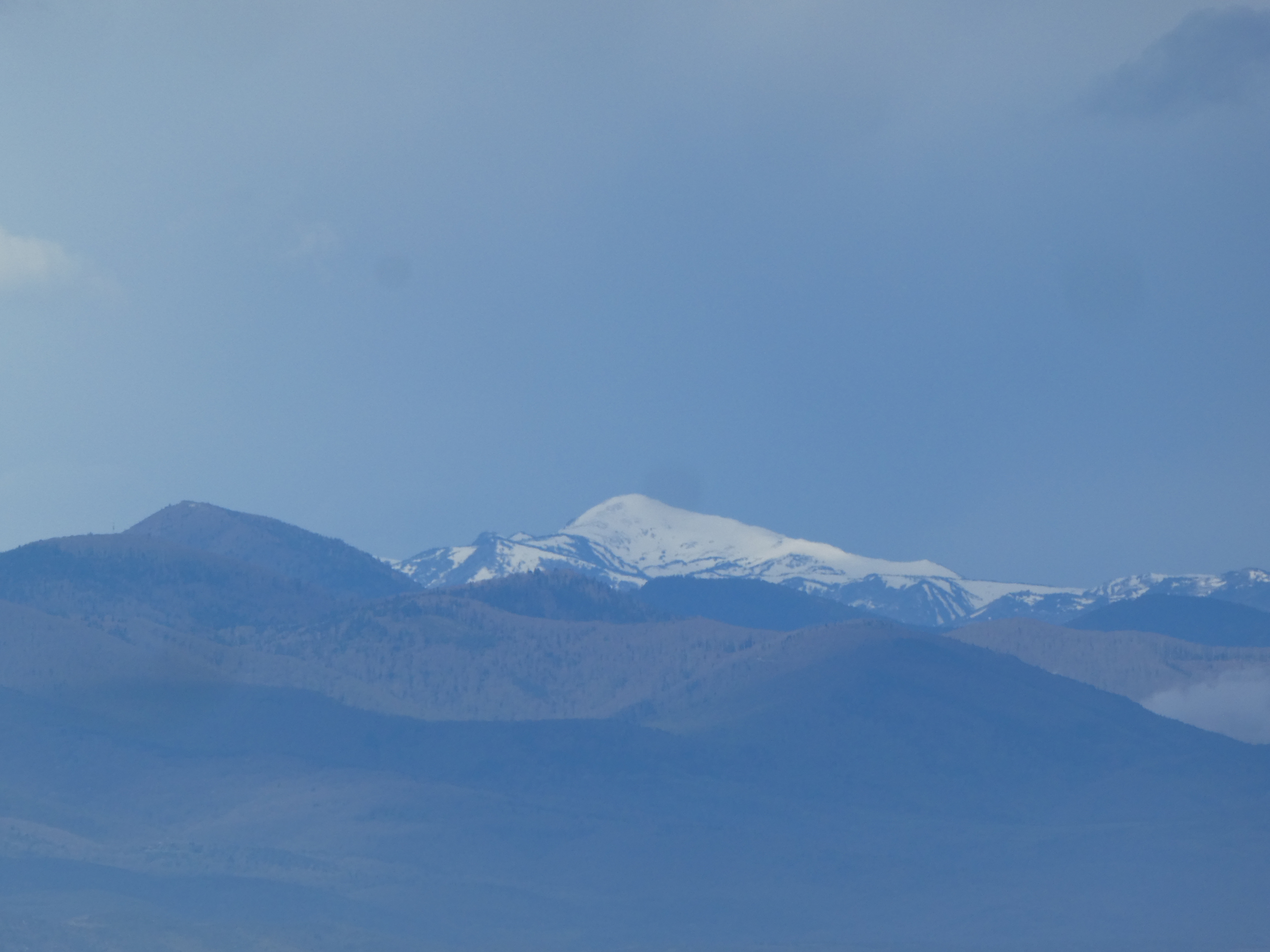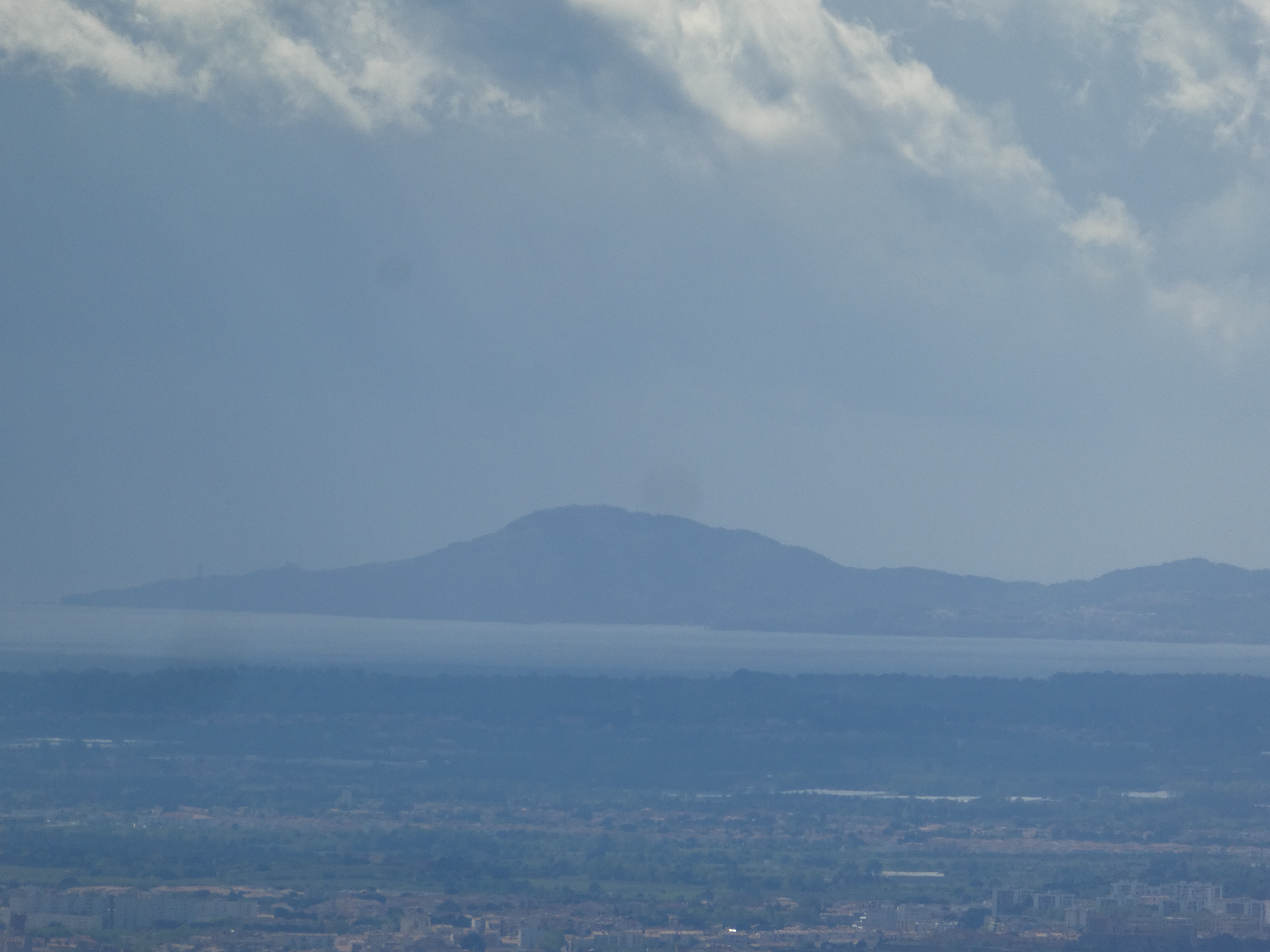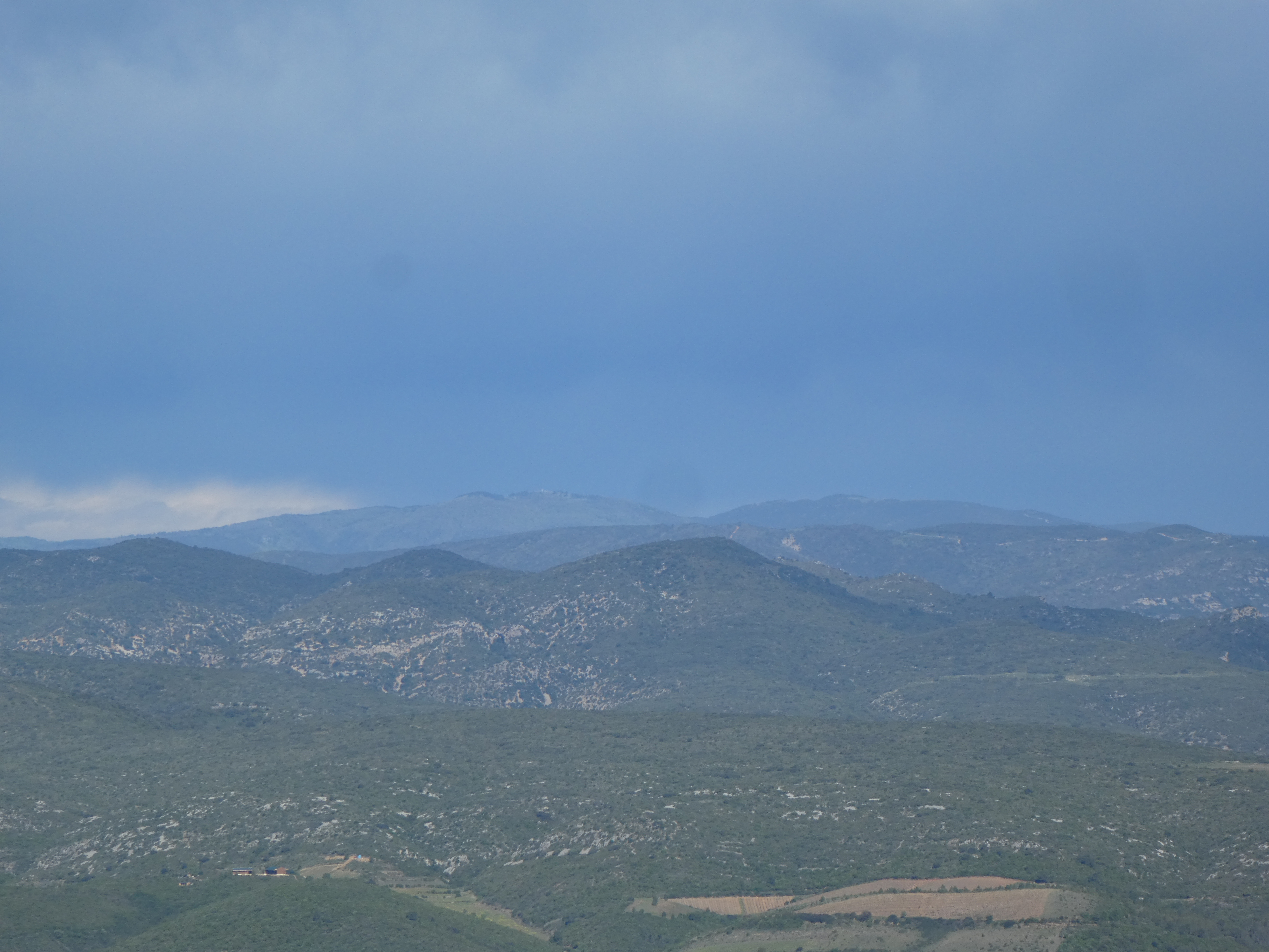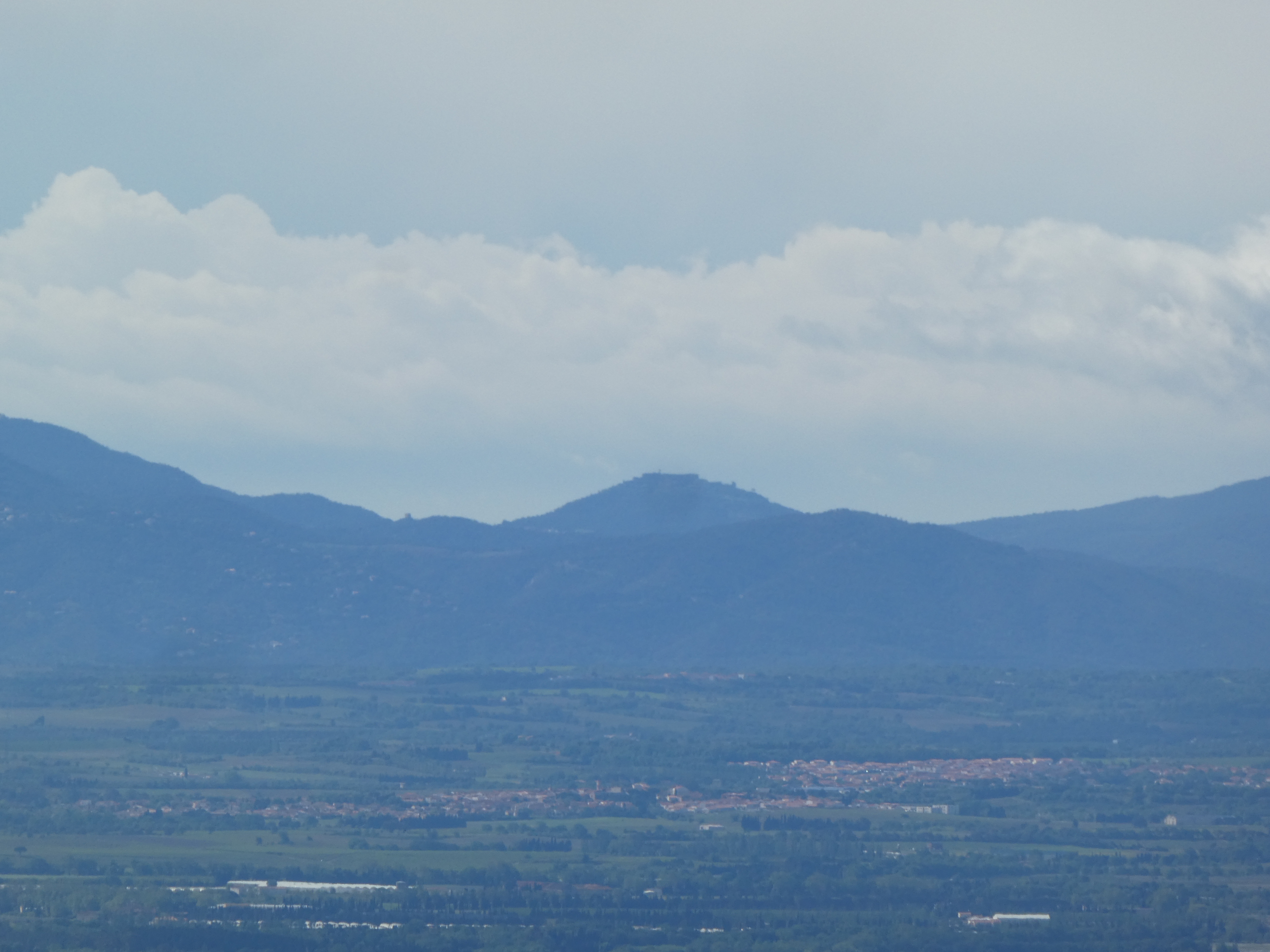 Zoom sur les sommets du massif du Canigou encore dans les nuages ... seuls le Puig Barbet (2712 m) et le Pic du Canigou (2784 m) à droite sont visibles ; en bas, on aperçoit la crête de Força Real (510 m)