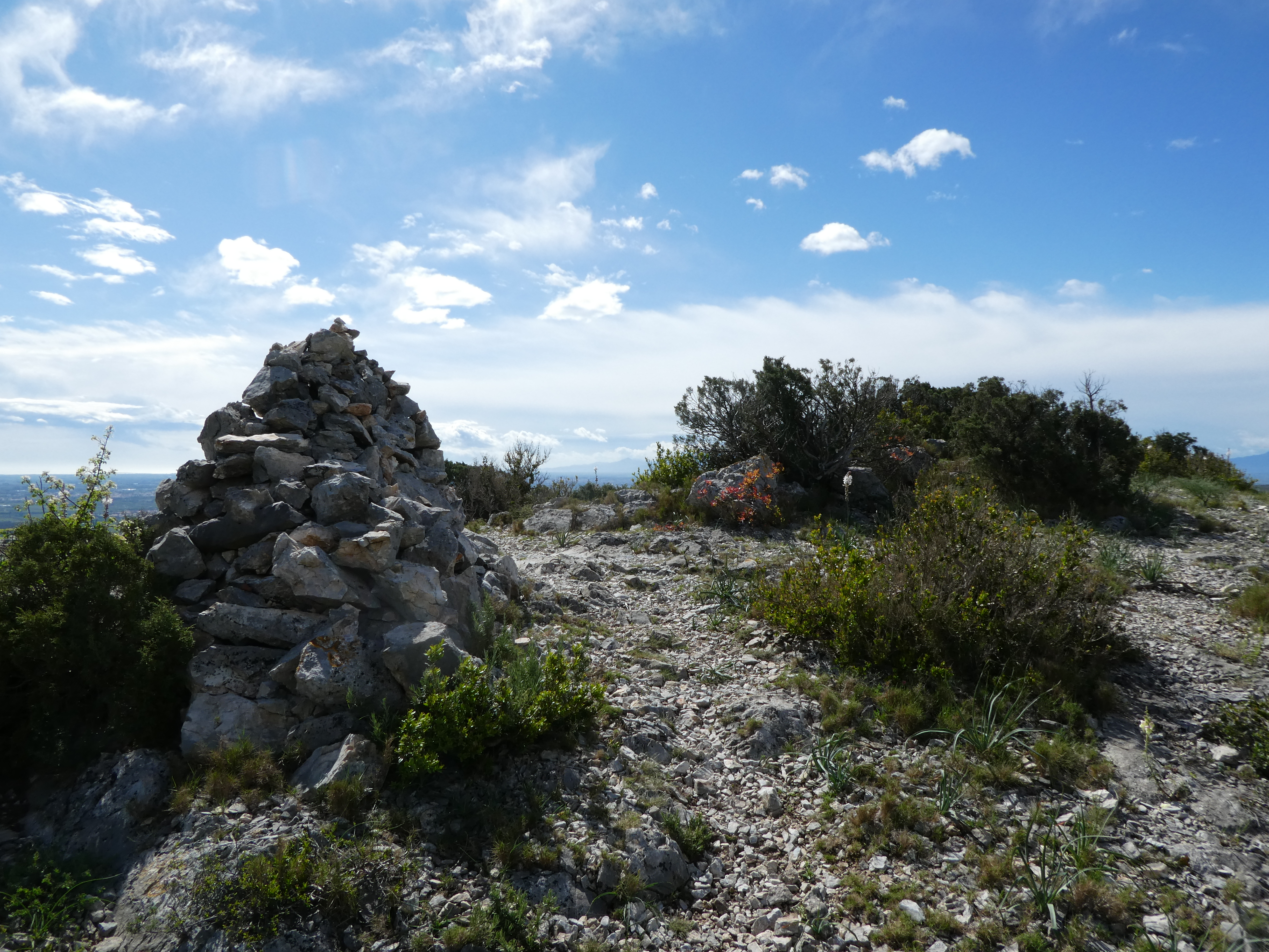 A ce croisement cairné avec le chemin balisé en jaune et blanc venant de Tautavel (1500 mètres après le précédent) (370 m), continuer à suivre le chemin de crête montant tout droit direction Tour de Tautavel, balisé en jaune et rouge, et en jaune et blanc dorénavant