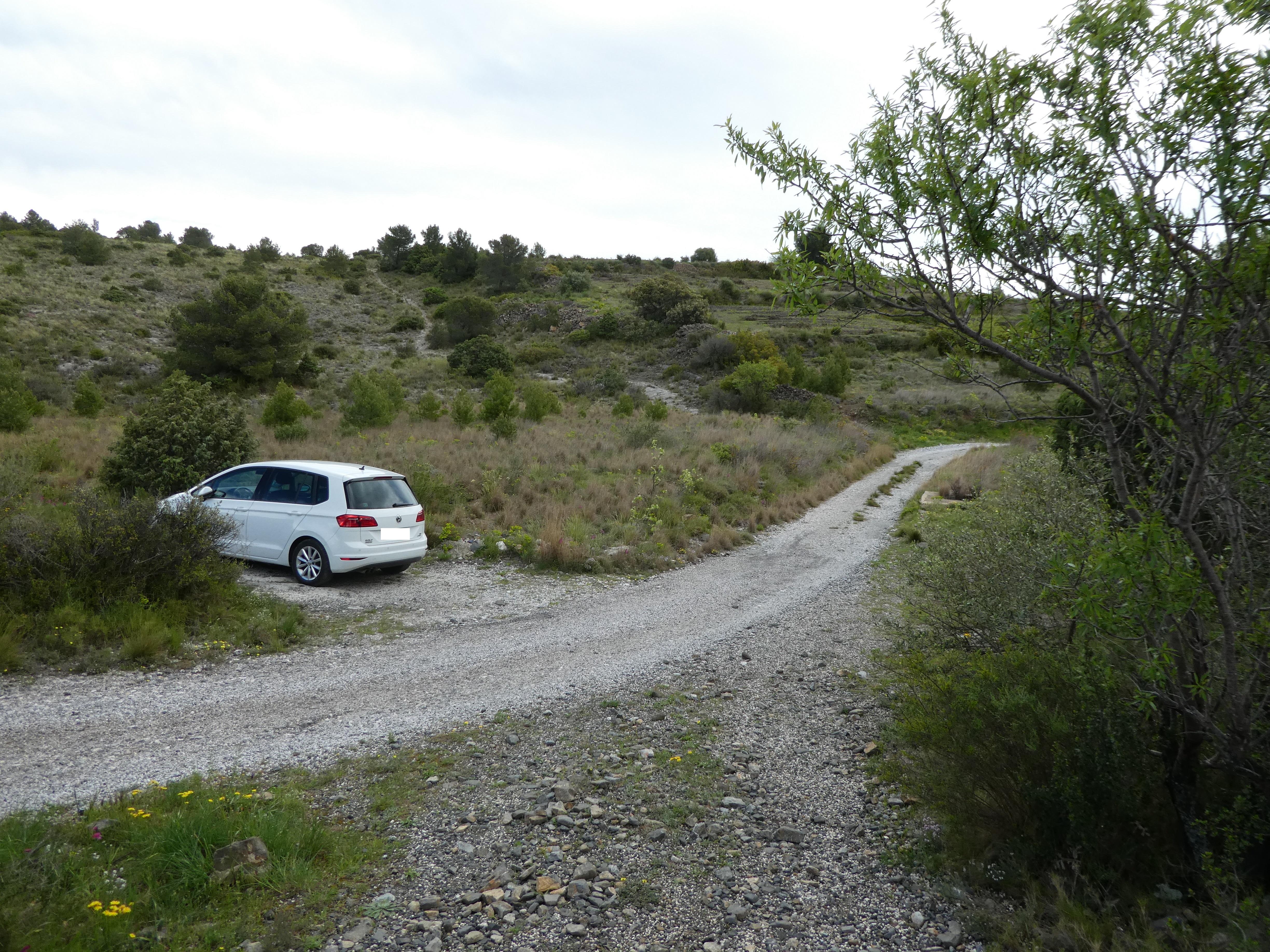 A ce croisement avec le chemin "officiel" de montée vers la Tour de Tautavel depuis Cases-de-Pène (400 mètres après le précédent) (137 m), suivre ce dernier sur la gauche direction Cases-de-Pène, balisé en jaune dorénavant (il ne suit plus le tracé indiqué en pointillés roses sur la carte IGN mais passe plus à l'Est)
