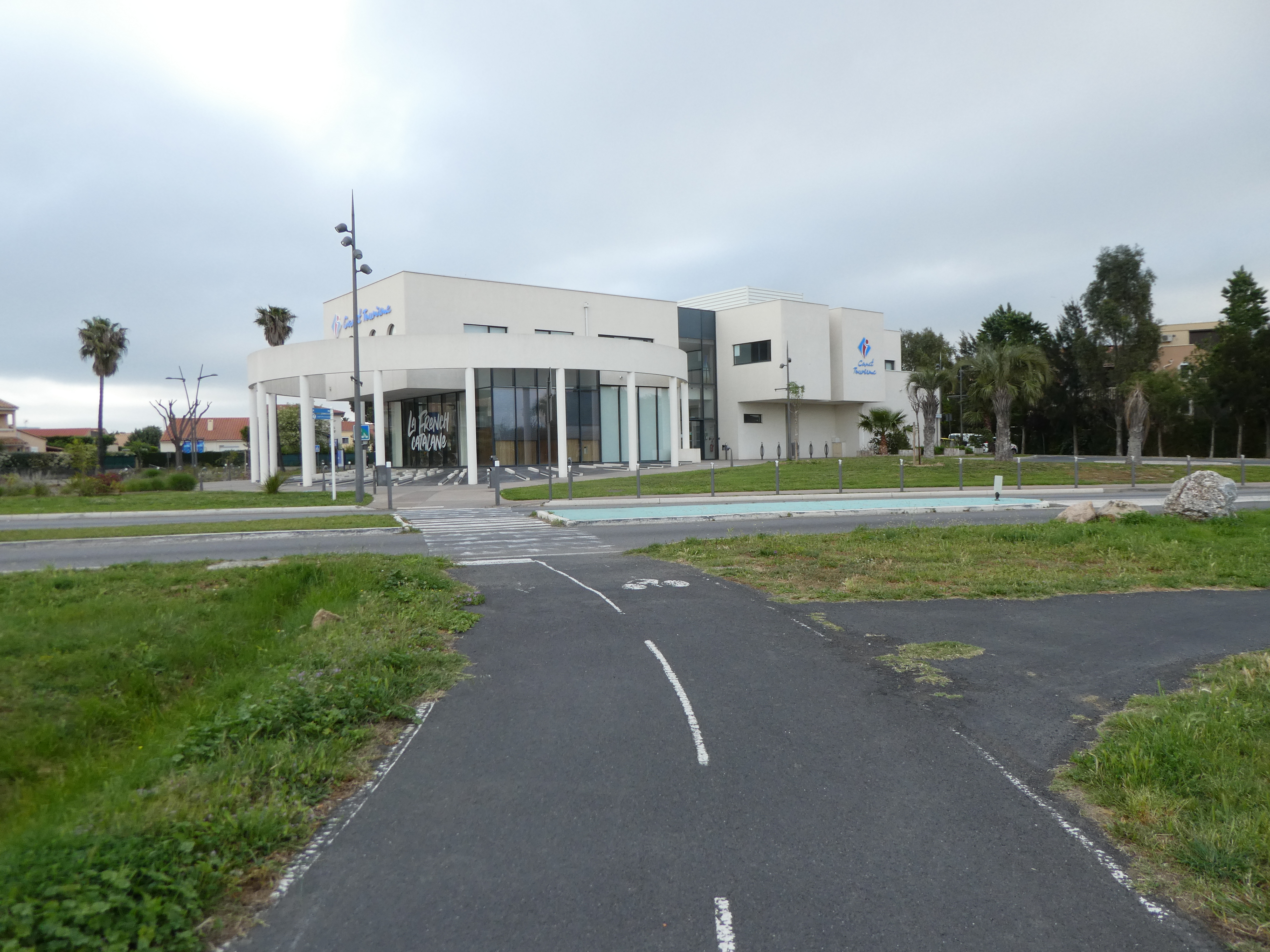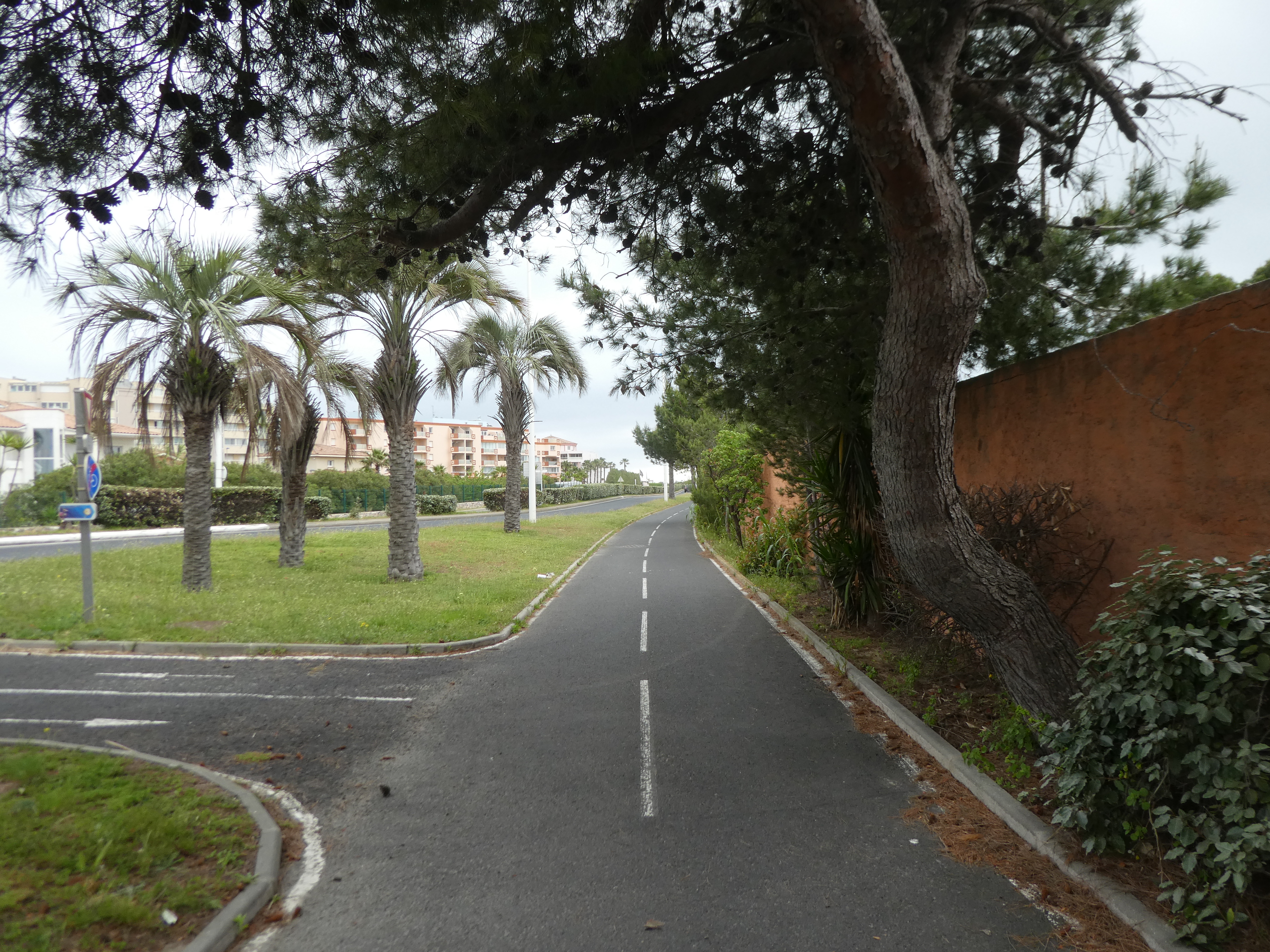 A ce croisement situé à proximité de l'Office de Tourisme de Canet-en-Roussillon (700 mètres après le précédent) (2 m), suivre la piste cyclable partant sur la droite direction Village de Pêcheurs