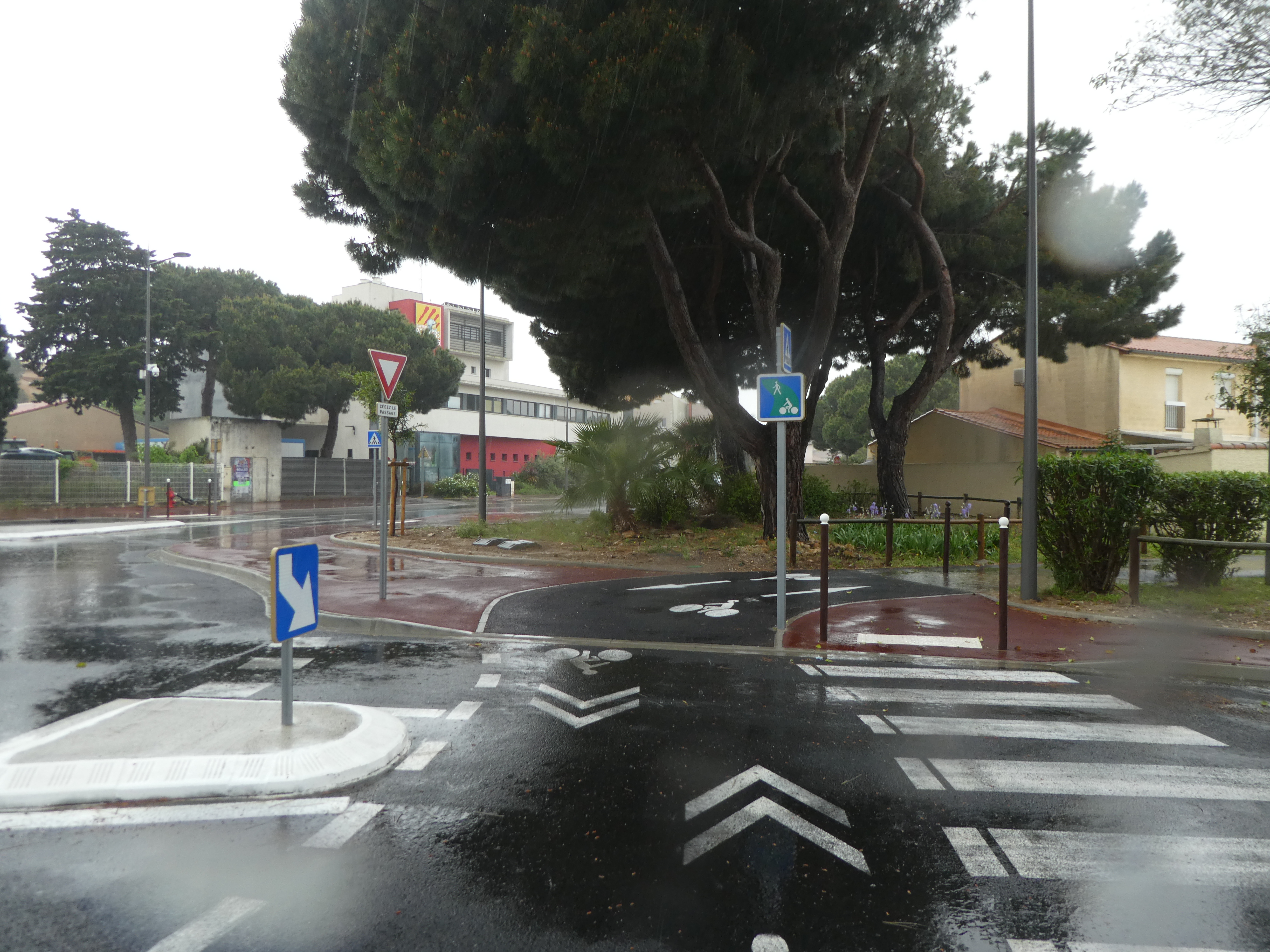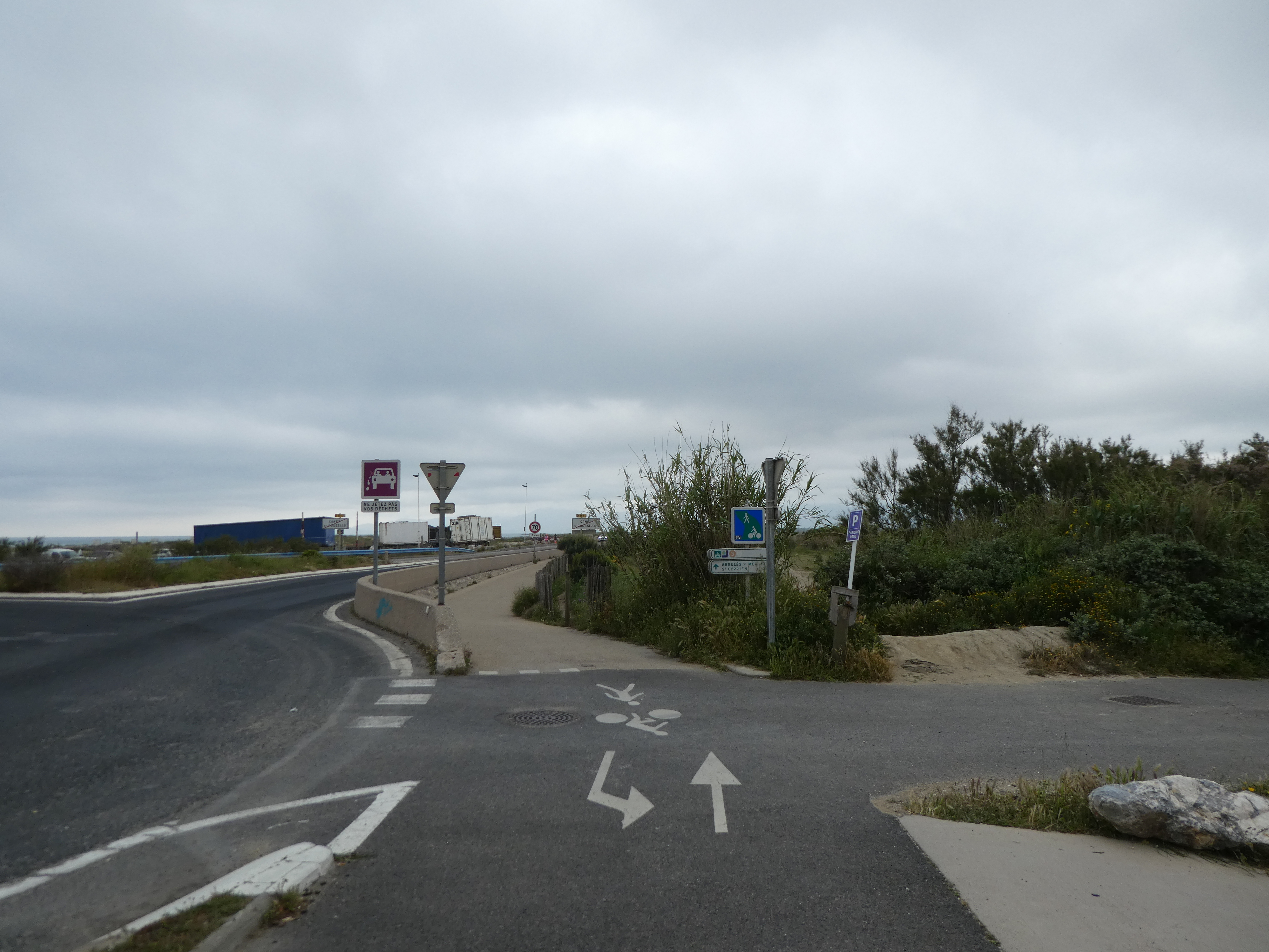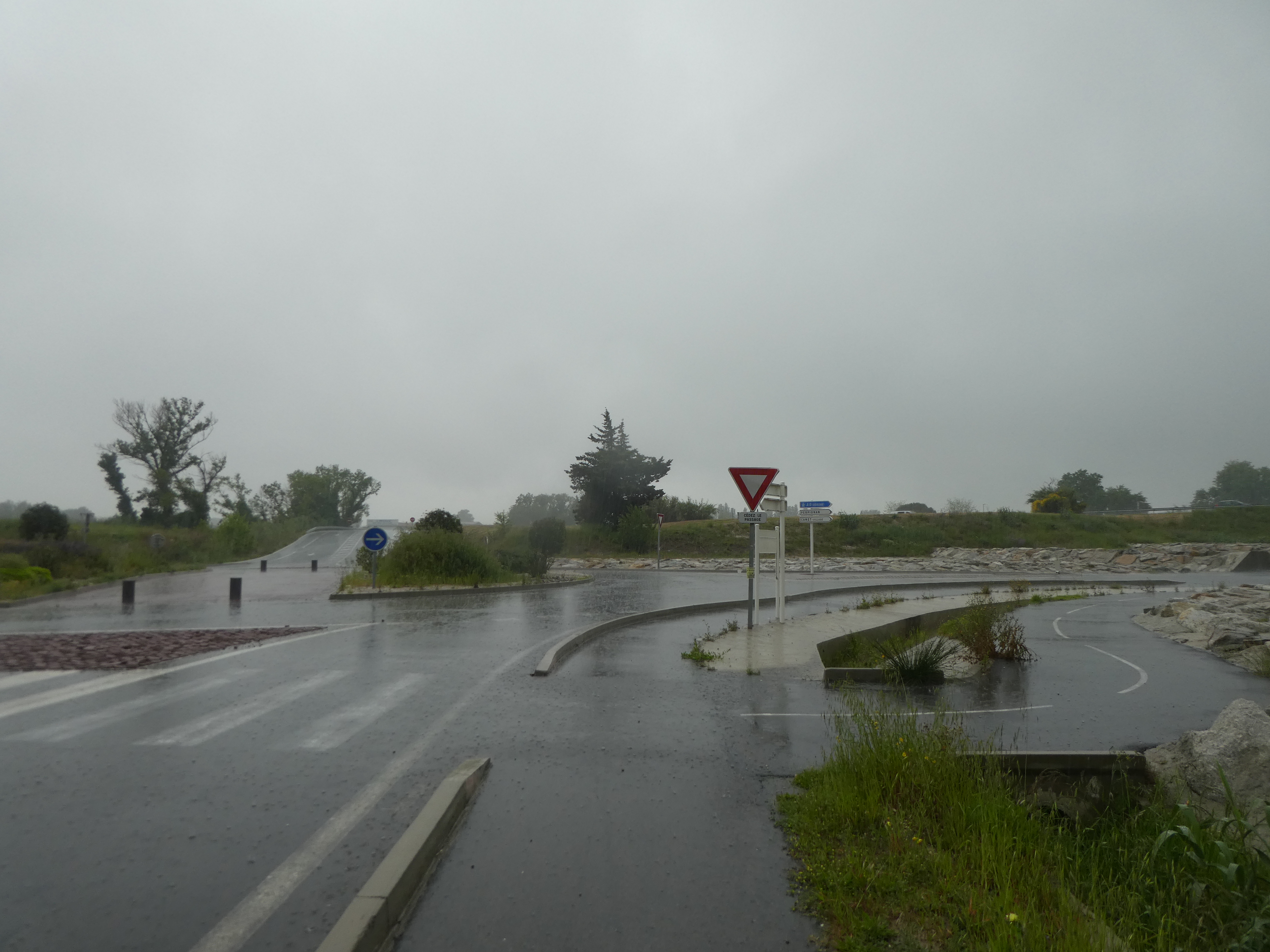 Au niveau de ce rond-point (250 mètres après le précédent croisement), suivre la piste cyclable partant sur la droite sous la D81 direction Canet-en-Roussillon (la pluie déluge de nouveau !)