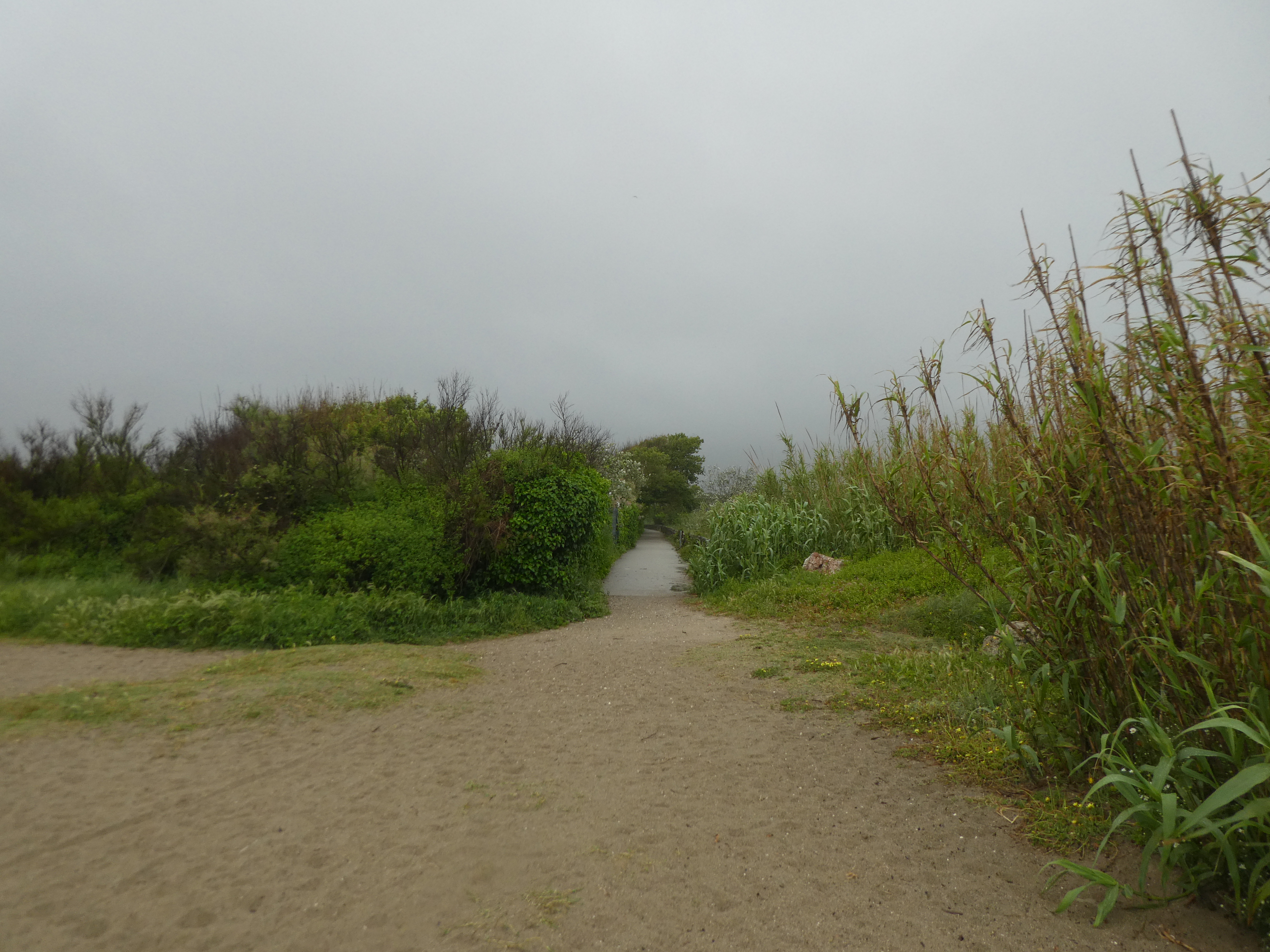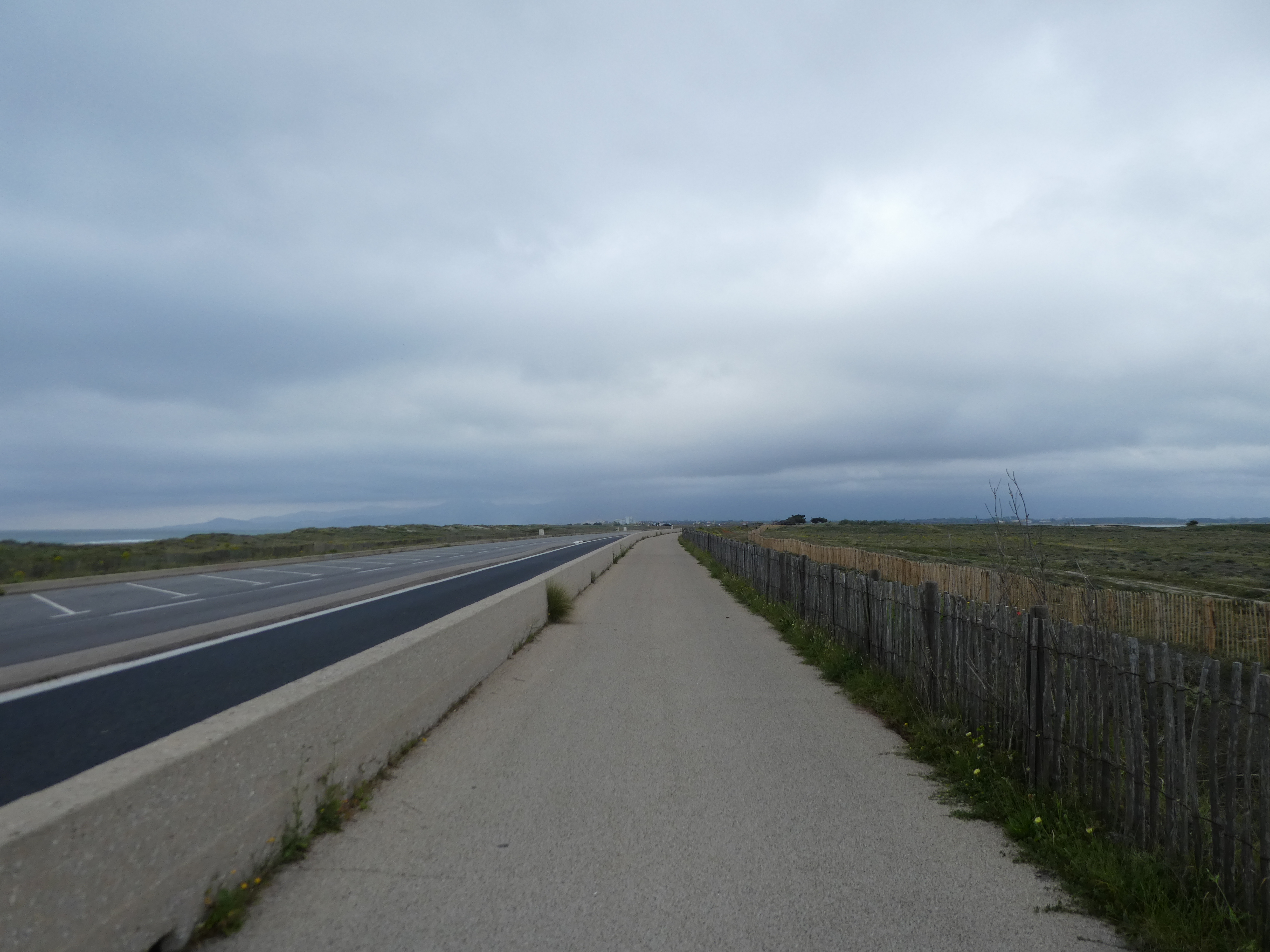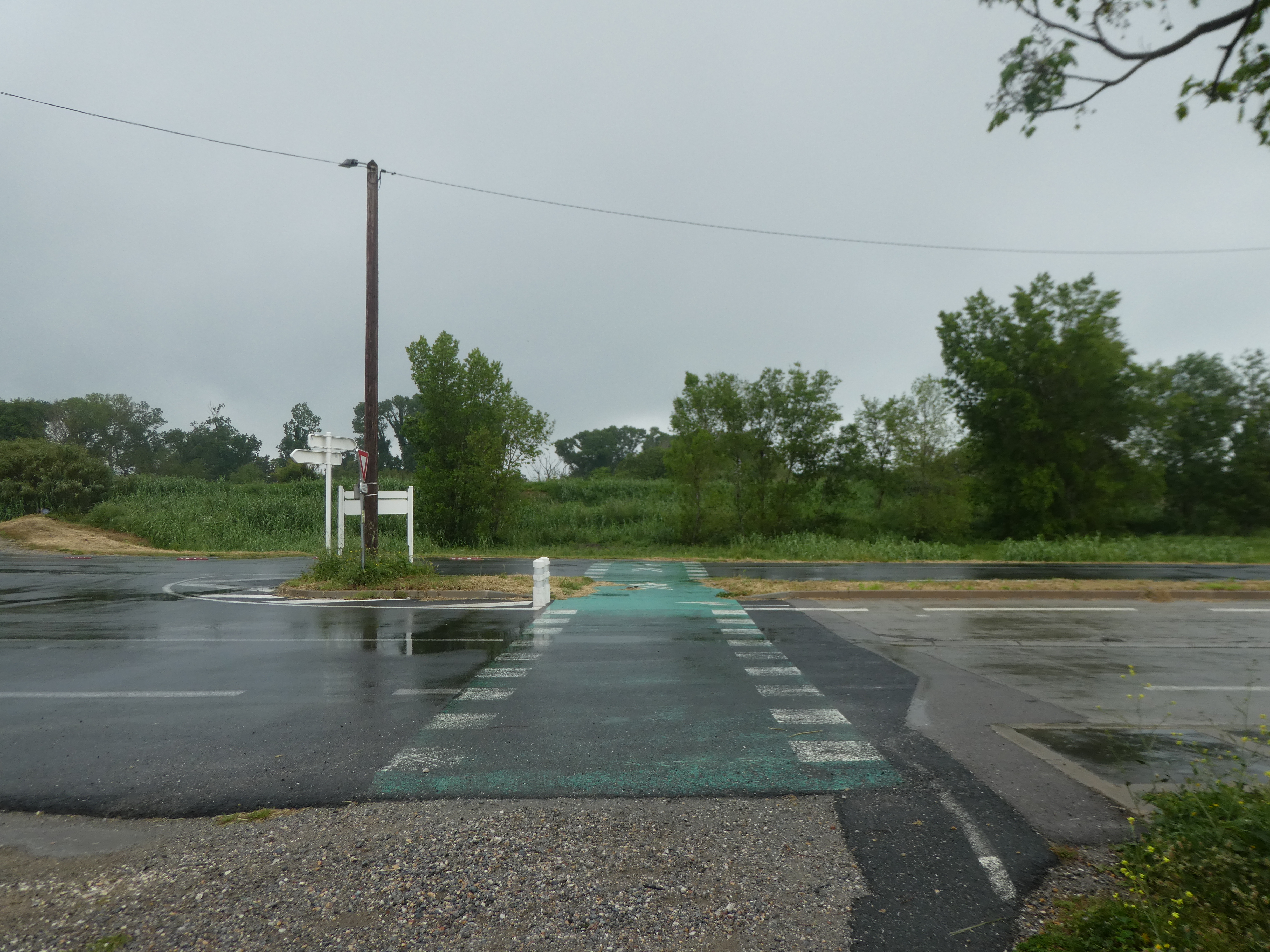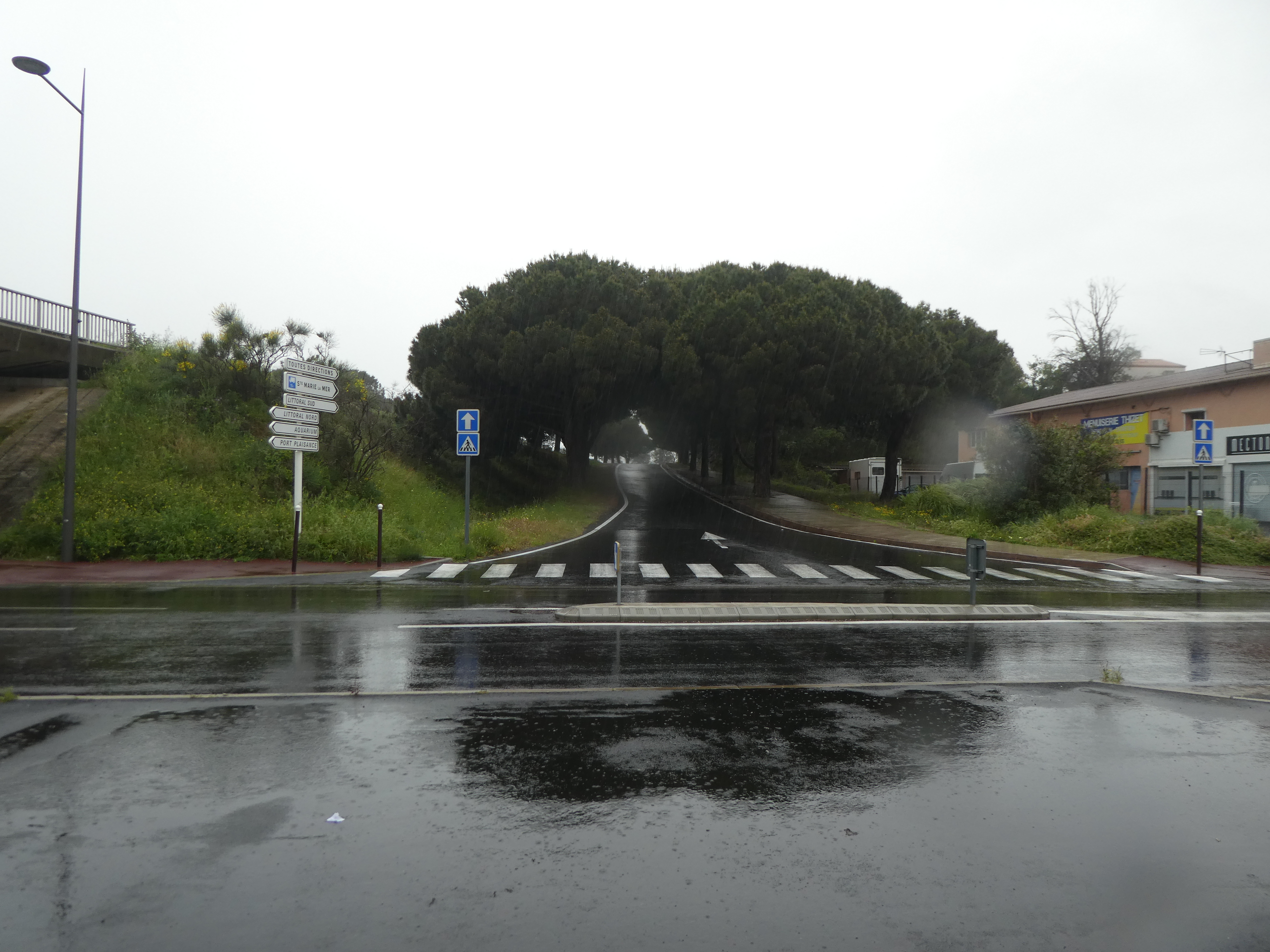 Au niveau de ce rond-point (250 mètres après le précédent croisement), suivre la piste cyclable partant sur la droite sous la D81 direction Canet-en-Roussillon (la pluie déluge de nouveau !)