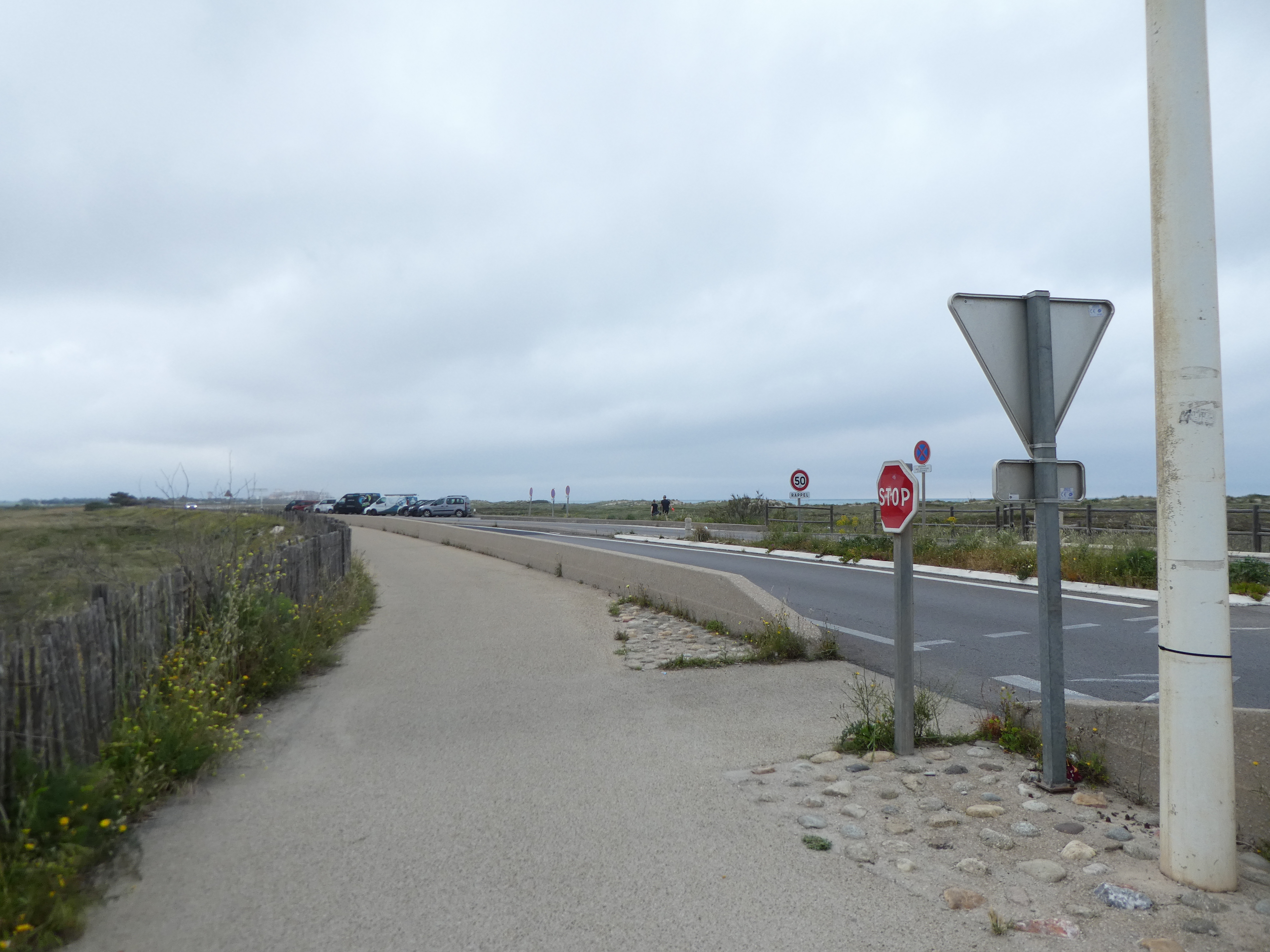 A ce croisement situé au début de la promenade du front de mer de Canet-Plage (1400 mètres après le précédent rond-point) (3 m), suivre le chemin partant tout droit direction Canet-Plage (ceux qui ne seraient pas partis au Village de Pêcheurs mais allés directement vers Canet-Plage devraient se retrouver ici)