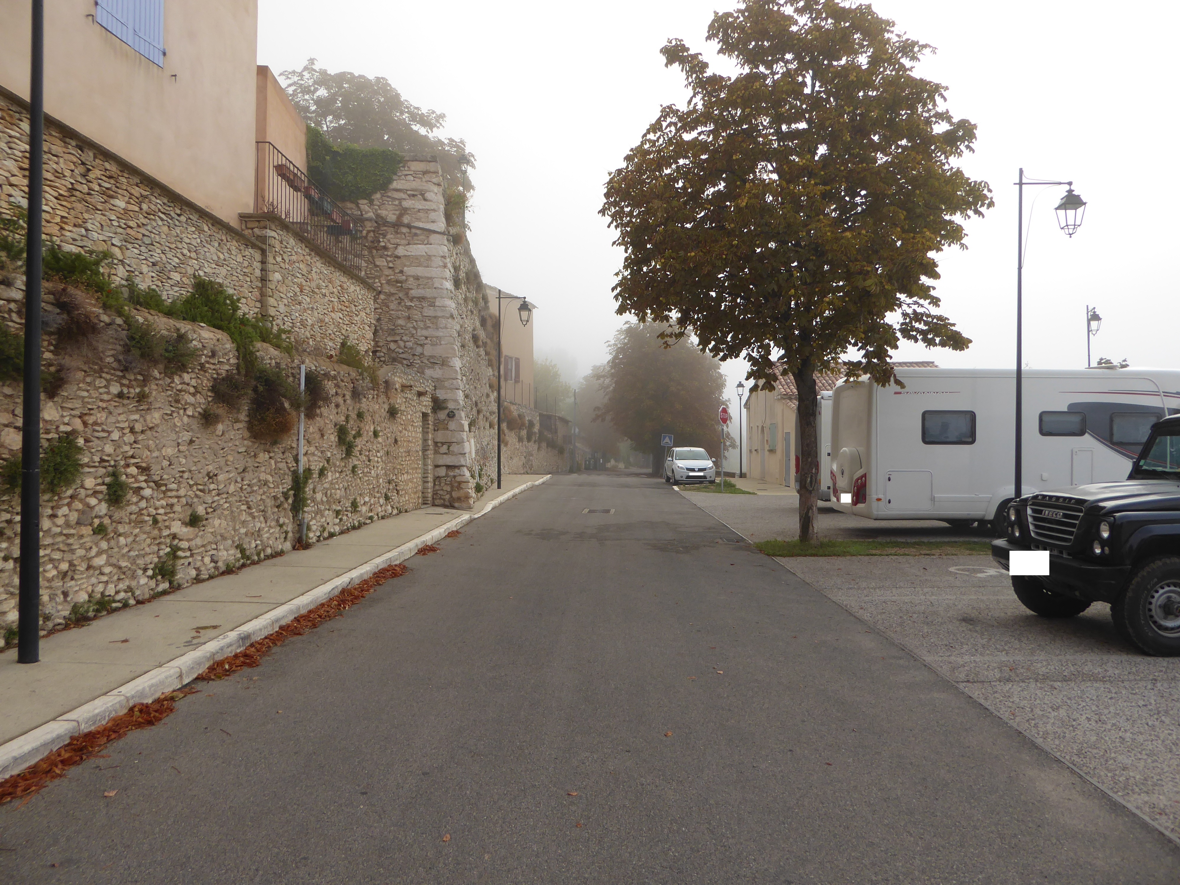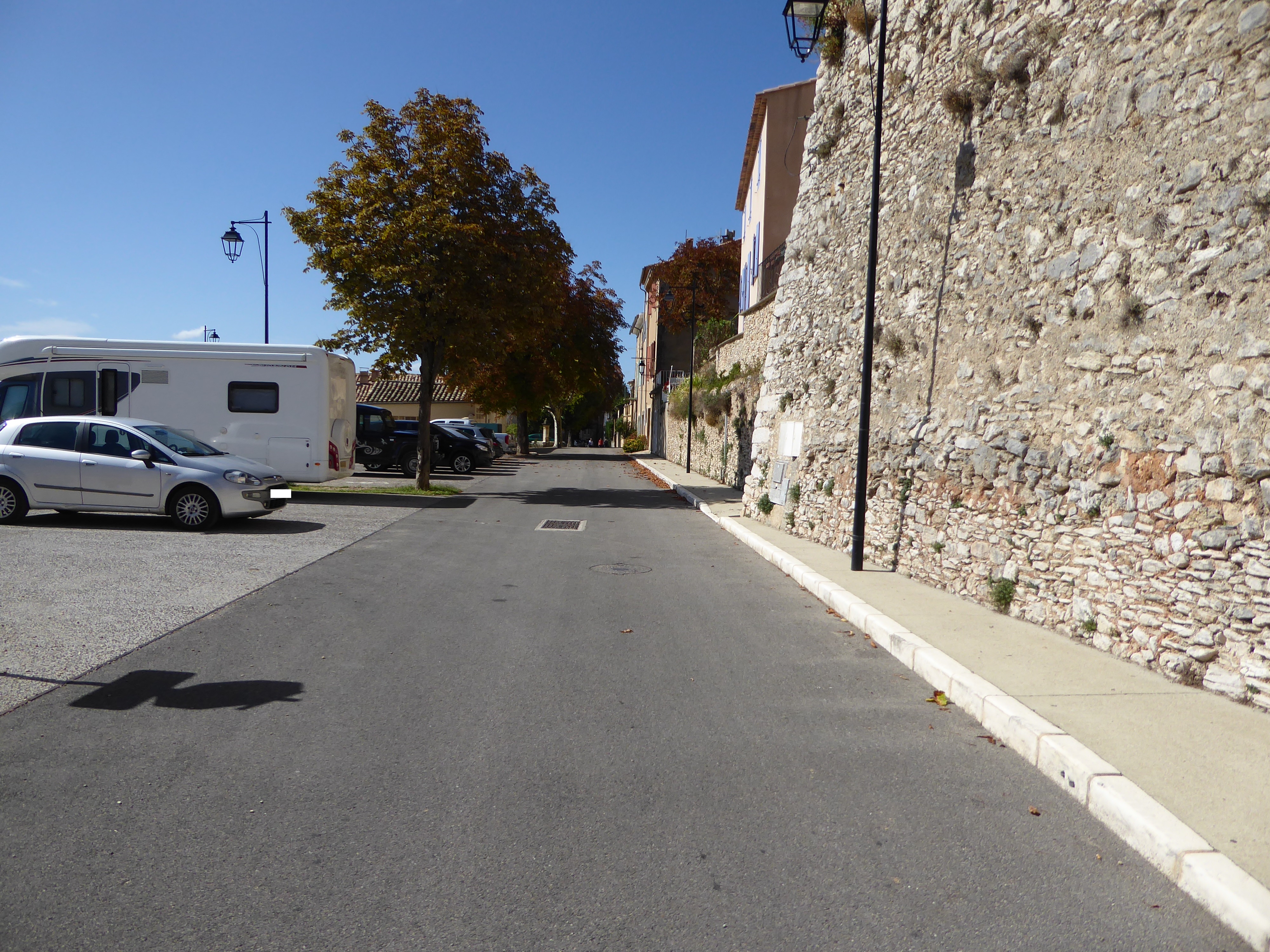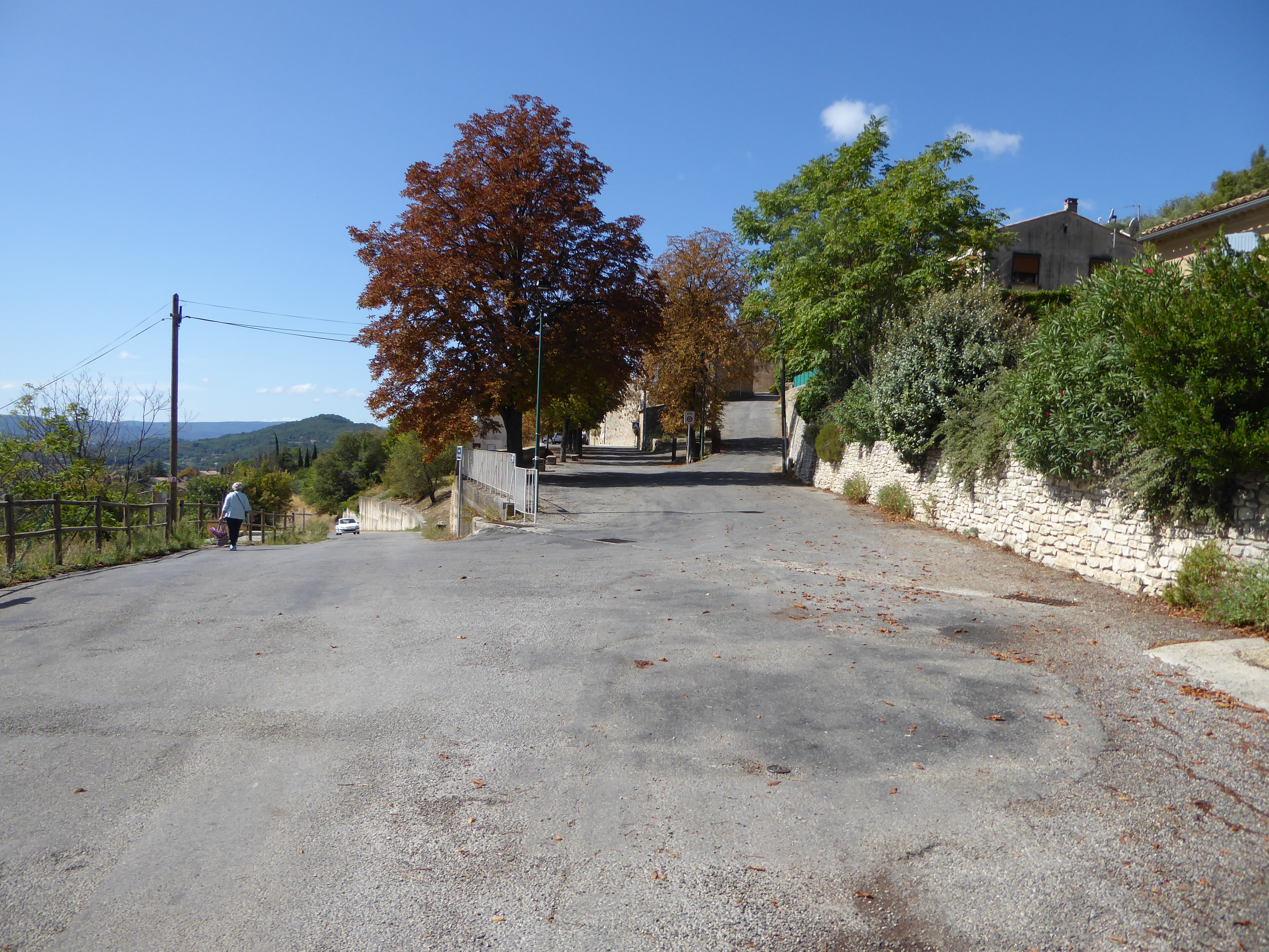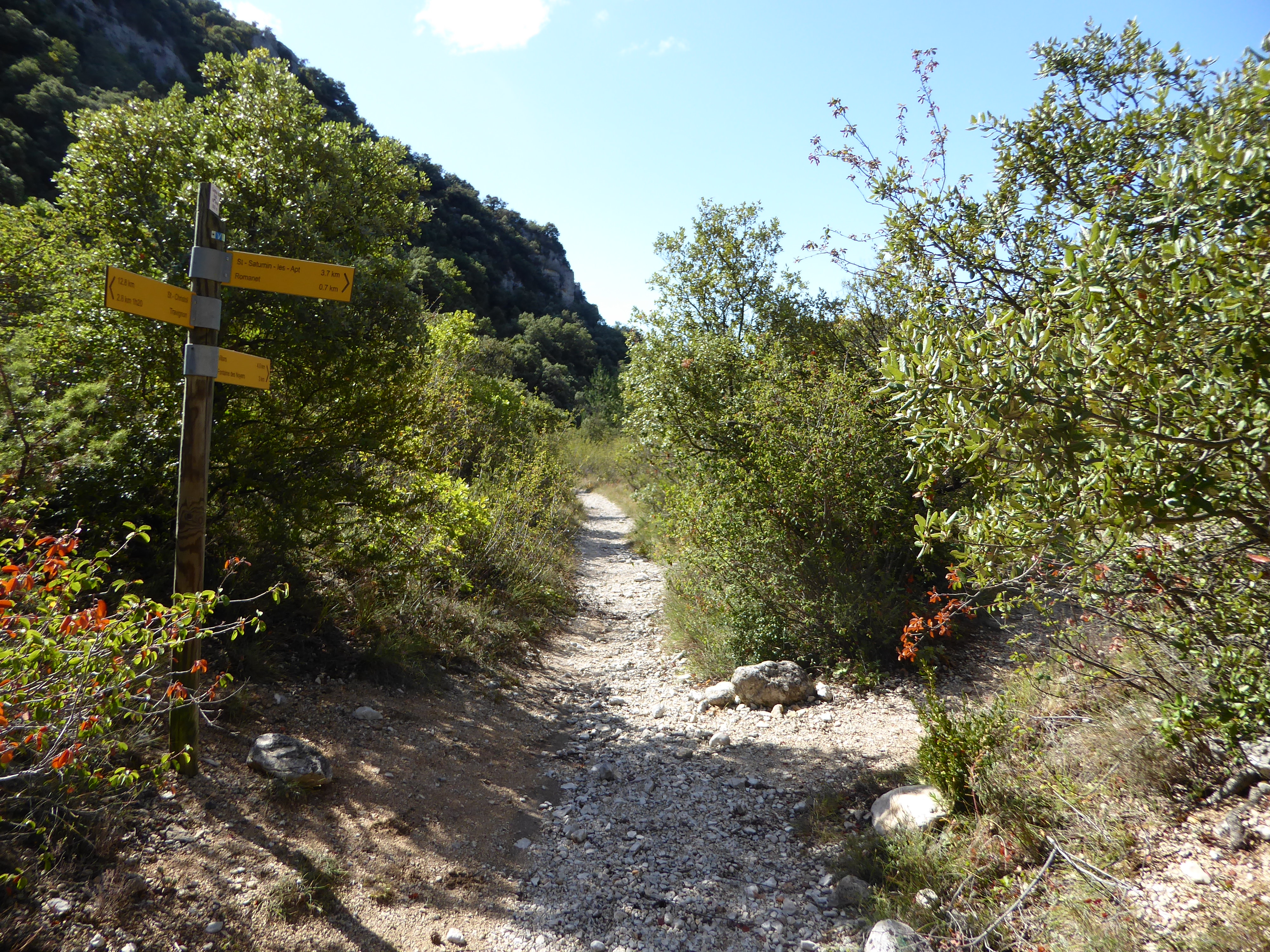 A cette intersection, suivre la rue partant légèrement sur la droite direction Saint-Saturnin-lès-Apt, balisé en jaune dorénavant