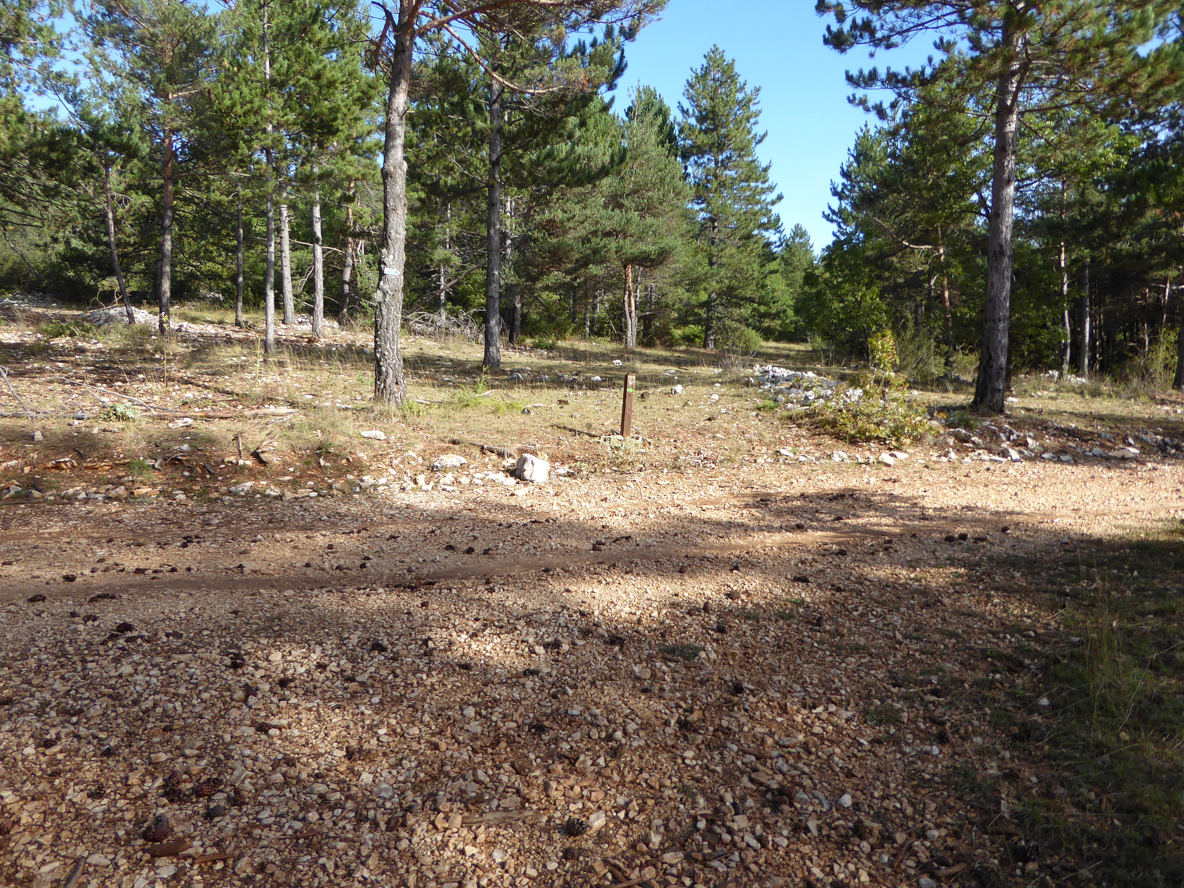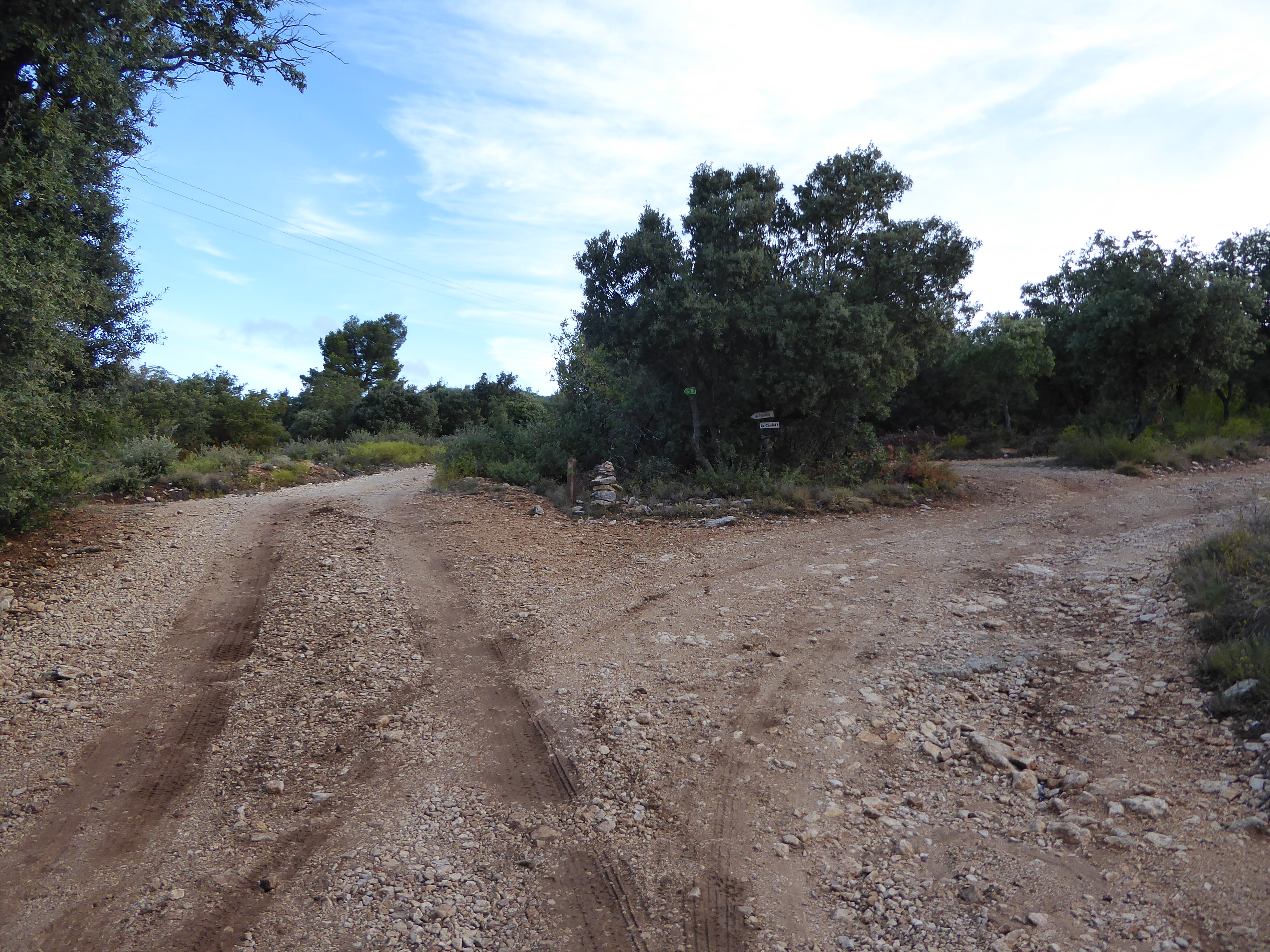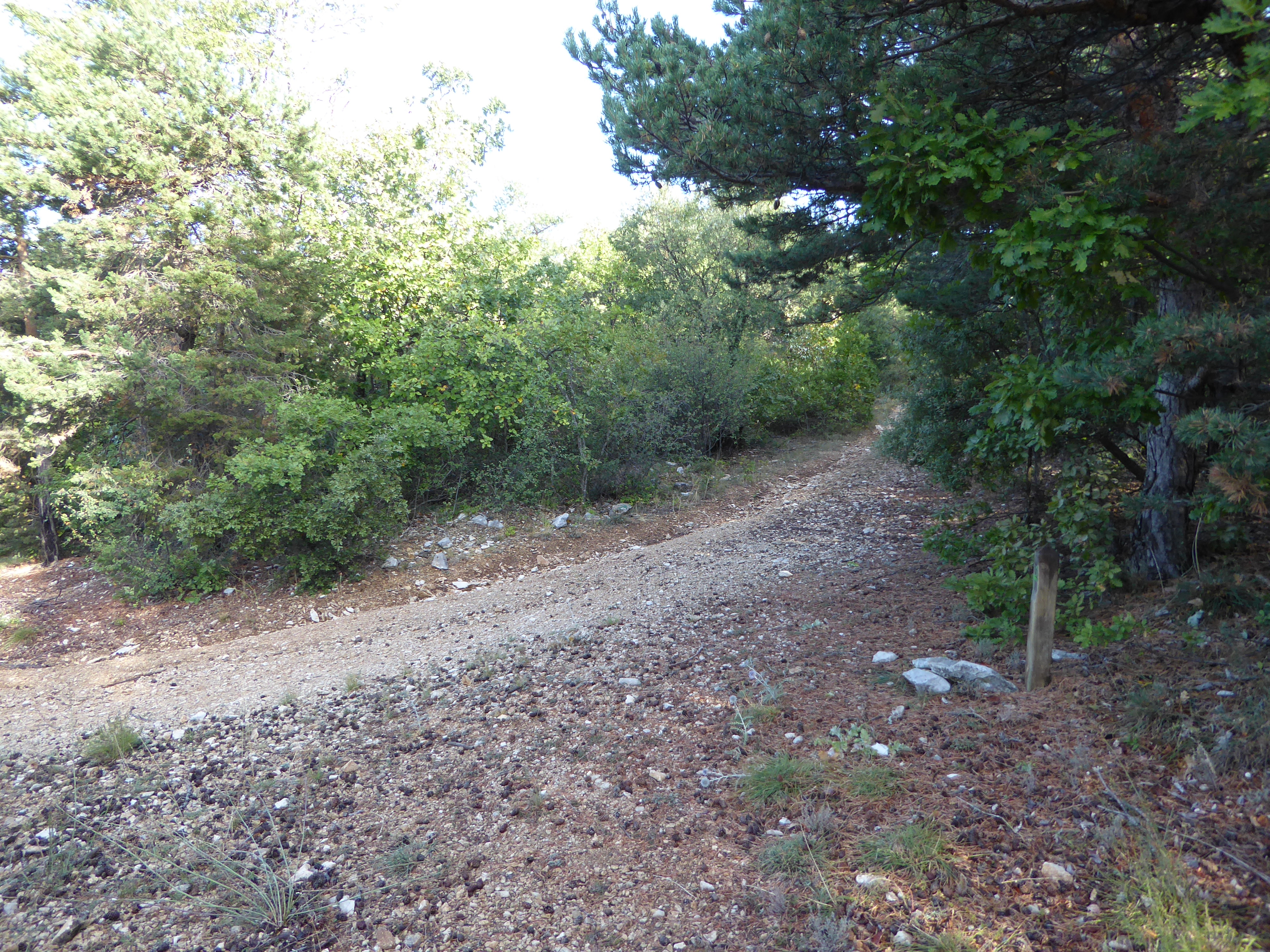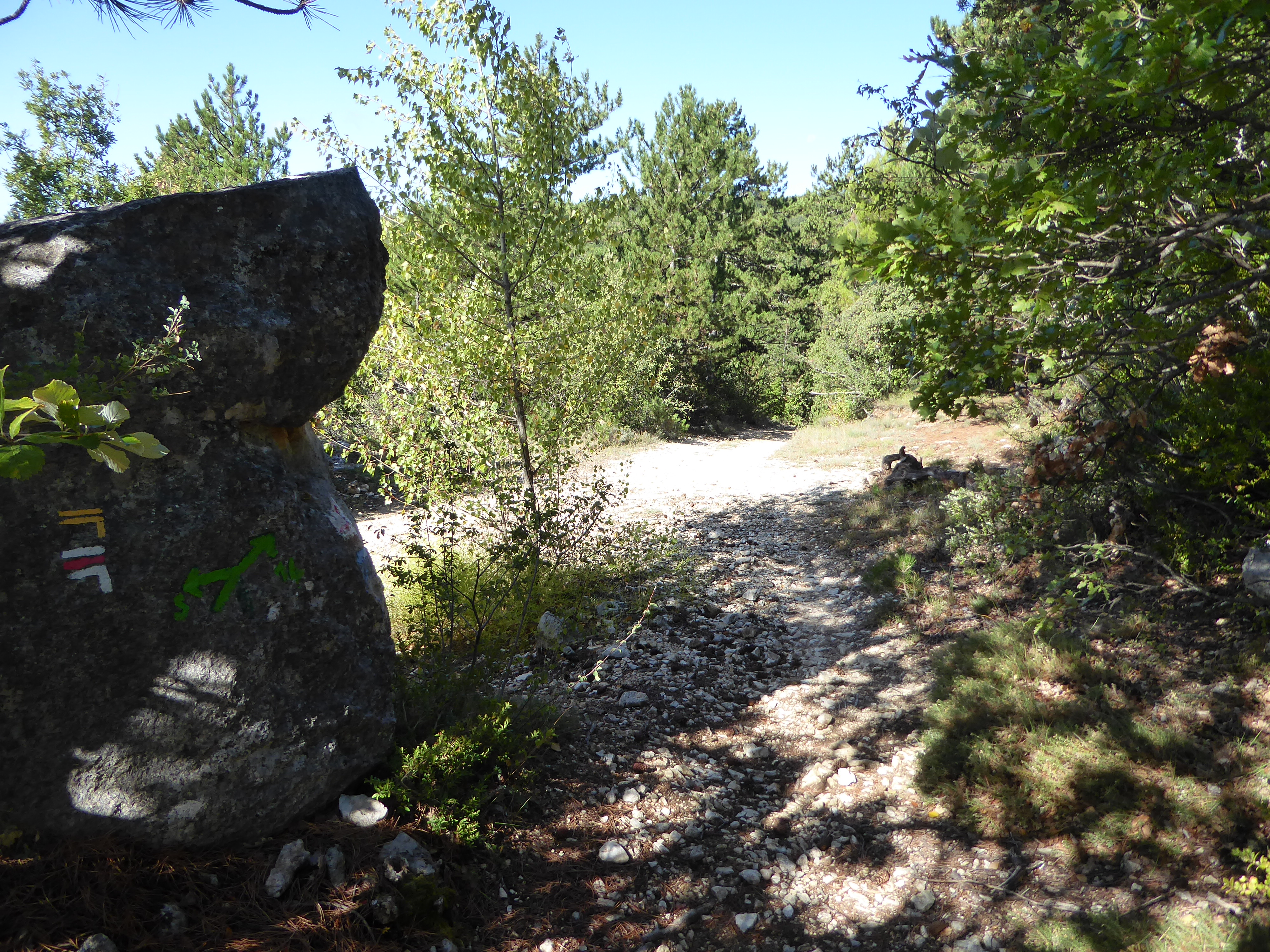 A ce croisement avce une large piste, suivre cette dernière à droite direction Saint-Saturnin-lès-Apt, balisé en points verts (n°5)